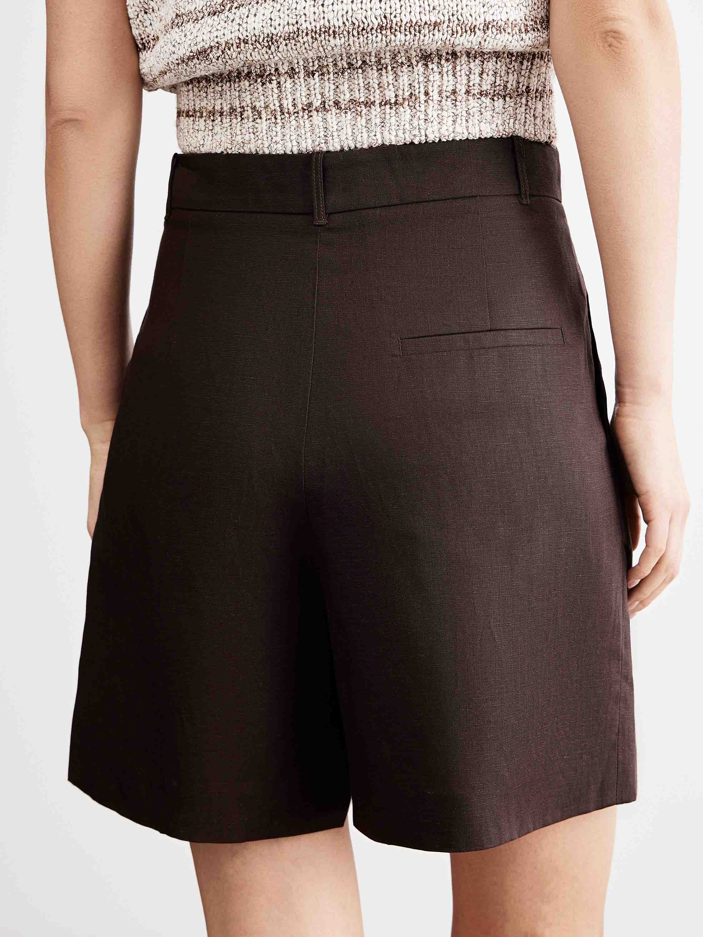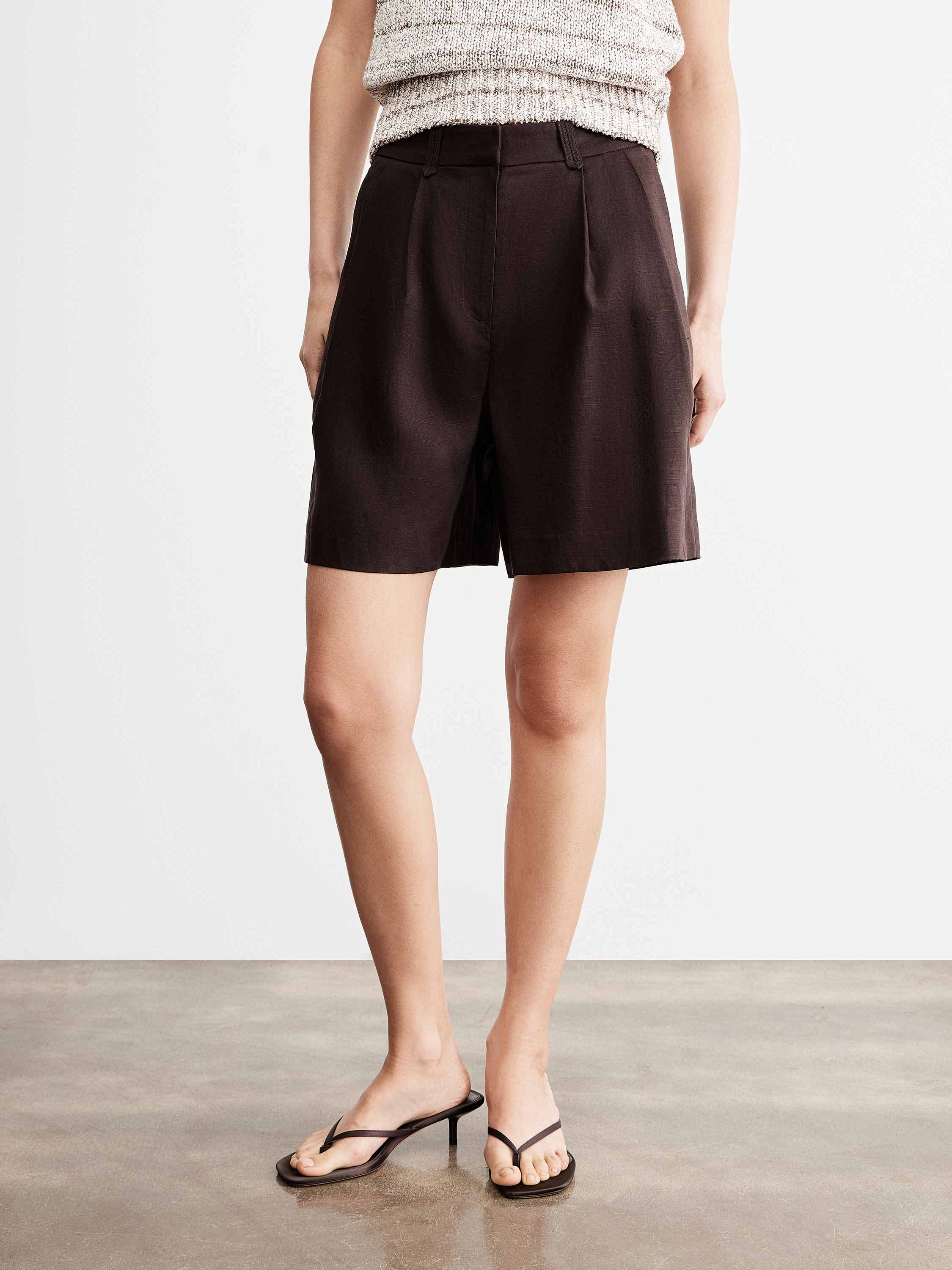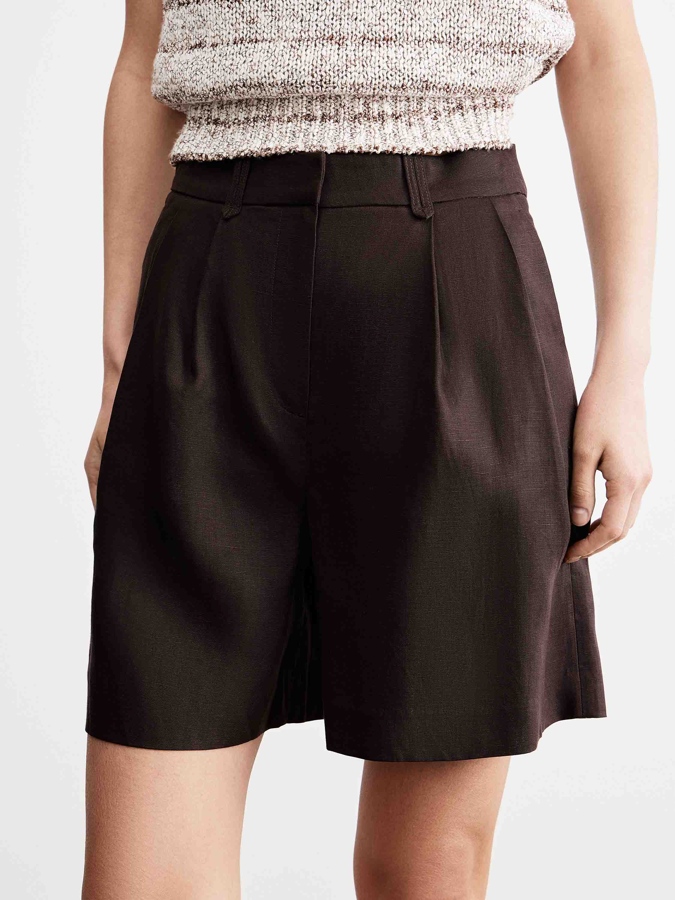 Шорты прямого кроя с посадкой по линии талии формируют аккуратный силуэт без лишнего объема. Четкая линия пояса со шлевками задает конструкцию, мягкие складки у талии добавляют глубину и обеспечивают комфорт в движении, боковые карманы встроены в шов и не утяжеляют форму. Длина до середины бедра выстраивает сбалансированные пропорции и делает модель универсальной в повседневных сочетаниях. Смесовое полотно на основе тенсела с добавлением льна отличается гладкой поверхностью и умеренной пластикой; тенсел делает материал более мягким и комфортным в носке, лен добавляет воздухопроницаемость и характерную текстуру. Хлопковая подкладка делает посадку более мягкой и приятной к телу. Темный оттенок вписывается в базовую палитру. Модель сочетается с рубашками, футболками и тонким трикотажем, дополняется жакетами и легкими слоями.