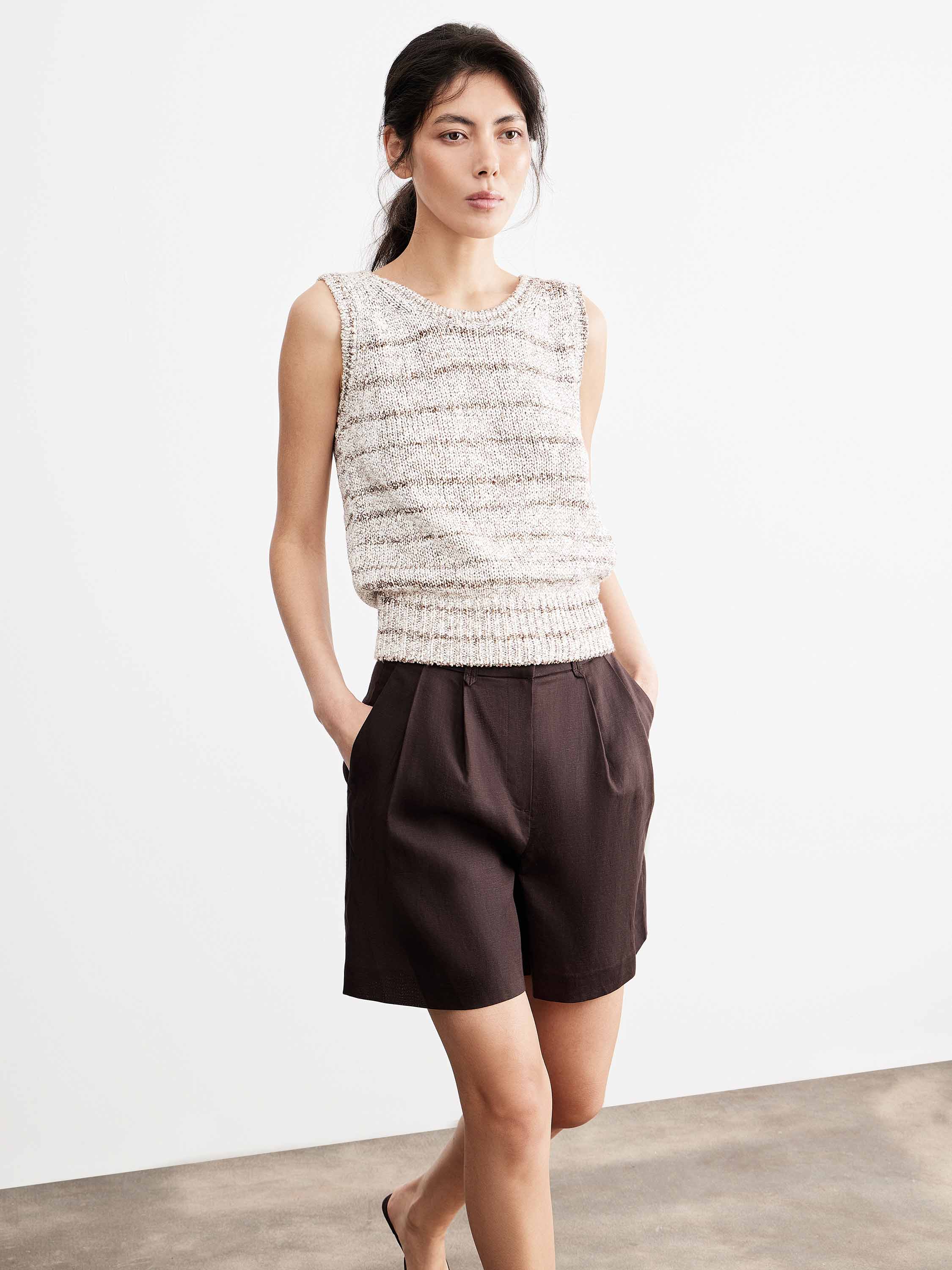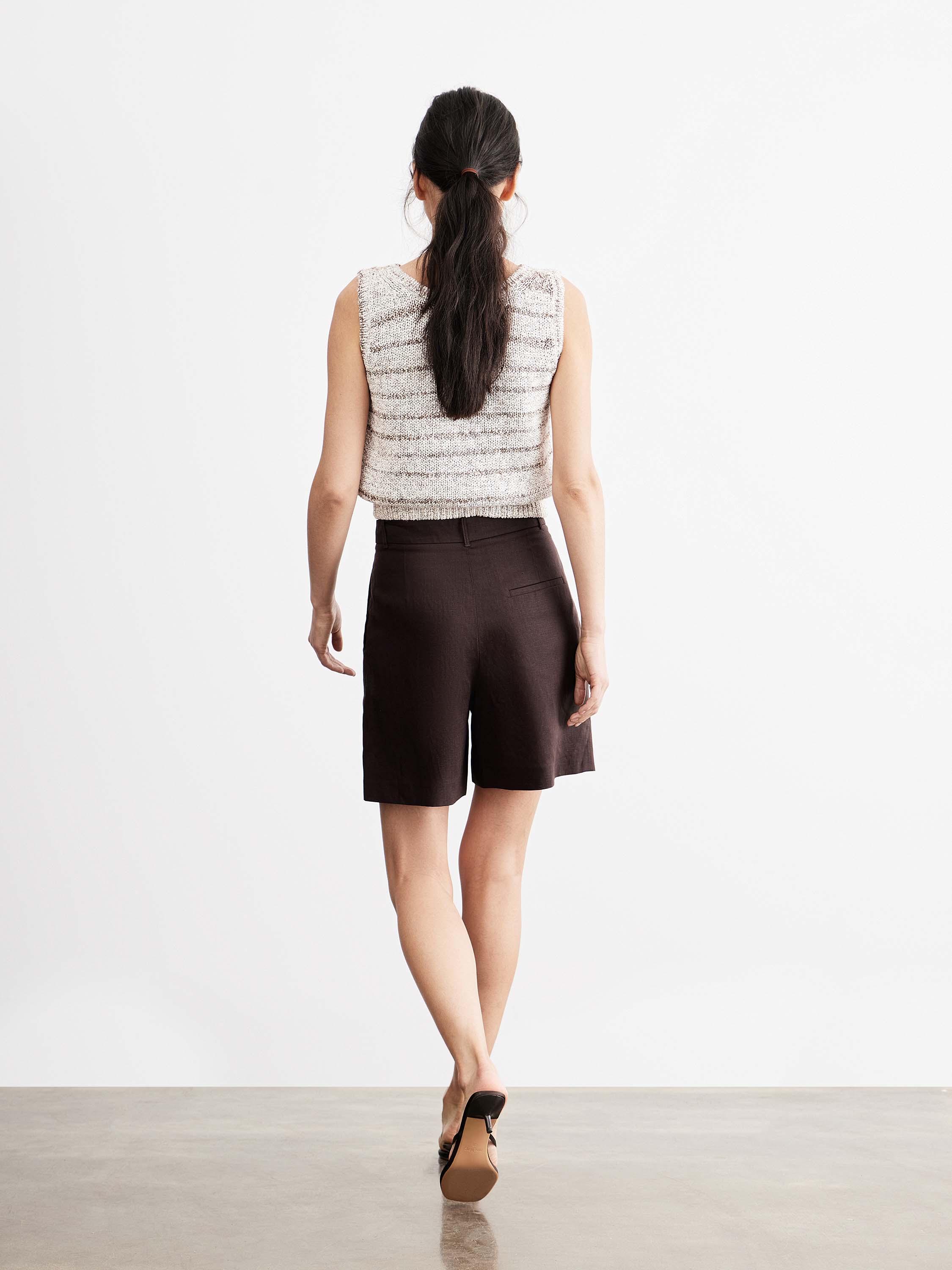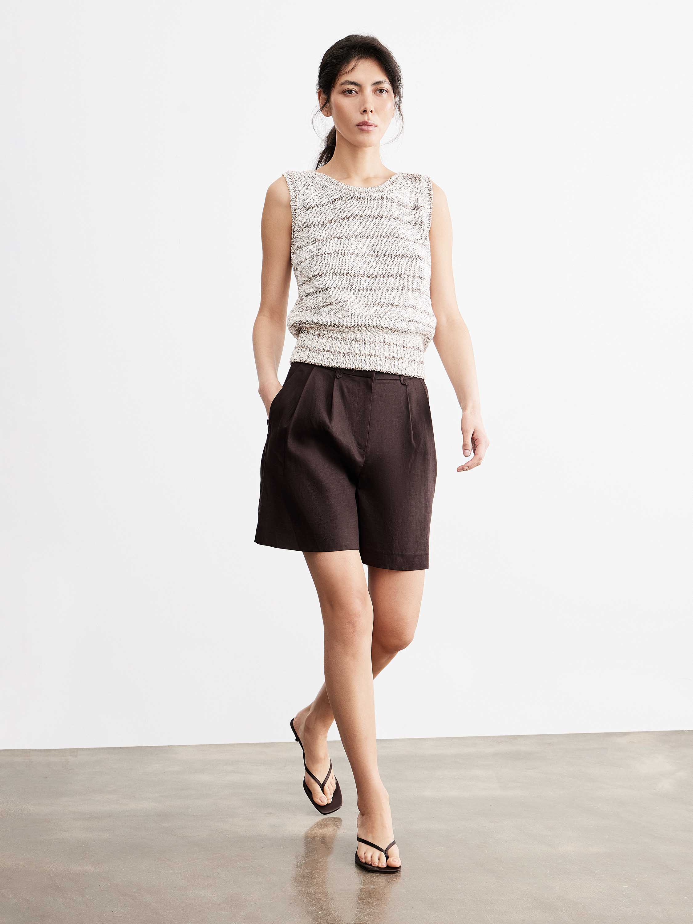 Шорты прямого кроя с посадкой по линии талии формируют аккуратный силуэт без лишнего объема. Четкая линия пояса со шлевками задает конструкцию, мягкие складки у талии добавляют глубину и обеспечивают комфорт в движении, боковые карманы встроены в шов и не утяжеляют форму. Длина до середины бедра выстраивает сбалансированные пропорции и делает модель универсальной в повседневных сочетаниях. Смесовое полотно на основе тенсела с добавлением льна отличается гладкой поверхностью и умеренной пластикой; тенсел делает материал более мягким и комфортным в носке, лен добавляет воздухопроницаемость и характерную текстуру. Хлопковая подкладка делает посадку более мягкой и приятной к телу. Темный оттенок вписывается в базовую палитру. Модель сочетается с рубашками, футболками и тонким трикотажем, дополняется жакетами и легкими слоями.