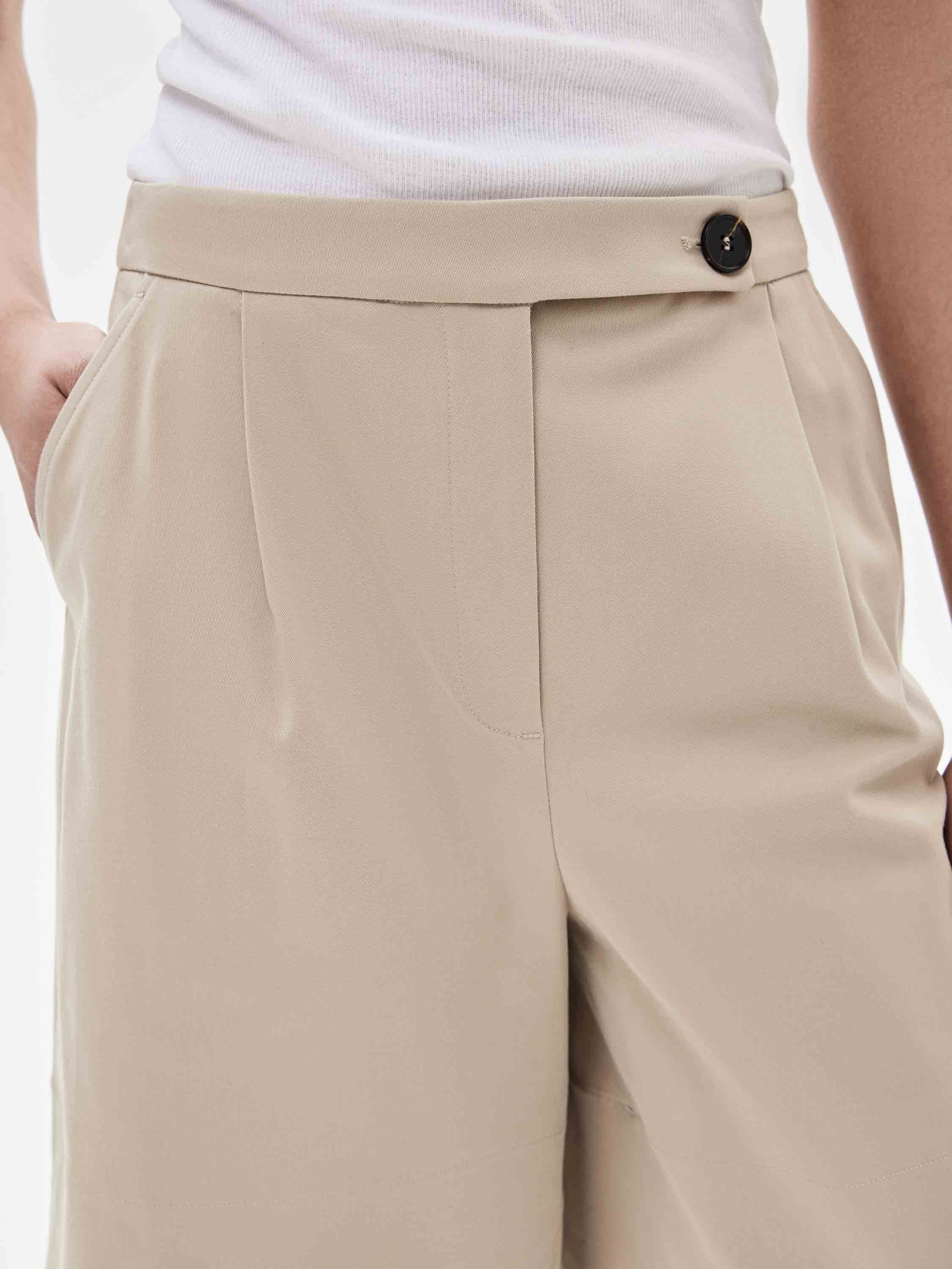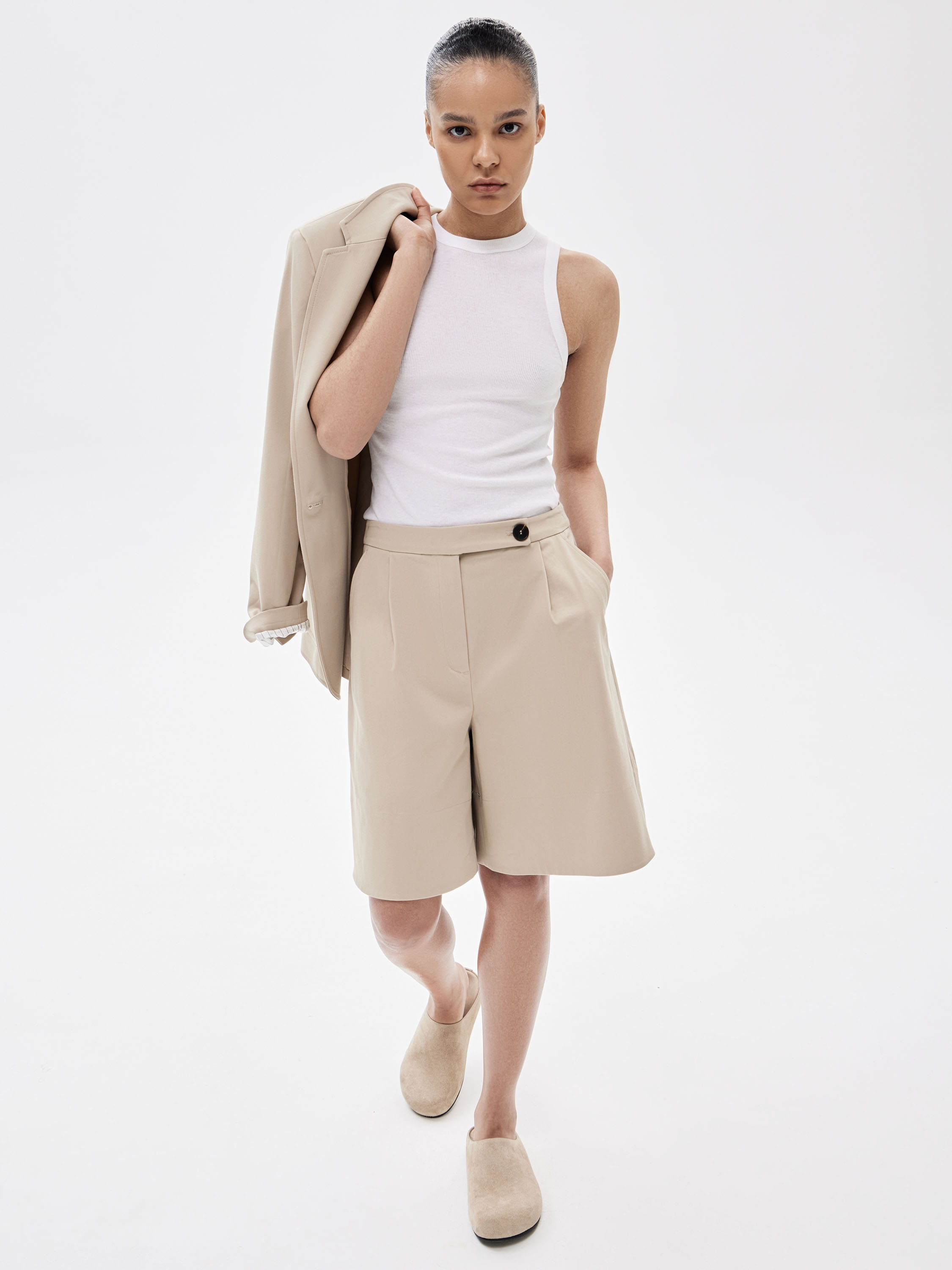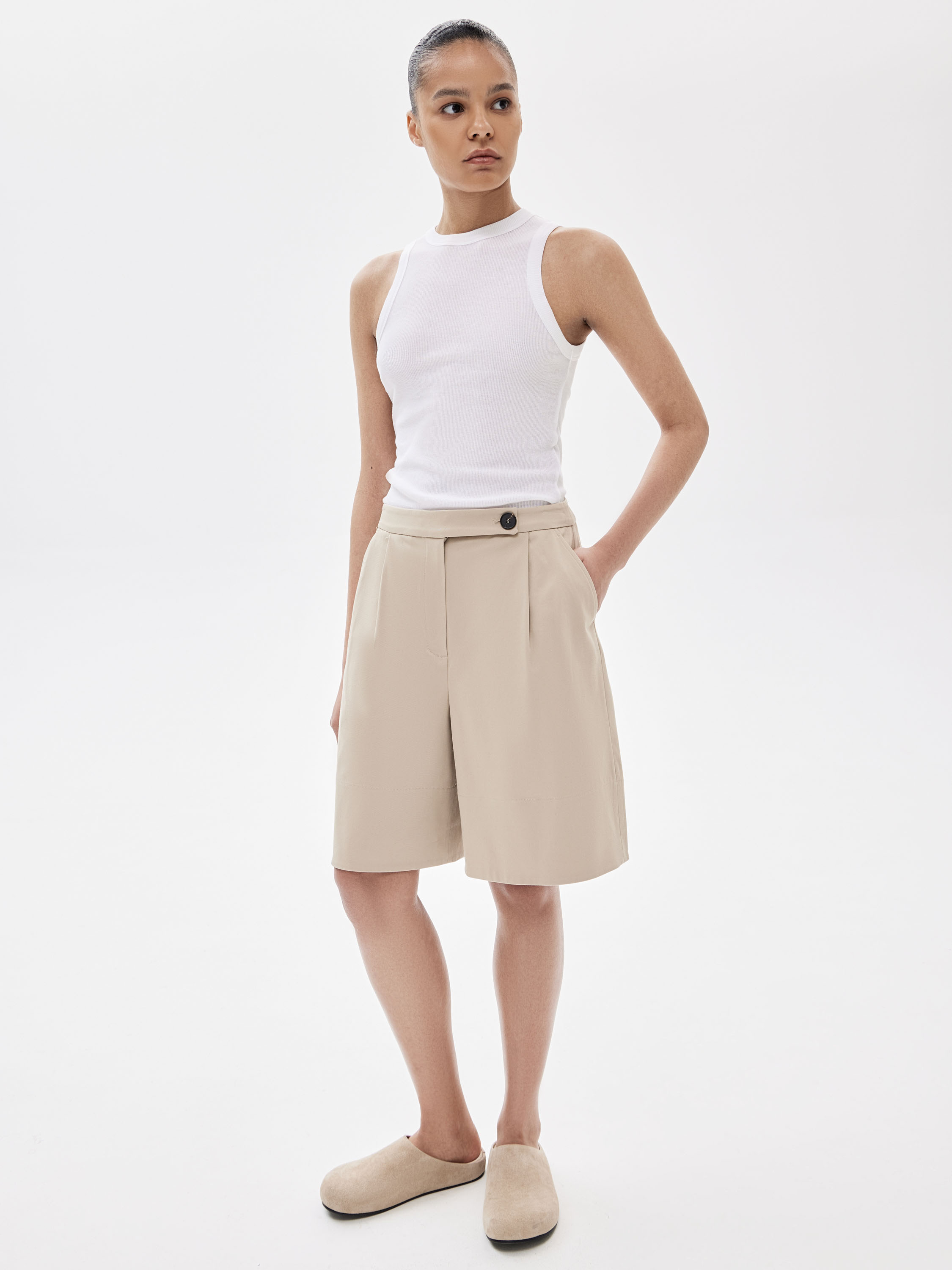 Шорты выполнены из хлопкового полотна с добавлением эластана. Материал плотный, держит форму и сохраняет четкость линий. Посадка высокая, по линии талии оформлены защипы, которые формируют объем и выстраивают силуэт. Длина до колена, с прямой линией низа. Предусмотрены шлевки, что позволяет носить модель с ремнем. Оттенок — светлый бежевый, универсальный и спокойный, хорошо работающий как в костюмных сочетаниях, так и в более расслабленных образах.