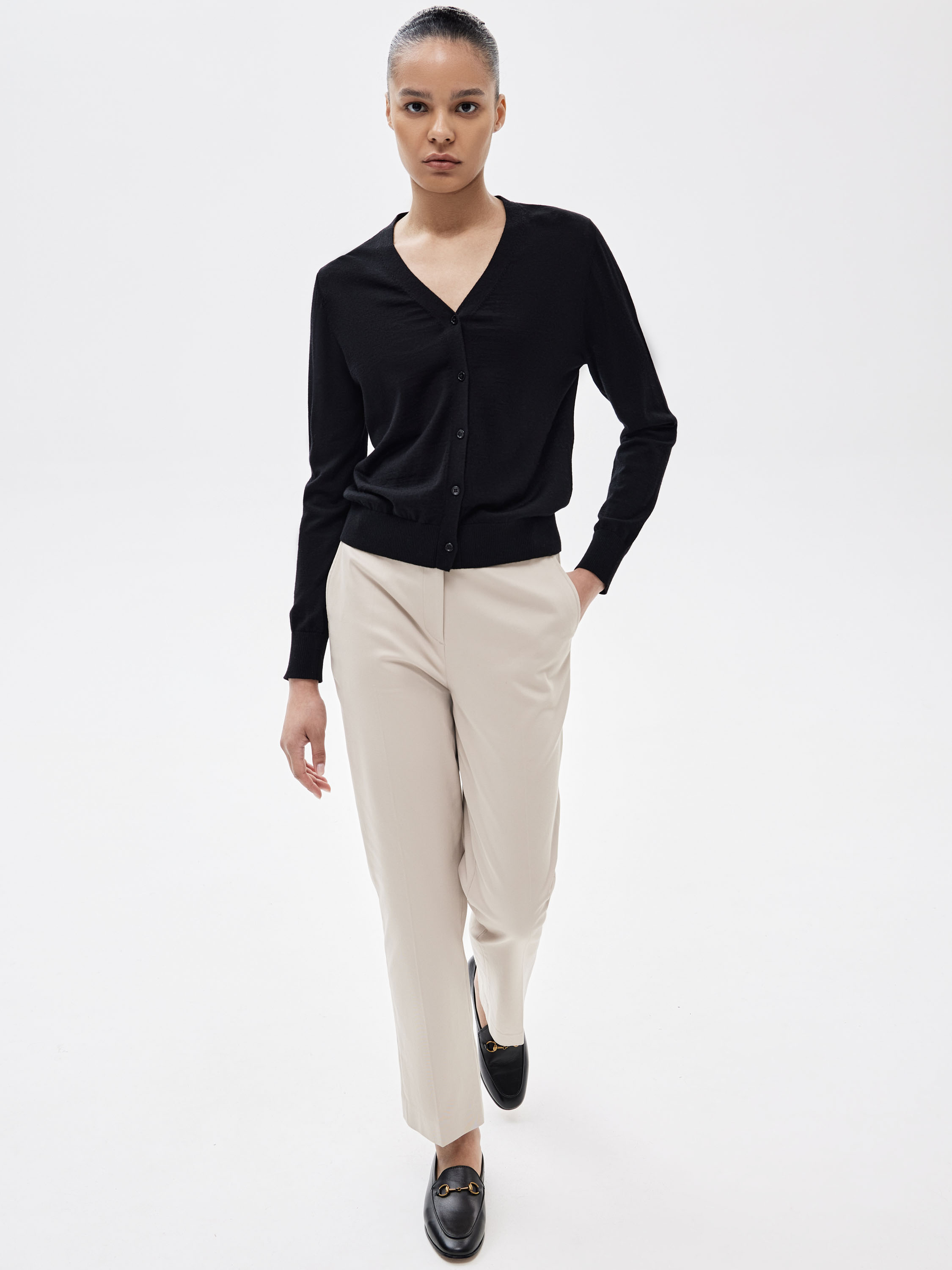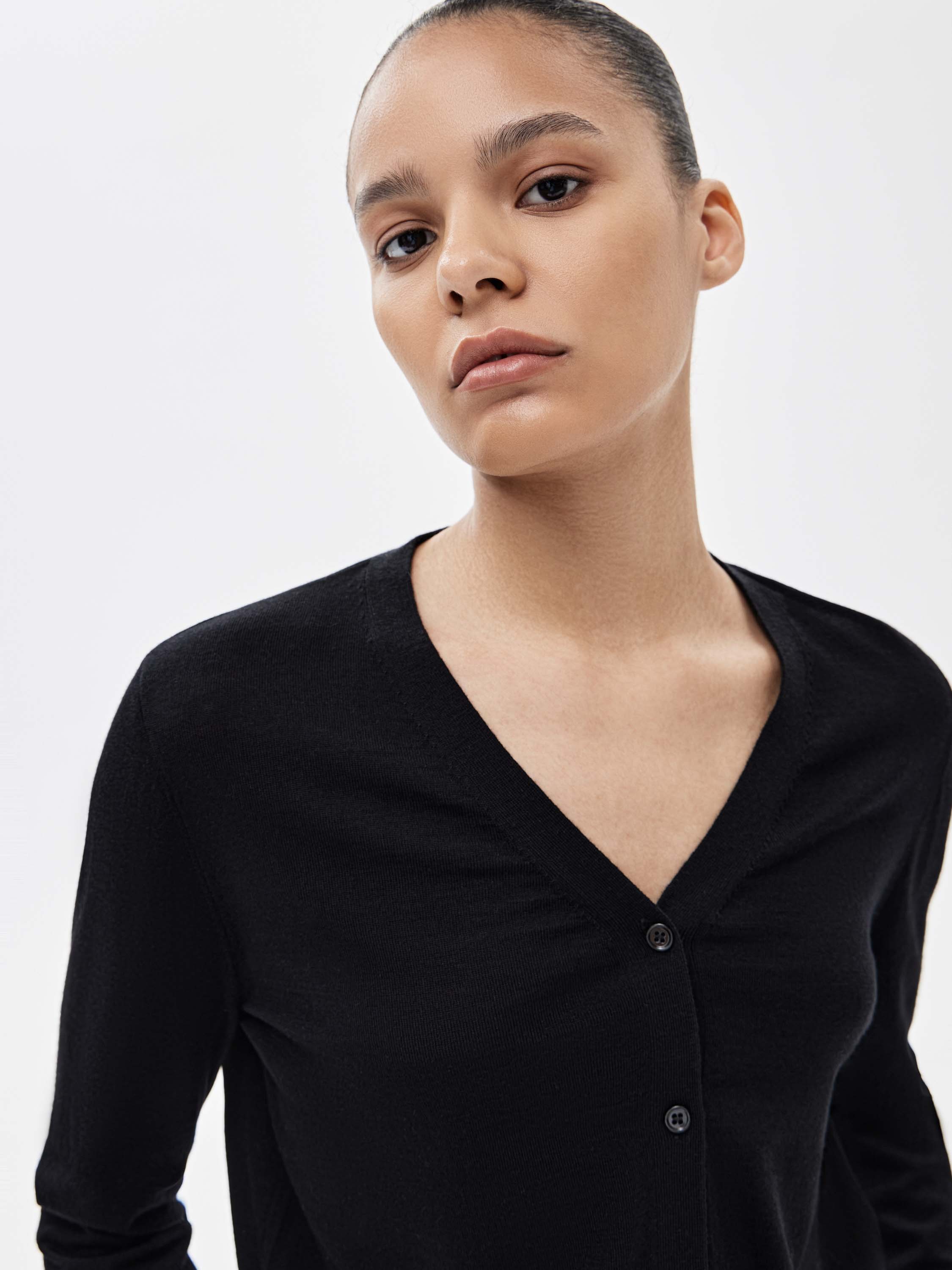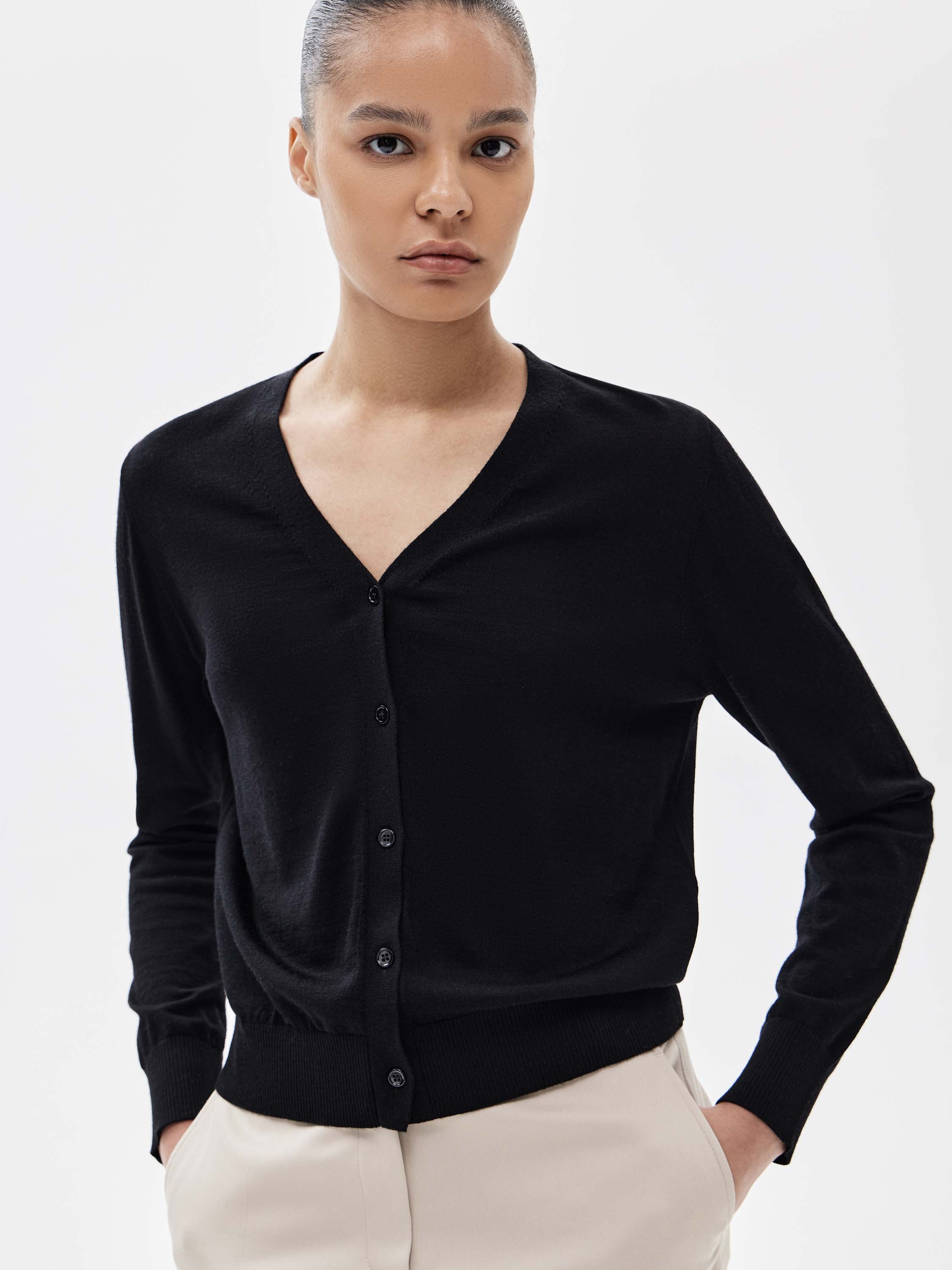 Кардиган выполнен из тонкого шерстяного трикотажа с ровным, аккуратным полотном. Материал легкий, мягкий к телу, хорошо дышит и комфортен в носке, подходит для многослойных сочетаний. Силуэт прямой, с мягкой посадкой по фигуре, без излишнего объема. V-образный вырез формирует чистую линию горловины и делает модель универсальной для сочетаний с топами, рубашками и водолазками. Застежка на пуговицы и эластичная отделка по низу и манжетам добавляют модели собранности и аккуратного вида. Кардиган легко вписывается в повседневный гардероб и сочетается с костюмными брюками, юбками и денимом.
