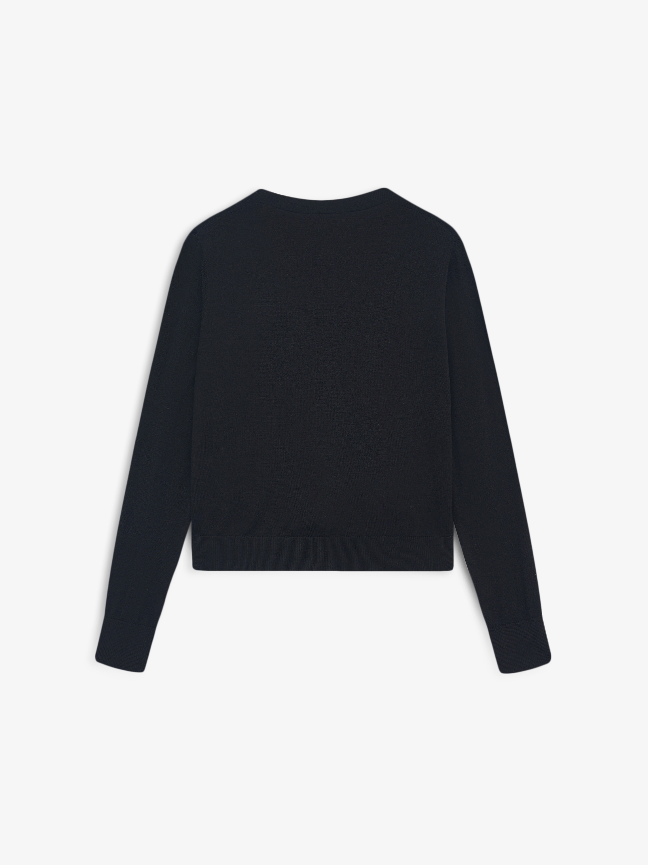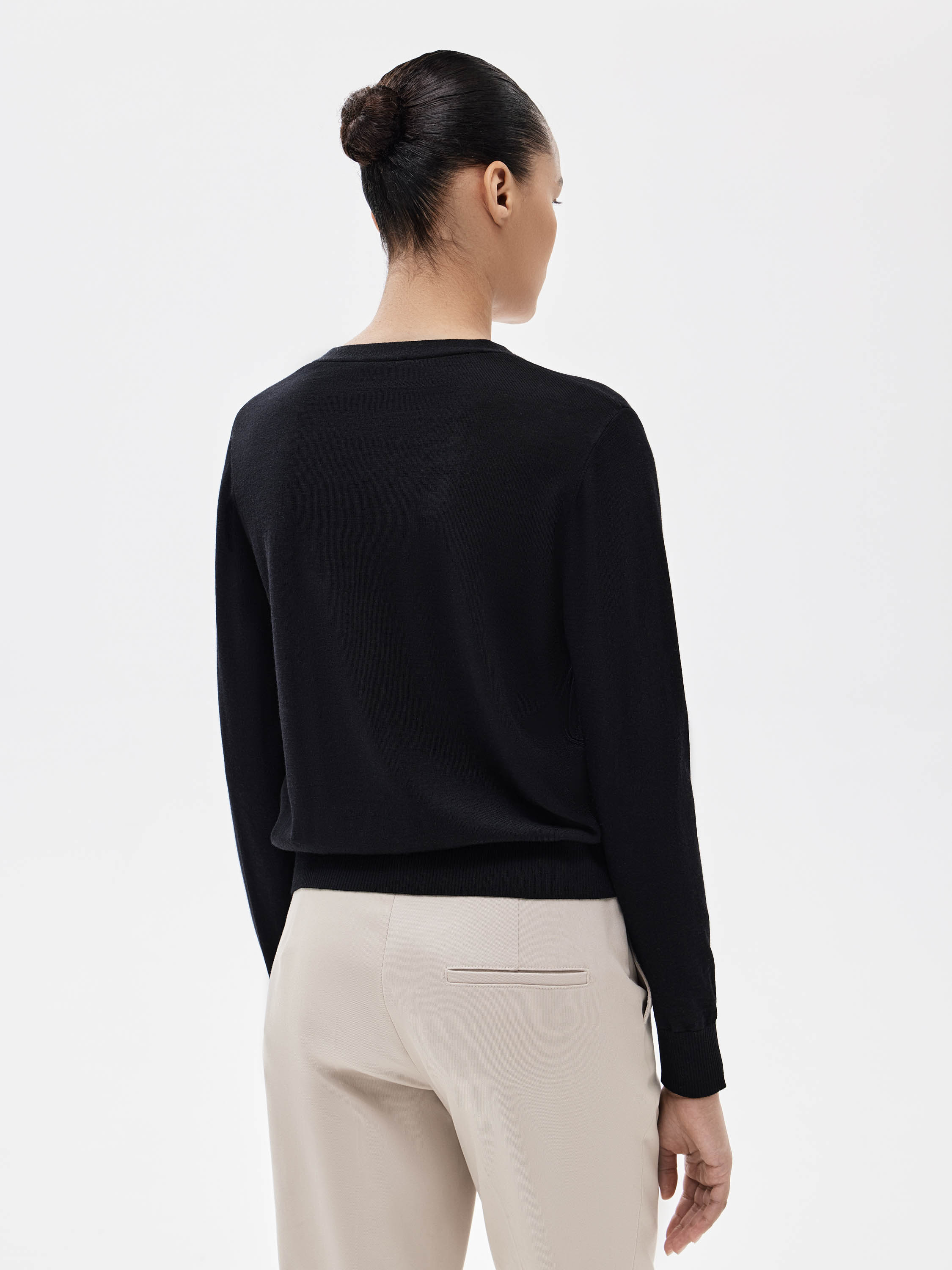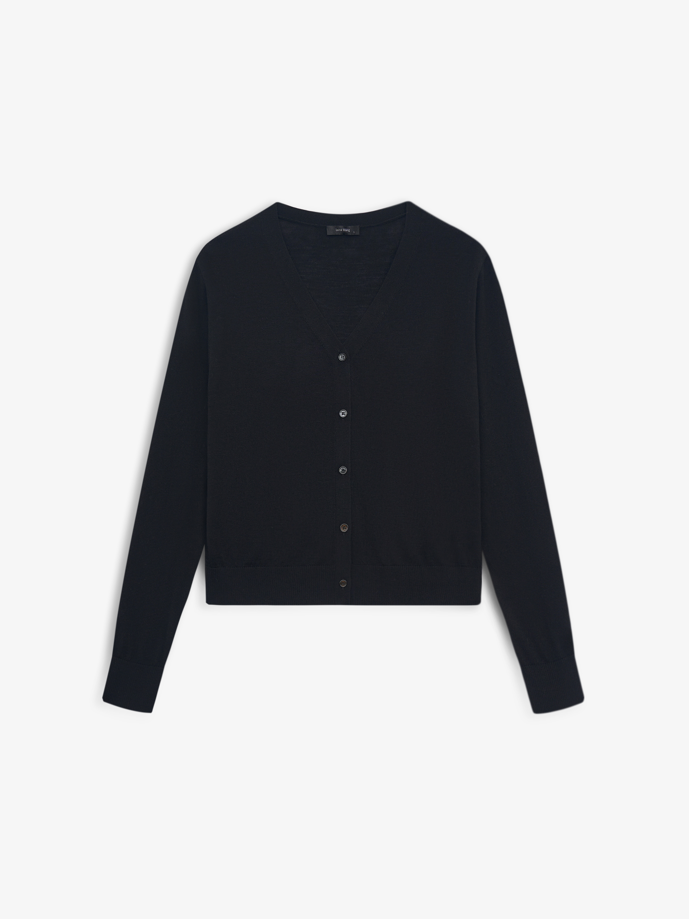 Кардиган выполнен из тонкого шерстяного трикотажа с ровным, аккуратным полотном. Материал легкий, мягкий к телу, хорошо дышит и комфортен в носке, подходит для многослойных сочетаний. Силуэт прямой, с мягкой посадкой по фигуре, без излишнего объема. V-образный вырез формирует чистую линию горловины и делает модель универсальной для сочетаний с топами, рубашками и водолазками. Застежка на пуговицы и эластичная отделка по низу и манжетам добавляют модели собранности и аккуратного вида. Кардиган легко вписывается в повседневный гардероб и сочетается с костюмными брюками, юбками и денимом.