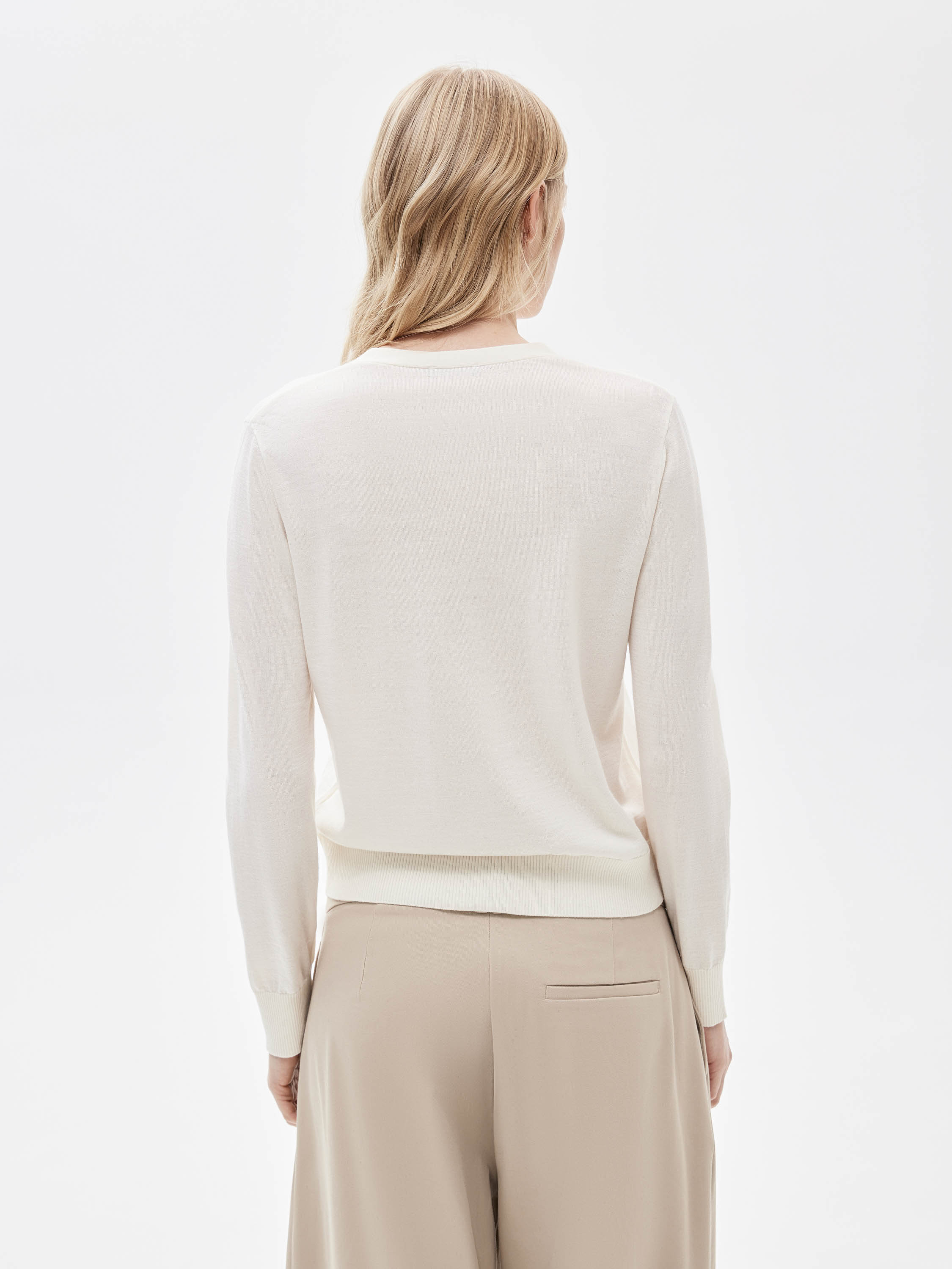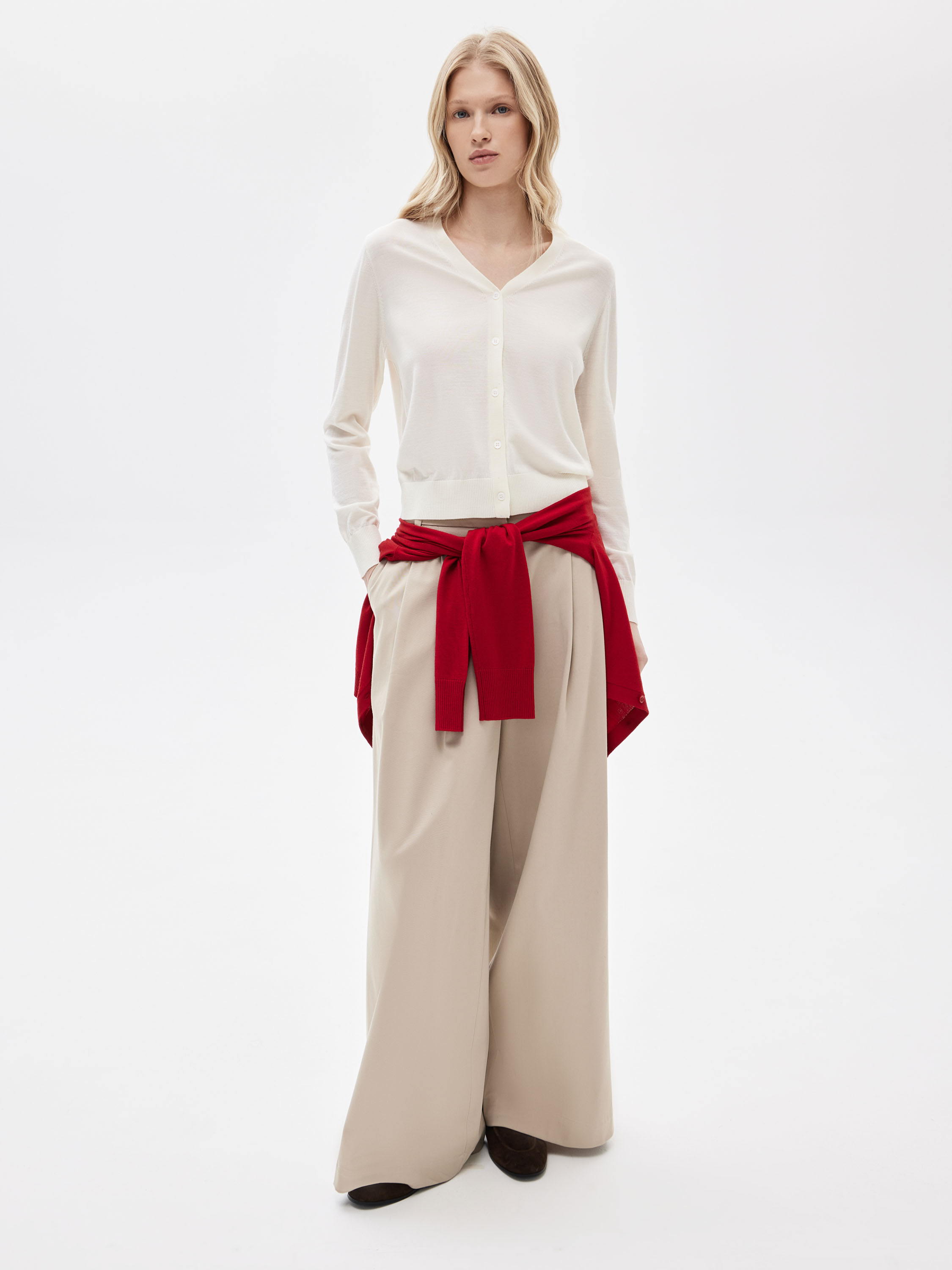 Кардиган выполнен из тонкого шерстяного трикотажа с ровным, аккуратным полотном. Материал легкий, мягкий к телу, хорошо дышит и комфортен в носке, подходит для многослойных сочетаний. Силуэт прямой, с мягкой посадкой по фигуре, без излишнего объема. V-образный вырез формирует чистую линию горловины и делает модель универсальной для сочетаний с топами, рубашками и водолазками. Застежка на пуговицы и эластичная отделка по низу и манжетам добавляют модели собранности и аккуратного вида. Кардиган легко вписывается в повседневный гардероб и сочетается с костюмными брюками, юбками и денимом.