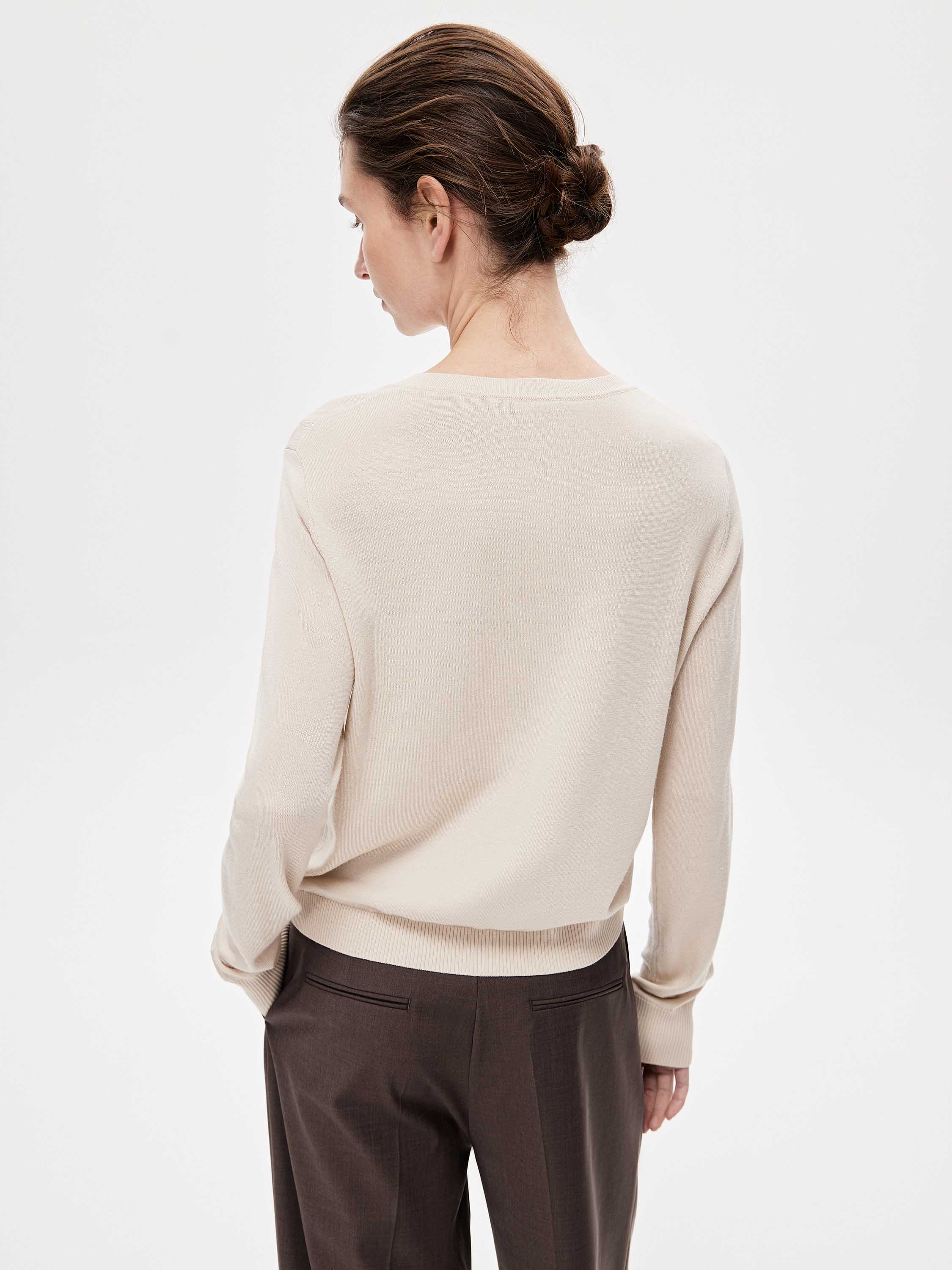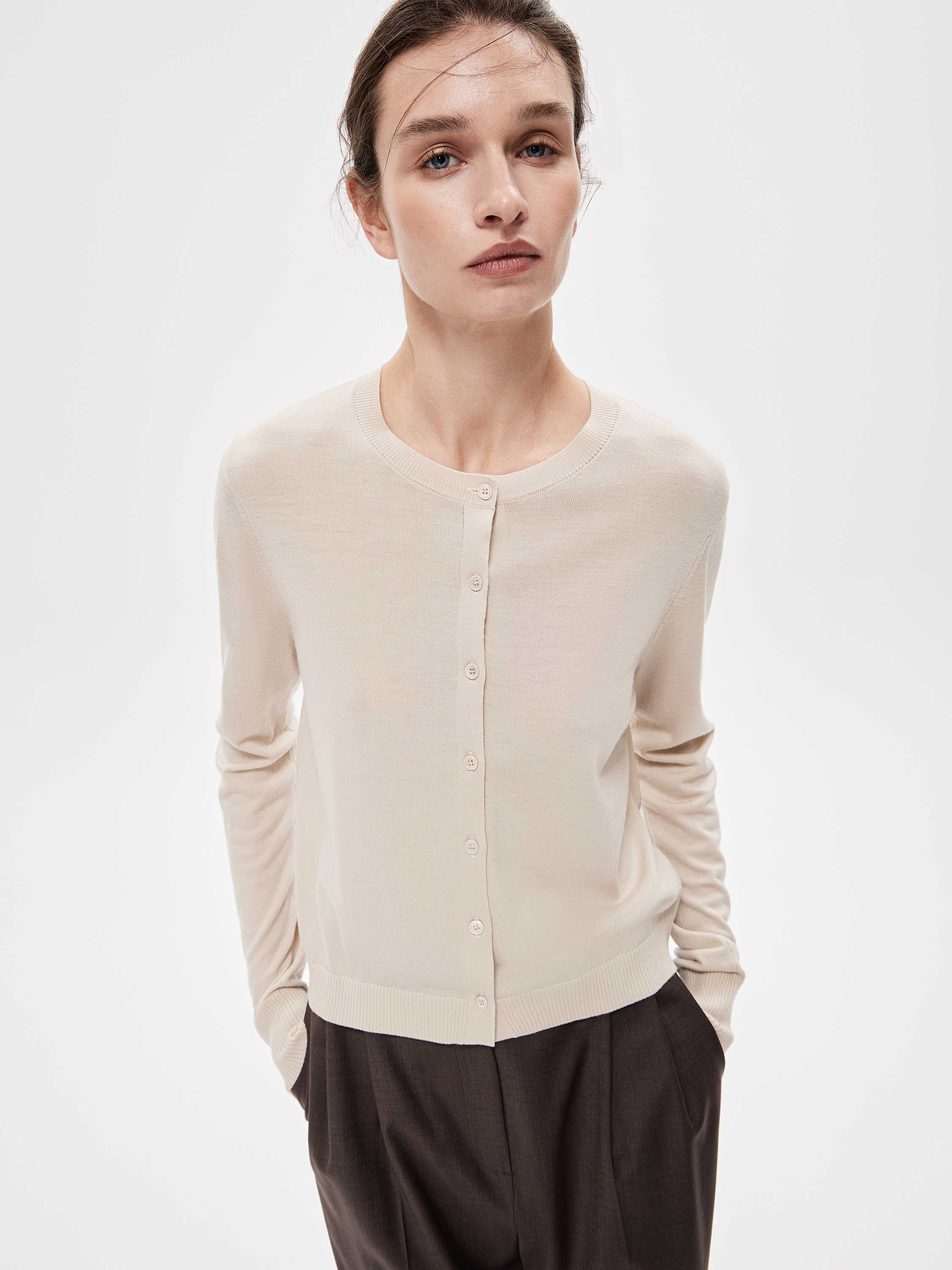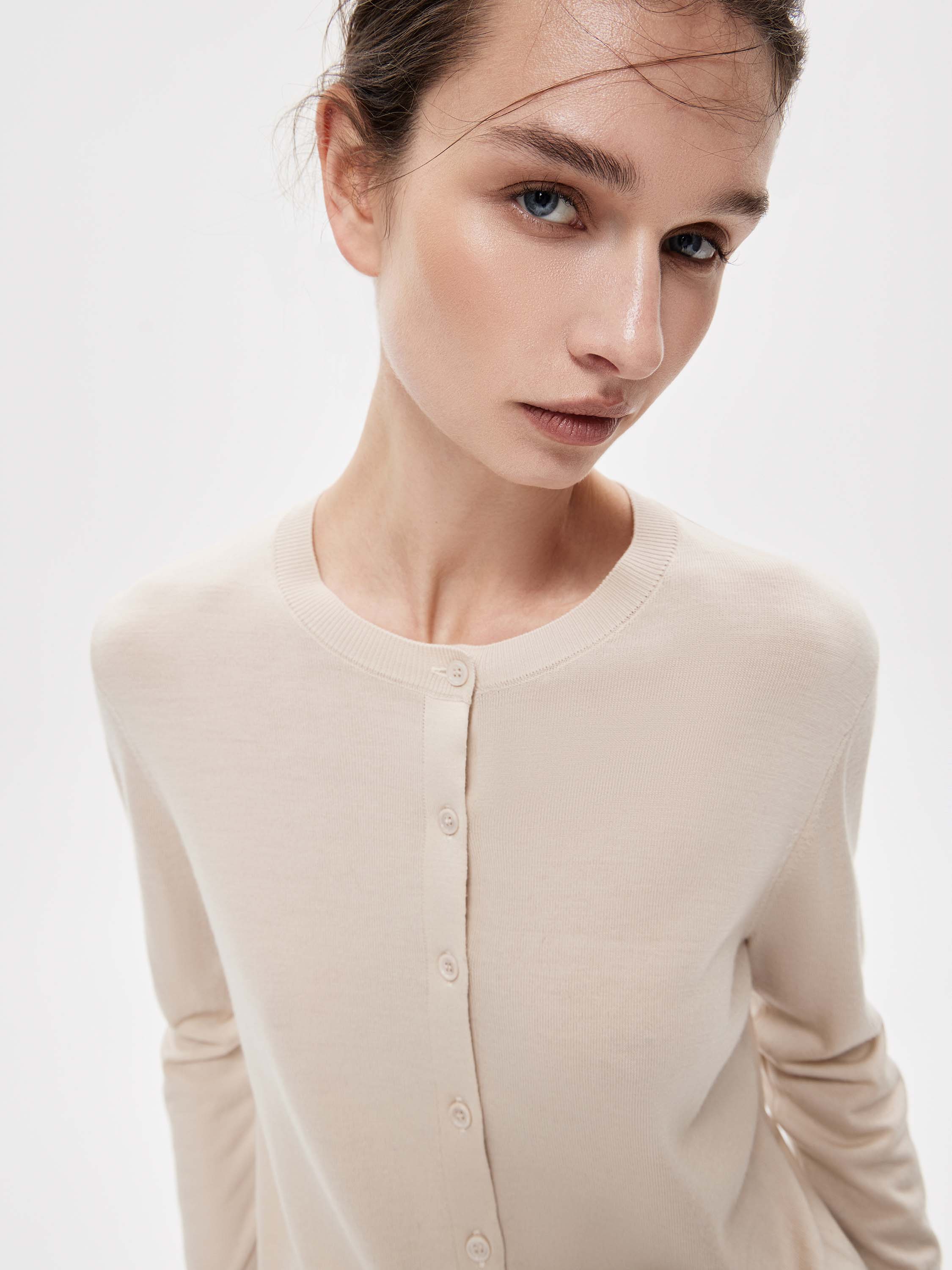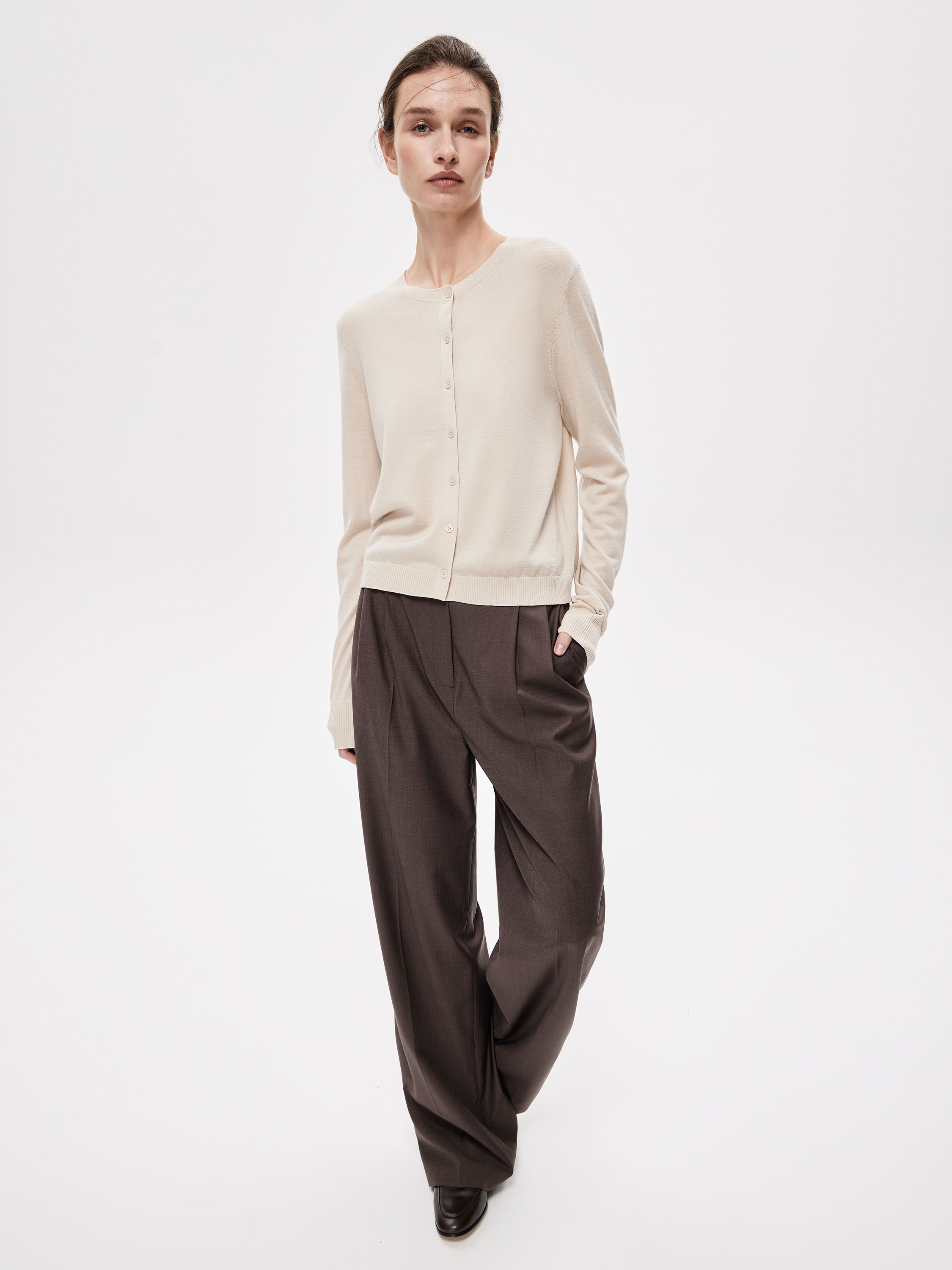Кардиган выполнен из тонкого шерстяного трикотажа с ровным, аккуратным полотном. Материал мягкий, пластичный, комфортный к телу и подходит для повседневного ношения. Силуэт прямой, с мягкой посадкой по фигуре, без лишнего объема. Круглая линия горловины и застежка на пуговицы формируют спокойную, лаконичную композицию. Эластичная отделка по низу и манжетам аккуратно фиксирует форму. Модель органично вписывается как в самостоятельные образы, так и в многослойные сочетания. Кардиган сочетается с костюмными брюками, юбками и денимом, дополняя базовый гардероб.