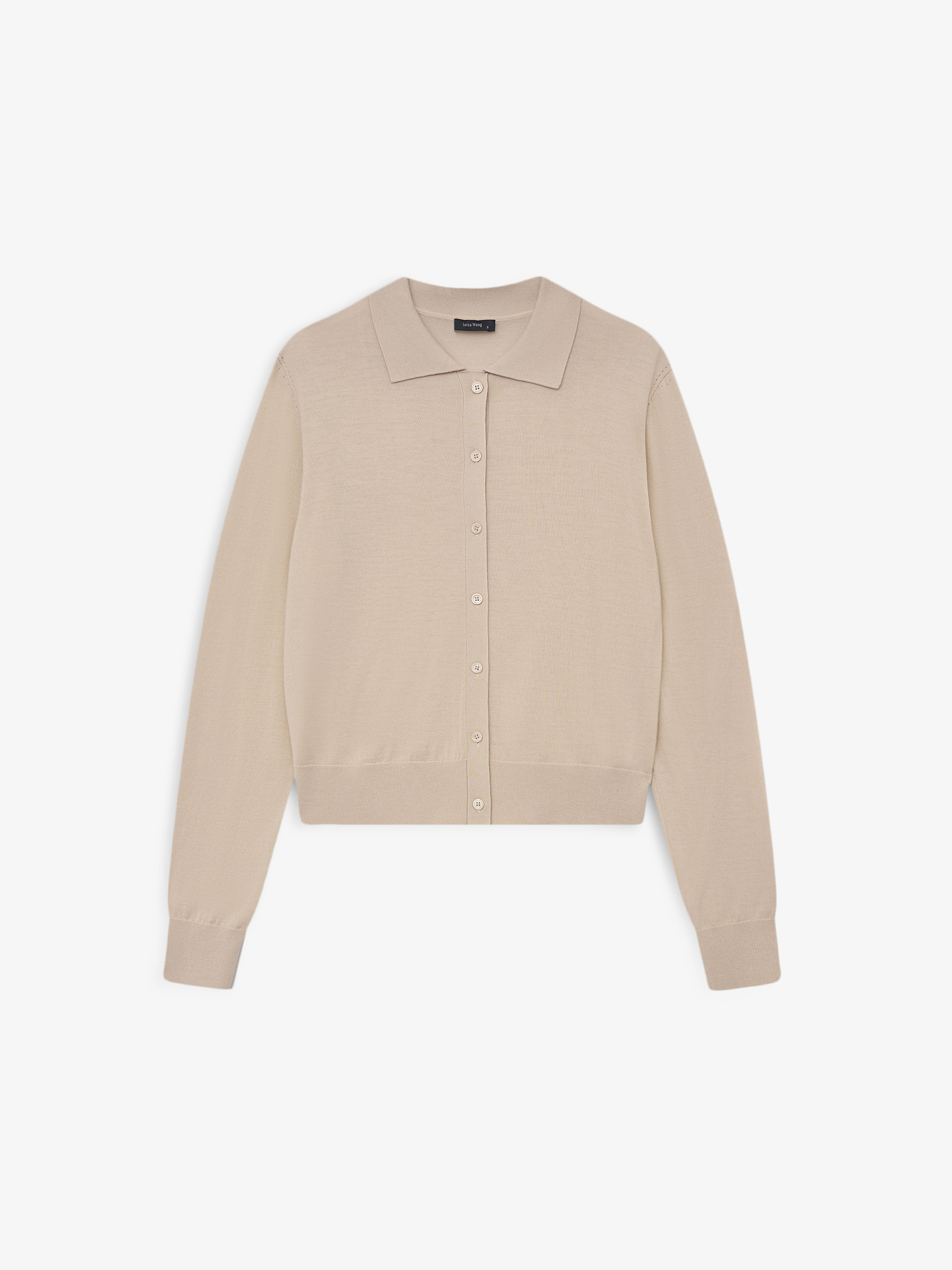Кардиган из тонкого шерстяного трикотажа с мягкой, ровной поверхностью и деликатной фактурой. Полотно легкое, дышащее, удерживает тепло и обеспечивает комфорт в течение дня. Силуэт прямой, с мягкой линией плеча и длинным рукавом. Воротник отложной, с аккуратной планкой на пуговицах. Низ и манжеты оформлены эластичной резинкой. Сочетается с брюками, юбками и денимом, подходит для повседневных и более собранных образов.