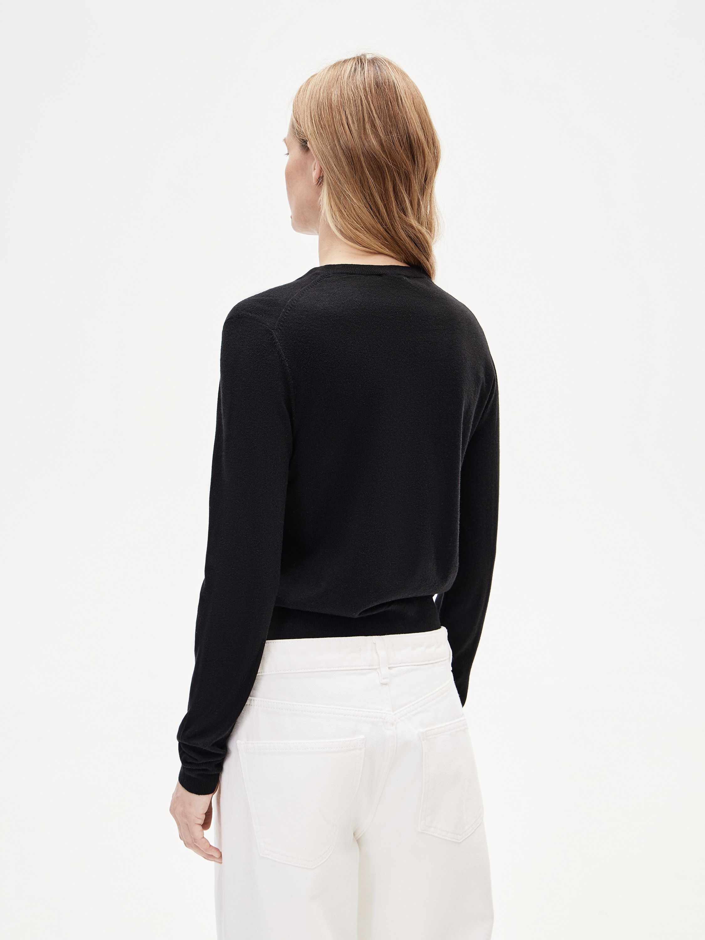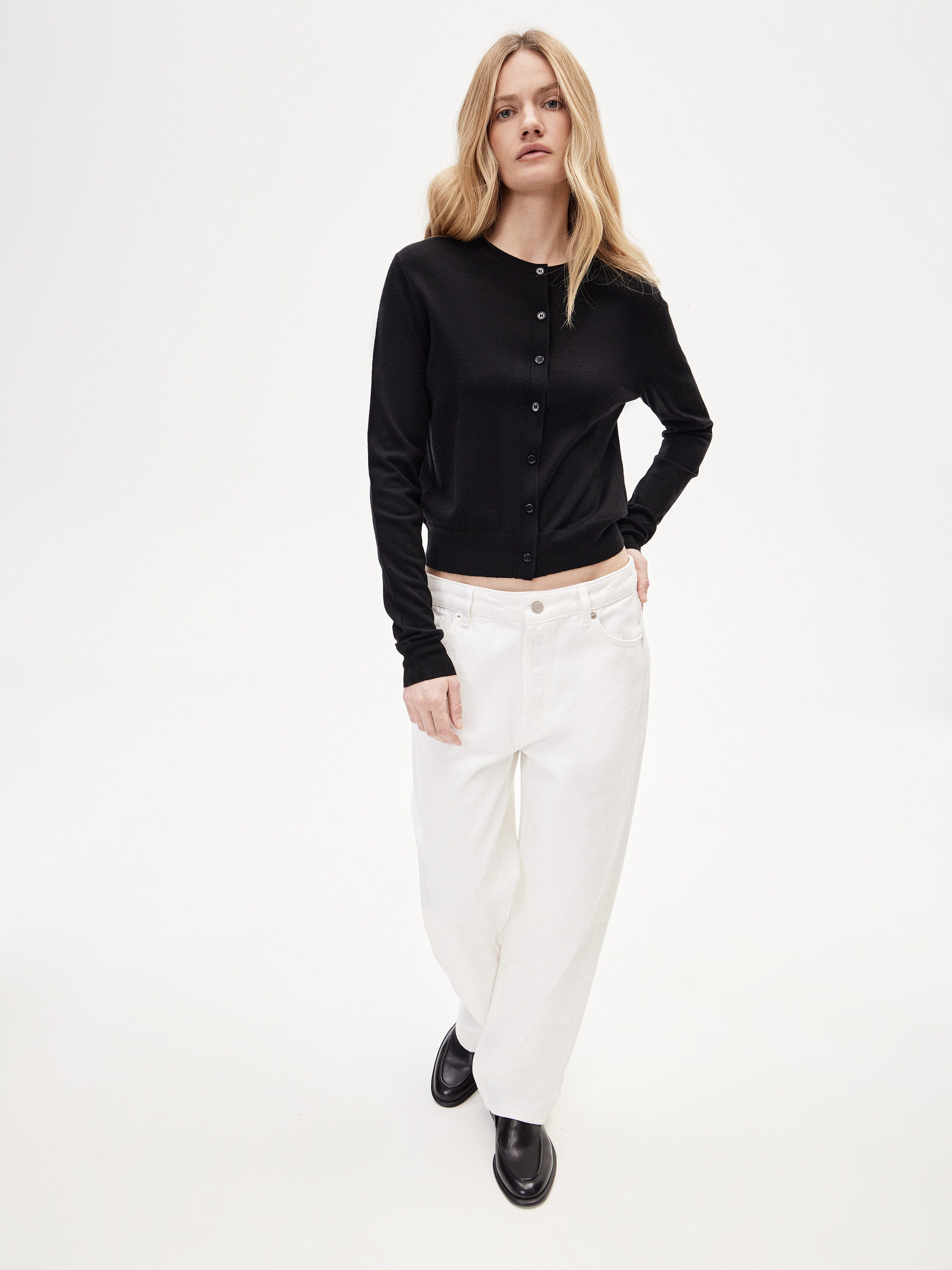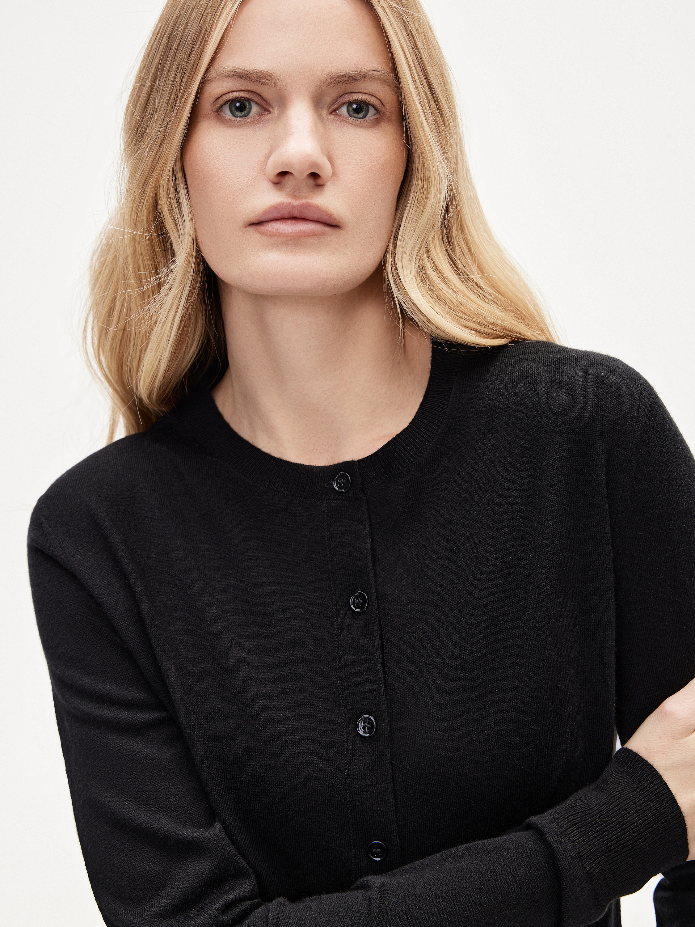Кардиган выполнен из смесовой пряжи с добавлением шерсти, за счет чего материал остается мягким, теплым и комфортным в носке, при этом лучше держит форму и меньше вытягивается. Трикотаж средней плотности, пластичный, аккуратно ложится по фигуре. Модель с круглым вырезом и застежкой на пуговицы выстроена по силуэту, подчеркивает линию плеч и талию, не перегружая образ. Низ и манжеты оформлены эластичной вязкой, благодаря чему посадка выглядит структурной. Глубокий черный оттенок универсален и сочетается как со светлым денимом, так и с классическими брюками или юбками.