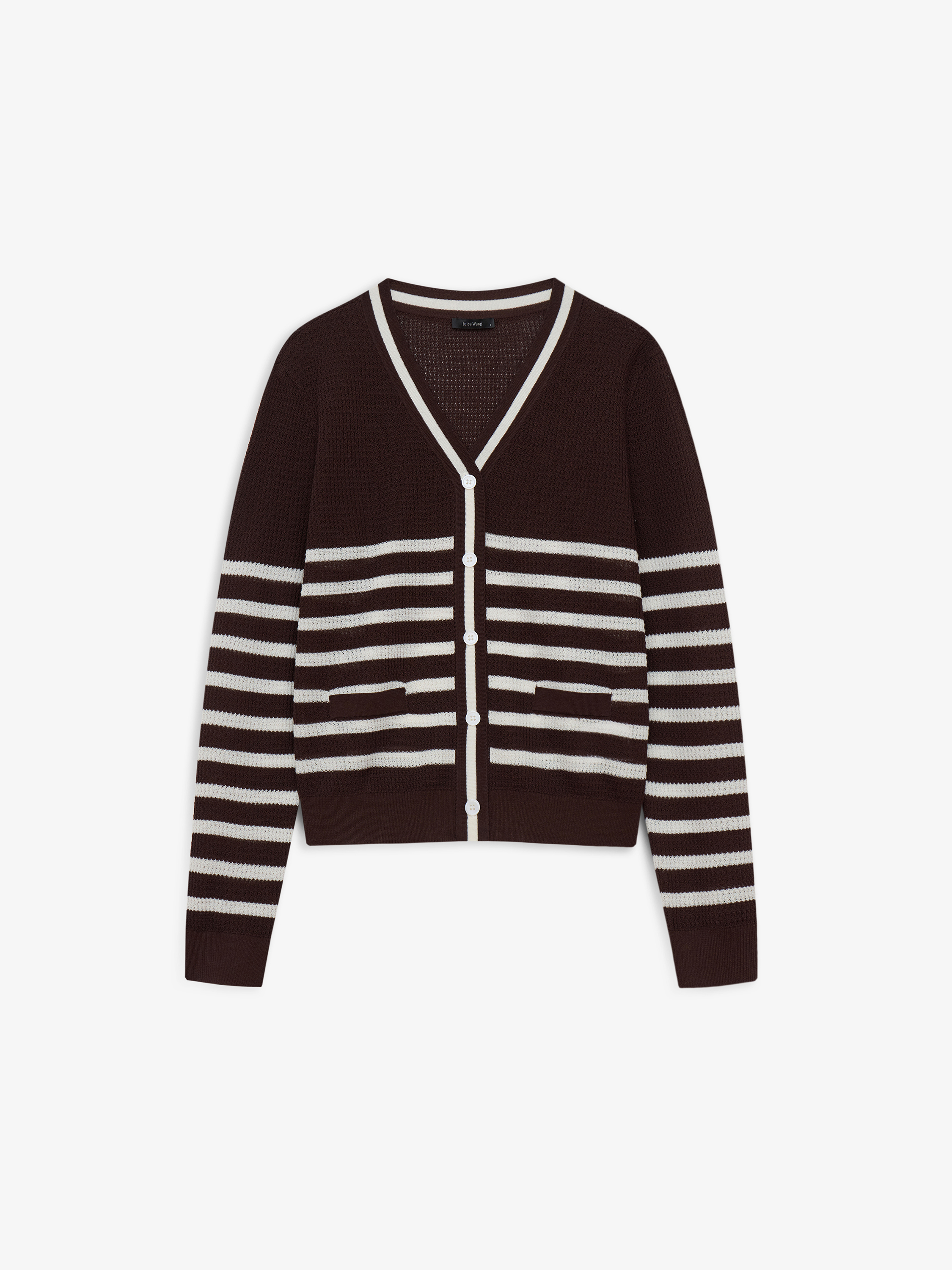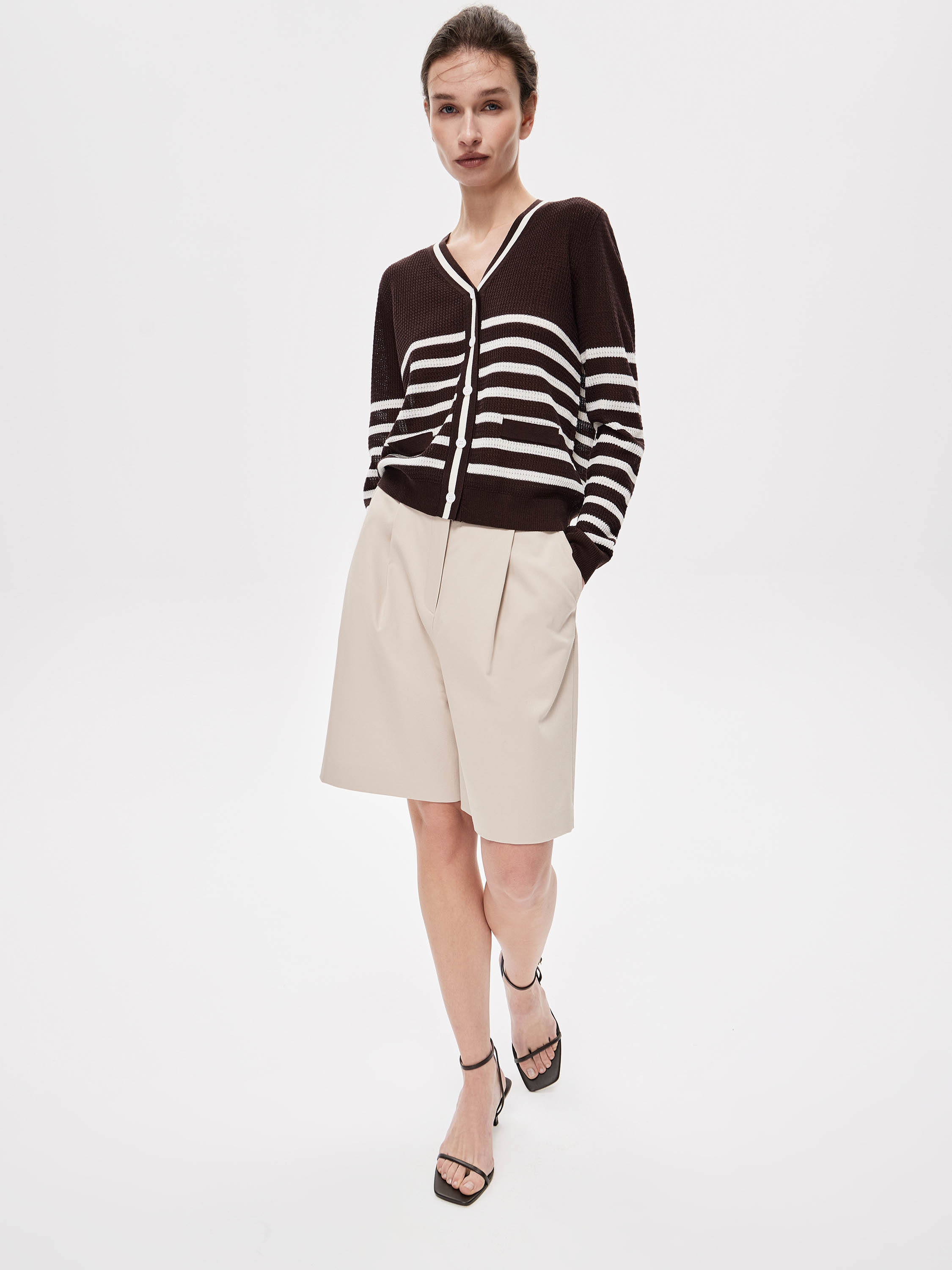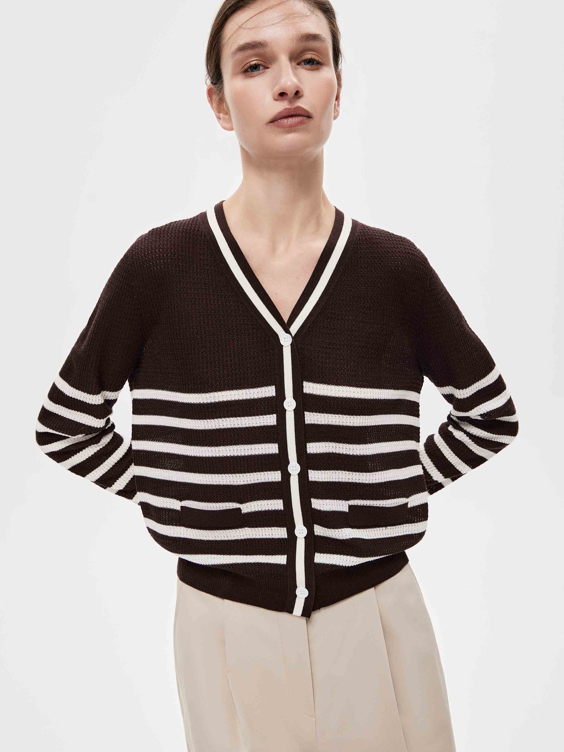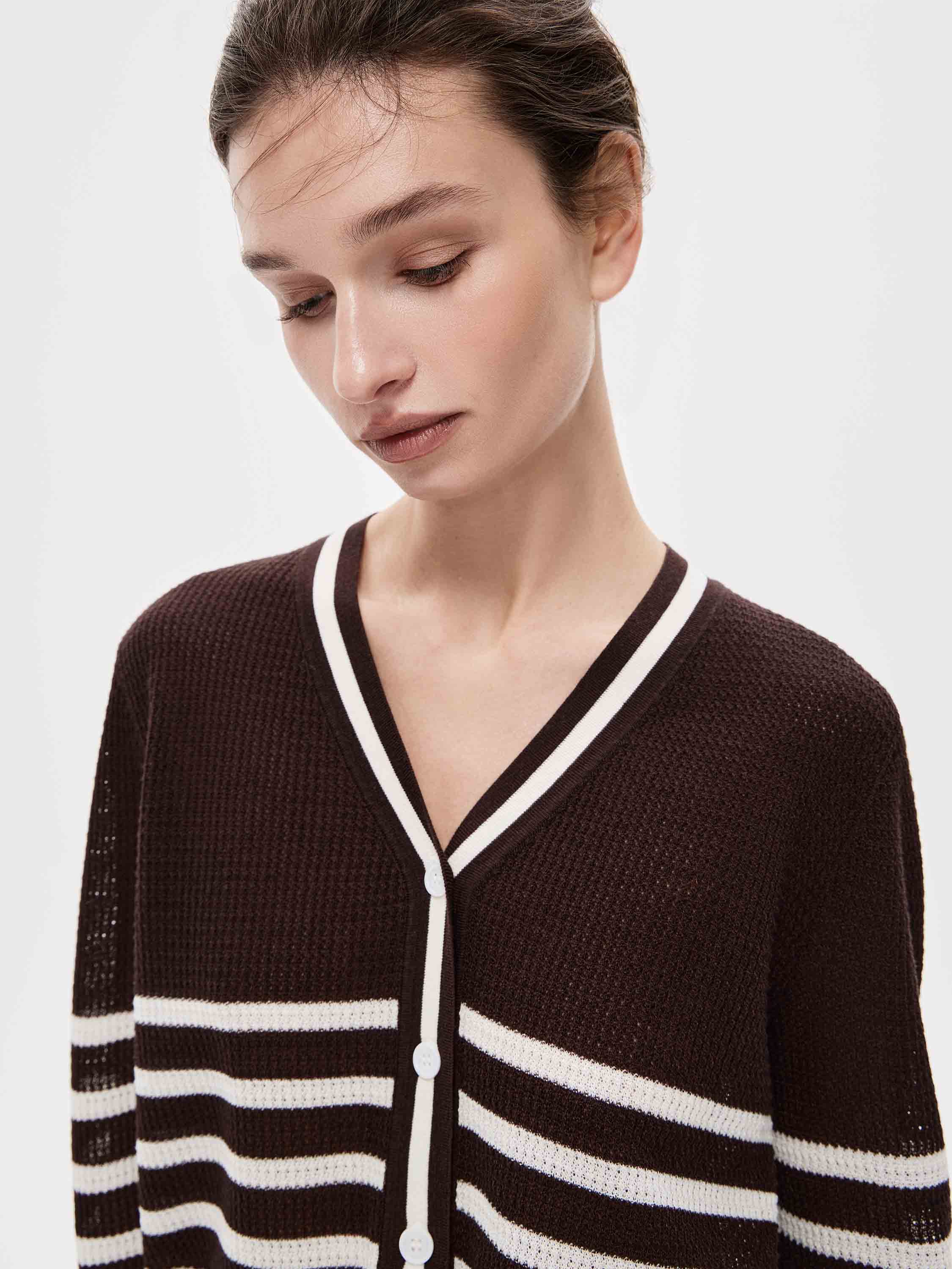 Кардиган выполнен из мягкого трикотажа с добавлением льна и тенсела. Силуэт прямой, классической длины. V-образный вырез формирует чистую линию горловины, застежка на пуговицы выстраивает аккуратную вертикаль. Манжеты и нижний край оформлены плотной, аккуратной кромкой, которая держит форму и задает четкий контур изделия. Контрастная полоска выстроена ритмично и графично, не дробит силуэт и сохраняет целостность модели. Кардиган легко вписывается в повседневный гардероб и подходит для сочетаний с юбками, брюками и платьями.