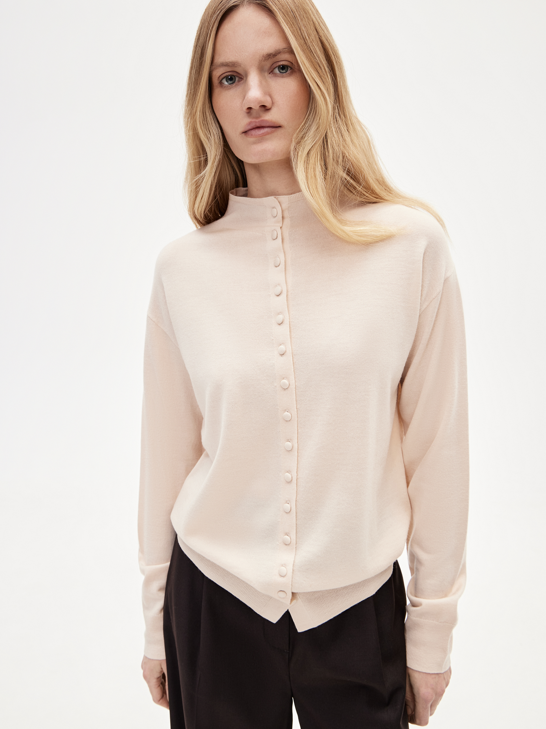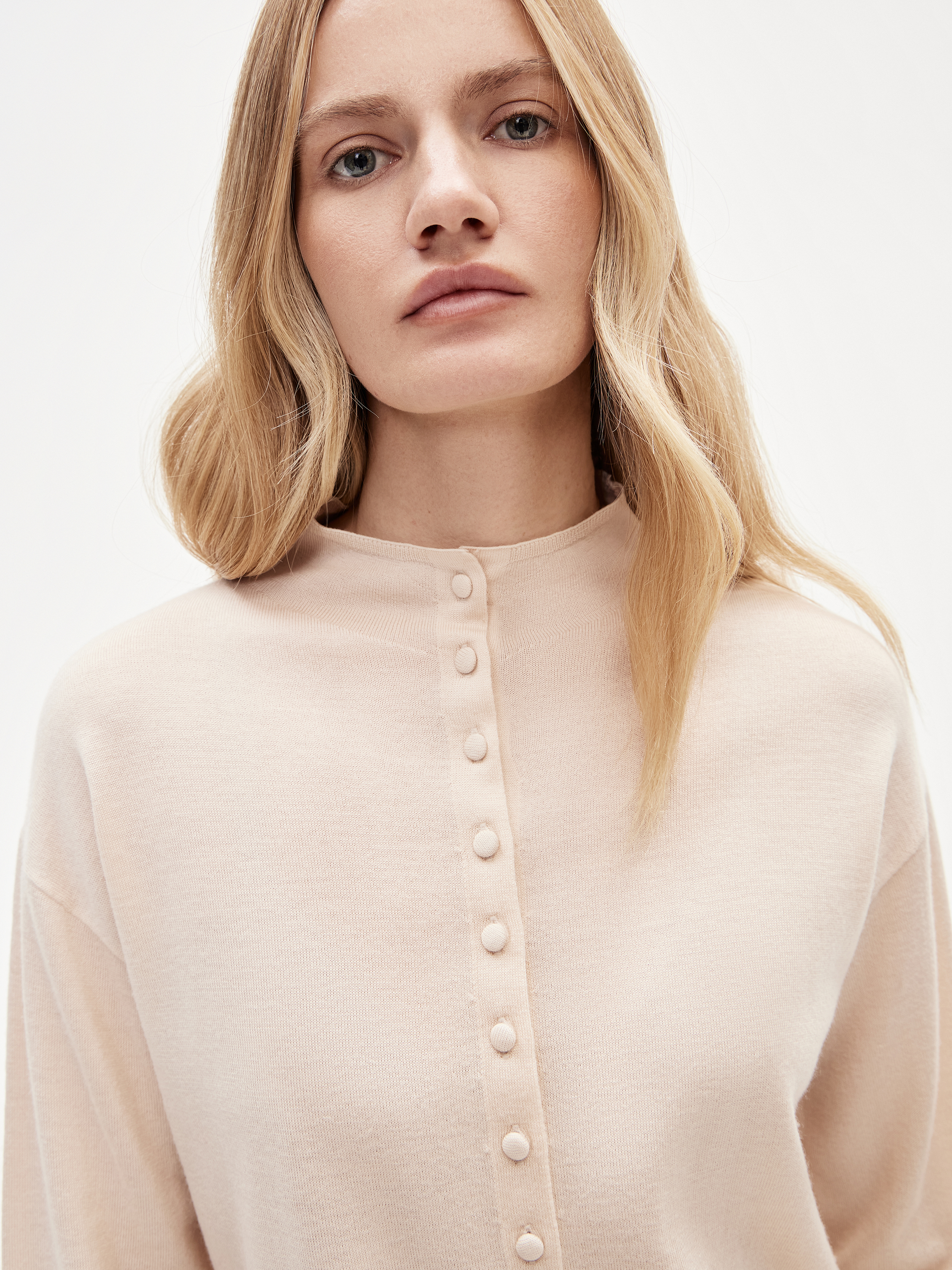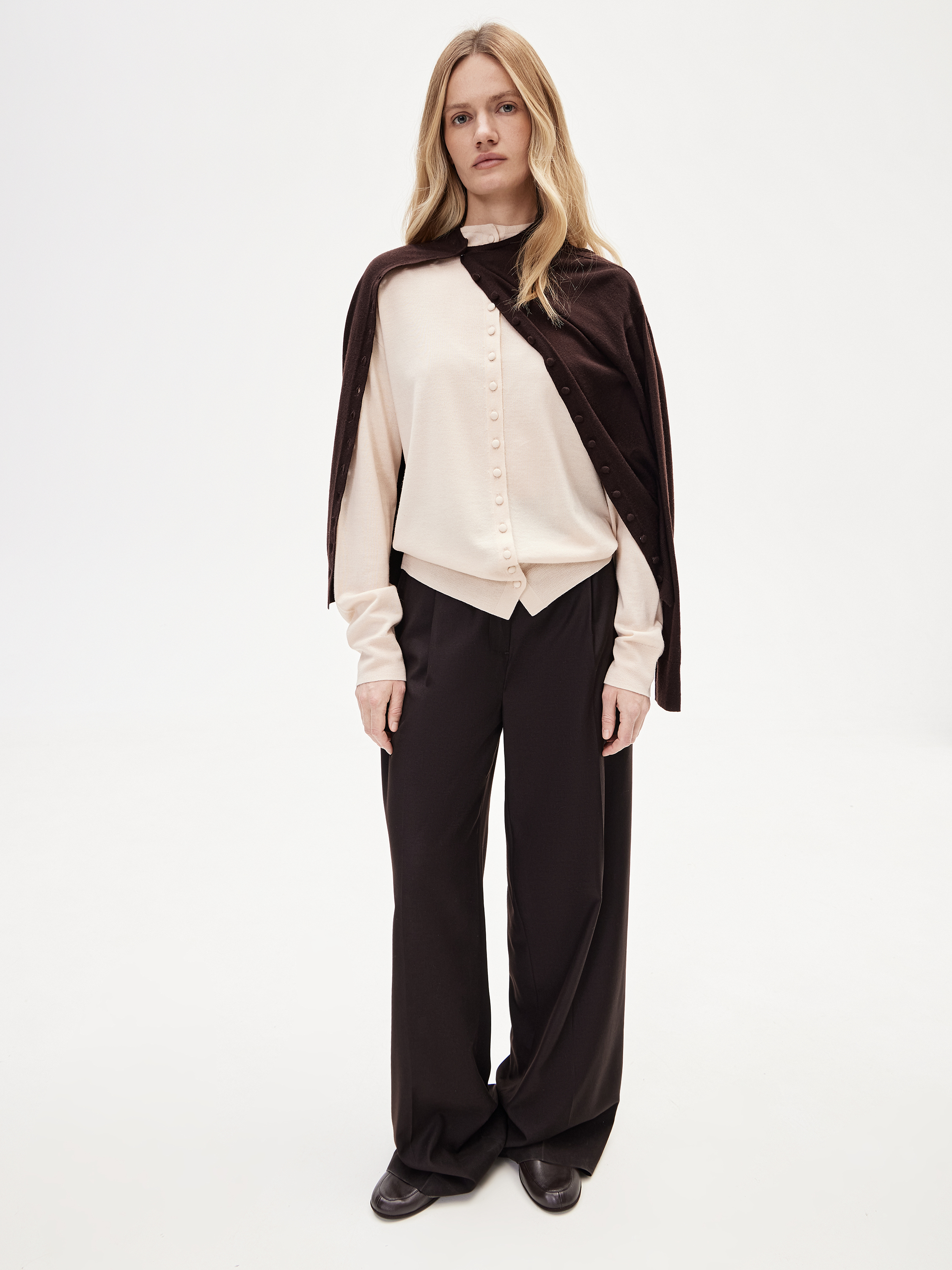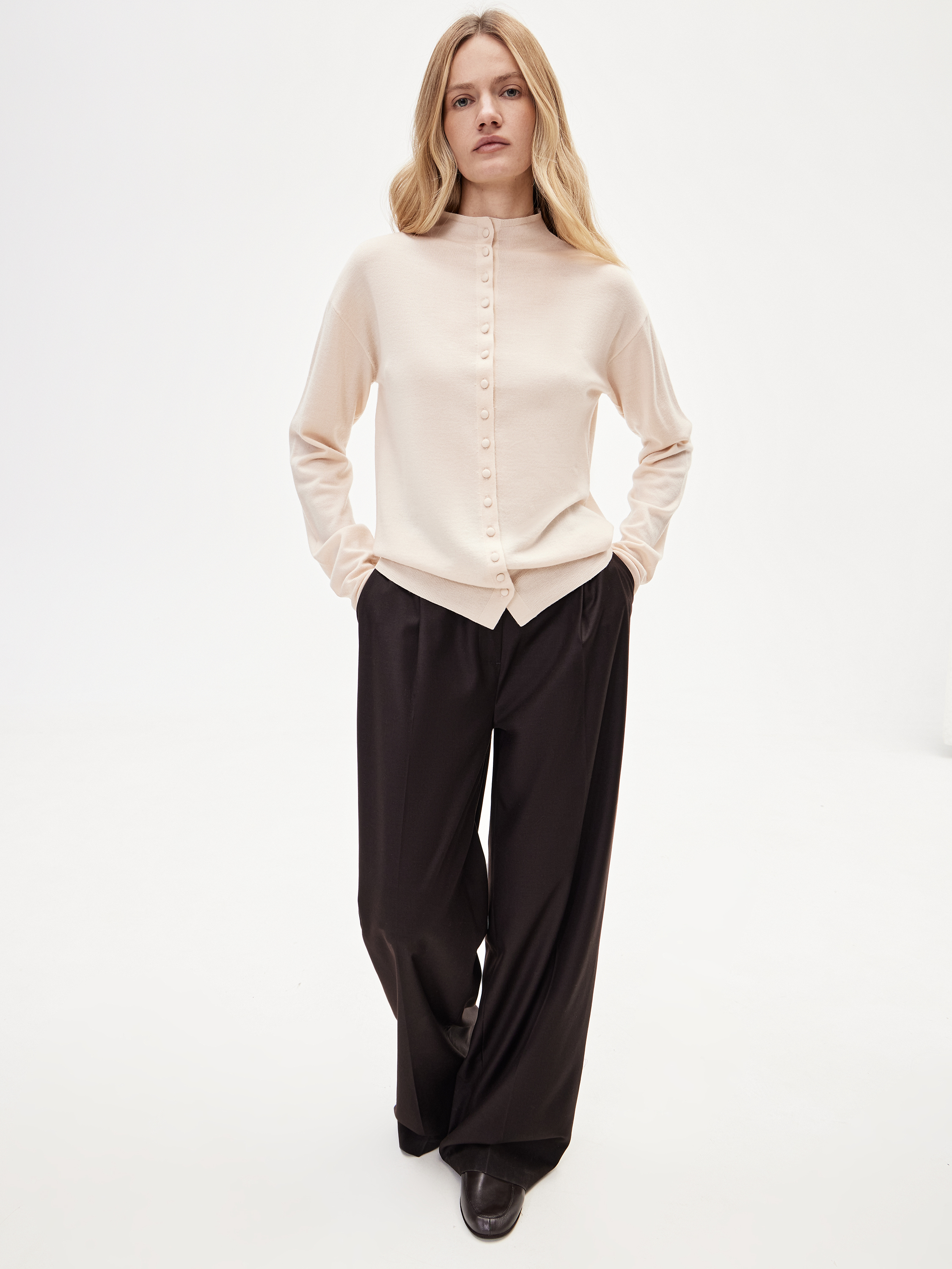 Кардиган выполнен из 100% шерсти мериноса. Трикотаж мягкий, теплый и дышащий, комфортно прилегает к телу и сохраняет форму в течение дня. Модель с круглым вырезом и застежкой на ряд небольших пуговиц имеет фасон по фигуре без лишнего объема, благодаря чему силуэт выглядит элегантно и собранно. Яркий красный оттенок добавляет образу выразительности и может стать акцентом в базовом гардеробе. Носите с классическими брюками, юбкой миди или сочетайте с денимом для более расслабленных комплектов.