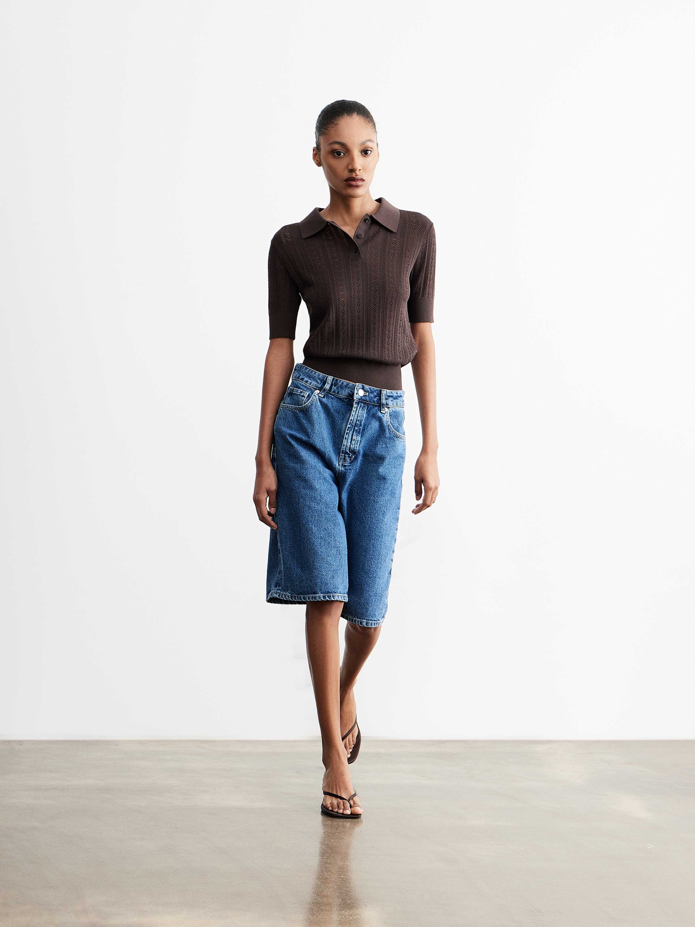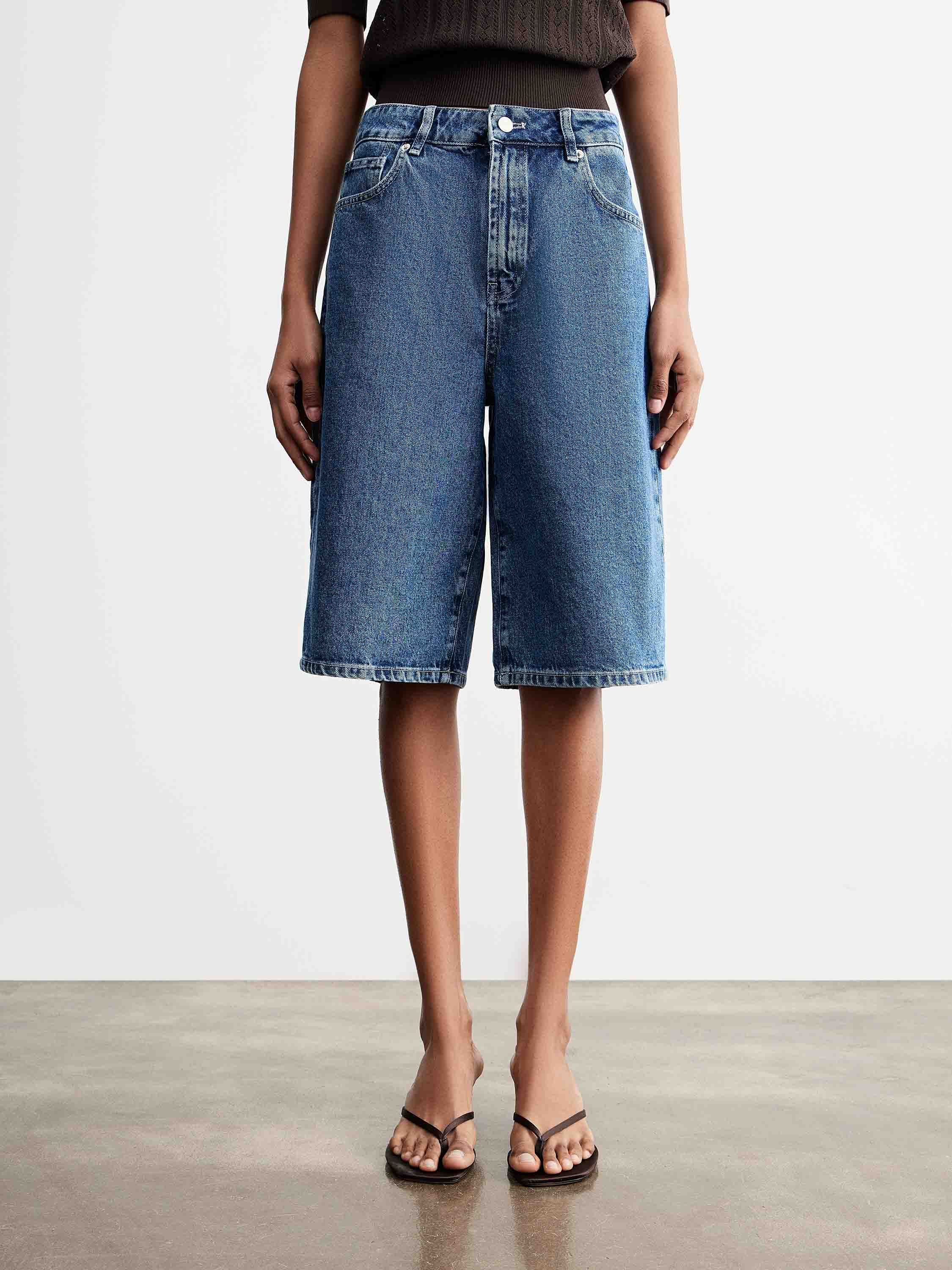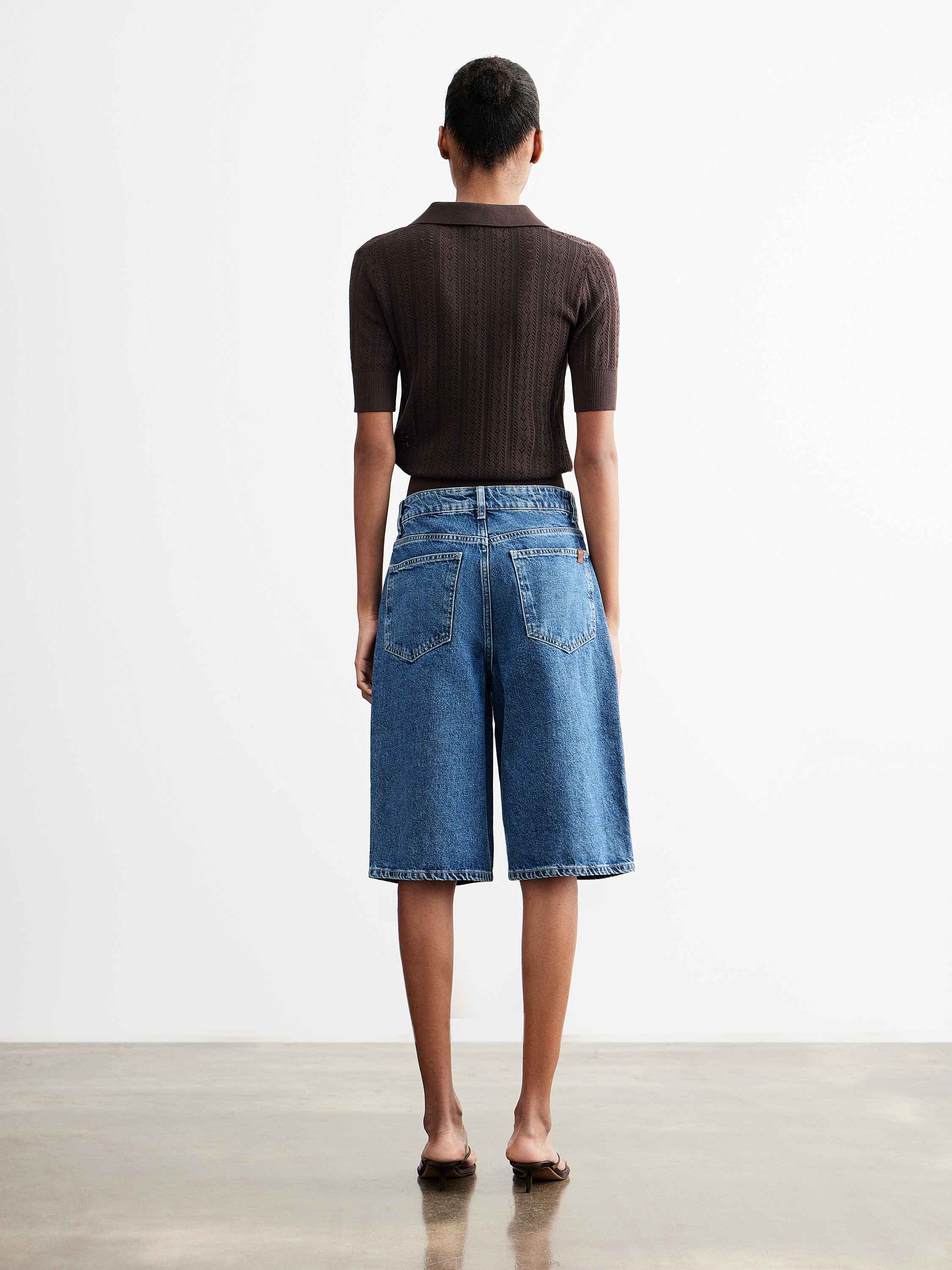 Джинсовые бермуды с прямым кроем и посадкой на линии талии, выполненные из плотного хлопкового денима с выраженной фактурой. Хлопок обеспечивает воздухопроницаемость и комфорт в носке, при этом деним держит форму и сохраняет структуру изделия. Модель длиной до колена с классической конструкцией: пояс со шлевками, застежка на пуговицу и молнию, пять карманов. Прямые штанины формируют четкую линию силуэта и создают сбалансированную пропорцию. Синий оттенок с мягким выбеливанием делает бермуды универсальными: они сочетаются как с трикотажем и рубашками, так и с более легкими топами, формируя повседневные комплекты.