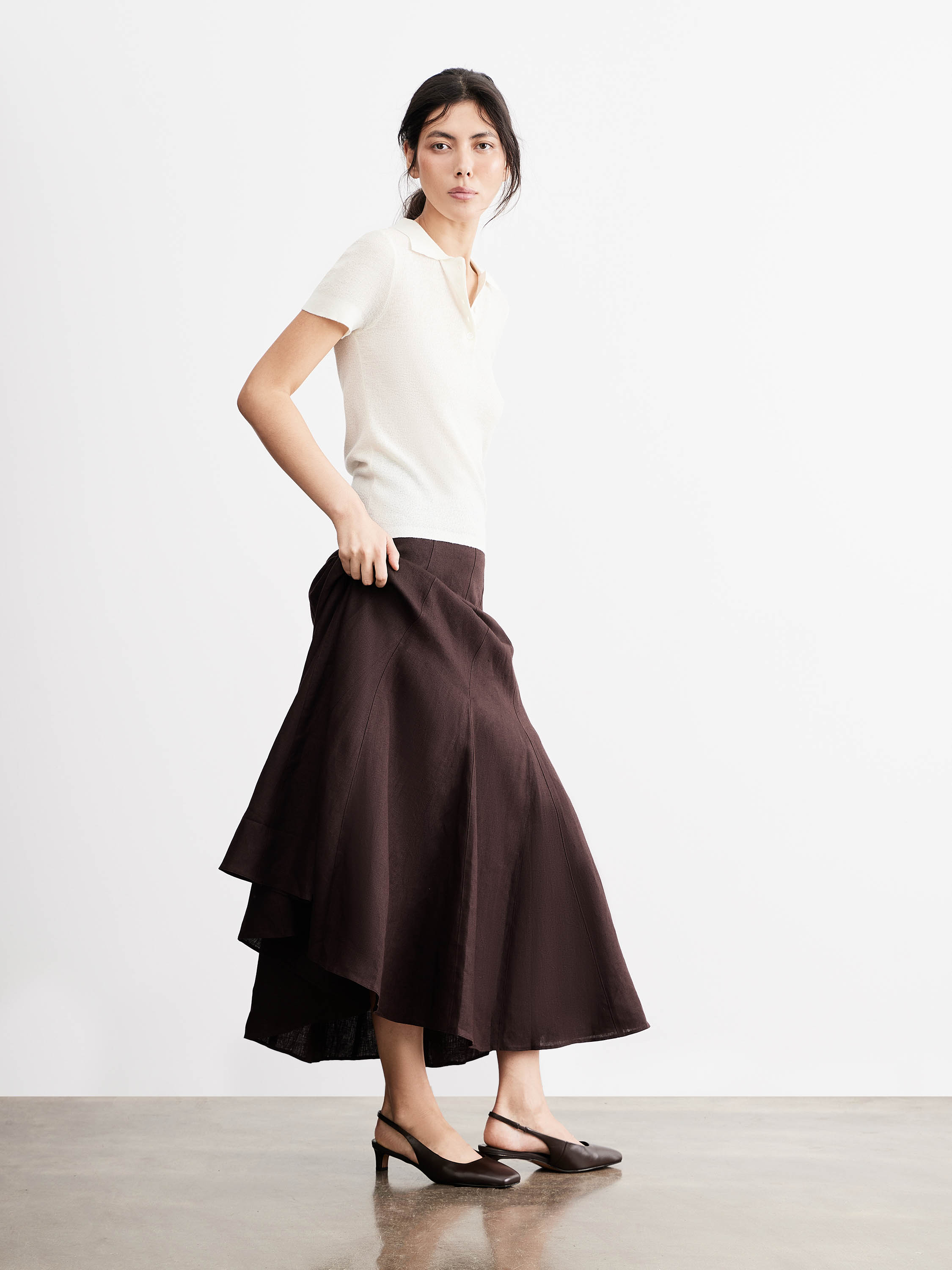 Туфли-слингбэки с лаконичным силуэтом и мягко вытянутой линией мыса. Закрытая конструкция с аккуратным вырезом по подъему обеспечивает плотную посадку и визуально удлиняет линию стопы. Верх из натуральной кожи с гладкой поверхностью сохраняет форму и адаптируется в носке. Подкладка из натуральной кожи поддерживает комфорт и воздухопроницаемость. Гибкая резиновая подошва отвечает за устойчивость и удобство в движении. Глубокий коричневый оттенок вписывается в базовую палитру и сочетается с денимом, костюмными брюками и юбками.