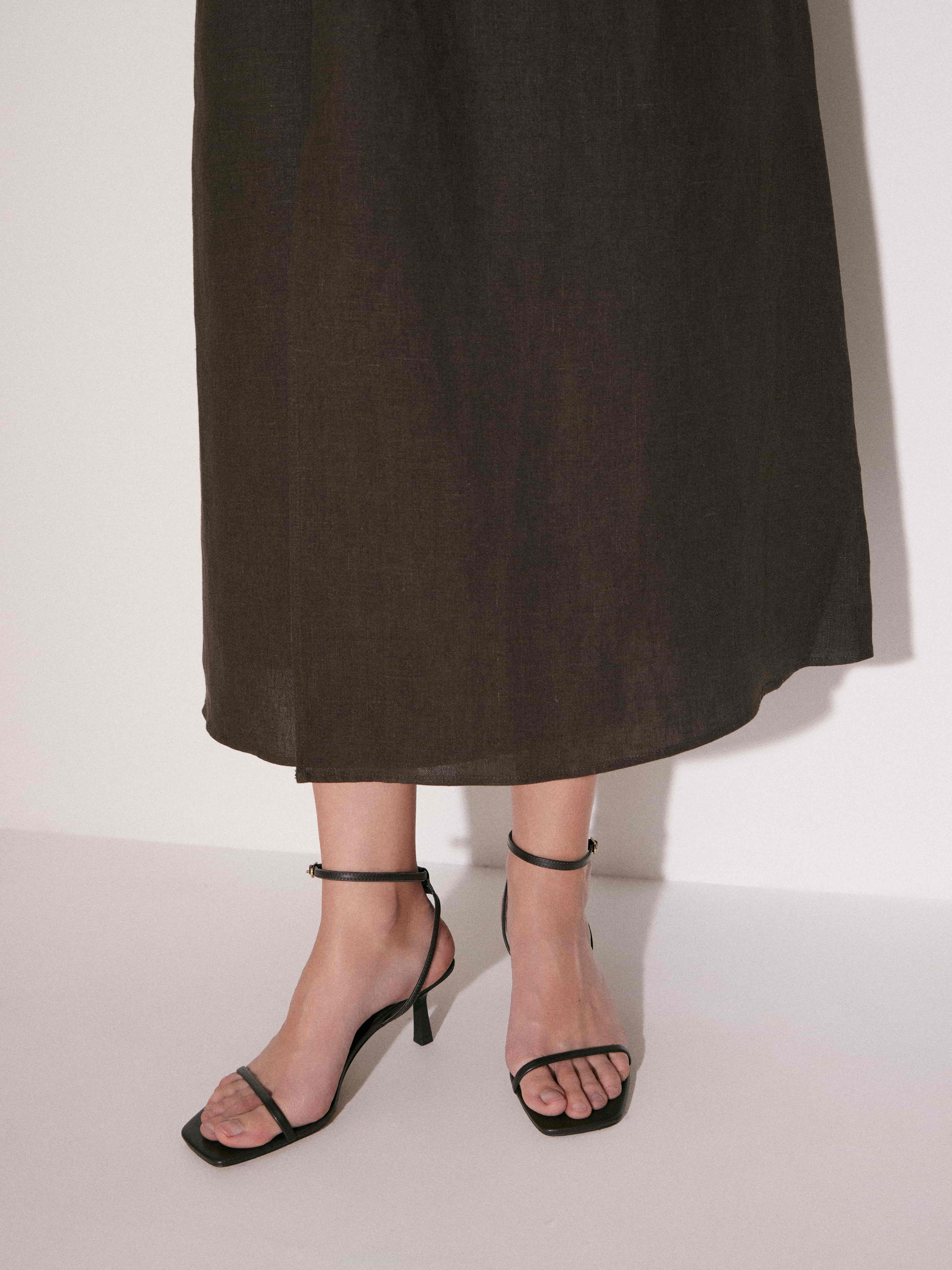 Босоножки выполнены из натуральной кожи с тонкими минималистичными ремешками, которые аккуратно фиксируют стопу и подчеркивают изящную линию подъема. Верх дополнен элементом из шелка, который придает модели более деликатную фактуру и мягкость. Квадратная форма носка делает силуэт современным и графичным, а тонкий ремешок вокруг щиколотки обеспечивает надежную посадку. Небольшой устойчивый каблук добавляет высоту, сохраняя комфорт при ходьбе. Внутренняя часть также выполнена из натуральной кожи, а резиновая подошва делает модель более практичной для повседневного ношения. Черный цвет подчеркивает лаконичный характер босоножек и позволяет легко сочетать их с разными образами.
