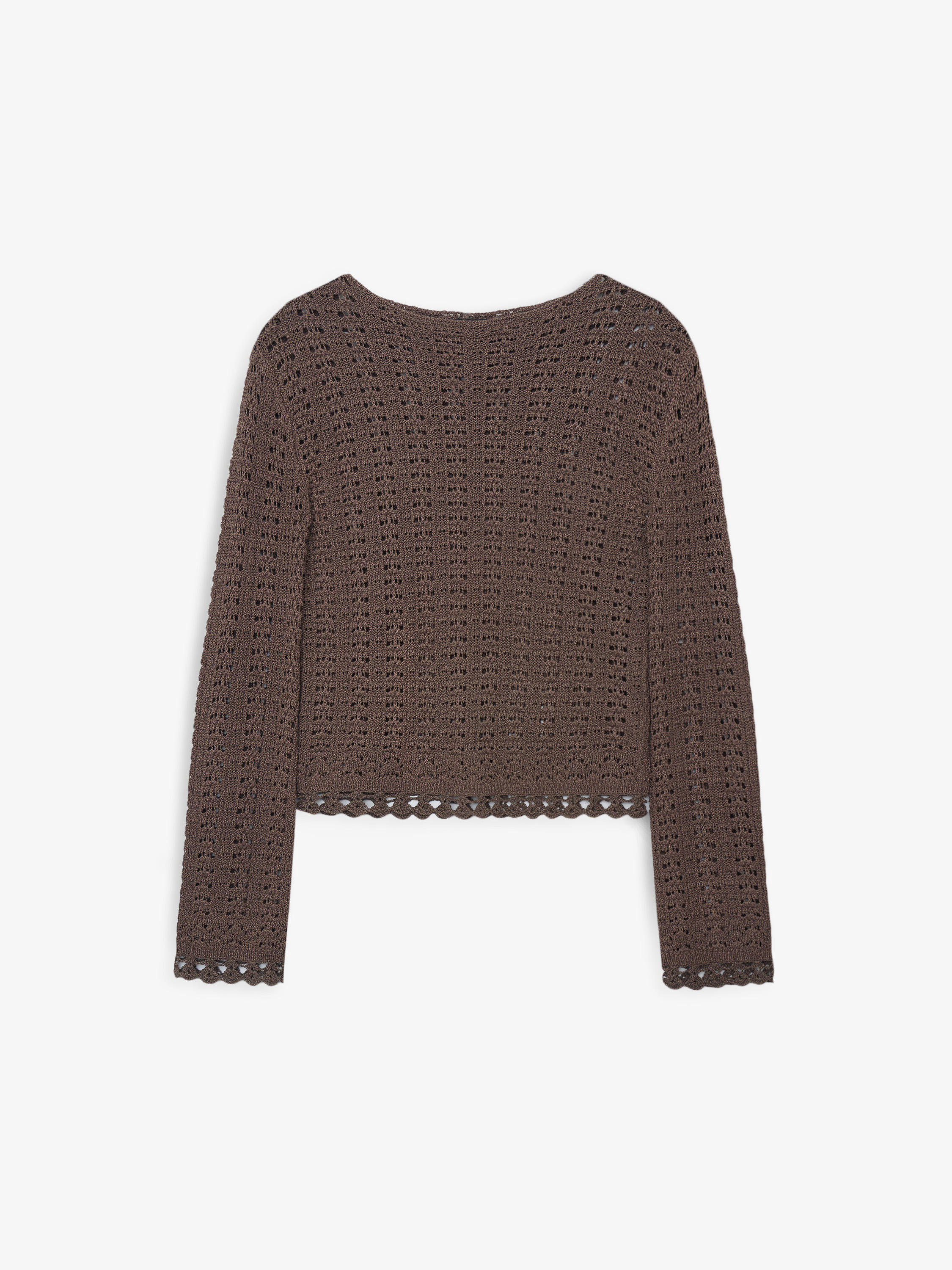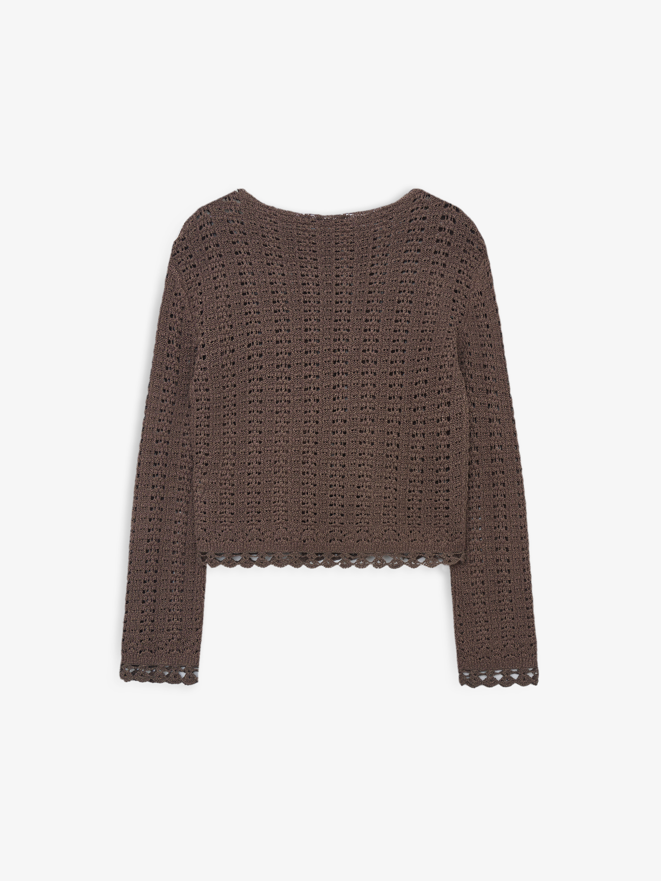 Трикотажный джемпер с длинным рукавом, выполненный в прилегающем силуэте с мягкой посадкой. Конструкция лаконичная: округлый вырез, аккуратная линия плеча, стандартная длина. Фактура вязки ажурная, с равномерным вертикальным ритмом, за счет которого поверхность выглядит легкой и структурной. Низ оформлен деликатным ажурным краем, который добавляет графичный акцент без перегрузки. Материал на основе хлопка с добавлением вискозы и целлюлозных волокон, с мягкой, дышащей и пластичной текстурой. Оттенок — молочный.