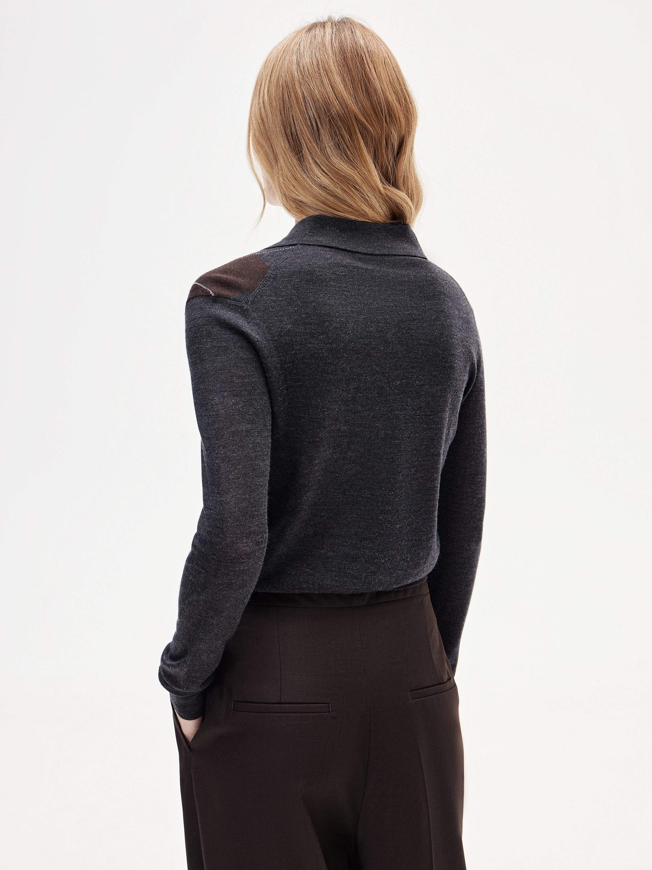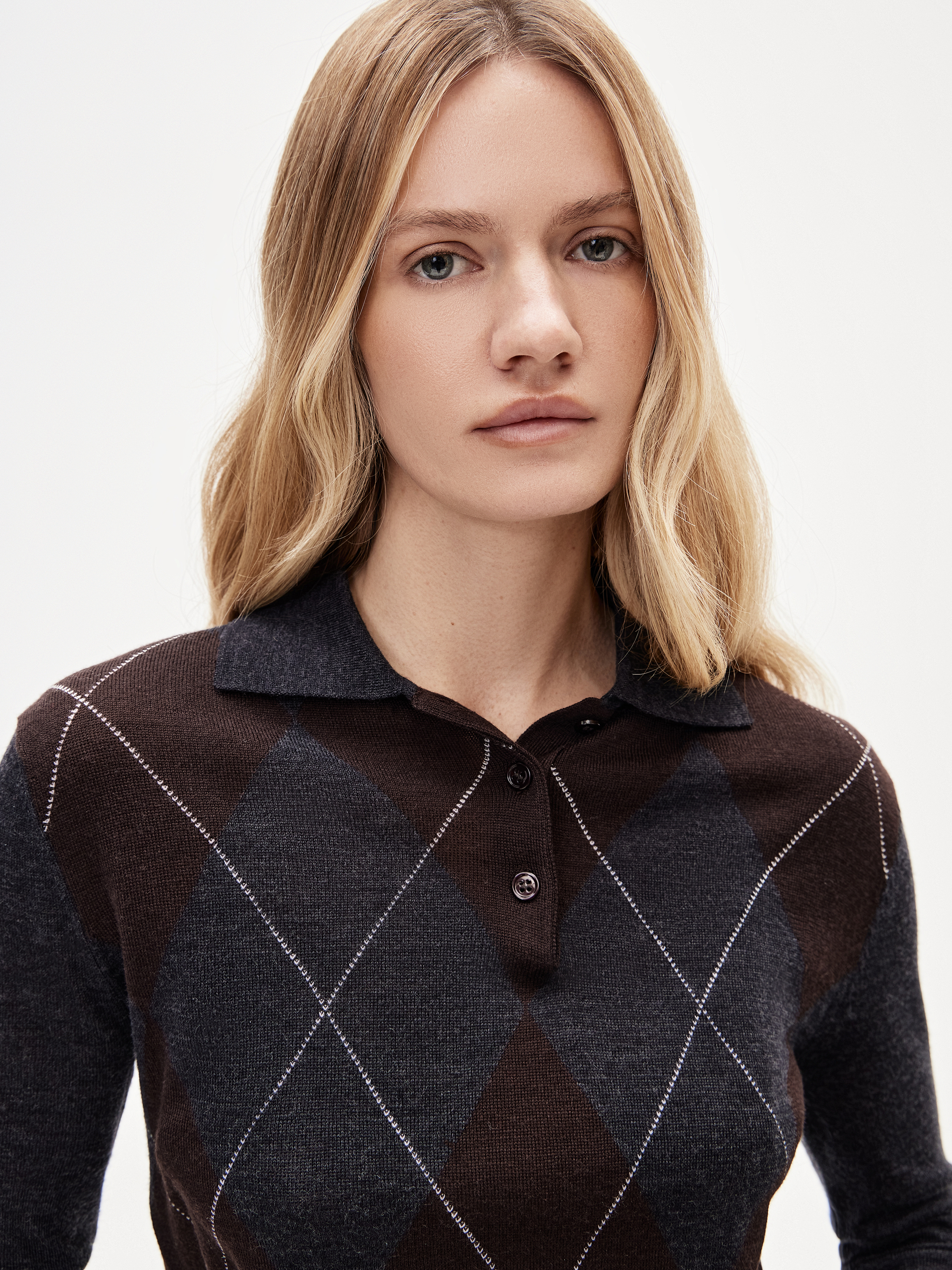 Джемпер выполнен из смеси шерсти и шелка. Трикотаж мягкий, пластичный, с деликатным матовым блеском за счет шелка в составе, комфортен к телу и подходит для многослойных сочетаний. Модель с воротником-поло и короткой планкой на пуговицах имеет фасон по фигуре, без лишнего объема. Основной акцент — контрастный ромбовидный узор в оттенках теплого карамельного и глубокого графитового, дополненный тонкими светлыми линиями. Такое сочетание придает образу структуру и делает вещь выразительной, сохраняя универсальность в сочетаниях с темными брюками, юбками или базовым трикотажем.