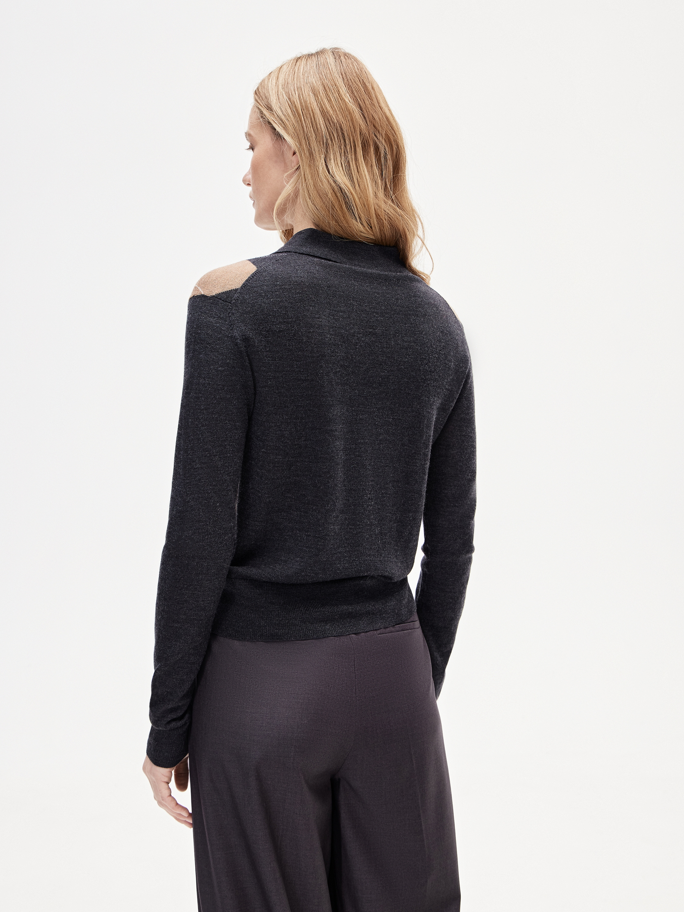 Джемпер выполнен из смеси шерсти и шелка. Трикотаж мягкий, пластичный, с деликатным матовым блеском за счет шелка в составе, комфортен к телу и подходит для многослойных сочетаний. Модель с воротником-поло и короткой планкой на пуговицах имеет фасон по фигуре, без лишнего объема. Основной акцент — контрастный ромбовидный узор в оттенках теплого карамельного и глубокого графитового, дополненный тонкими светлыми линиями. Такое сочетание придает образу структуру и делает вещь выразительной, сохраняя универсальность в сочетаниях с темными брюками, юбками или базовым трикотажем.