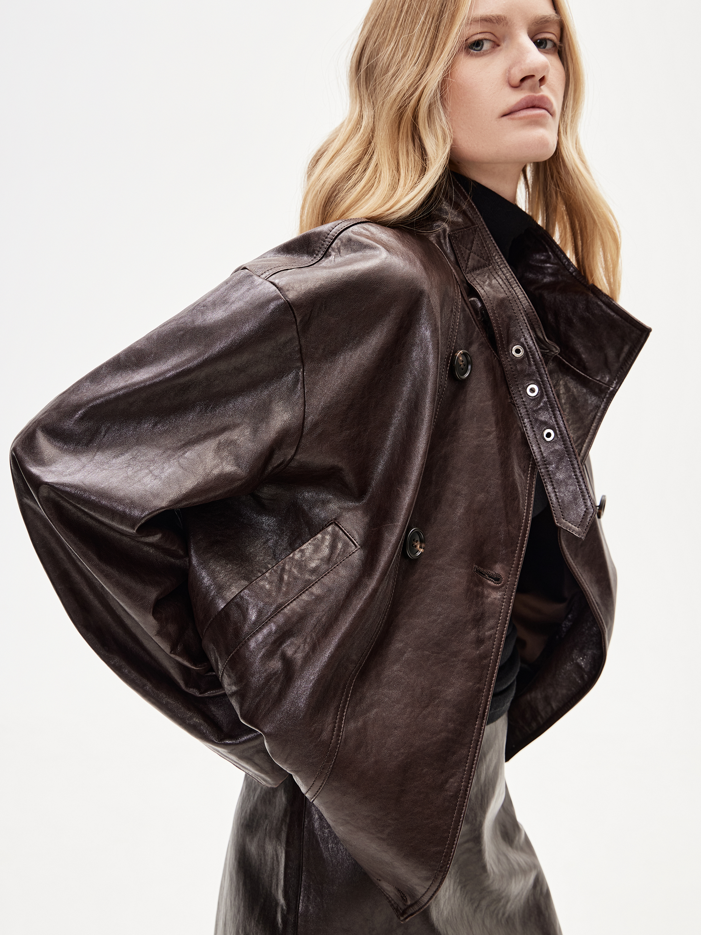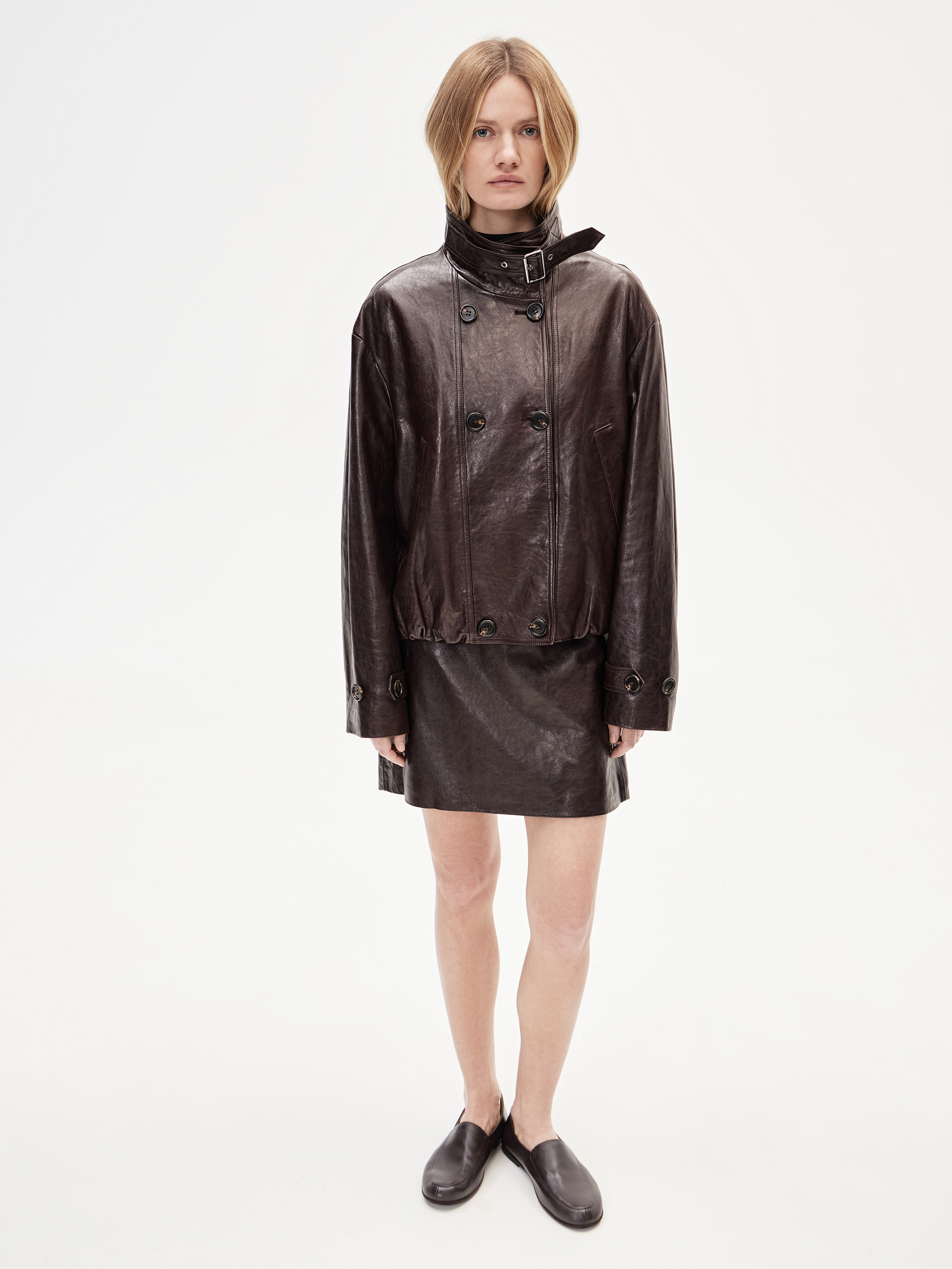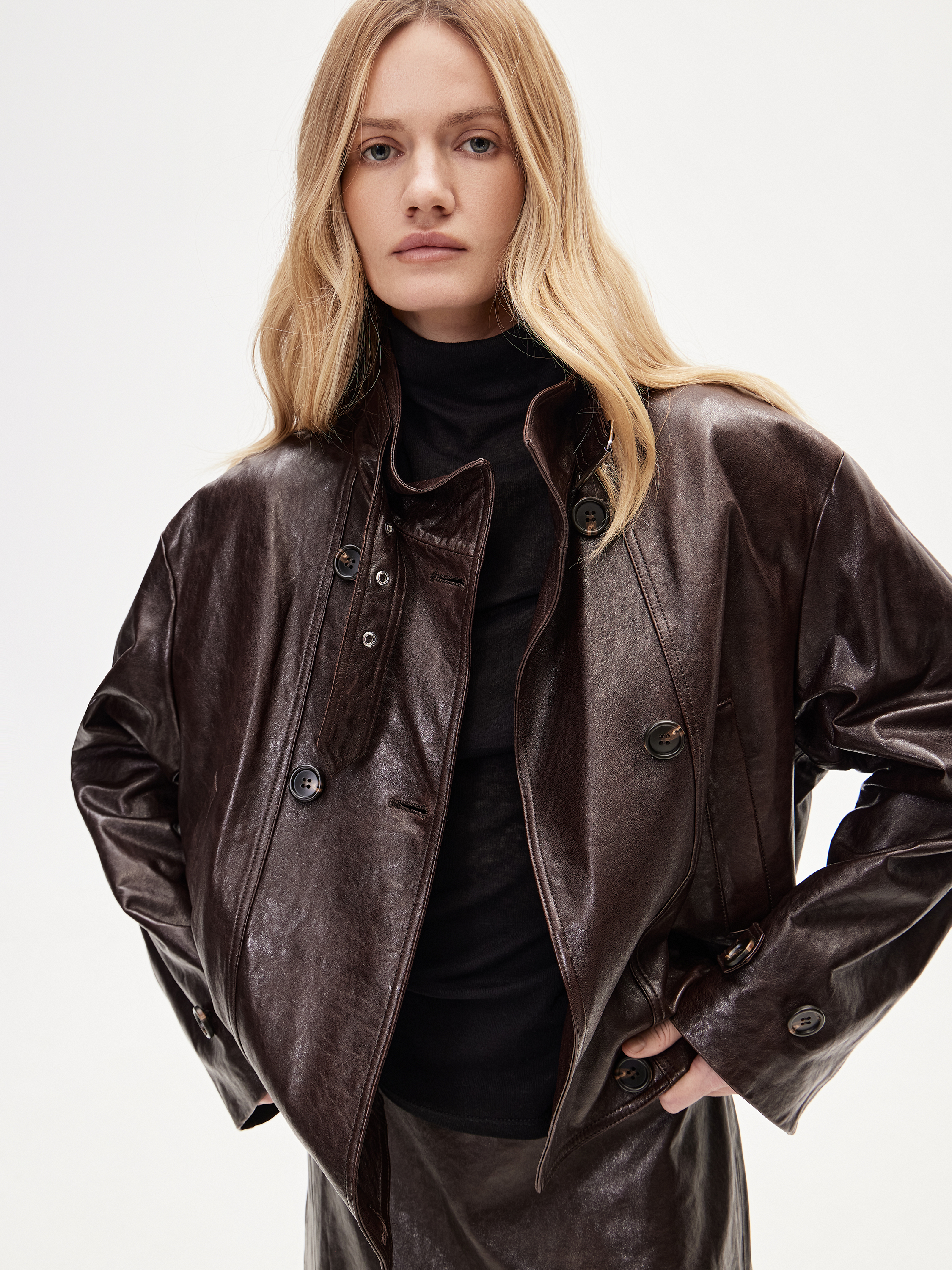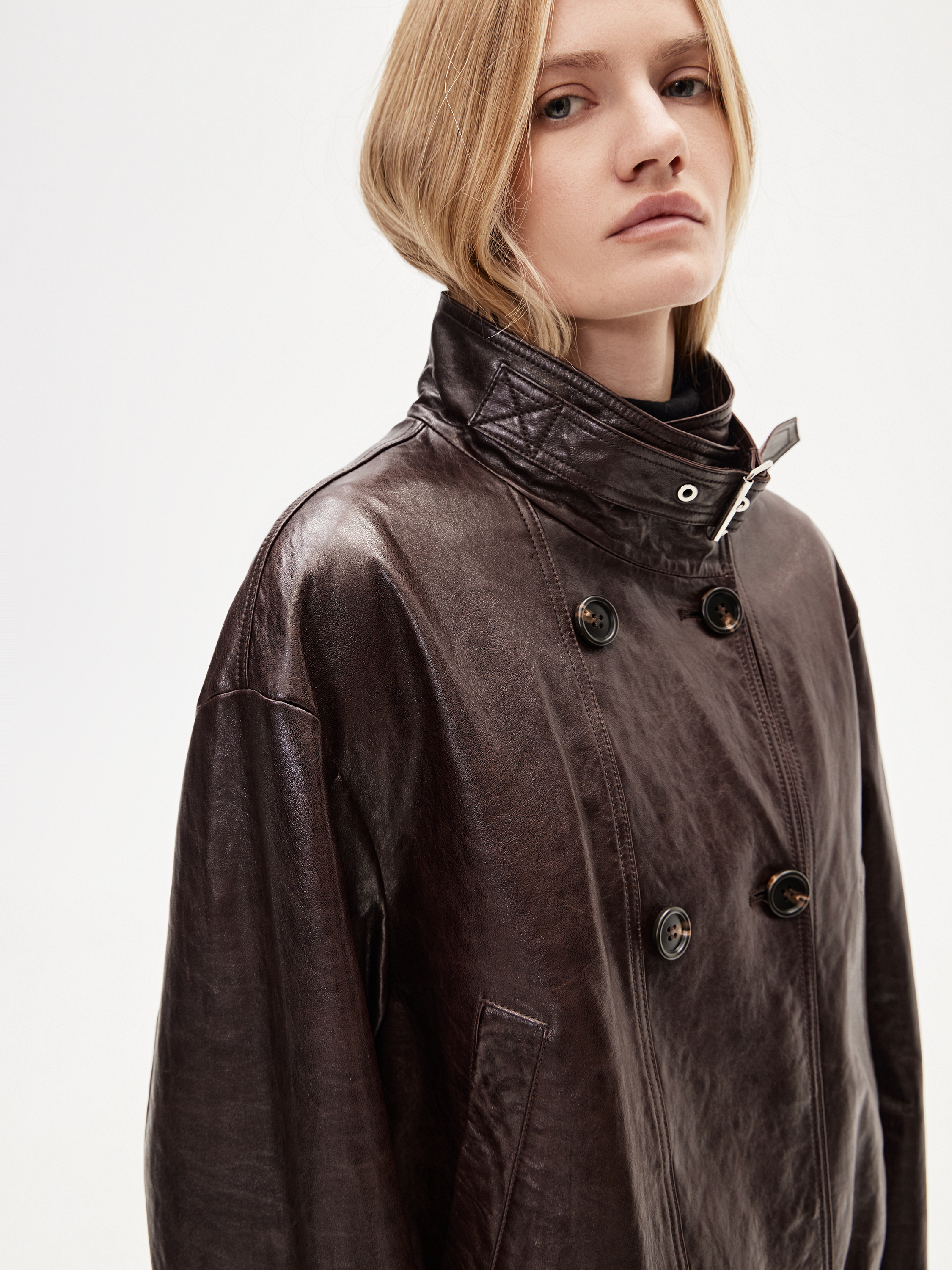 Куртка свободного кроя с мягкой линией плеча и объемным силуэтом формирует выразительный, но сдержанный образ. Натуральная кожа отличается плотностью и пластичностью, хорошо держит форму и со временем становится мягче, сохраняя аккуратный внешний вид. Поверхность имеет легкий естественный блеск и глубокую фактуру, благодаря чему модель выглядит благородно и основательно. Темно-коричневый оттенок универсален и легко сочетается с базовой палитрой. Модель выполнена с высоким воротником на ремешке, двубортной застежкой на пуговицы и карманами. Носите с юбкой или брюками из кожи, а также с лаконичным трикотажем и денимом.