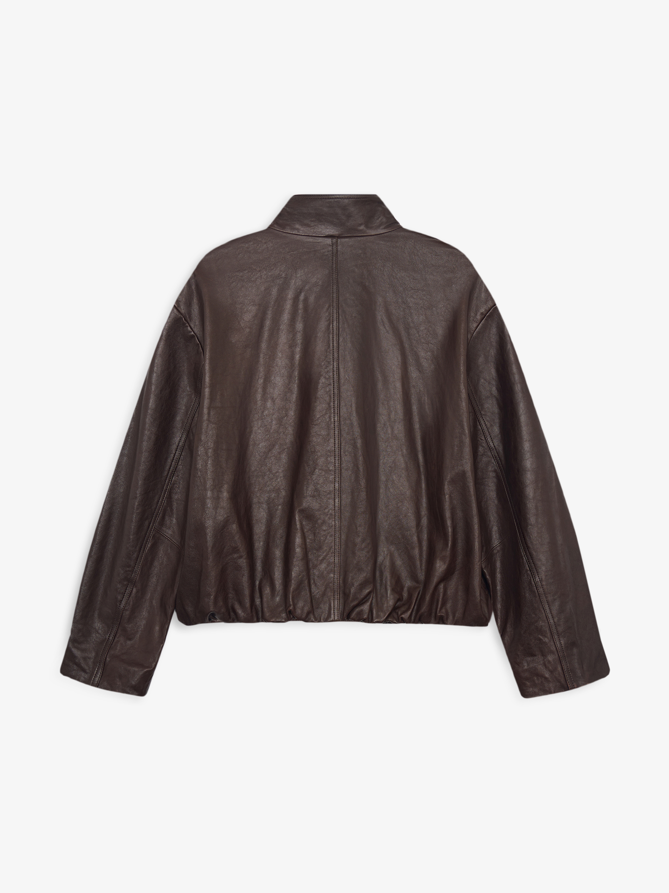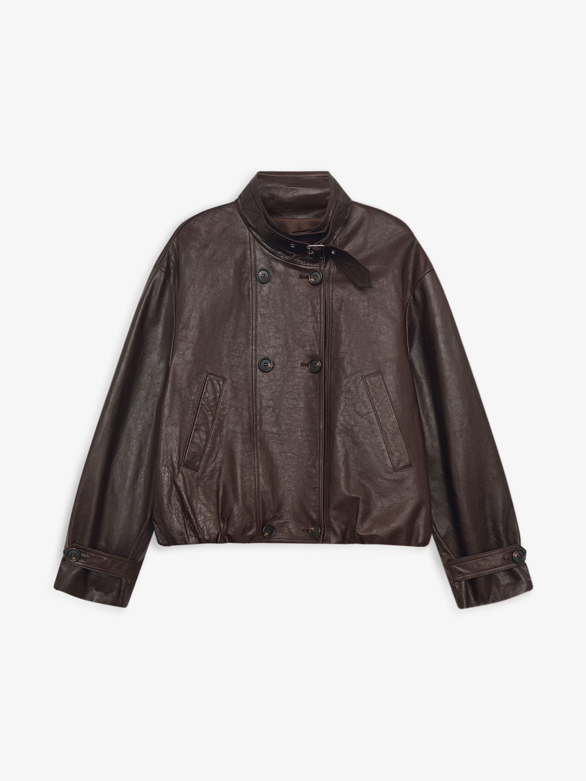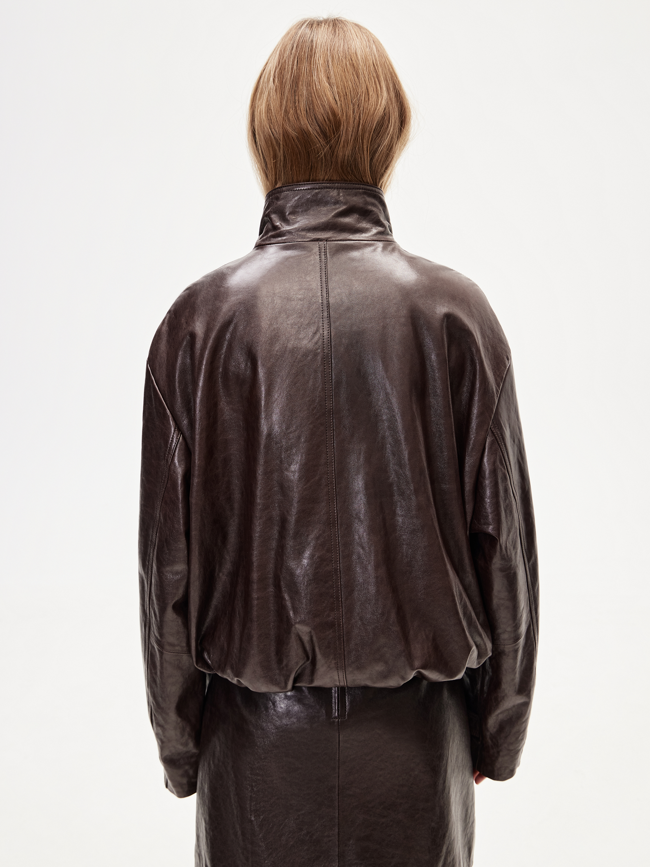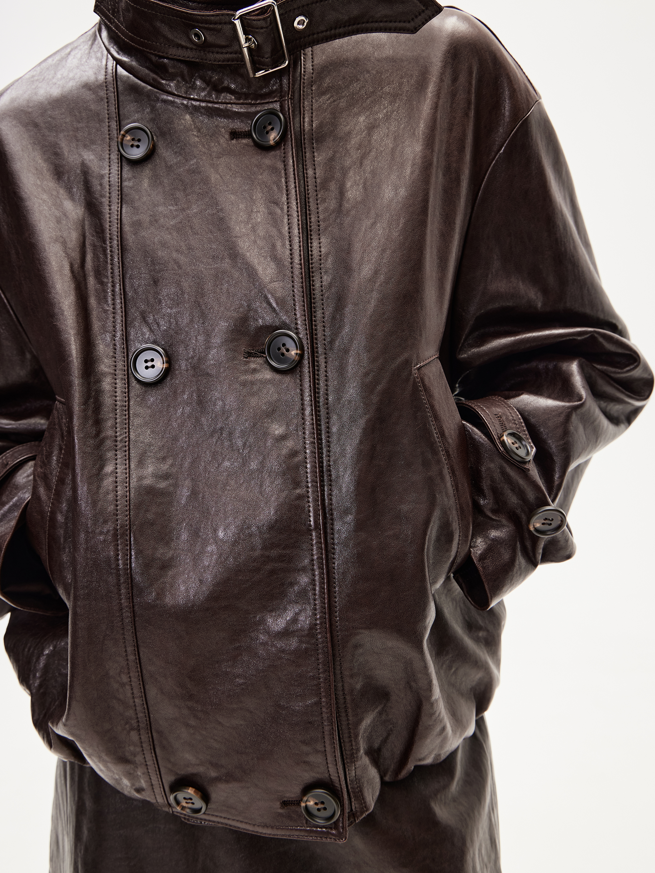 Куртка свободного кроя с мягкой линией плеча и объемным силуэтом формирует выразительный, но сдержанный образ. Натуральная кожа отличается плотностью и пластичностью, хорошо держит форму и со временем становится мягче, сохраняя аккуратный внешний вид. Поверхность имеет легкий естественный блеск и глубокую фактуру, благодаря чему модель выглядит благородно и основательно. Темно-коричневый оттенок универсален и легко сочетается с базовой палитрой. Модель выполнена с высоким воротником на ремешке, двубортной застежкой на пуговицы и карманами. Носите с юбкой или брюками из кожи, а также с лаконичным трикотажем и денимом.