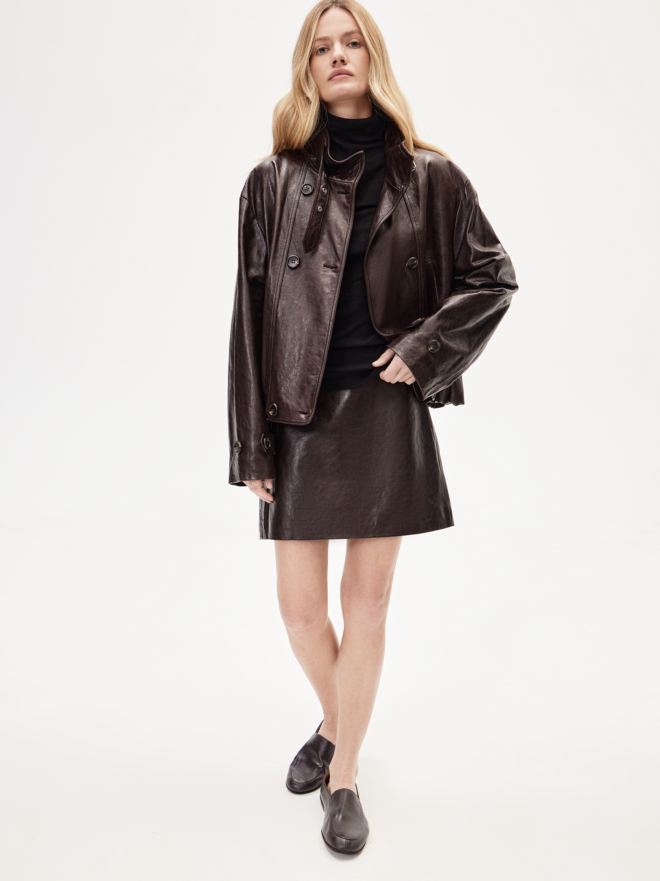 Юбка мини прямого кроя с высокой посадкой формирует четкий, лаконичный силуэт и аккуратно подчеркивает линию талии. Плотная натуральная кожа отличается гладкой поверхностью и выразительной фактурой, хорошо держит форму и со временем приобретает более мягкий характер, сохраняя аккуратный внешний вид. Материал выглядит благородно и добавляет образу глубину. Глубокий темно-коричневый оттенок универсален и легко сочетается с базовой палитрой. Модель выполнена с чистой линией пояса и аккуратной внутренней обработкой. Носите с тонким трикотажем, жакетом или объемным свитером для сбалансированного образа.