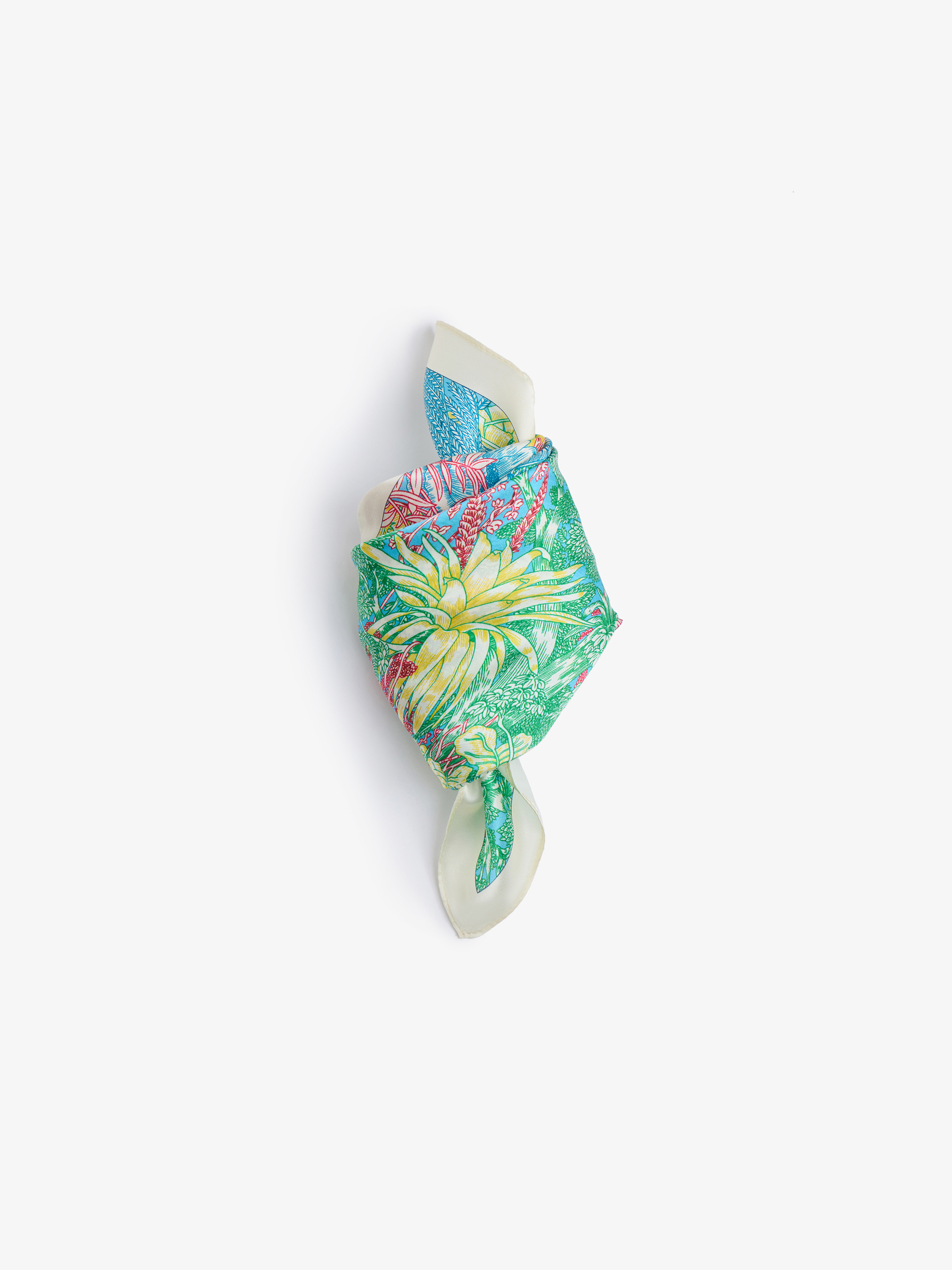 Платок выполнен из натурального шелка с гладкой, тонкой и пластичной фактурой. Материал мягко драпируется, держит форму и красиво реагирует на движение. Узор построен как сложная многослойная композиция с декоративными и пейзажными мотивами: растительные элементы, архитектурные фрагменты и орнаментальные детали переплетаются между собой, создавая насыщенный, детализированный рисунок. Шелковая поверхность подчеркивает нюансы рисунка и придает ему деликатный, благородный блеск. Платок можно носить на шее, на голове или использовать как акцентный аксессуар — на сумке, поясе или через плечо, меняя подачу в зависимости от образа.