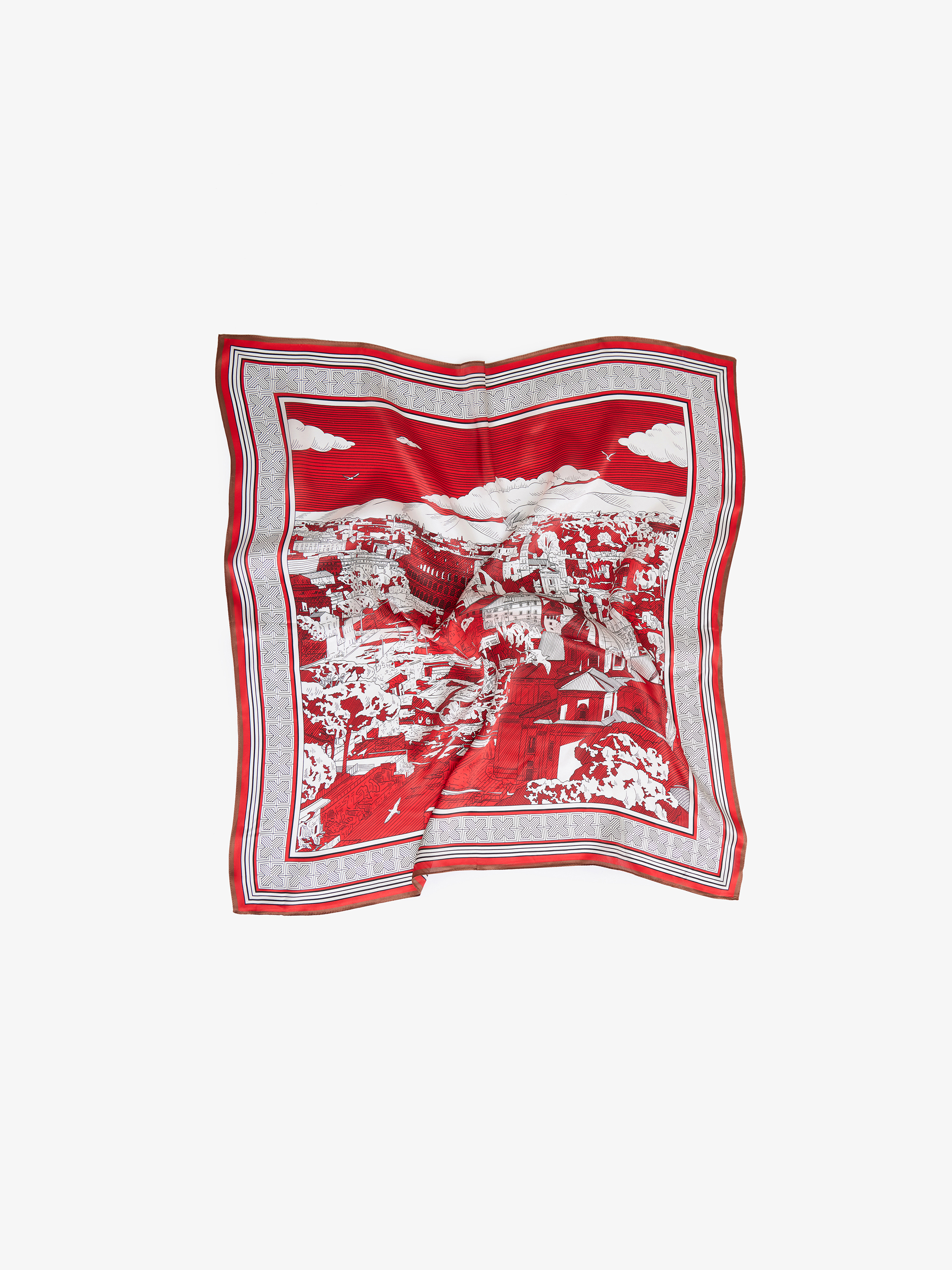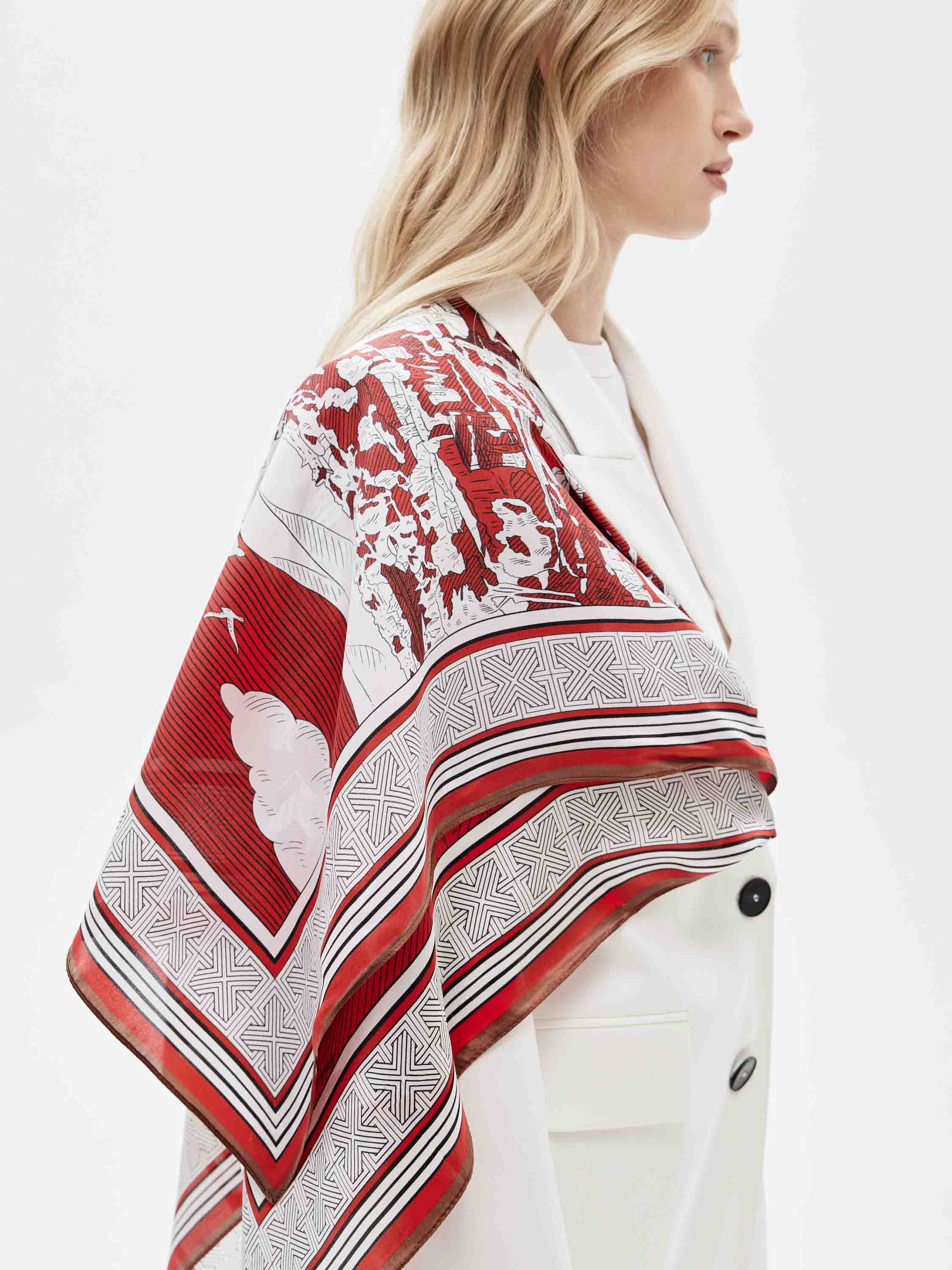 Платок из 100% шелка с выверенным декоративным узором, построенным на сочетании геометрических орнаментов и иллюстративных элементов. Гладкая шелковая поверхность подчеркивает четкость линий и позволяет рисунку выглядеть собранно и графично. Тонкий, пластичный материал легко драпируется, хорошо держит форму узла и комфортен в носке. Платок можно использовать как акцент на шее, накидывать на плечи или стилизовать на поясе, добавляя образу выразительную, но сдержанную деталь.