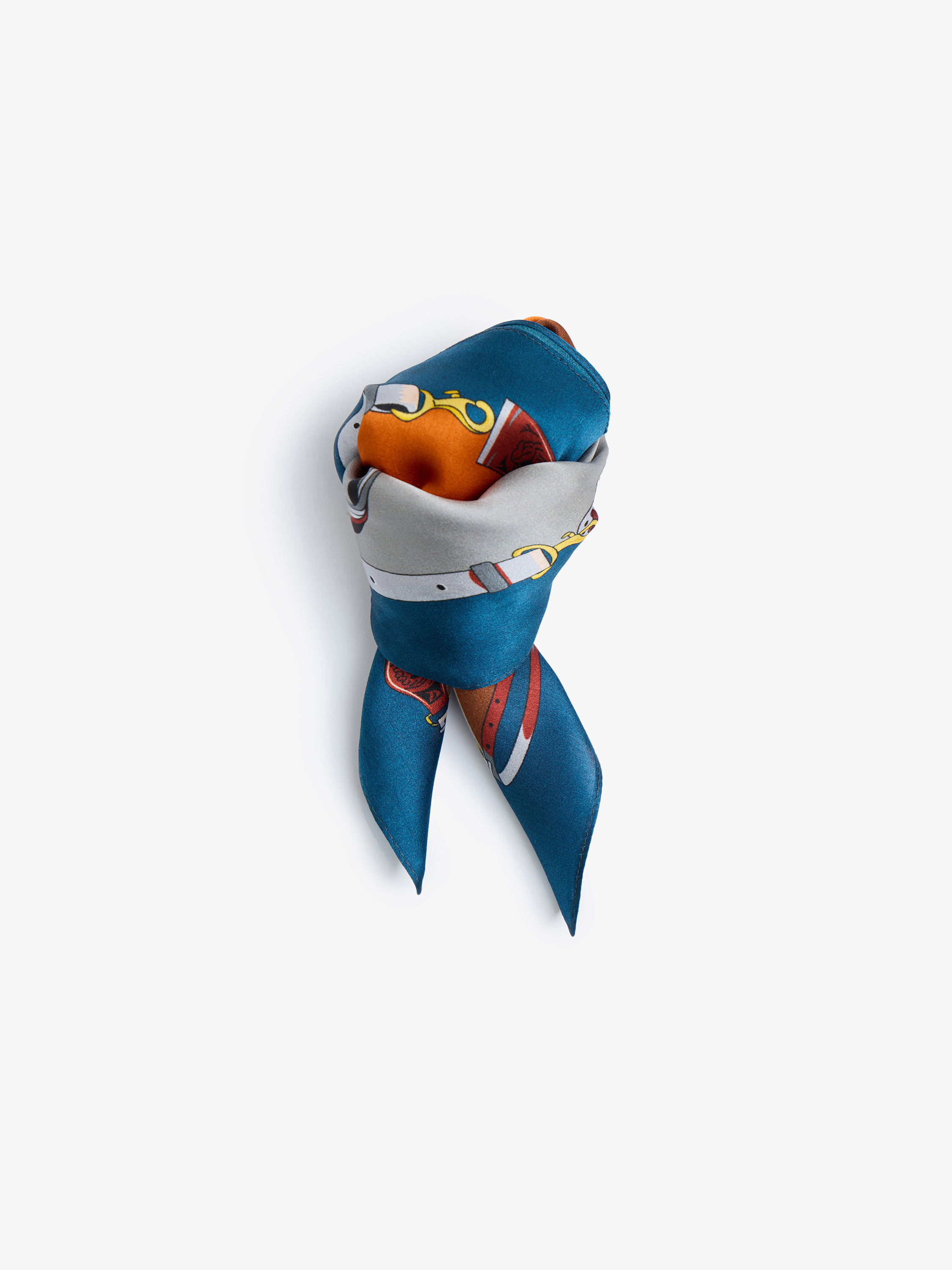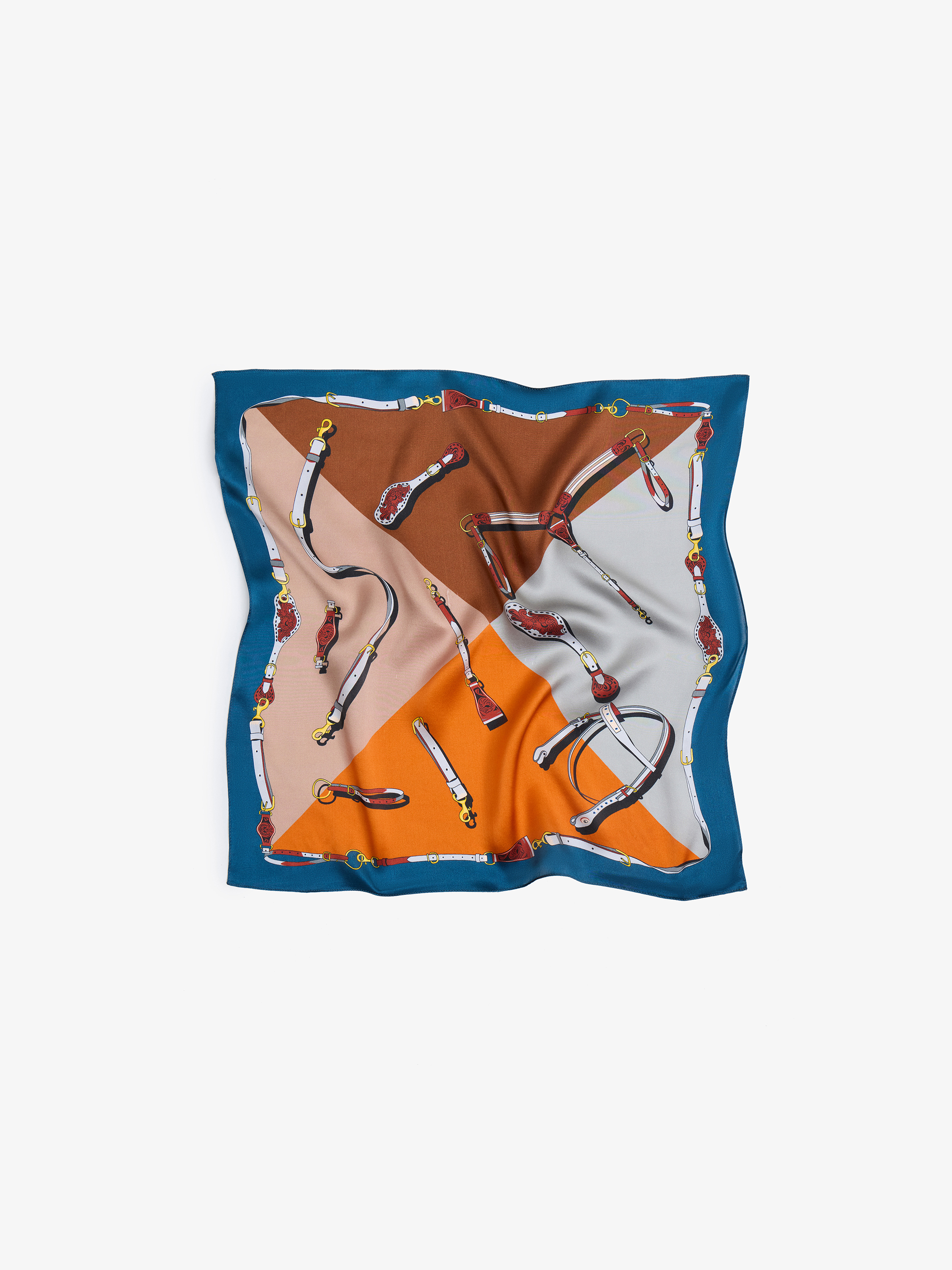 Шелковый платок с графичным декоративным рисунком, построенным на сочетании ременных мотивов и геометрических цветовых блоков. Узор организован в четкую композицию с диагональными плоскостями и контрастной рамкой по краю, что придает платку выразительную структуру и визуальную собранность. Палитра сбалансированная и насыщенная: теплые карамельные и терракотовые оттенки сочетаются с молочным, приглушенным серым и глубоким синим, дополненными небольшими акцентами красного и золотистого. Гладкий шелк подчеркивает четкость линий и деталей, создавая мягкий благородный блеск. Платок универсален в стилизации: его можно носить на шее, повязать на голову, использовать как акцент на поясе или закрепить на ручке сумки.