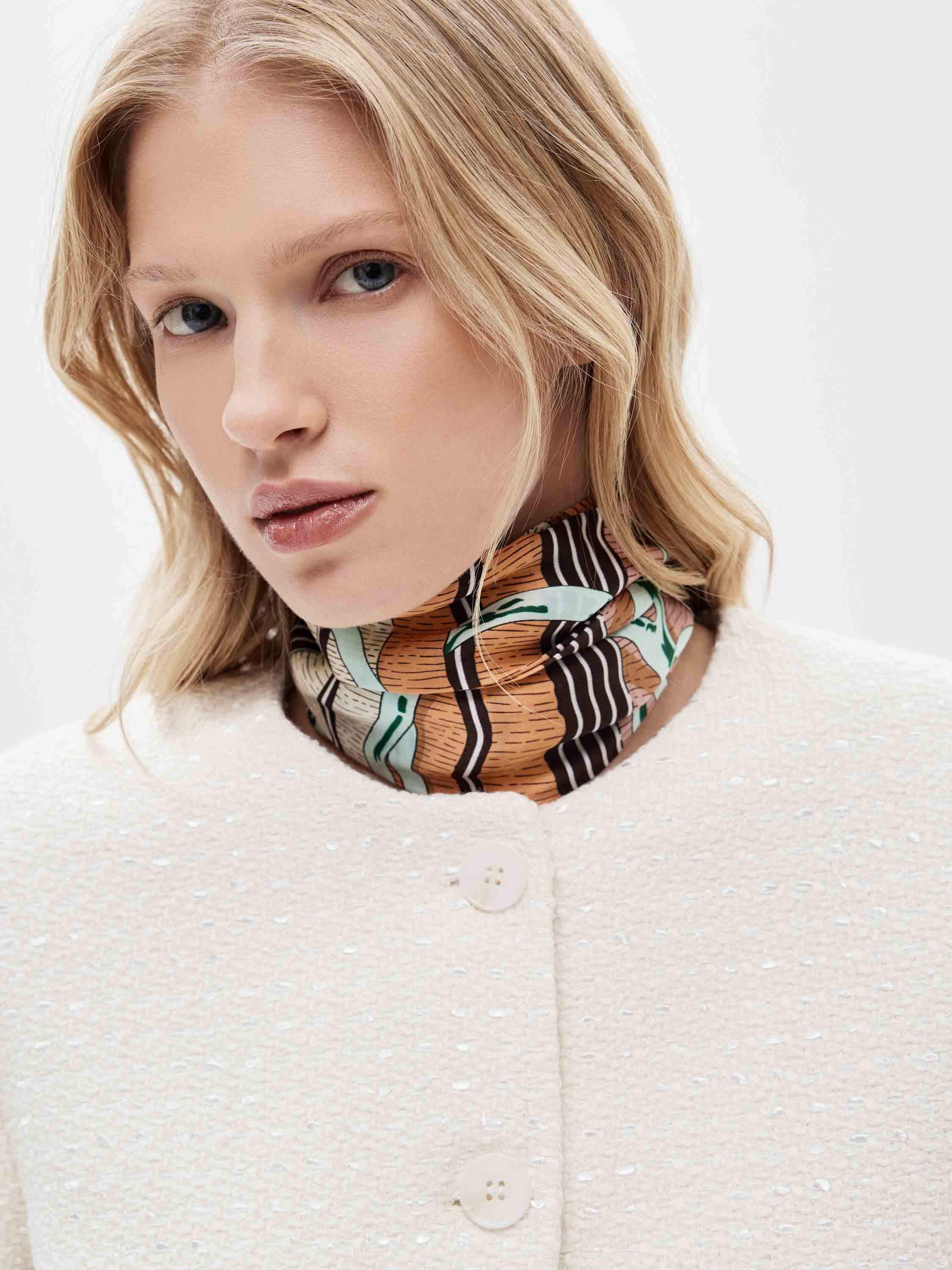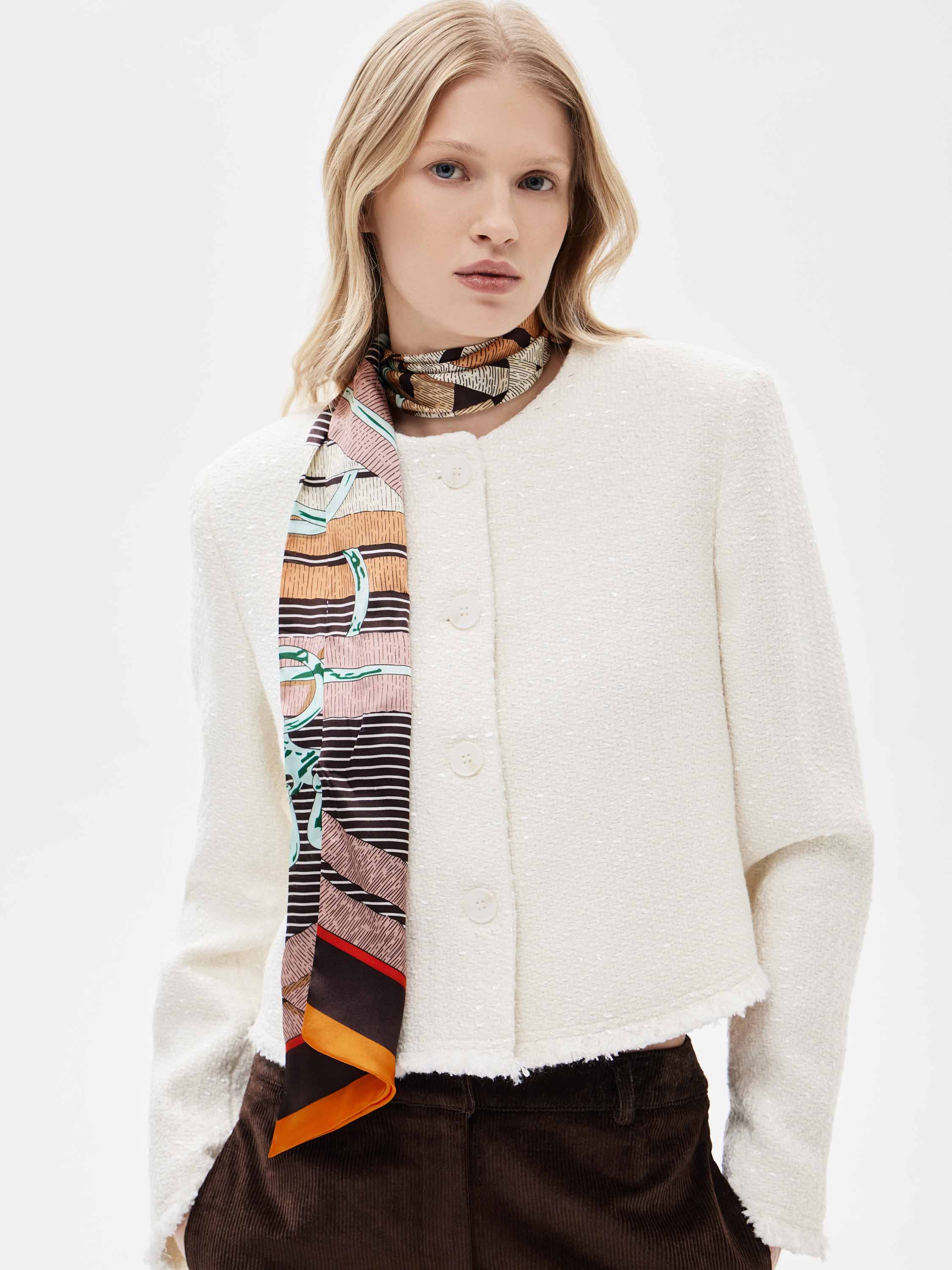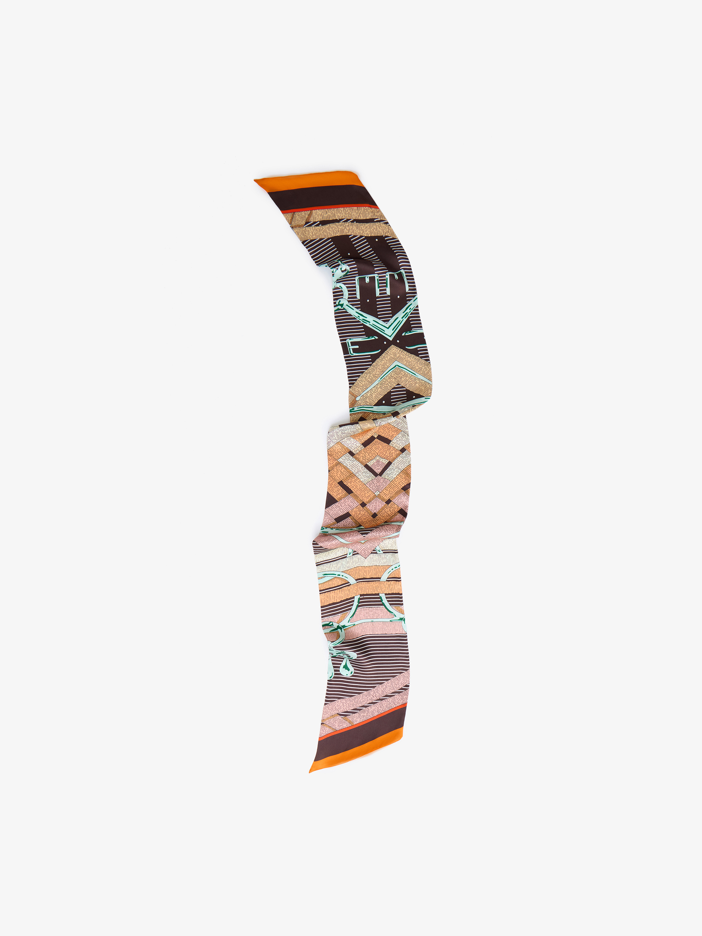 Шелковый платок с многоуровневым декоративным узором. Рисунок построен на сочетании геометрических полос, графичных линий и стилизованных иллюстративных элементов, выстроенных в четкую вертикальную композицию. В палитре сочетаются молочные, карамельные, коричневые, черные и акцентные оттенки с контрастной окантовкой по краю. Гладкая шелковая поверхность подчеркивает четкость узора и позволяет платку легко драпироваться. Модель подходит для ношения на шее, в виде узкого шарфа, а также как декоративный акцент в образе.