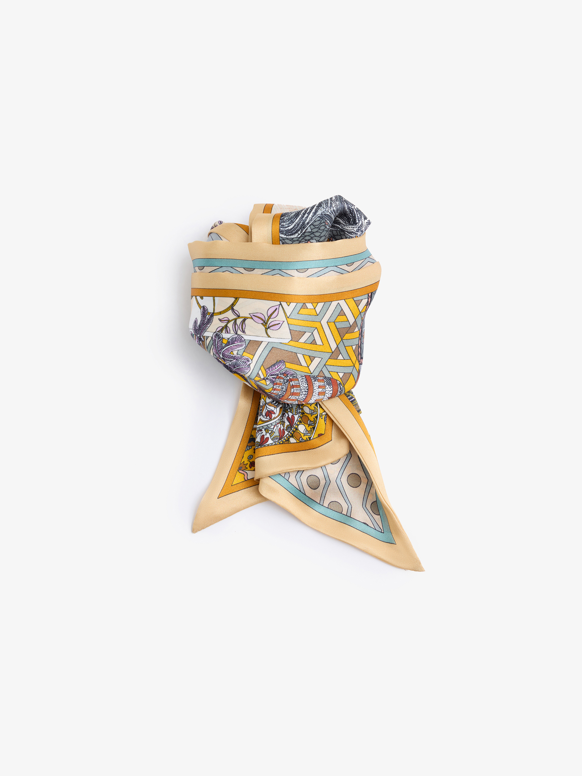 Шелковый платок-твилли с двусторонним дизайном, построенным на контрасте орнаментального ритма и сюжетного рисунка. Одна сторона оформлена мелким геометрическим узором с ровной графикой и аккуратной рамкой, вторая — более насыщенной композицией с декоративными мотивами, отсылающими к классическим платочным иллюстрациям. Палитра выстроена на сочетании теплых песочных и медовых тонов с молочным фоном, дополненных глубокими графичными акцентами. Двустороннее исполнение позволяет менять характер аксессуара в зависимости от стилизации и способа завязывания. Гладкий шелк хорошо держит форму и подчеркивает четкость линий. Твилли подходит для ношения на шее, на запястье, в качестве пояса или декоративного акцента на сумке.