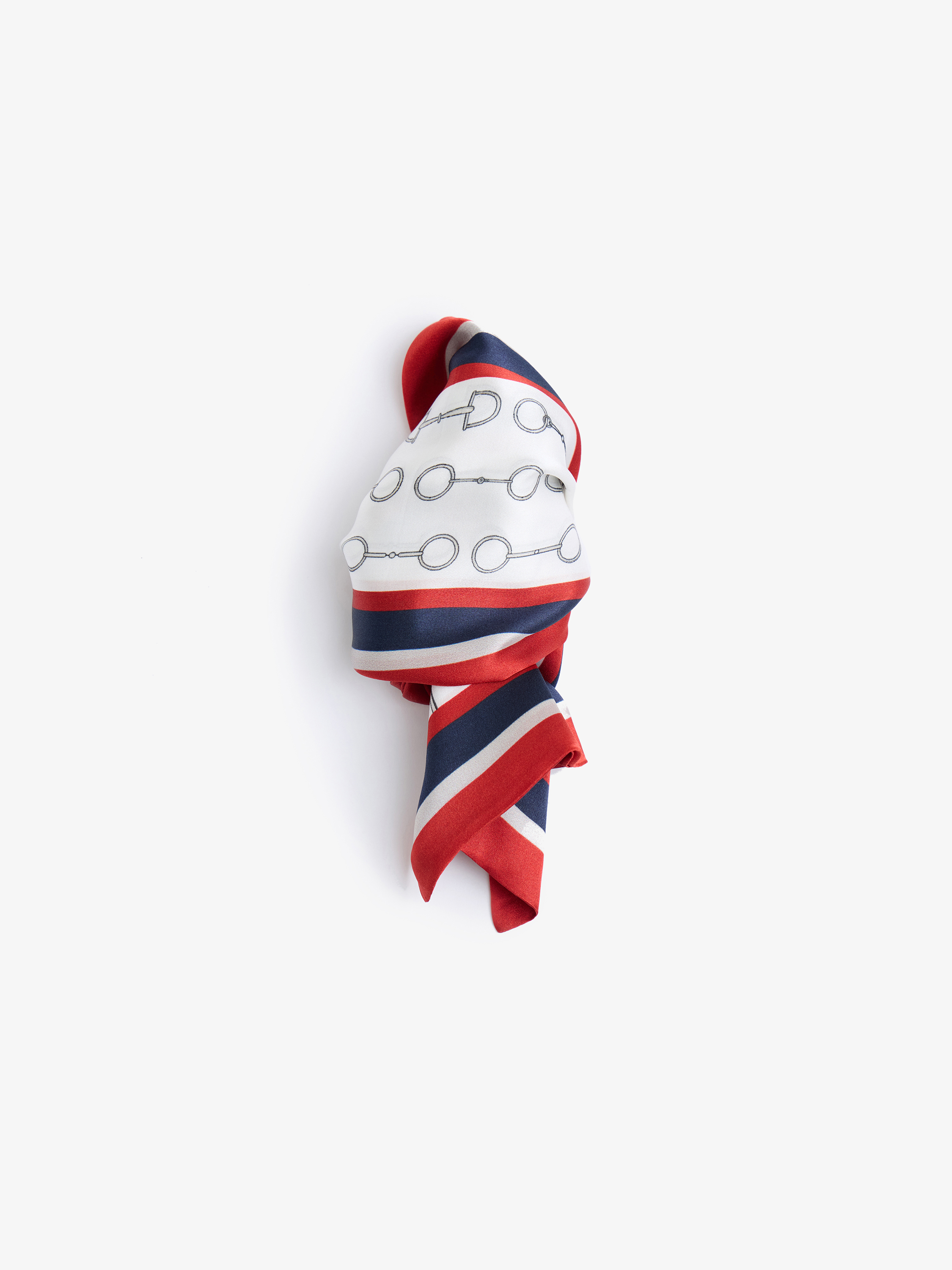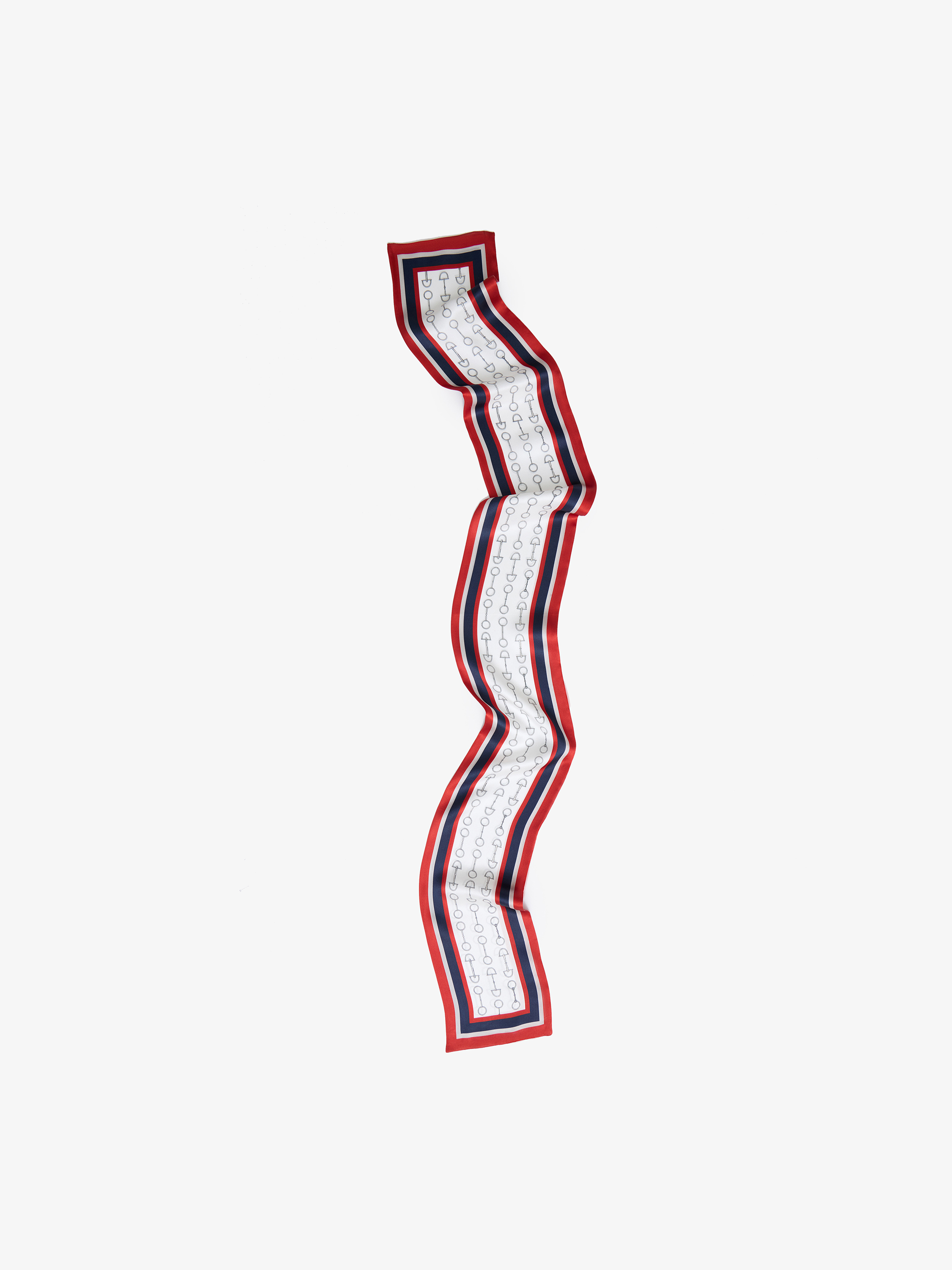 Платок твилли выполнен из гладкого шелка. Удлиненный формат позволяет создавать аккуратные узлы и четкие линии в стилизации. В основе — светлый фон с повторяющимся графичным мотивом в виде стилизованных элементов конской упряжи, выполненных в сдержанном сером тоне. Края оформлены контрастной рамкой: насыщенный красный кант дополнен полосами темно-синего и белого, что придает аксессуару четкость и динамику. Твилли можно повязать на шею узкой лентой, завязать бантом или минималистичным узлом, вплести в прическу, обернуть вокруг хвоста или пучка, использовать как декоративный элемент на ручке сумки либо продеть в шлевки брюк вместо ремня для акцентной детали в образе.