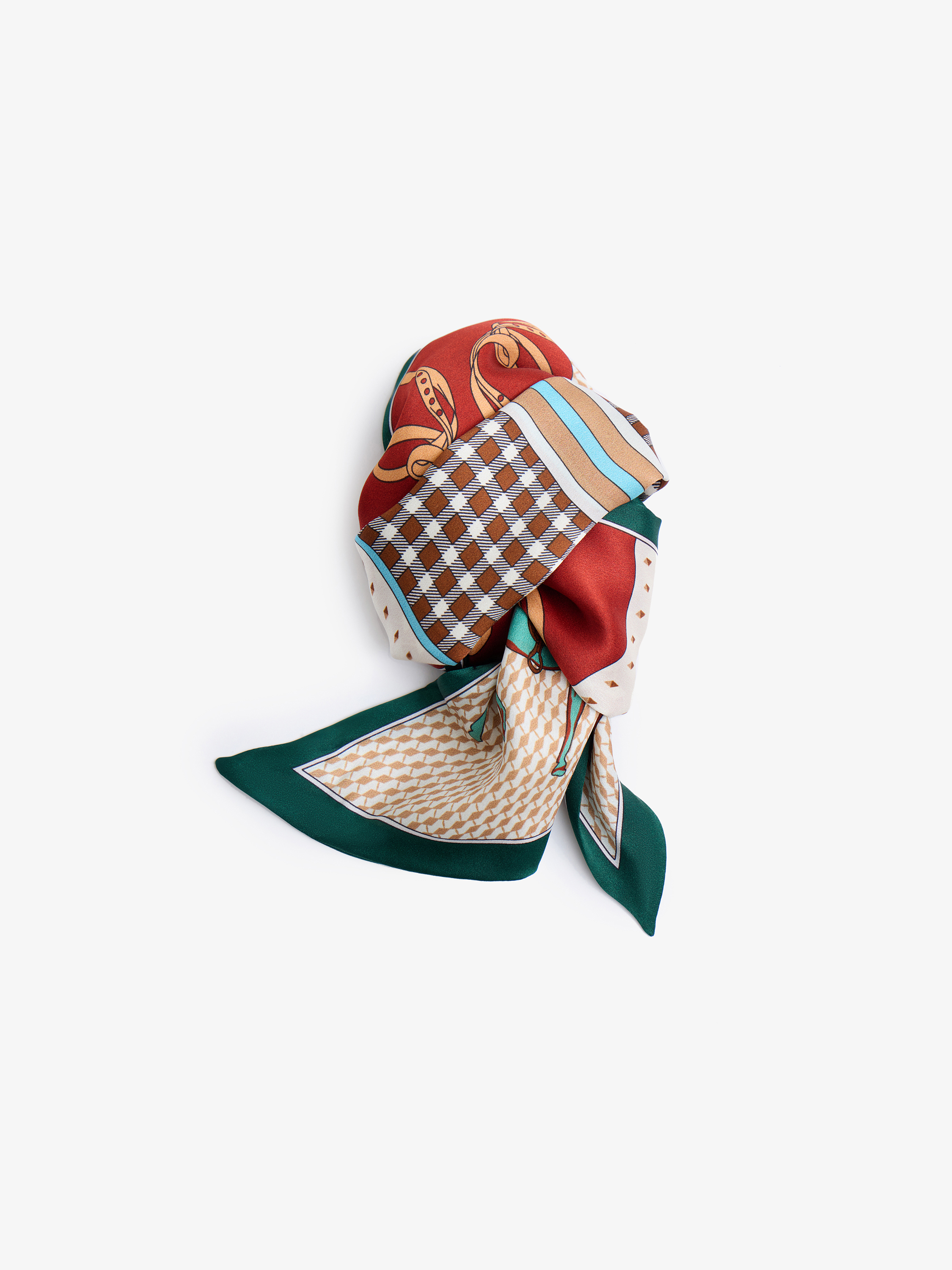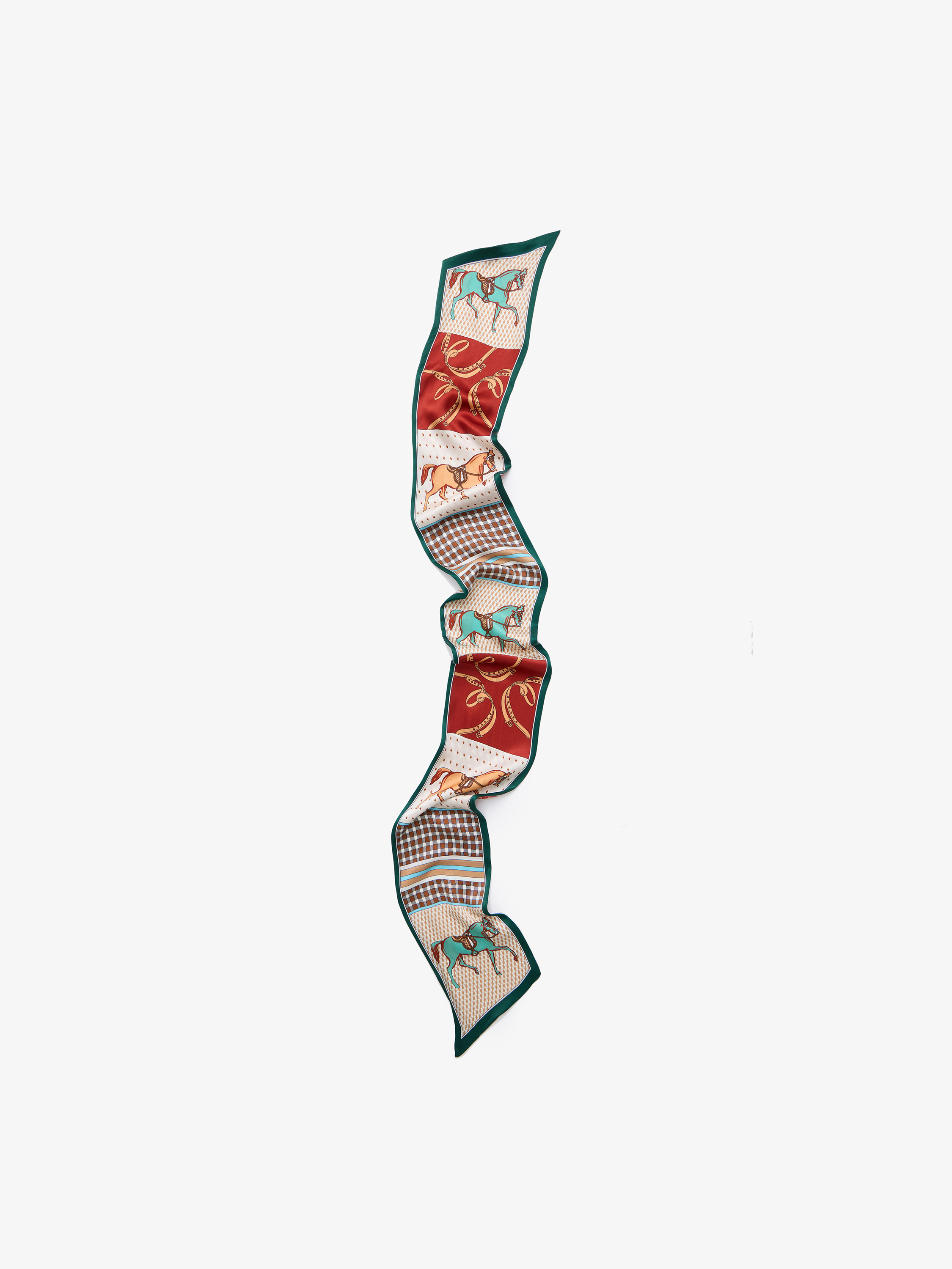Платок твилли выполнен из гладкого шелка с плотным, но пластичным переплетением. Материал мягко драпируется, сохраняет четкость формы узла и выглядит аккуратно даже при многослойной намотке. Композиция построена на чередовании тематических блоков: стилизованные лошади в движении, элементы конской упряжи, подковы и геометрические вставки. Рисунок разделен на сегменты, что создает ритм по всей длине аксессуара. Палитра теплая и выразительная: насыщенный красный, темный изумрудный кант по краю, молочный фон, оттенки карамельного и коричневого, акценты бирюзового в изображении лошадей. Твилли можно повязать на шею узким слоем, вплести в прическу, обернуть вокруг ручки сумки. За счет сегментированного рисунка он интересно смотрится и в один оборот, и в несколько витков.