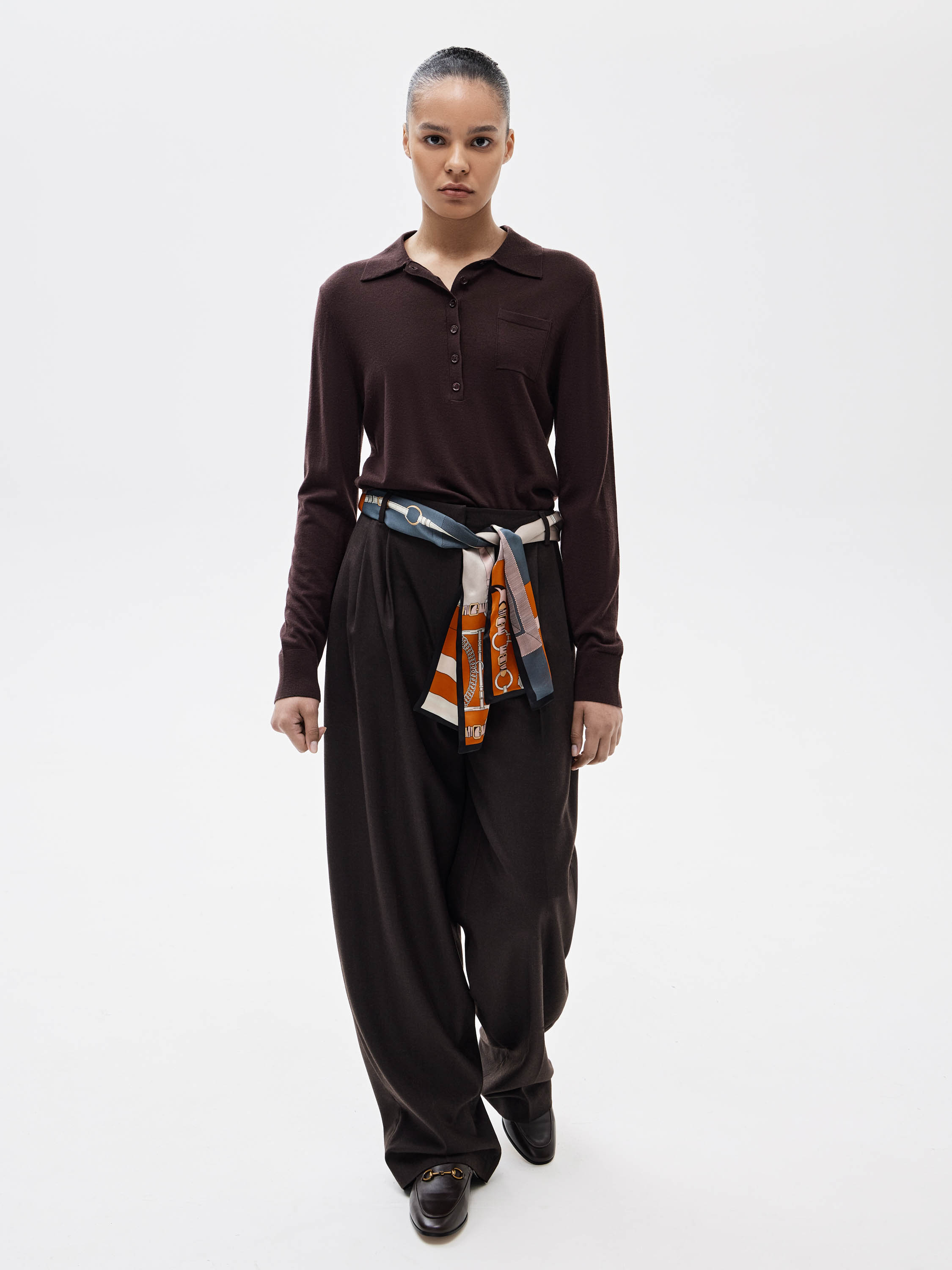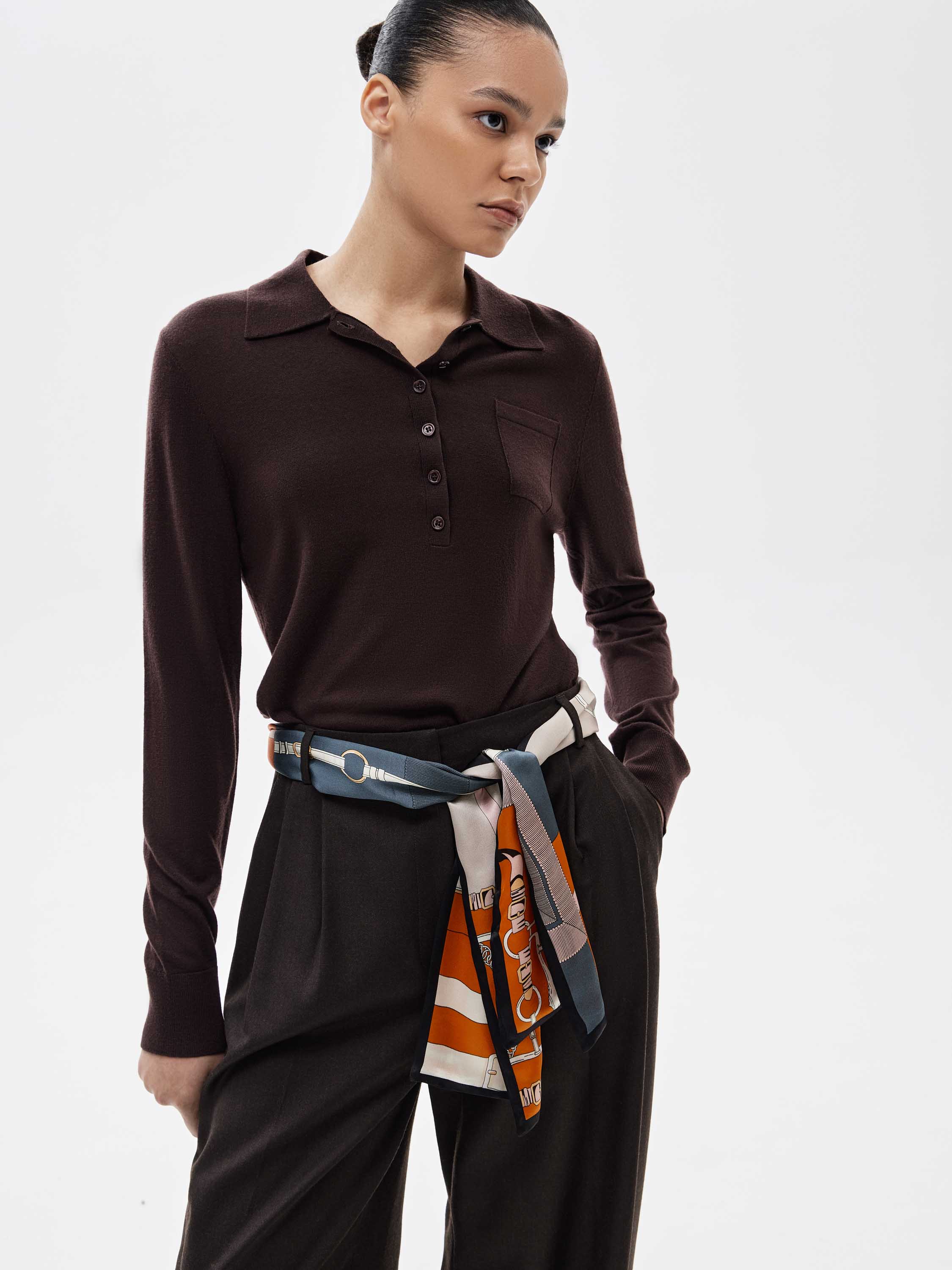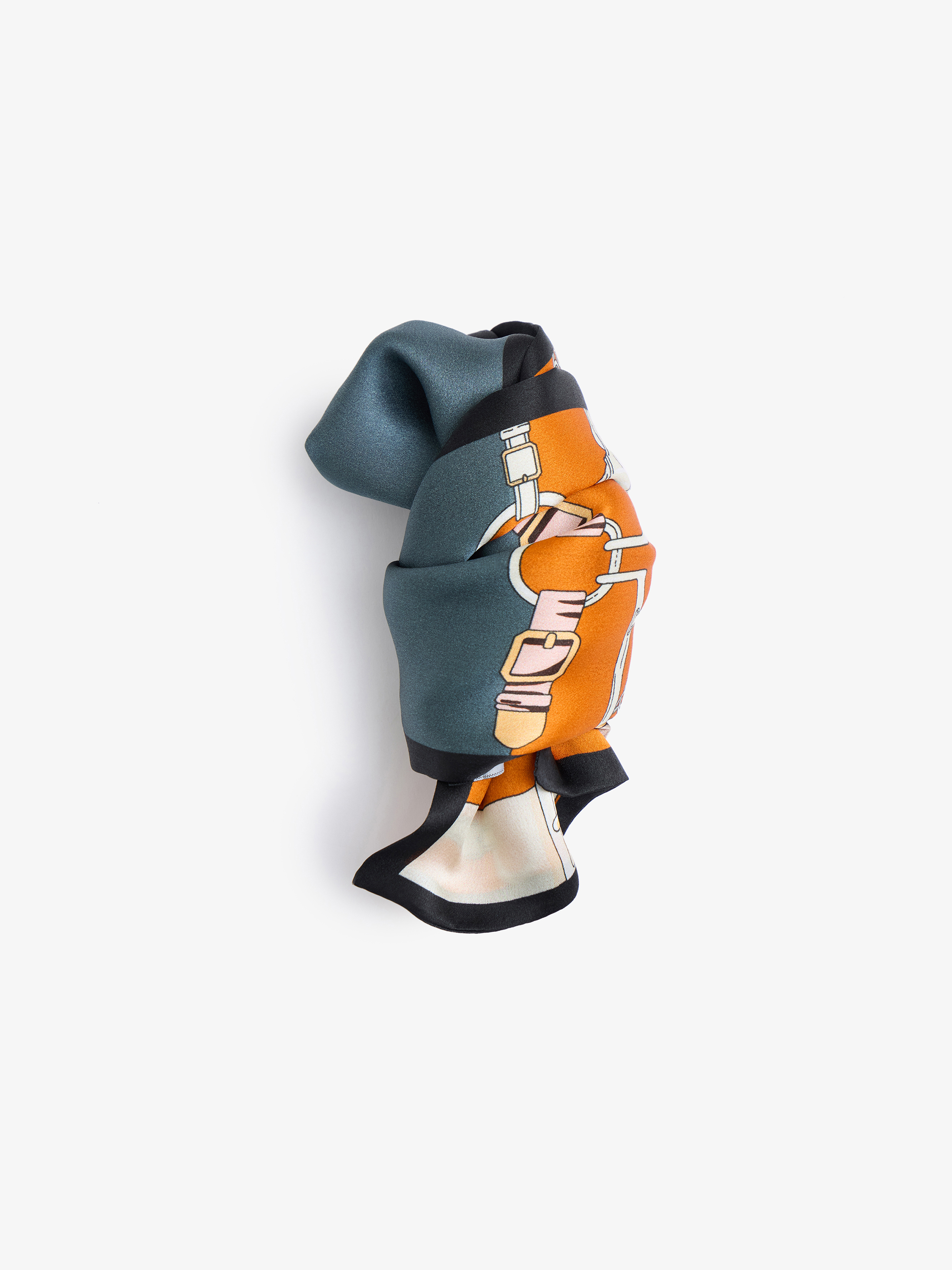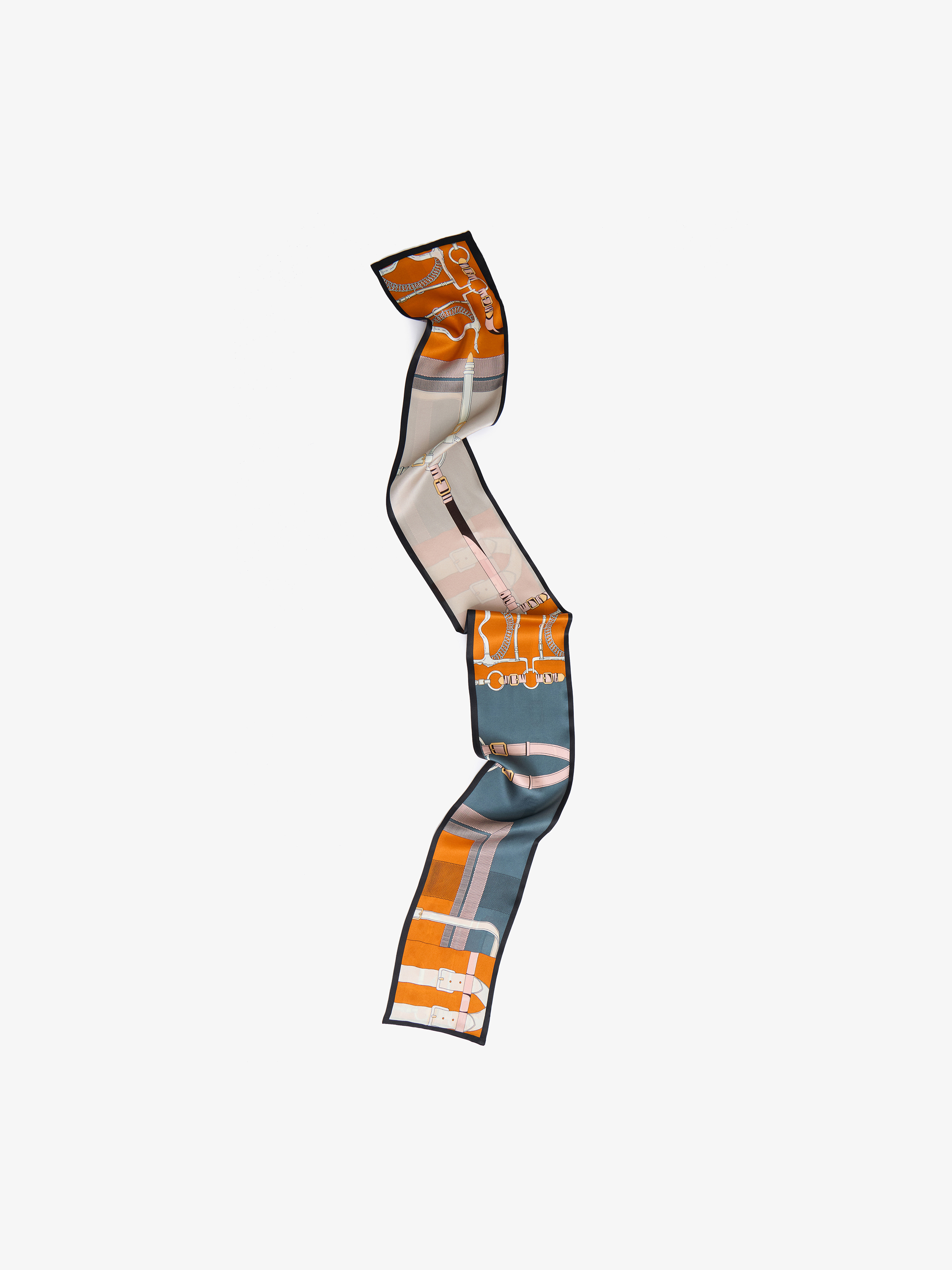 Платок из шелка с графичным узором в конной тематике. Композиция построена на сочетании стилизованных элементов упряжи, колец и ремней, выстроенных в четкий ритм и дополненных контрастной рамкой по краю. Рисунок хорошо читается за счет структурного деления и сбалансированного расположения мотивов. В палитре сочетаются молочный, терракотовый, приглушенно-синий, серый и темно-коричневый оттенки, создающие собранный и выразительный контраст. Гладкий шелк мягко ложится и сохраняет аккуратную форму узла. Платок можно носить на поясе, на шее или использовать как выразительную деталь в костюмных образах.