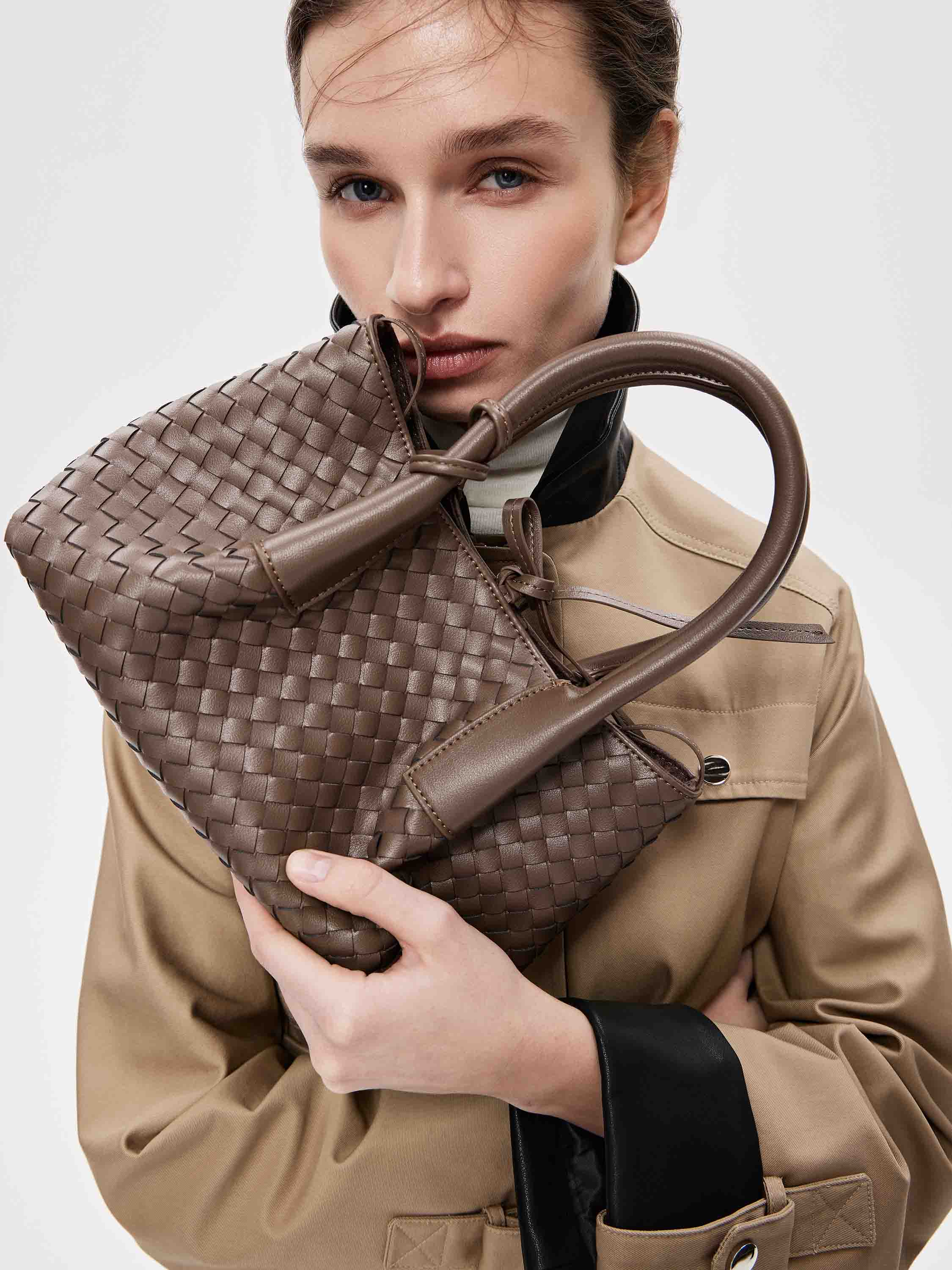 Сумка выполнена из натуральной кожи с характерным плетением, которое формирует выразительную фактуру и придает модели объем. Мягкая конструкция позволяет сумке держать форму и удобно располагаться в руке или на плече. Модель дополнена длинными ручками с кожаными накладками, благодаря которым ее комфортно носить разными способами. Вместительный формат делает сумку практичной для повседневного использования, а теплый коричневый оттенок подчеркивает фактуру плетения и органично сочетается с базовой палитрой гардероба.