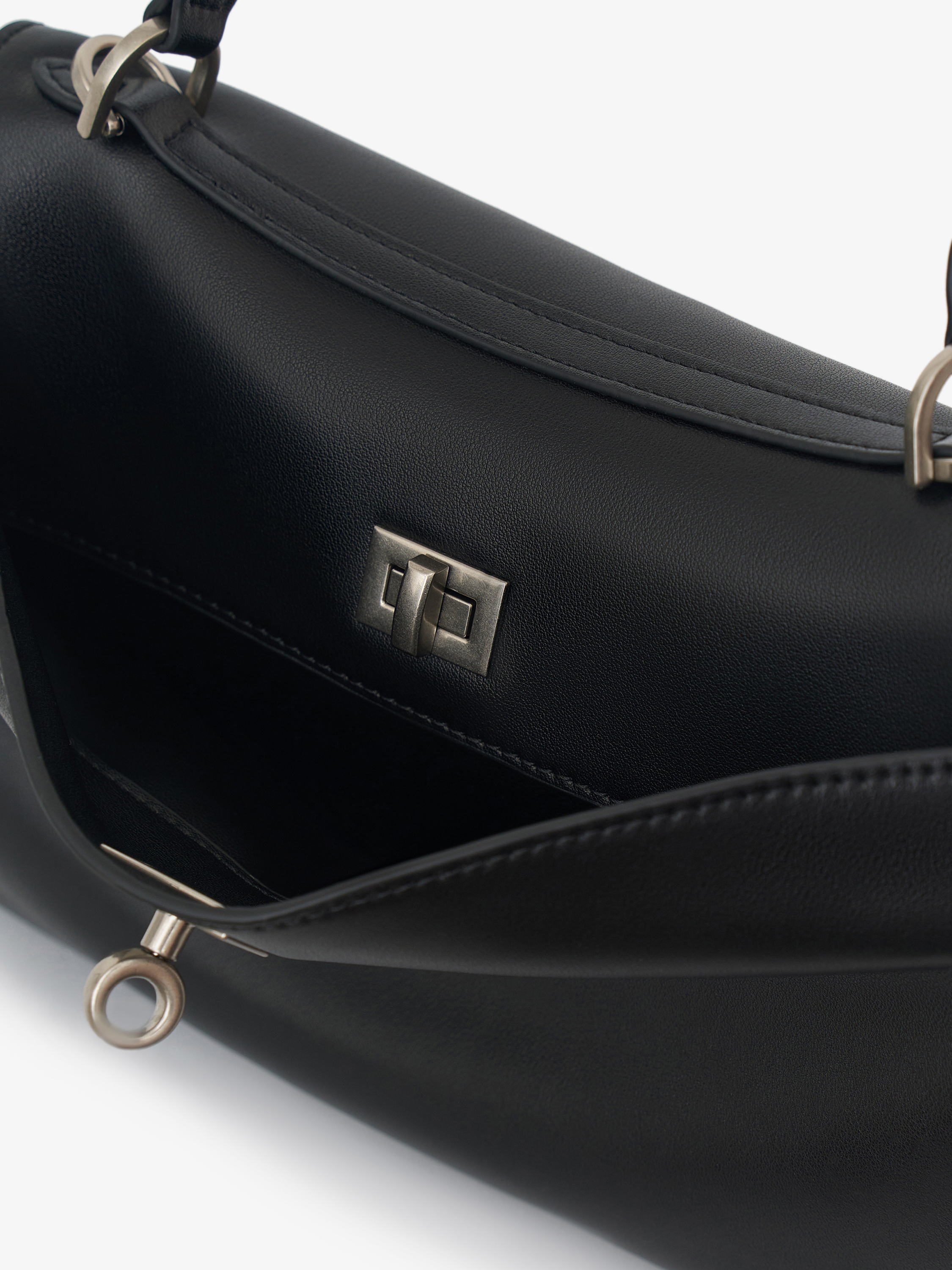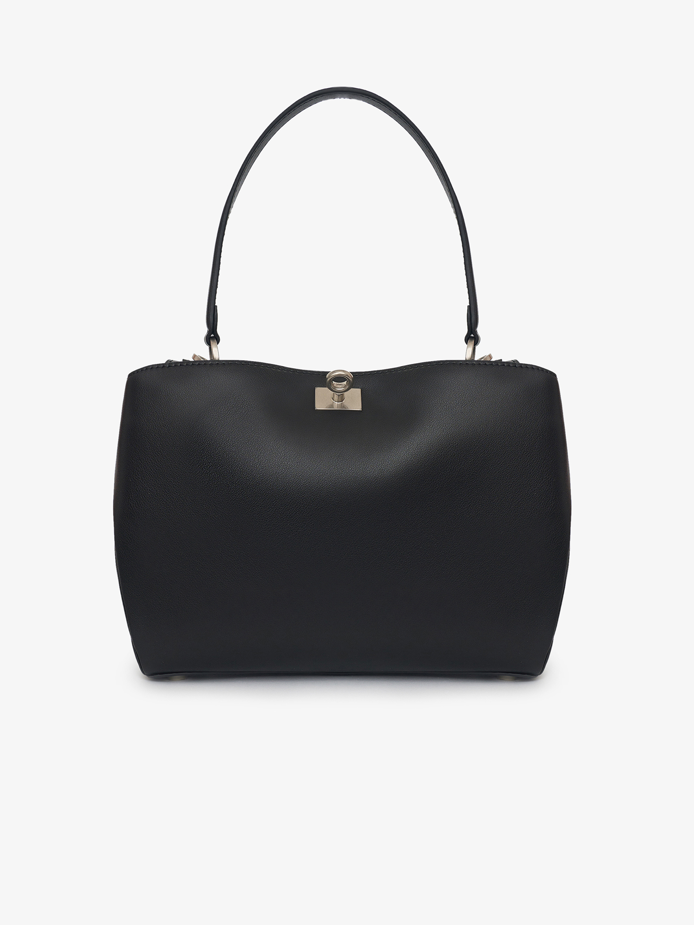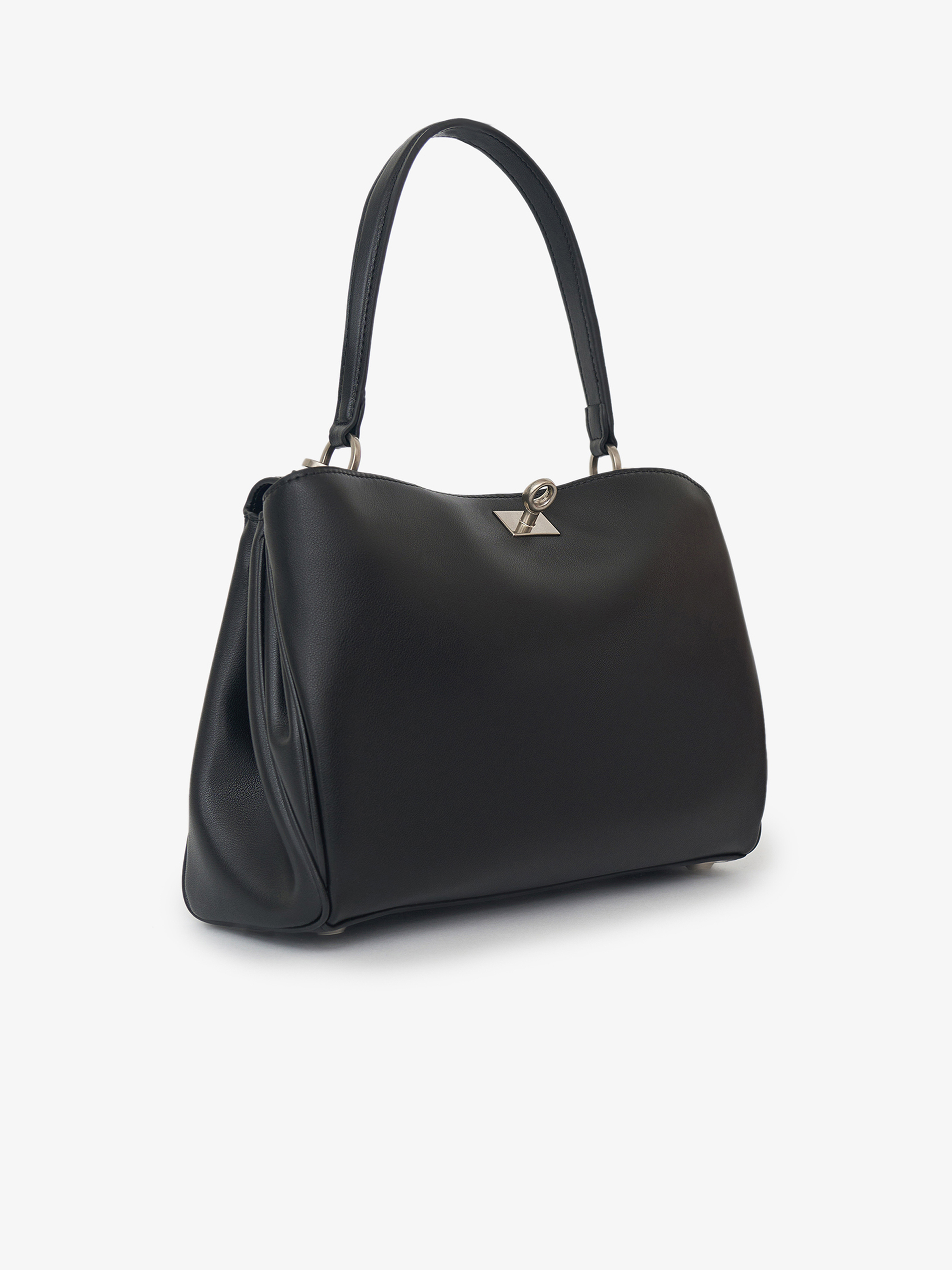 Сумка компактной прямоугольной формы с мягкой, пластичной конструкцией и скругленными линиями. Удлиненная ручка позволяет носить модель на плече, создавая более расслабленный силуэт, при этом форма остается собранной за счет аккуратной посадки. Основное отделение закрывается на молнию, боковые складки добавляют объема и функциональности. Модель из натуральной кожи с гладкой поверхностью, которая подчеркивает чистоту формы. Оттенок глубокого черного с нейтральным подтоном органично вписывается в базовый гардероб и сочетается с любой палитрой.