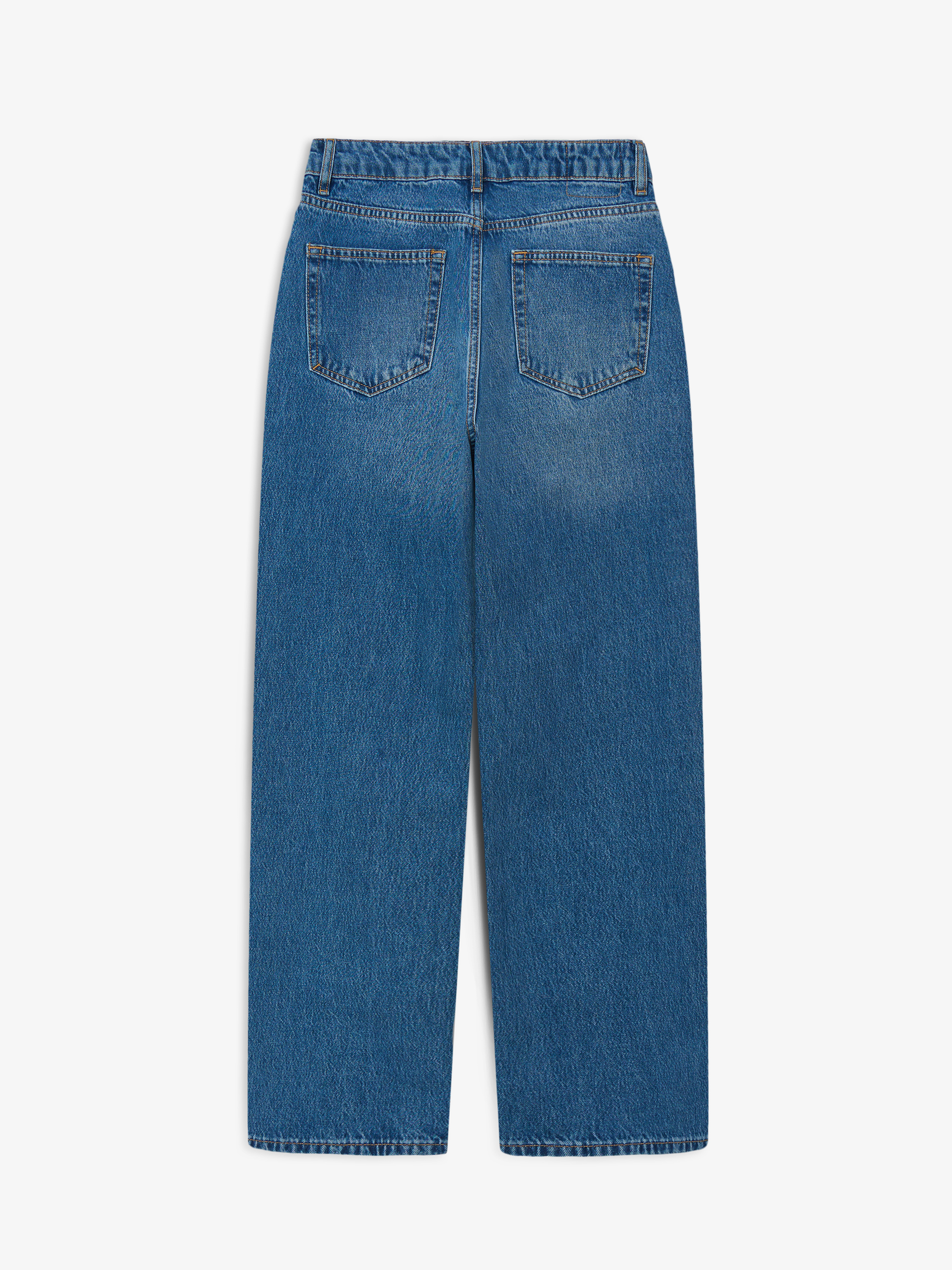 Джинсы с высокой посадкой и четко оформленной линией талии, с поясом со шлевками и классической застежкой на молнию и пуговицу. Прямой крой формирует вытянутый силуэт, штанины сидят ровно и не создают лишнего объема. Конструкция выдержана в классической джинсовой логике: пять карманов, металлическая фурнитура, плотные швы. Хлопковый деним средней плотности прочный и износостойкий, при носке постепенно становится мягче, сохраняя форму изделия. Синий оттенок с выраженной варкой и легкими высветлениями добавляет фактуру и делает модель более выразительной в повседневных сочетаниях.