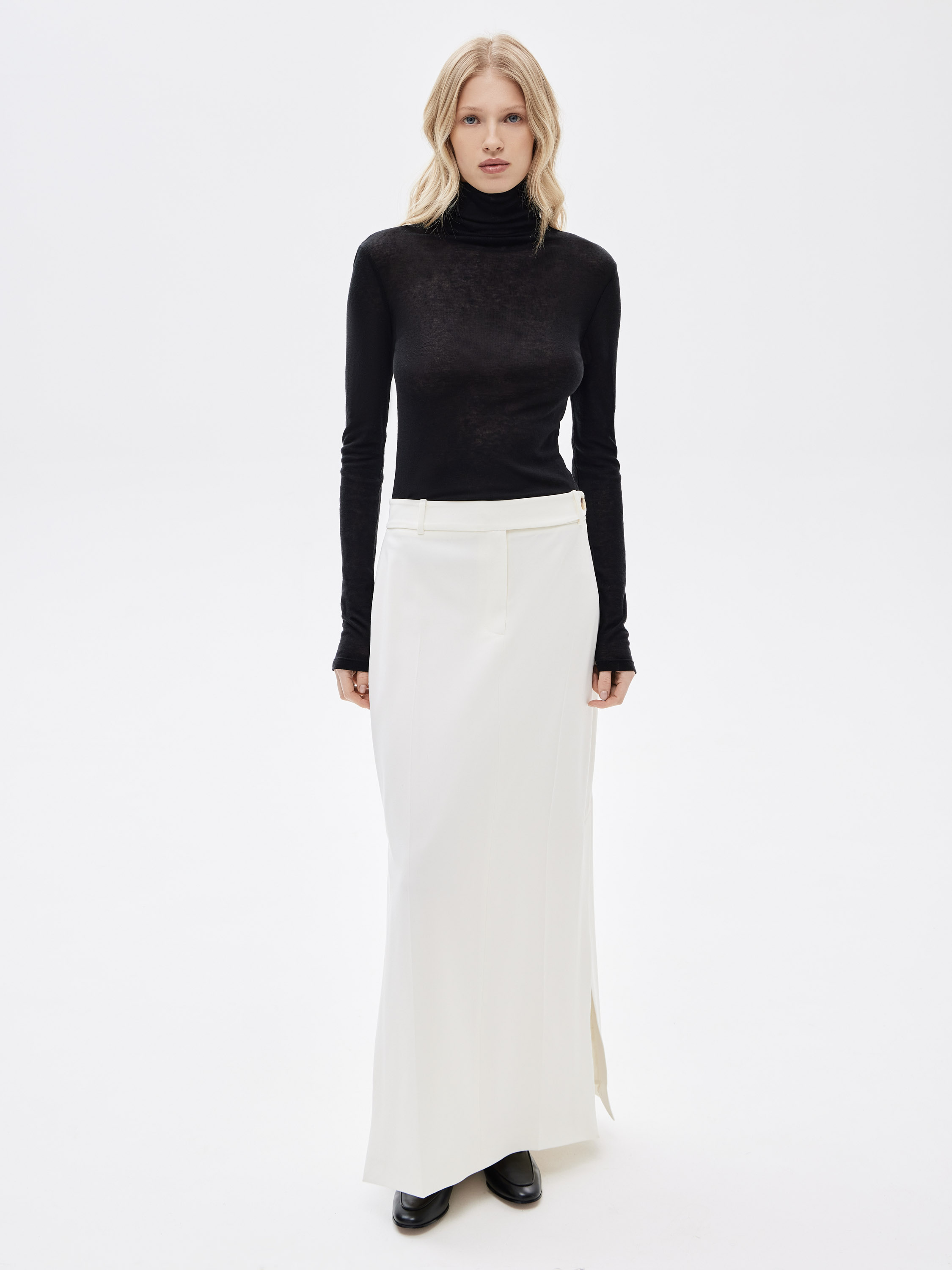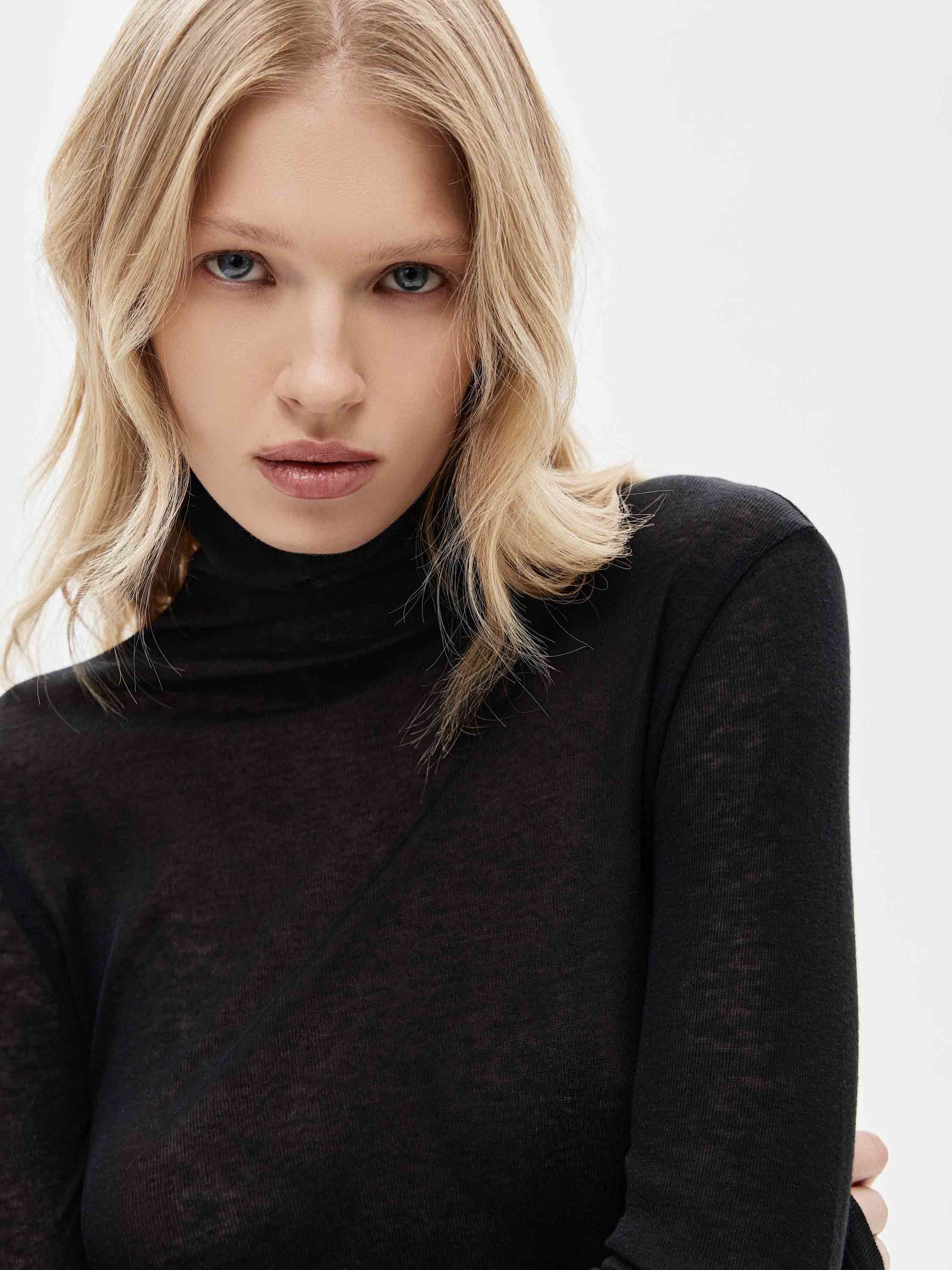 Водолазка выполнена из смесового трикотажа на основе лиоцелла и шерсти с тонкой, ровной фактурой. Лиоцелл придает материалу мягкость, гладкость и высокую воздухопроницаемость, за счет чего изделие комфортно при длительном ношении и хорошо подходит для многослойных сочетаний. Добавление шерсти усиливает тепловые свойства и делает трикотаж более устойчивым к деформации. Материал эластичный, приятный к телу, сохраняет аккуратный внешний вид в течение дня. Силуэт прилегающий, с длинным рукавом и воротником-стойкой, который мягко ложится по линии шеи без излишнего объема. Водолазка подходит для сочетаний с юбками, брюками и жакетами и органично вписывается в повседневный и рабочий гардероб.
