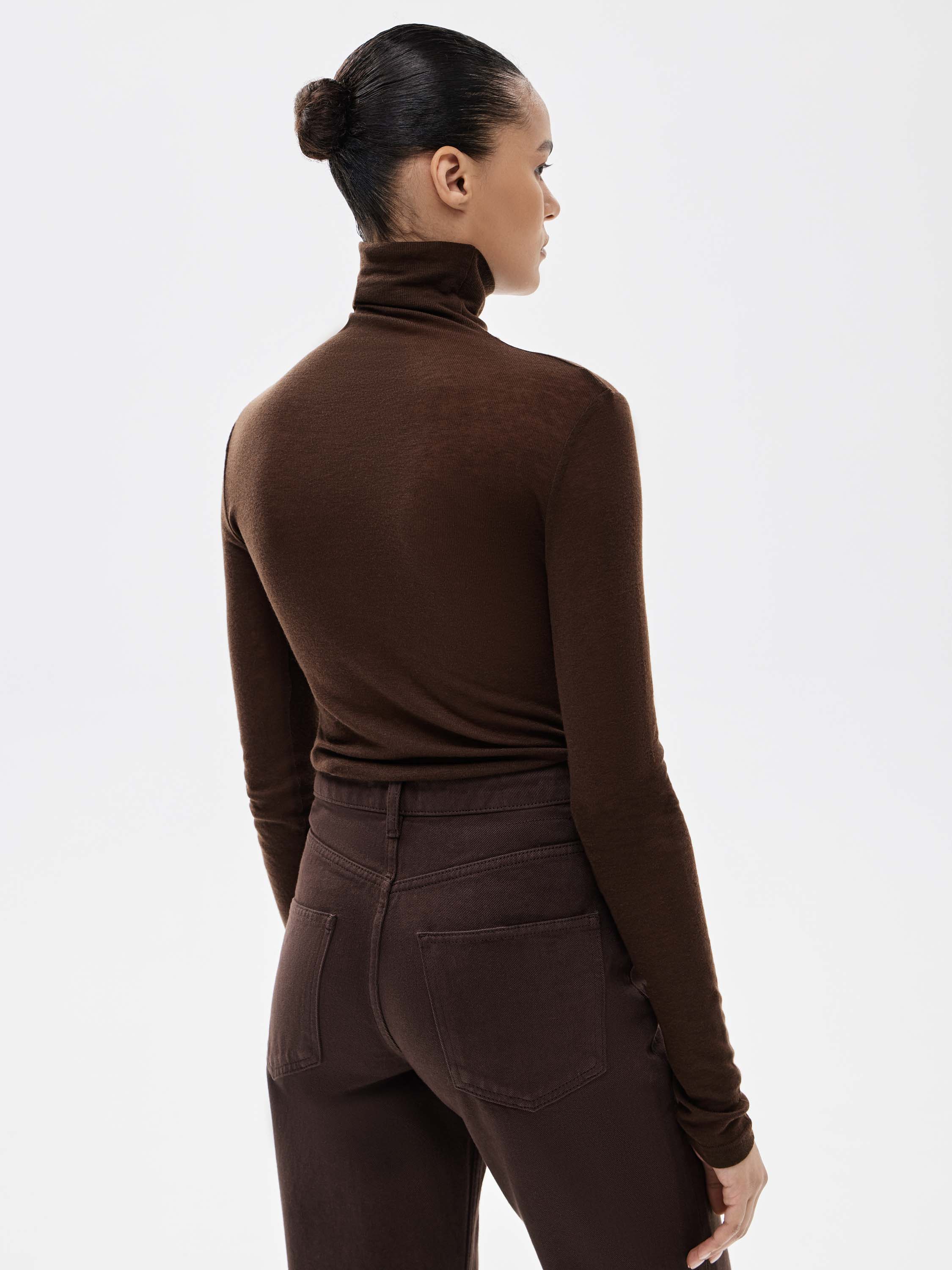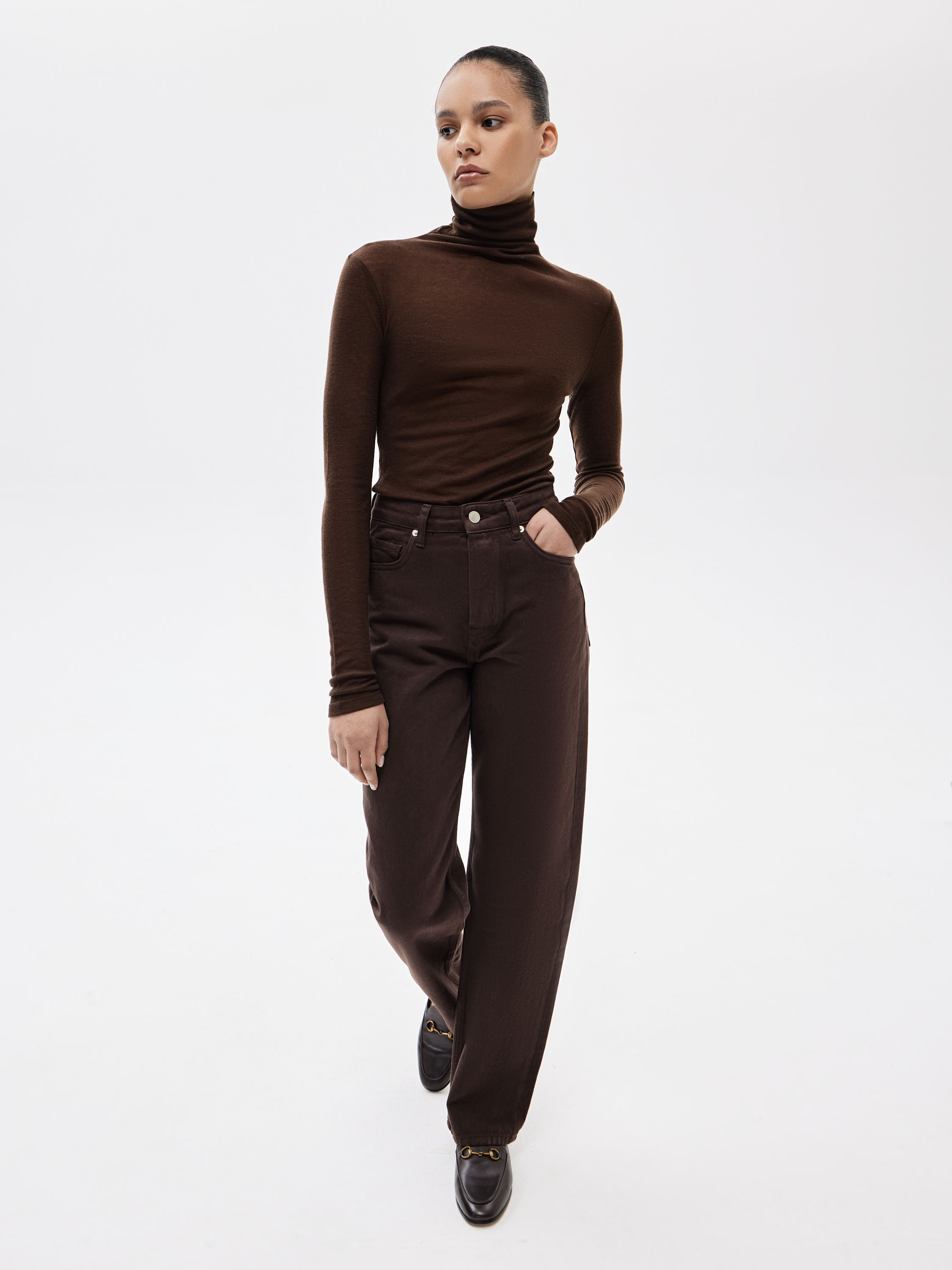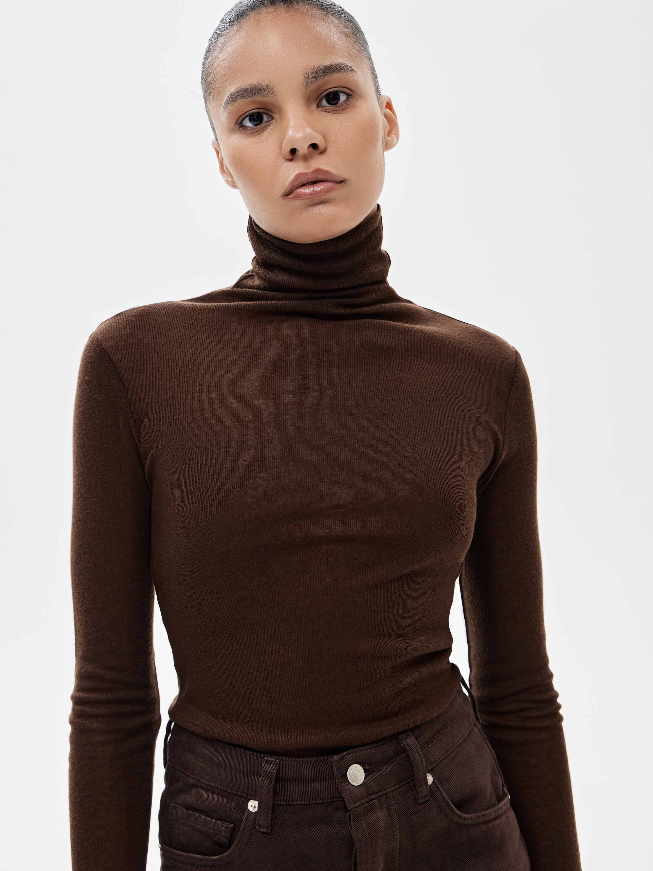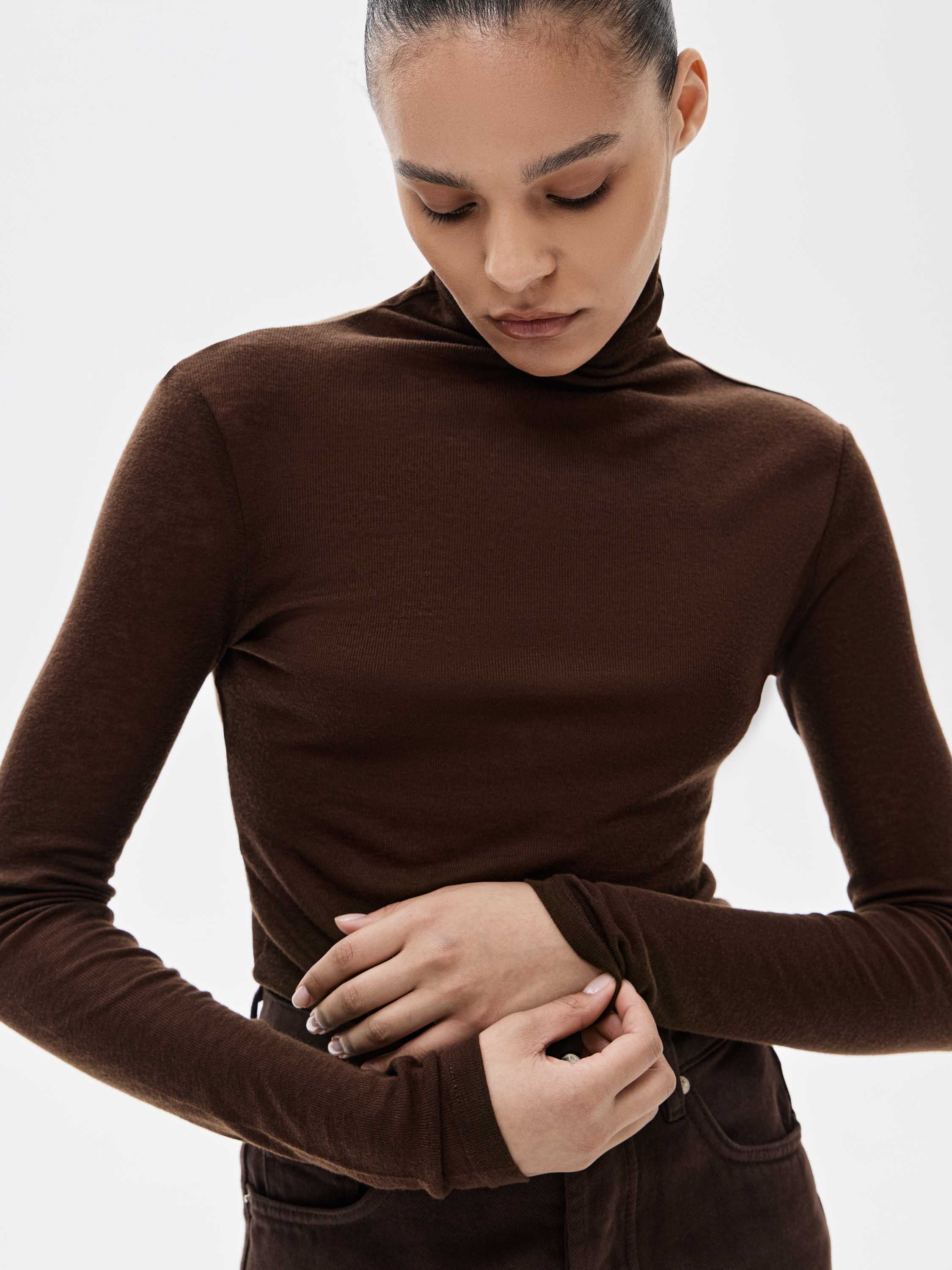 Водолазка выполнена из смесового трикотажа на основе лиоцелла и шерсти с тонкой, ровной фактурой. Лиоцелл придает материалу мягкость, гладкость и высокую воздухопроницаемость, за счет чего изделие комфортно при длительном ношении и хорошо подходит для многослойных сочетаний. Добавление шерсти усиливает тепловые свойства и делает трикотаж более устойчивым к деформации. Материал эластичный, приятный к телу, сохраняет аккуратный внешний вид в течение дня. Силуэт прилегающий, с длинным рукавом и воротником-стойкой, который мягко ложится по линии шеи без излишнего объема. Водолазка подходит для сочетаний с юбками, брюками и жакетами и органично вписывается в повседневный и рабочий гардероб.