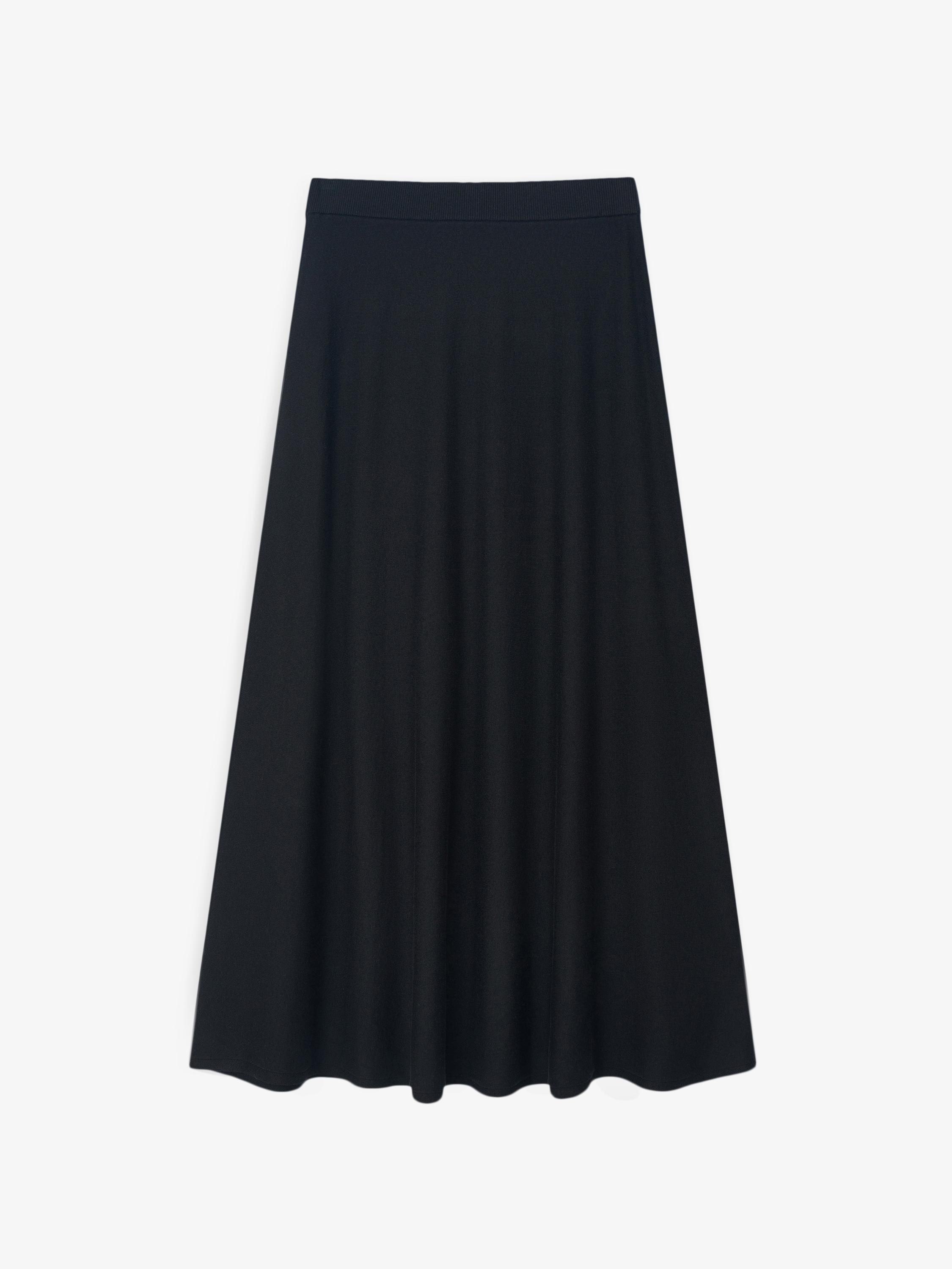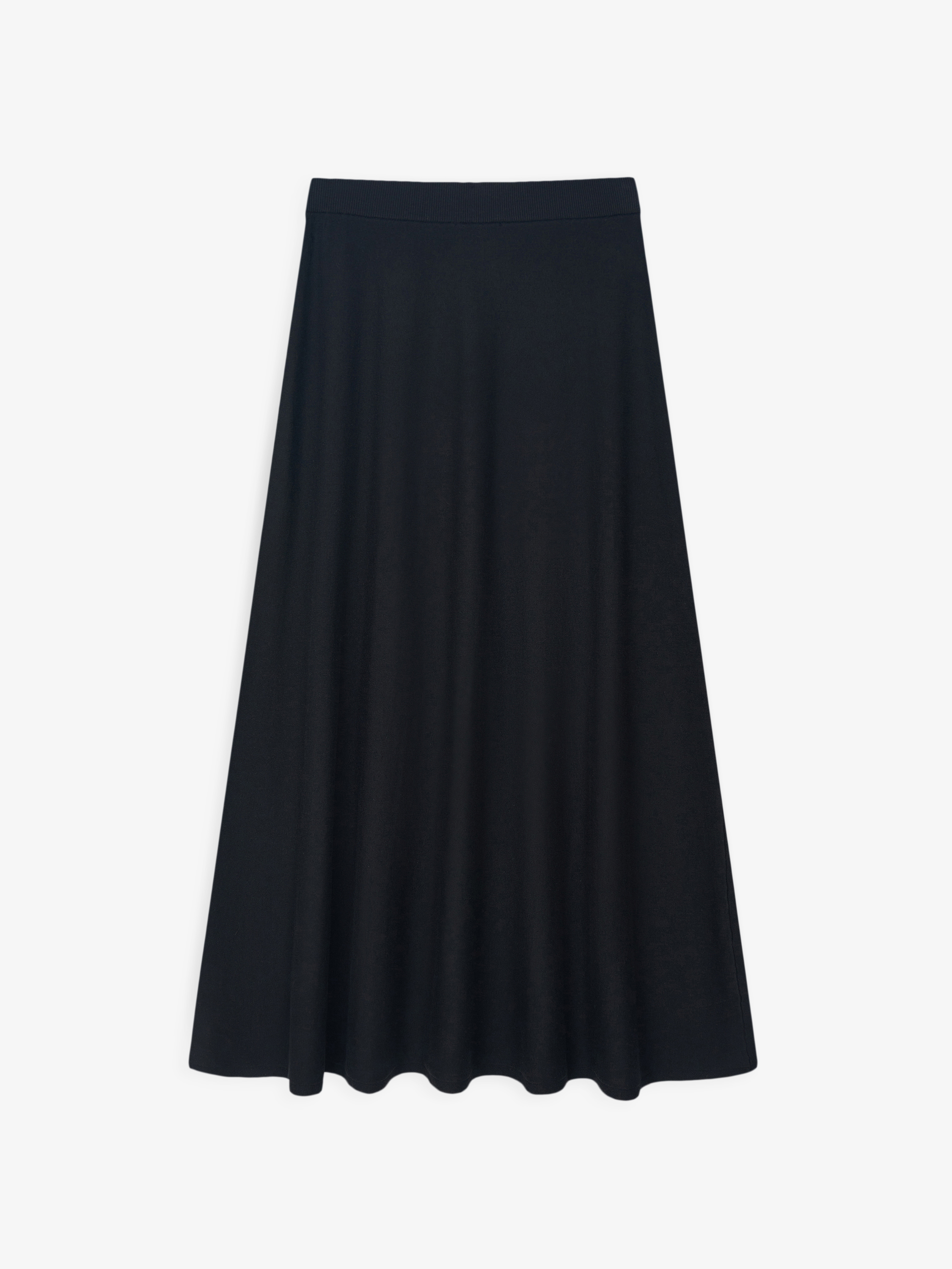 Юбка длины миди с высокой посадкой и расклешенным силуэтом, который формирует мягкое движение и ровную посадку по линии талии. Верх оформлен без лишних деталей, за счет чего сохраняется чистота формы и аккуратная посадка, расширение книзу добавляет легкость. Смесовое полотно на основе хлопка с добавлением вискозы комфортно в носке и мягко драпируется, темный оттенок делает модель универсальной для повседневных и более собранных сочетаний.