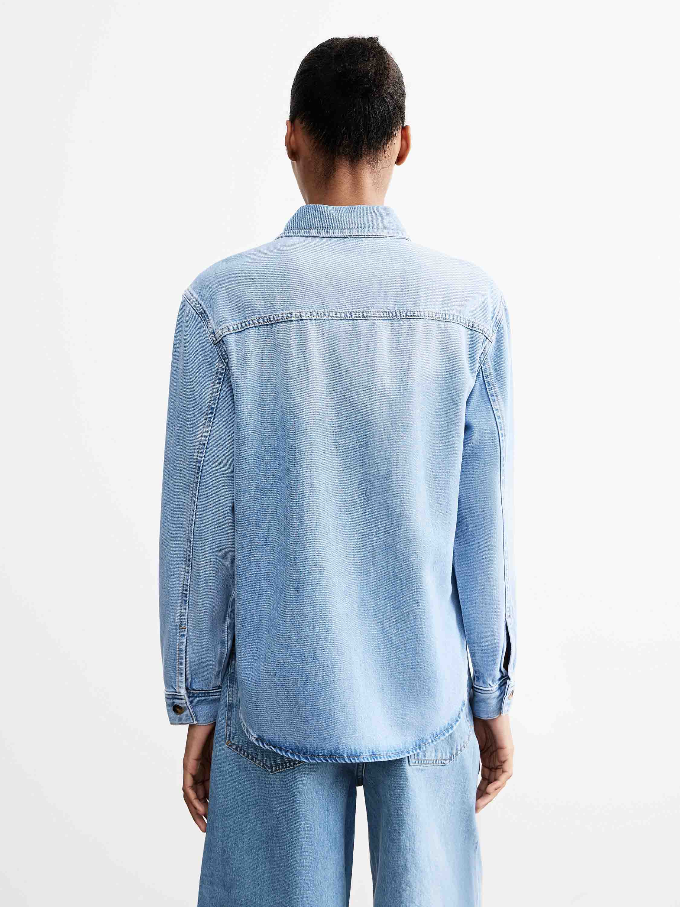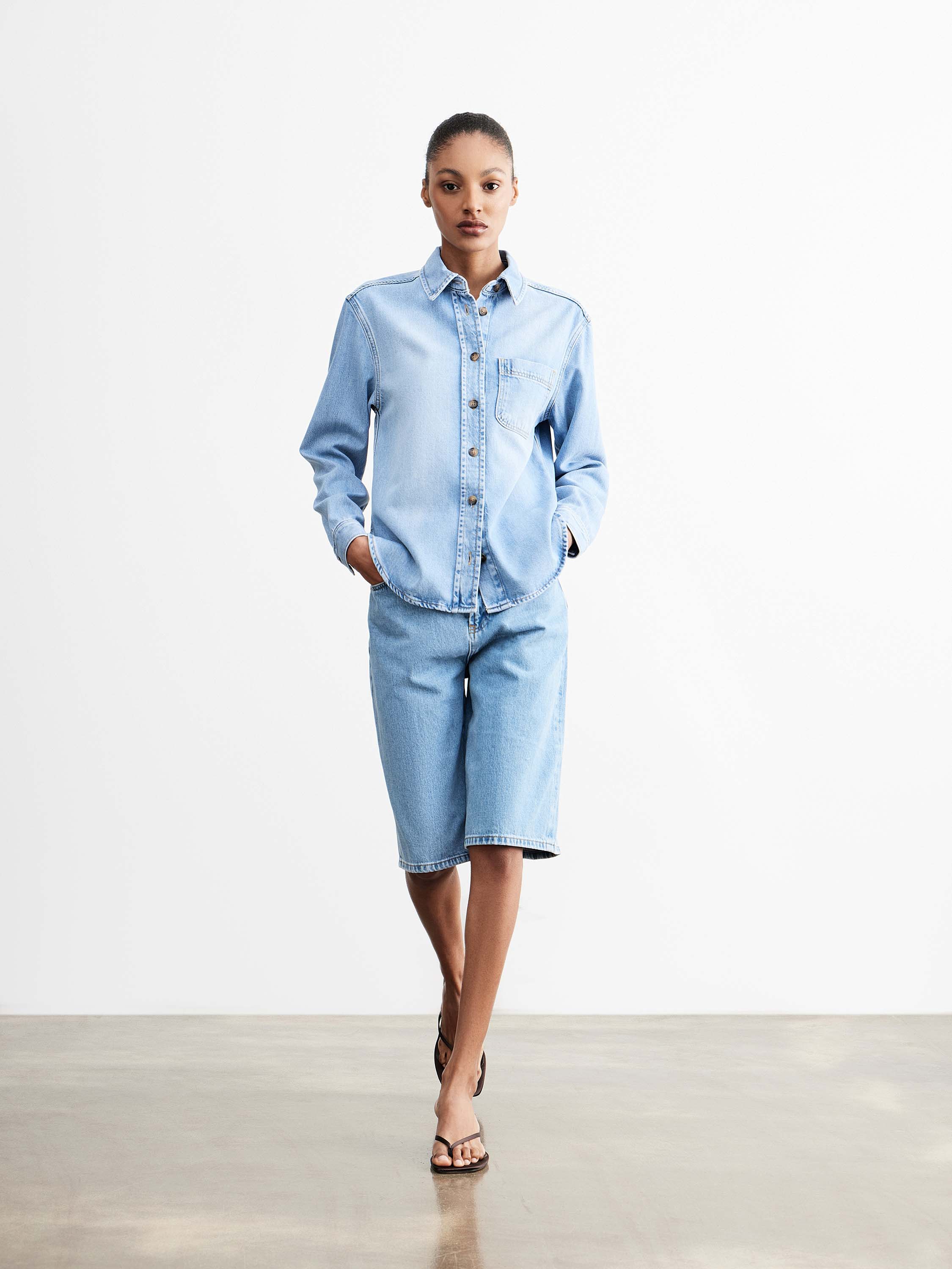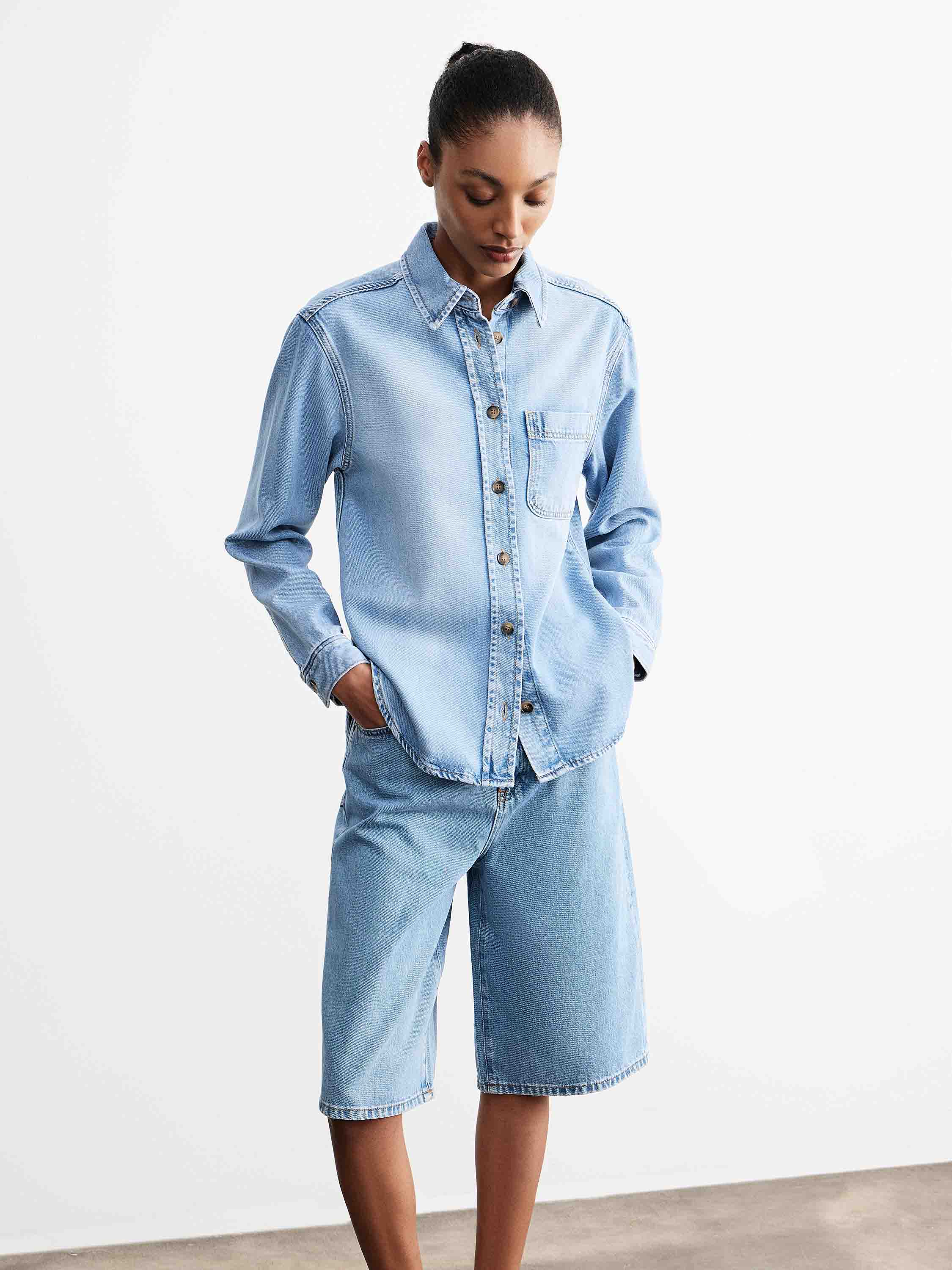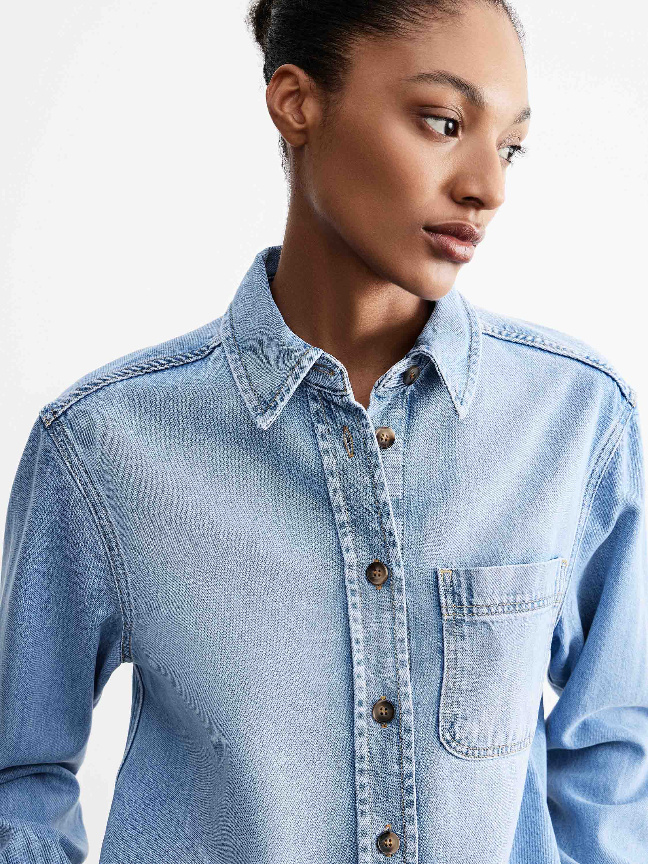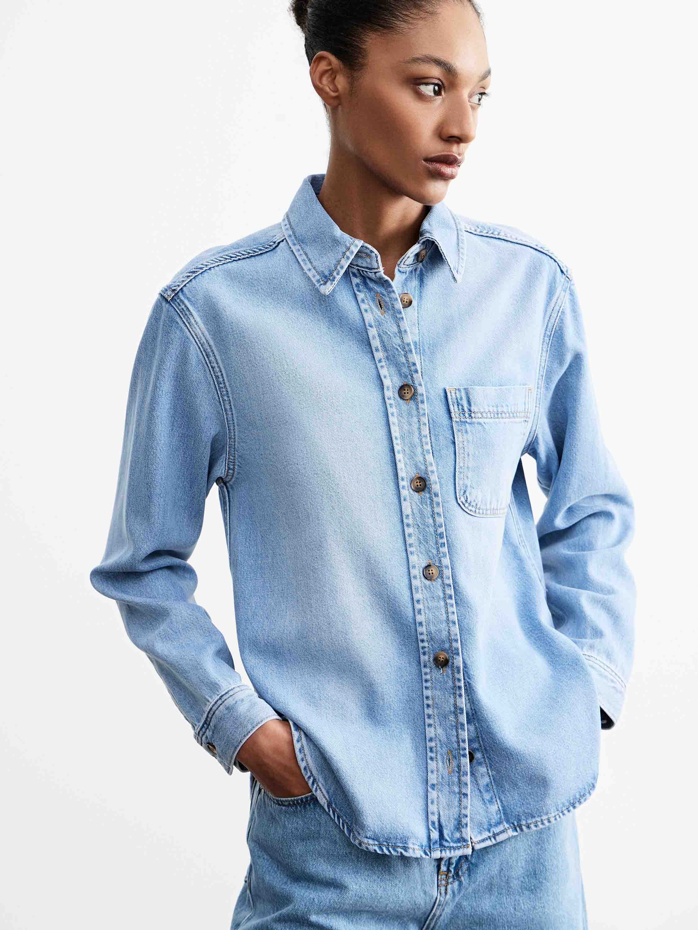 Рубашка из смесового денима на основе лиоцелла с добавлением хлопка, за счет чего ткань сохраняет мягкость, пластичность и воздухопроницаемость, оставаясь при этом прочной и устойчивой к износу. Модель выполнена в прямом силуэте с классическим отложным воротником и центральной застежкой на пуговицы, дополнена нагрудным накладным карманом. Линия плеча слегка смягчена, посадка свободная, без излишнего объема, что делает силуэт аккуратным и универсальным. Светло-голубой оттенок с деликатными переходами цвета подчеркивает фактуру денима и позволяет вписывать рубашку как в повседневные комплекты с джинсами, так и в более собранные сочетания с брюками или юбками.
