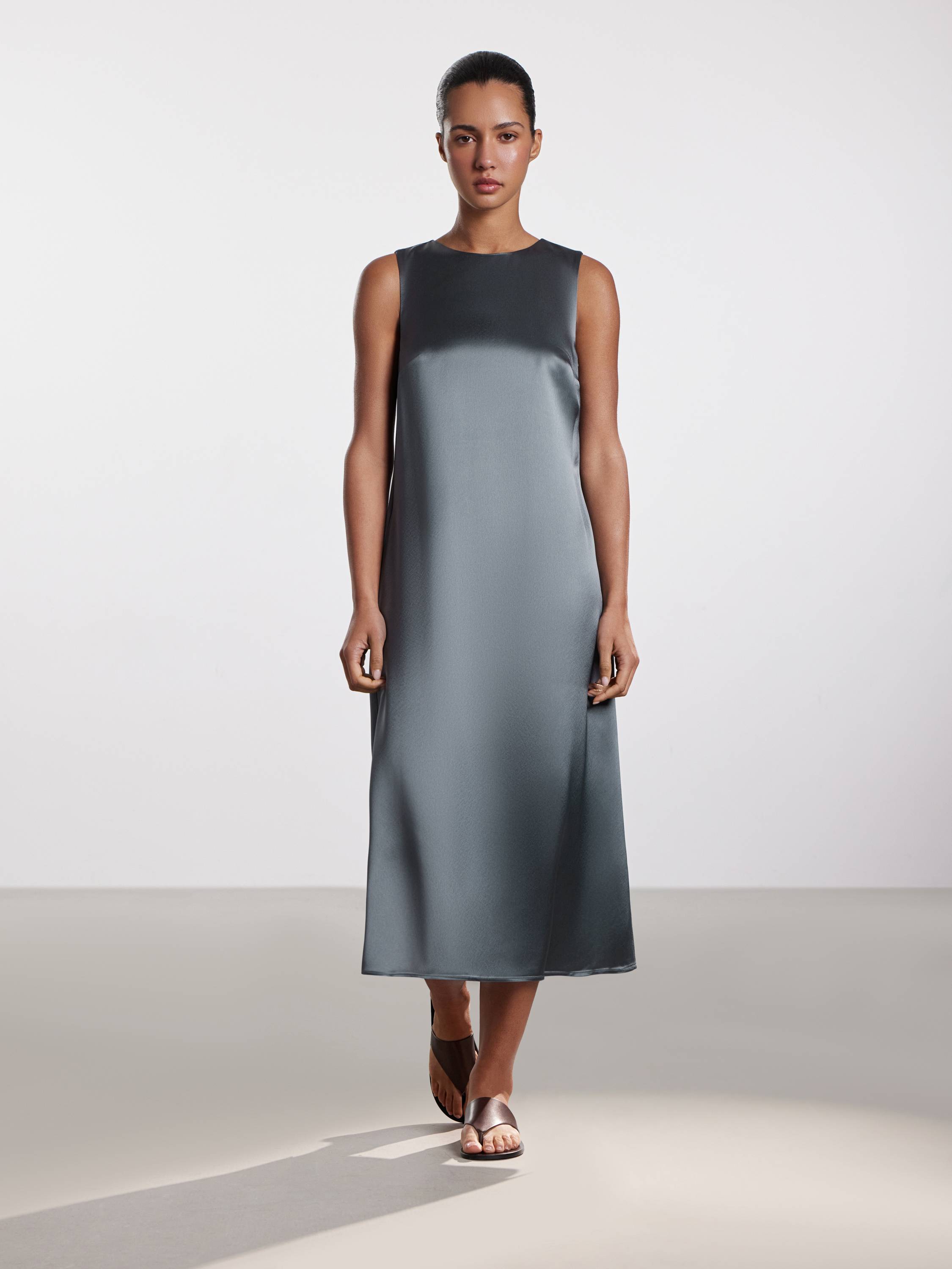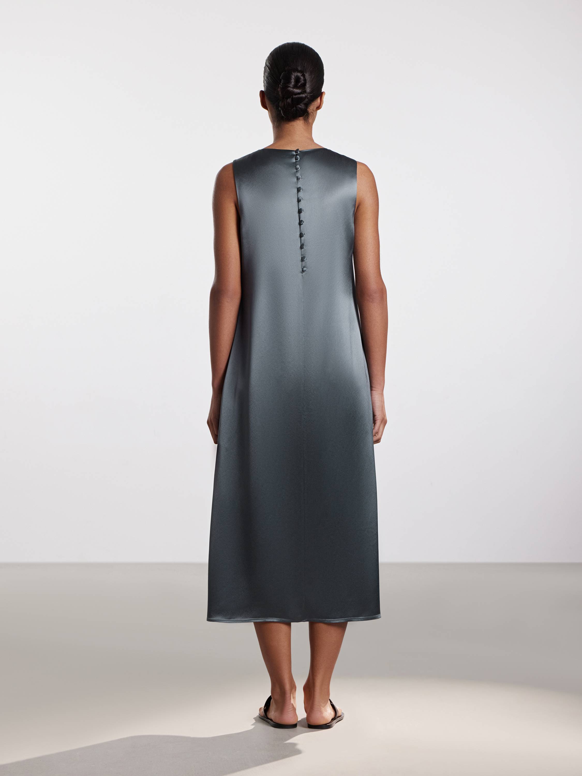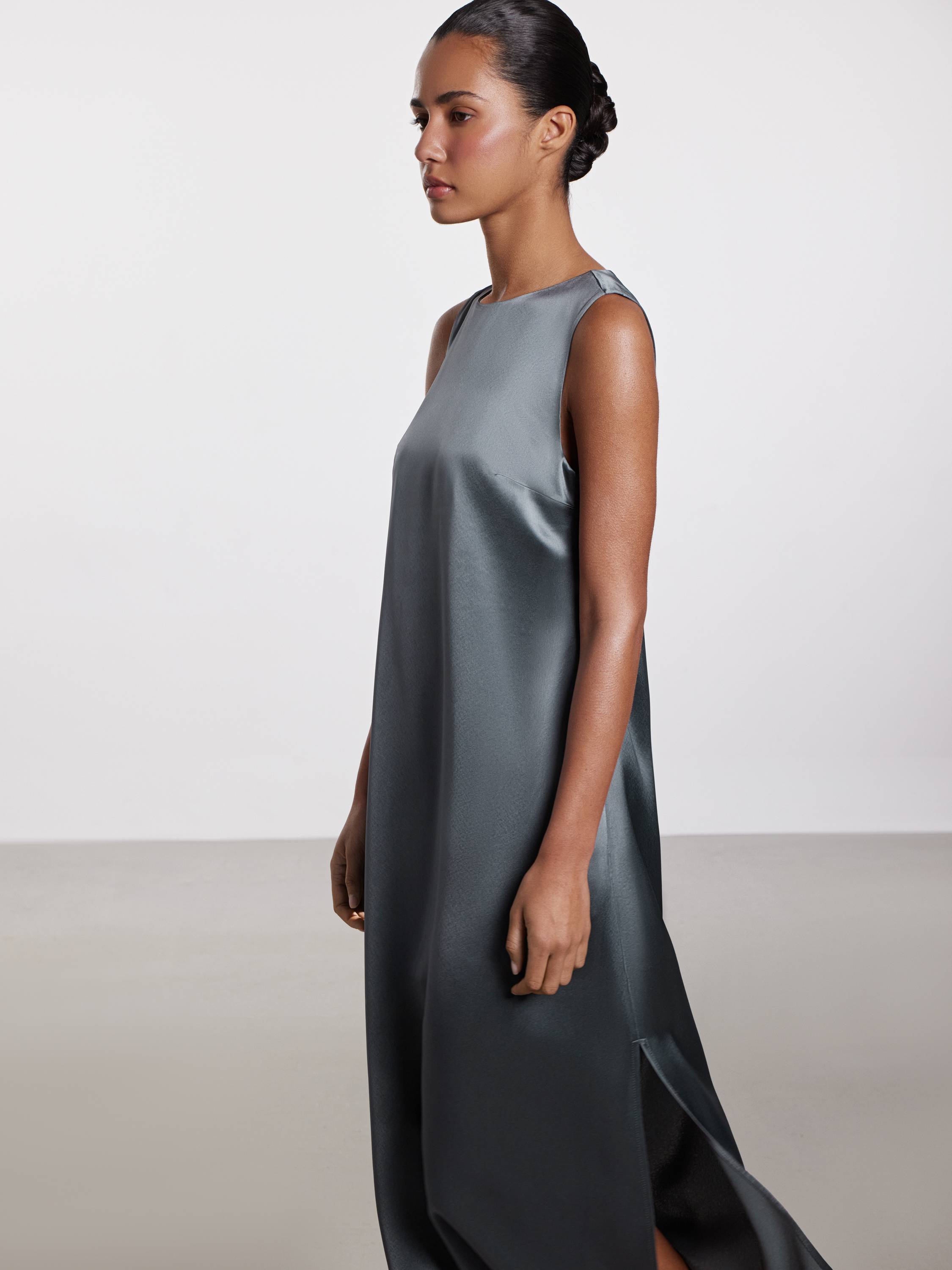 Платье миди с лаконичным кроем, в котором каждая деталь работает на чистоту и эстетику образа. Гладкое полотно с высоким содержанием ацетата играет на свету деликатным блеском, подчеркивая текучесть ткани и мягкость движения. Прямой силуэт с округлой горловиной создает эффект собранной простоты, а застежка на спинке из ряда обтянутых пуговиц добавляет едва уловимый винтажный акцент. Глубокий разрез по боковому шву открывает движение и визуально облегчает образ. Платье легко адаптируется под городские будни, вечерние выходы и образы в отпуске. Выбирайте к нему сандалии, шелковые платки, структурированные жакеты — и каждый раз оно будет звучать по-новому.