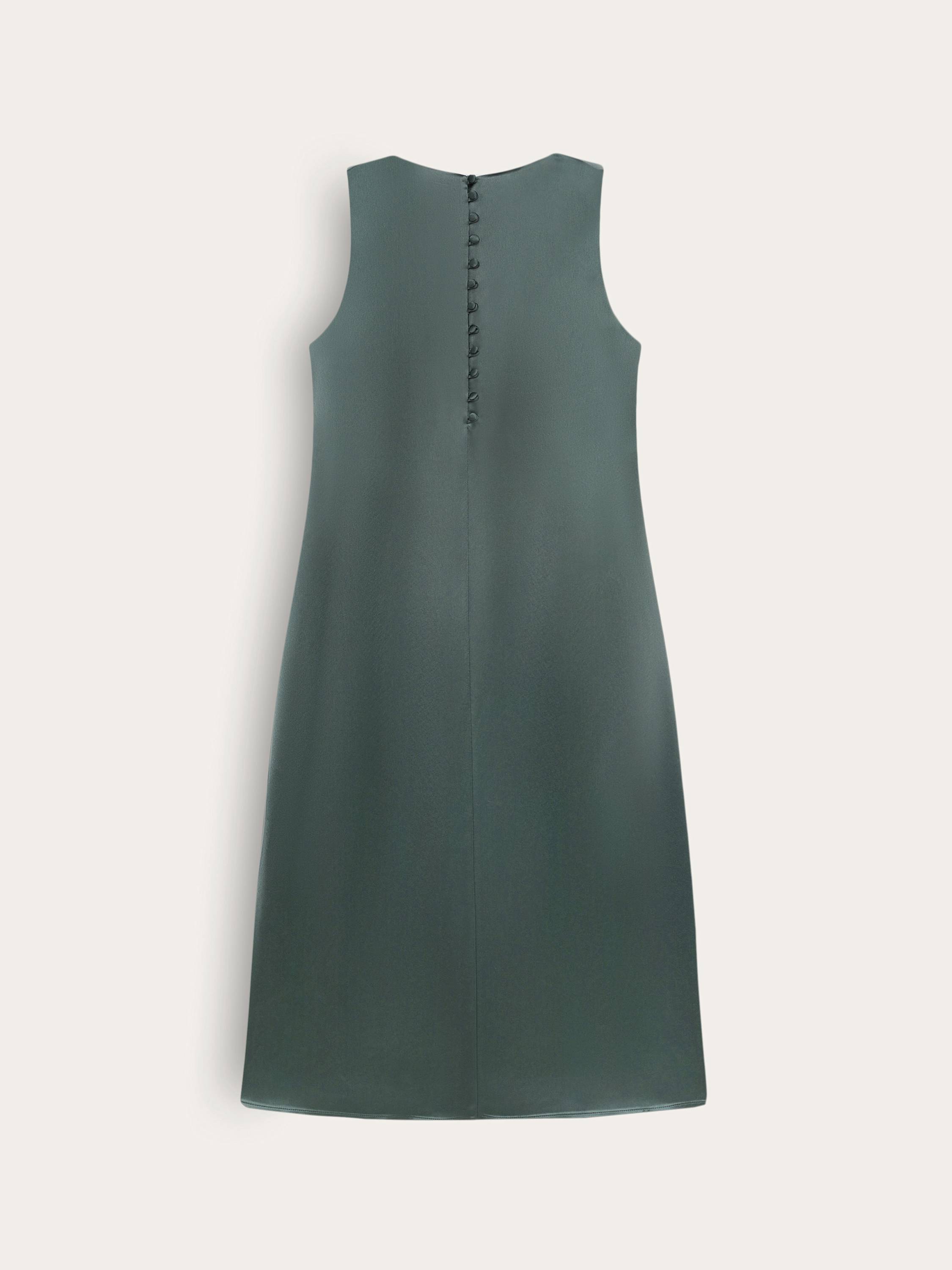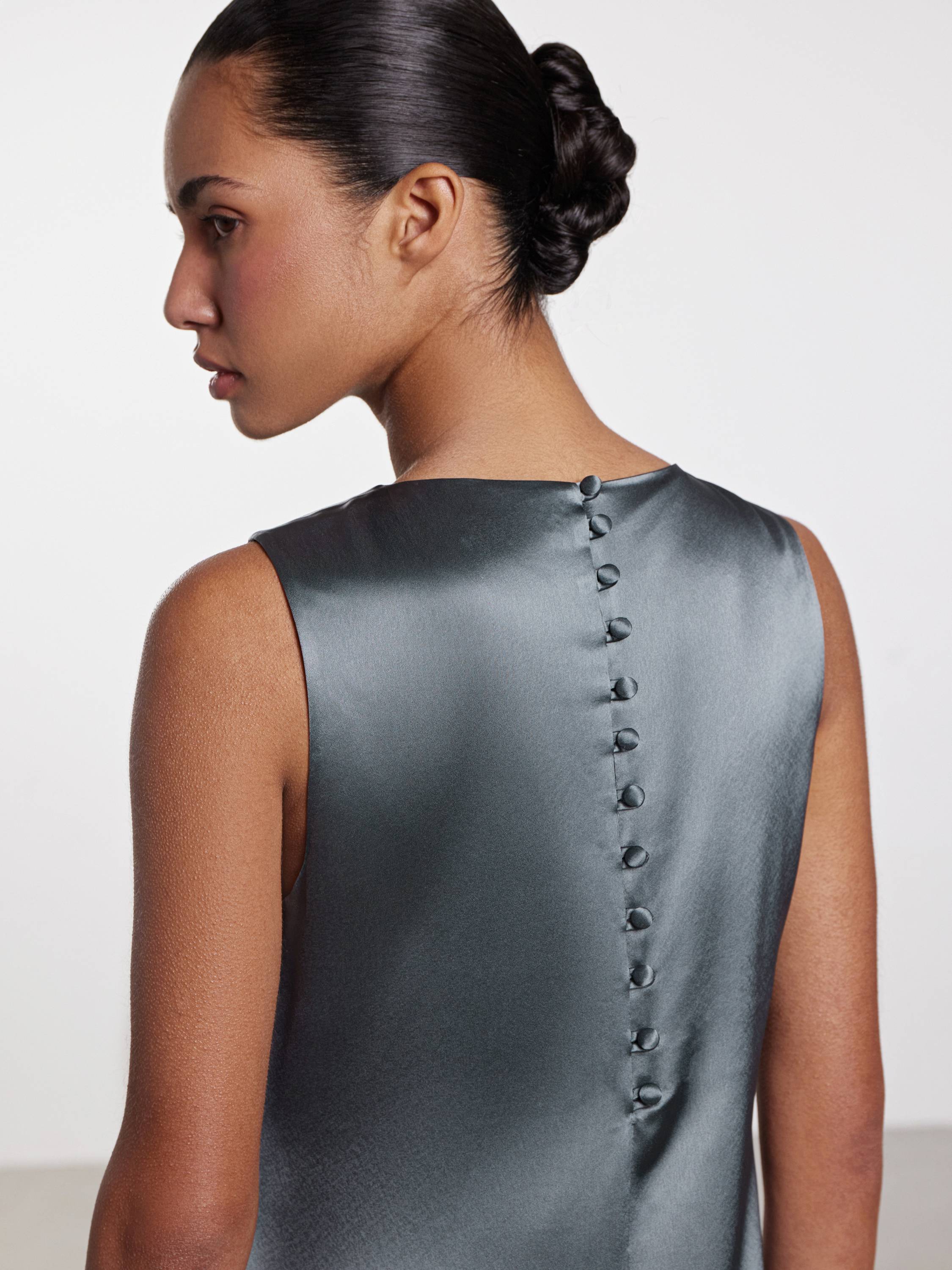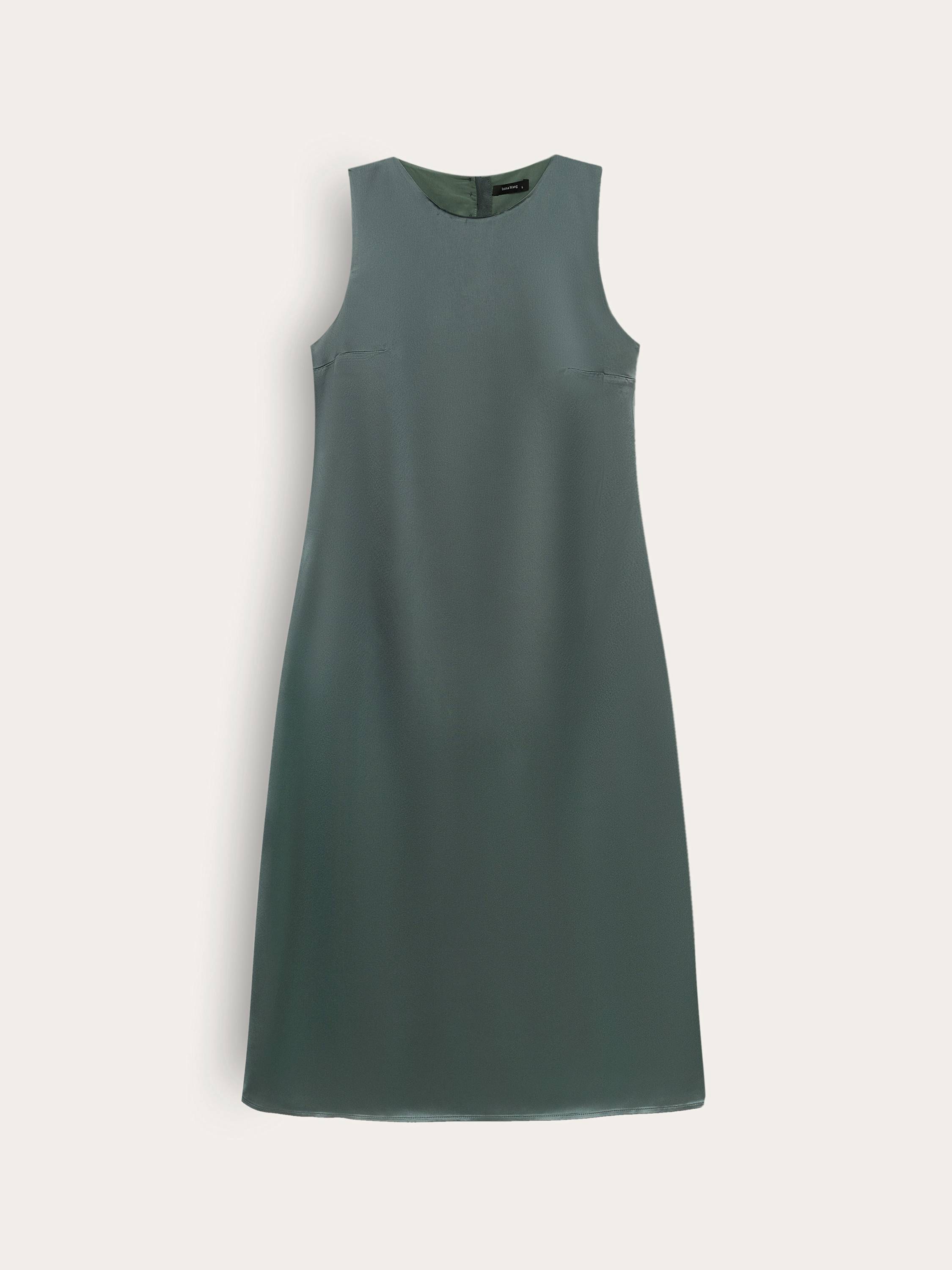 Платье миди с лаконичным кроем, в котором каждая деталь работает на чистоту и эстетику образа. Гладкое полотно с высоким содержанием ацетата играет на свету деликатным блеском, подчеркивая текучесть ткани и мягкость движения. Прямой силуэт с округлой горловиной создает эффект собранной простоты, а застежка на спинке из ряда обтянутых пуговиц добавляет едва уловимый винтажный акцент. Глубокий разрез по боковому шву открывает движение и визуально облегчает образ. Платье легко адаптируется под городские будни, вечерние выходы и образы в отпуске. Выбирайте к нему сандалии, шелковые платки, структурированные жакеты — и каждый раз оно будет звучать по-новому.