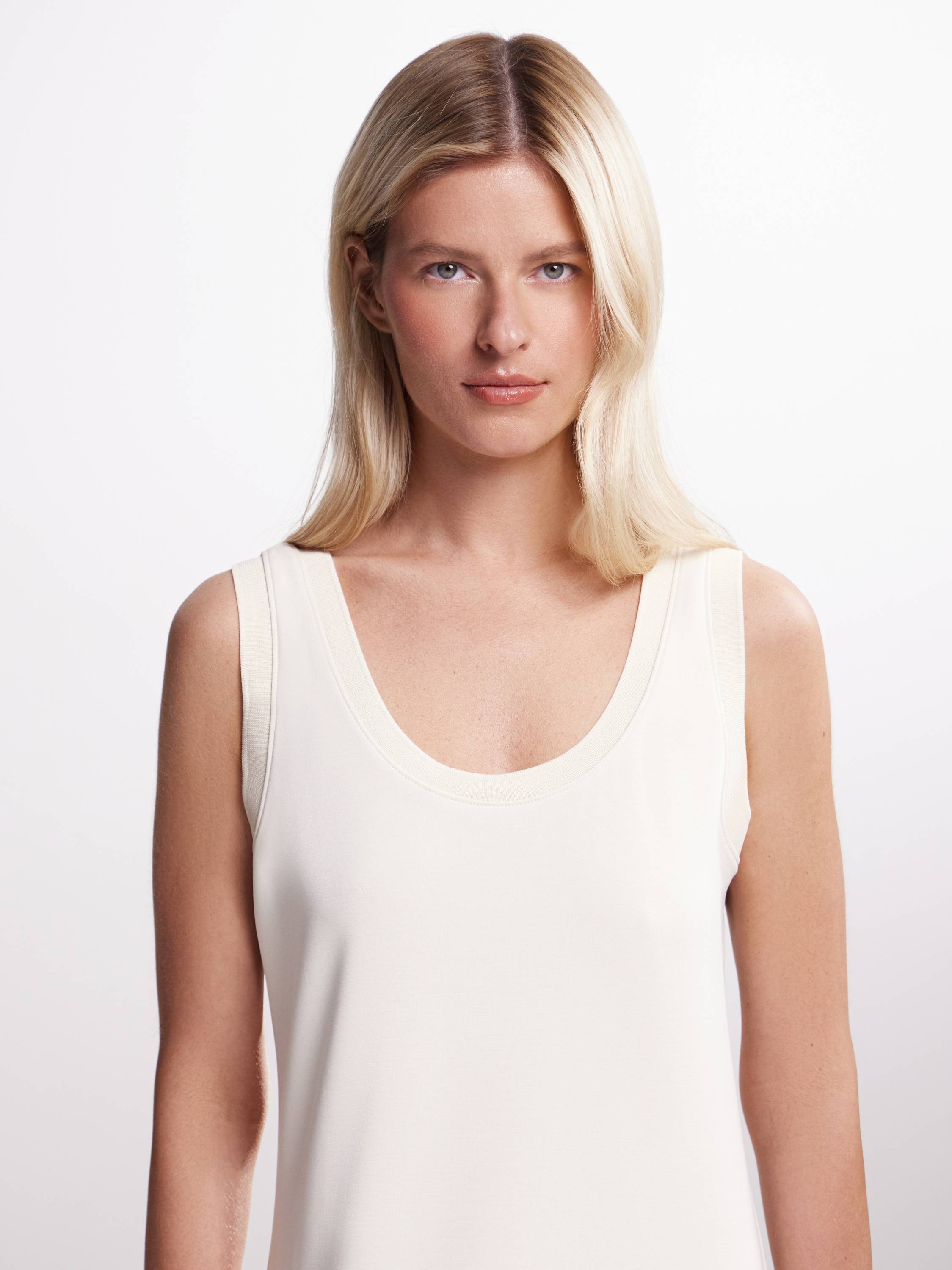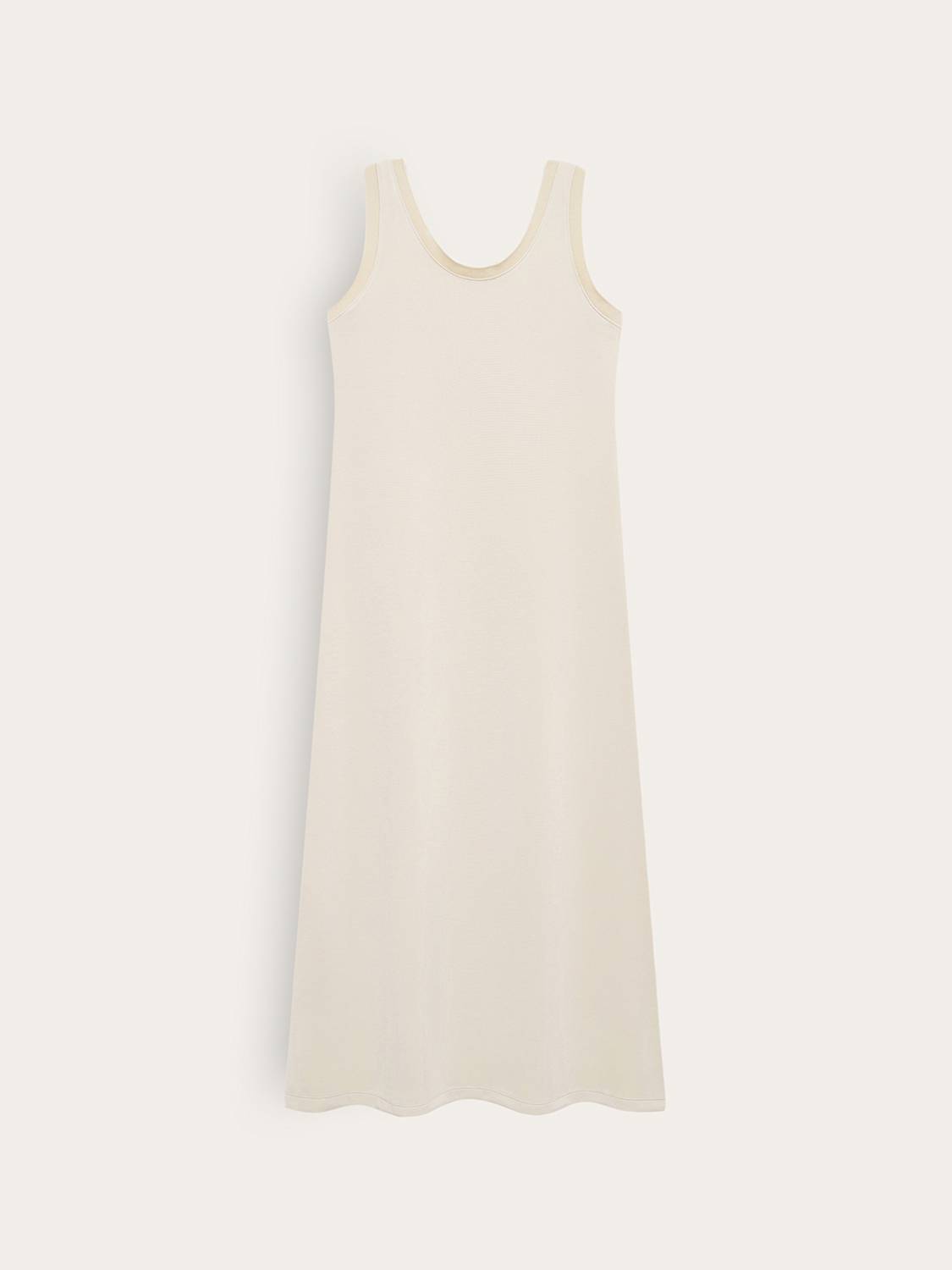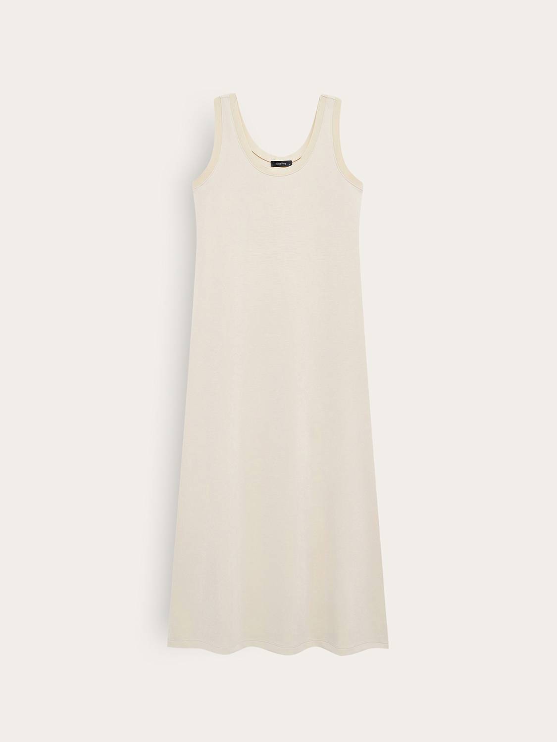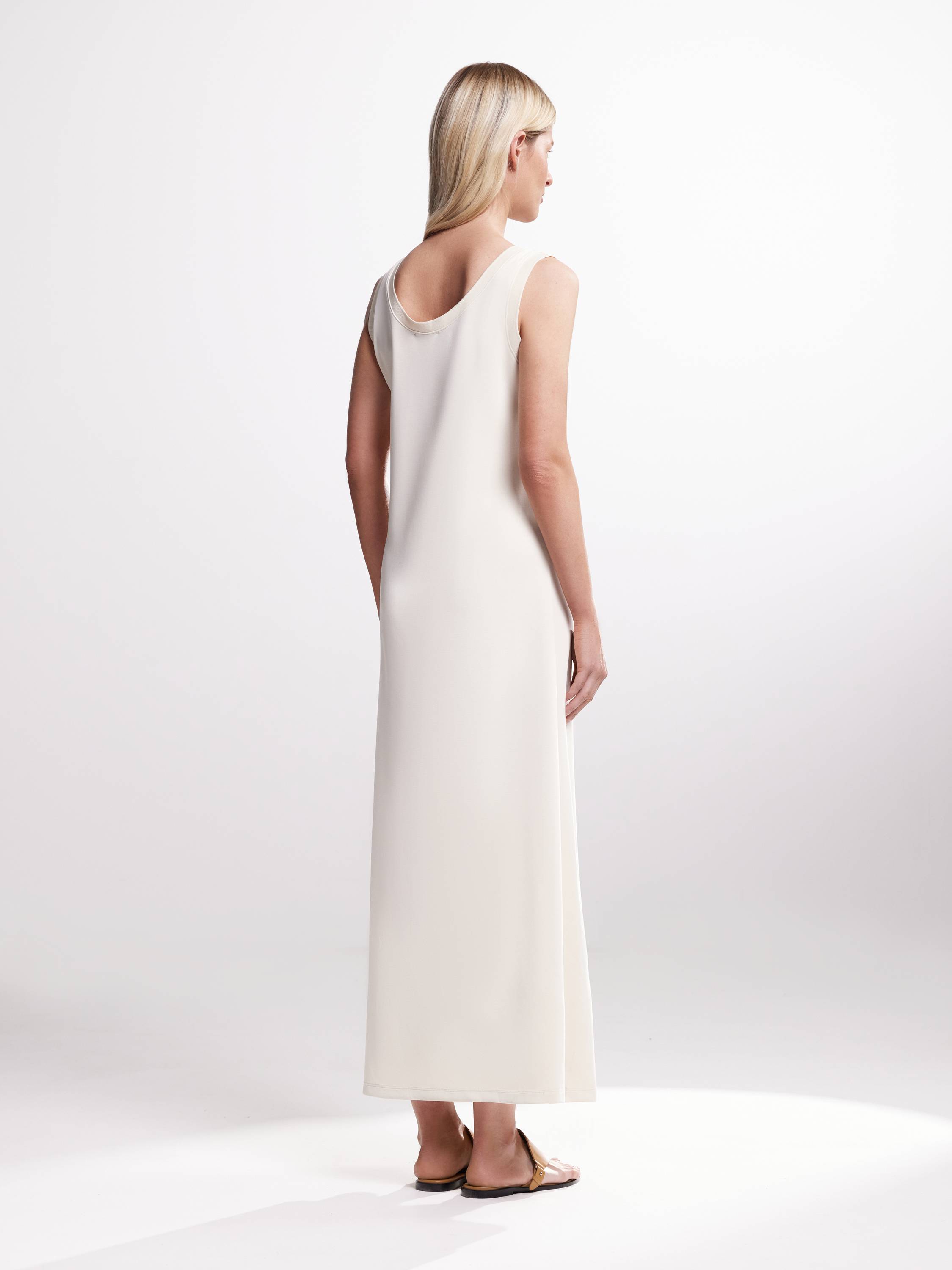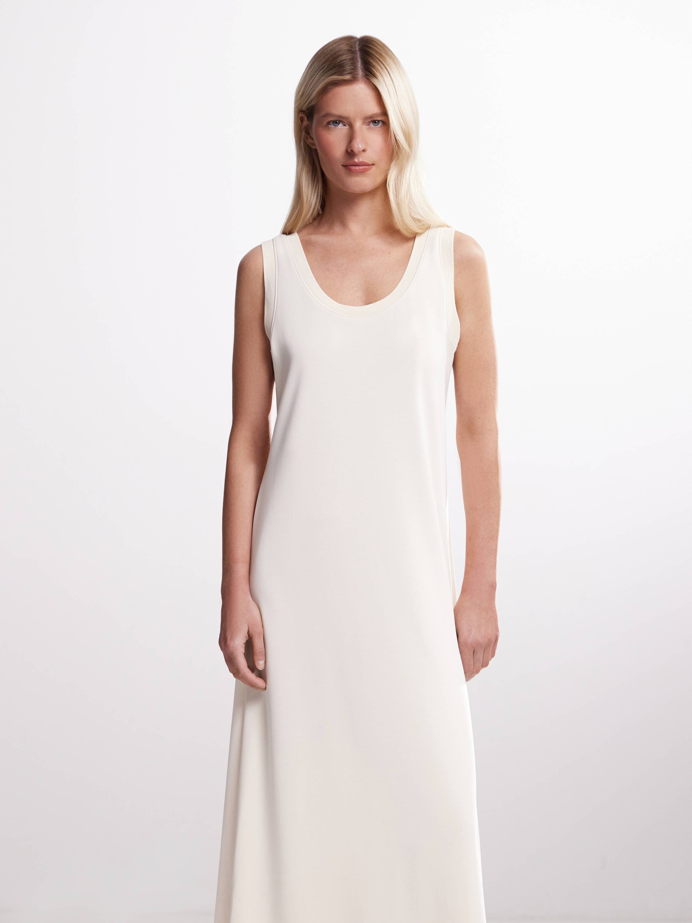 Макси-длина, мягкий вырез и чистая линия плеч — это платье создает минималистичный, но выразительный образ. Благодаря пластичной и приятной на ощупь ткани силуэт струится, не перегружая фигуру. Эластичное полотно на основе модала легко адаптируется к движениям и сохраняет форму, а выверенный крой подчеркивает архитектуру модели. Универсальный базовый оттенок делает платье идеальным решением для летнего гардероба — как в городе, так и в отпуске. Сочетается с плетеными аксессуарами, сандалиями или лаконичными жакетами.