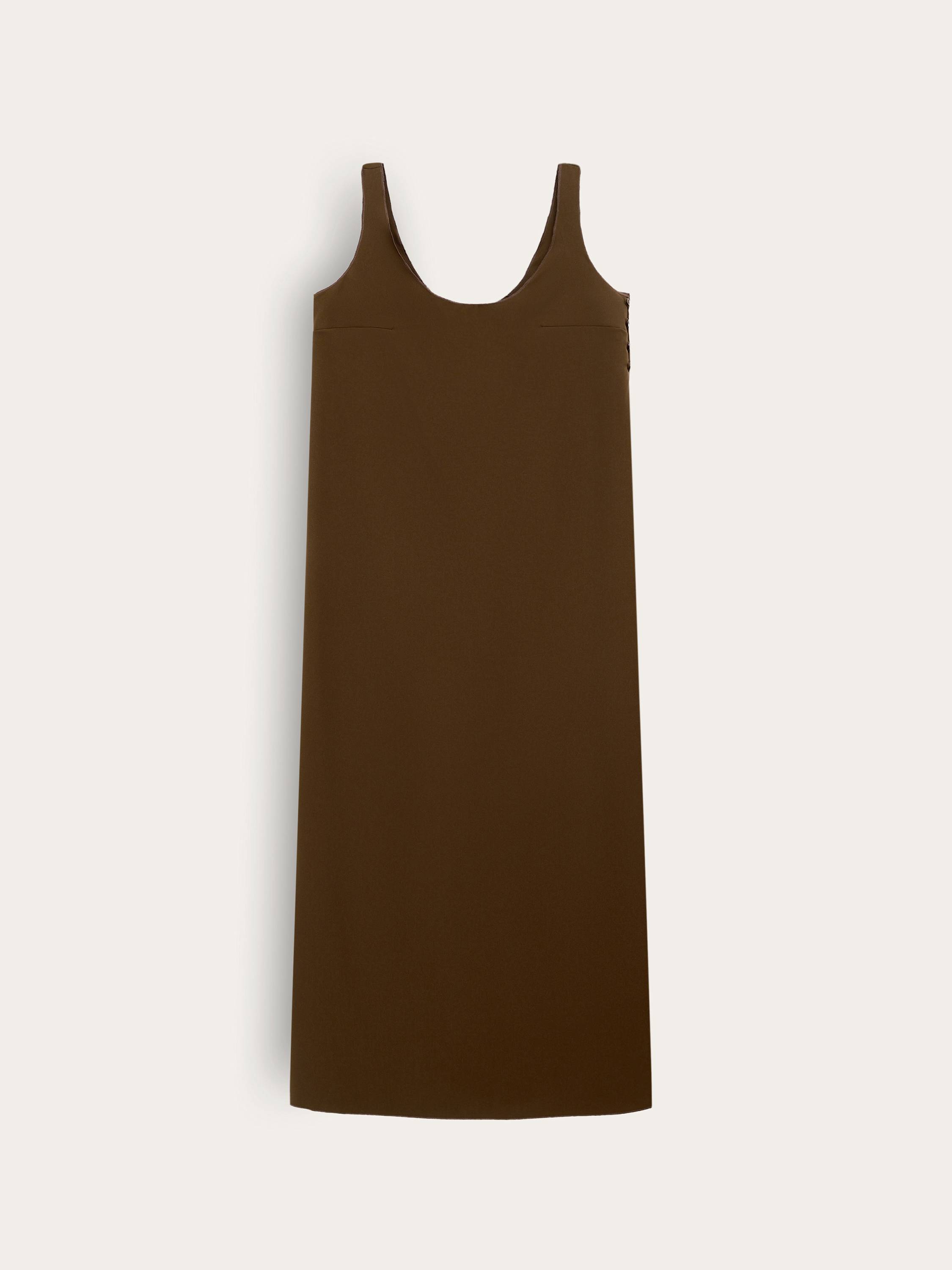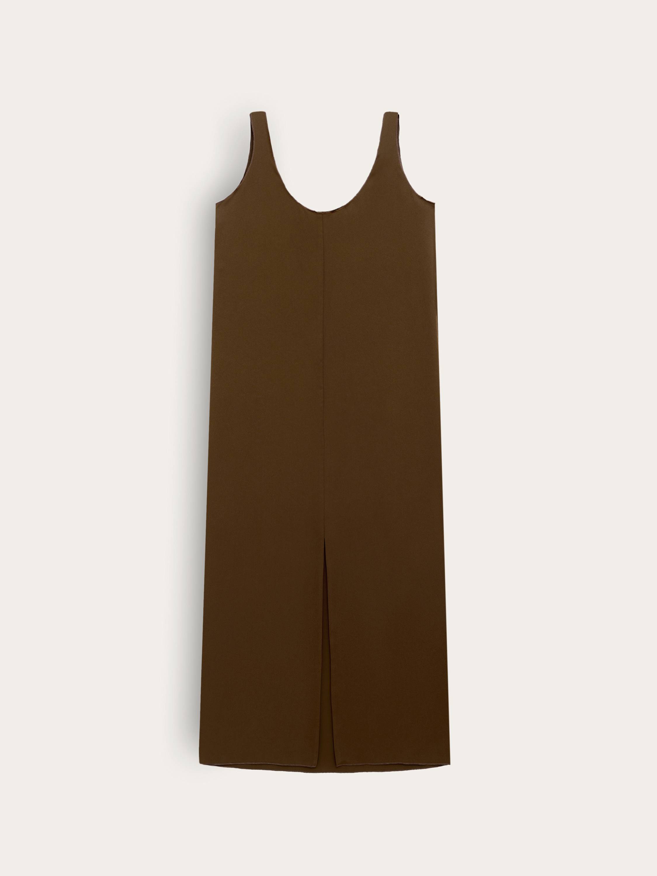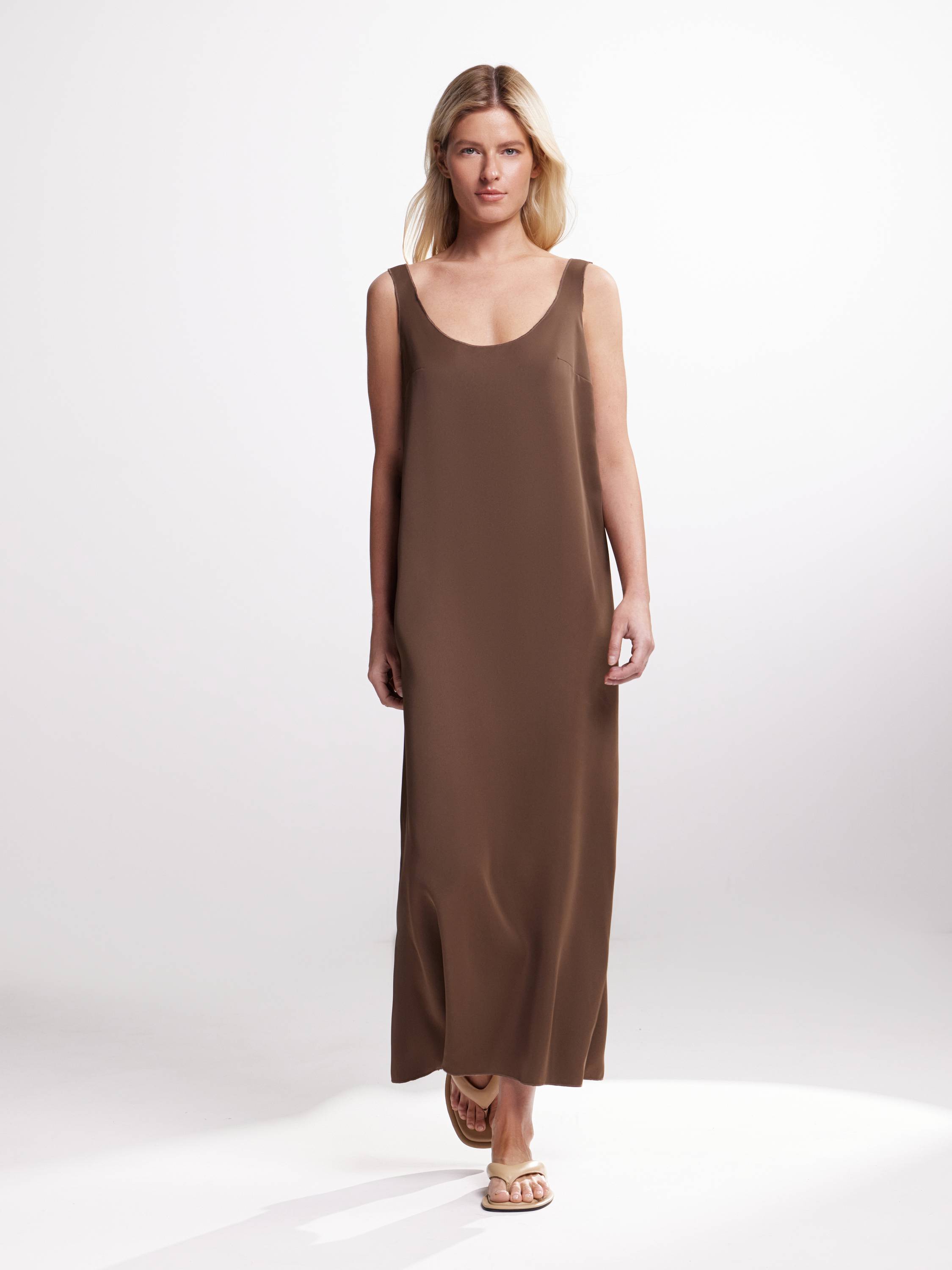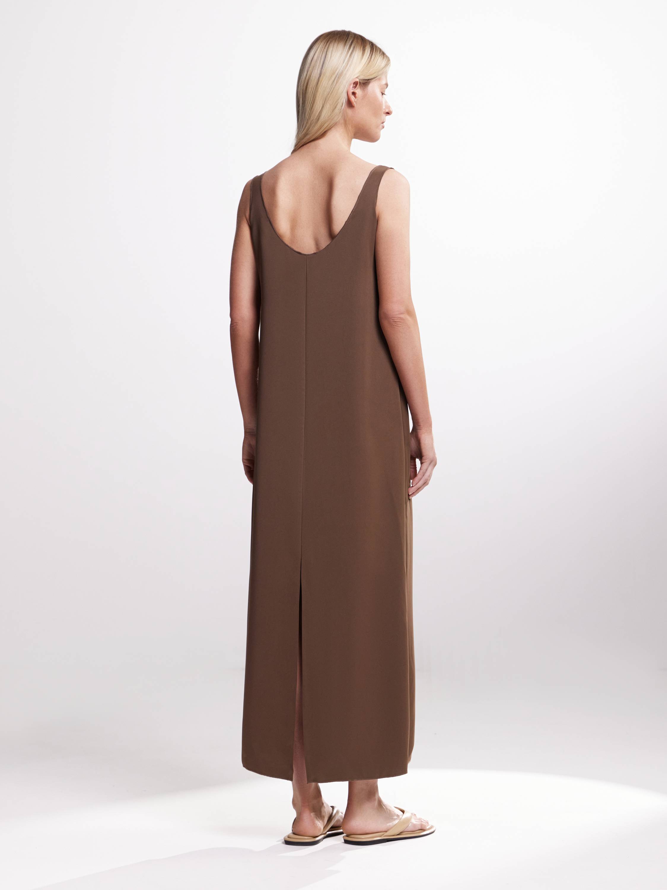 Платье прямого кроя в длине макси — про лаконичность, мягкую геометрию и пластичную архитектуру образа. Модель выполнена из струящегося, приятного на ощупь материала, который легко драпируется и красиво движется при ходьбе. Широкие бретели, глубокий вырез спереди и на спине, а также высокий разрез сзади создают продуманную, но не нарочитую выразительность. Гладкая поверхность ткани подчеркивает цвет — благородный кофейный, теплый и глубокий, идеально подходящий для летнего города и отпуска. Такое платье легко адаптируется под любой сценарий: днем — с сандалиями и шопером, вечером — с акцентными украшениями и легким жакетом.