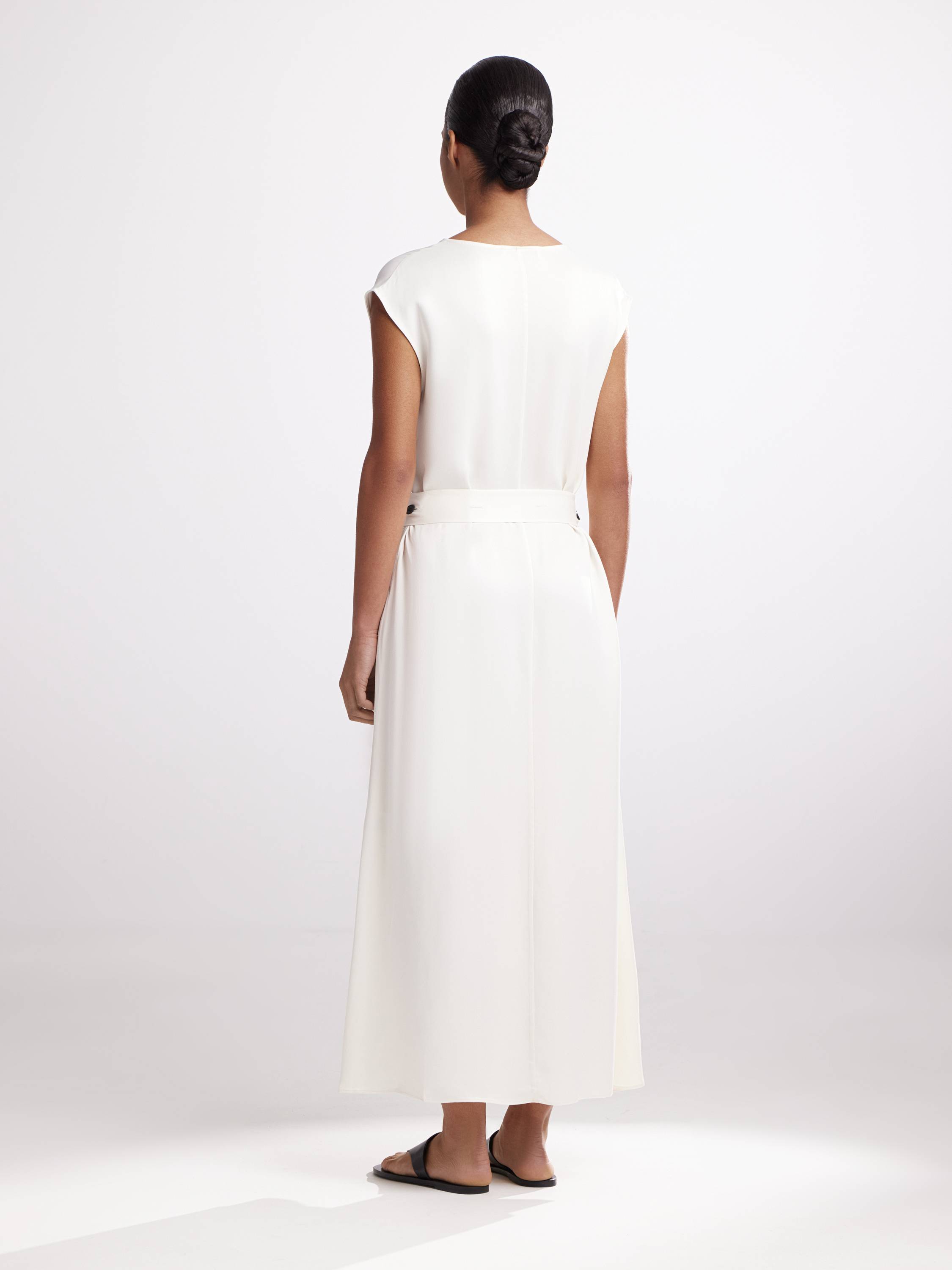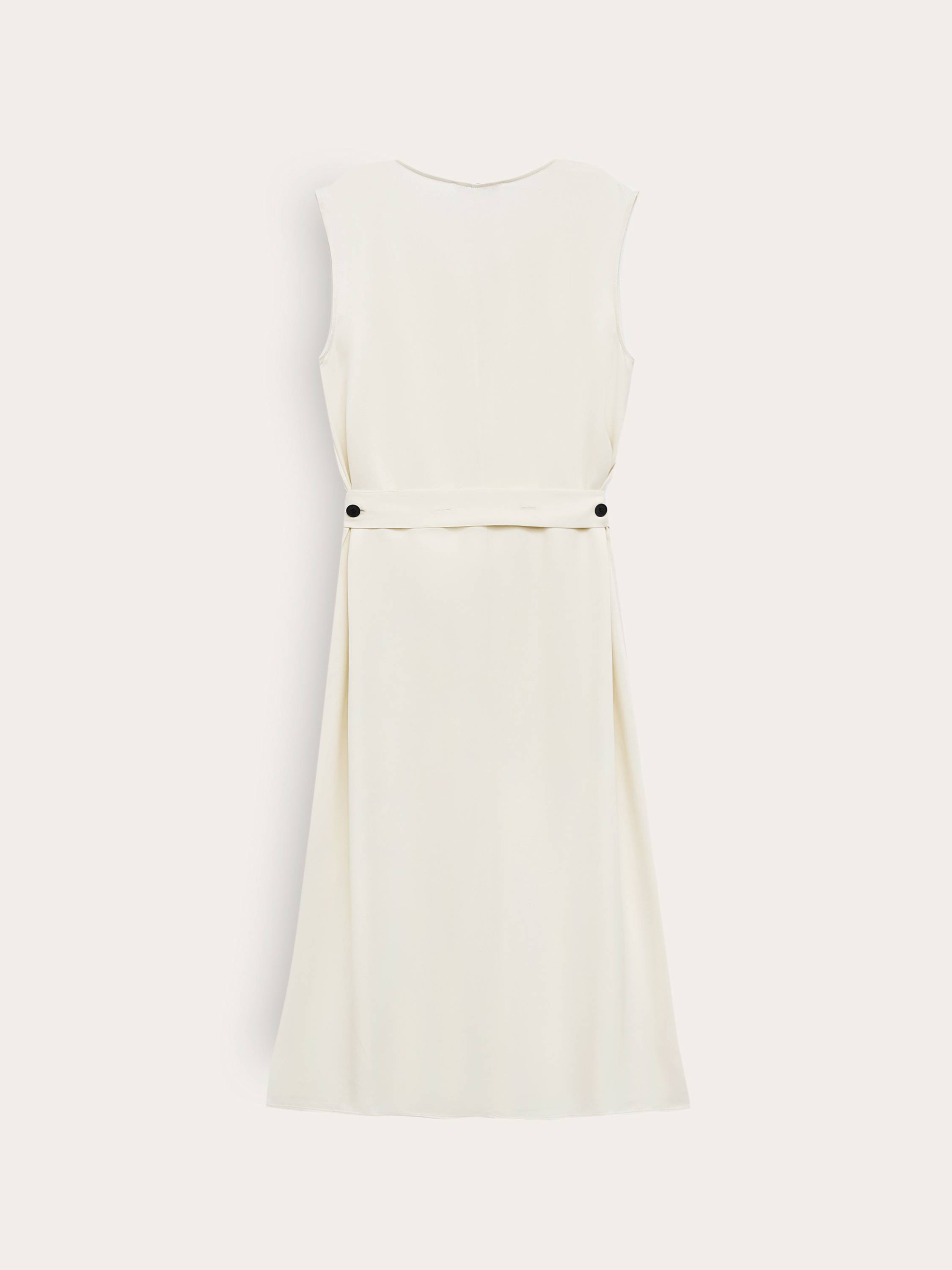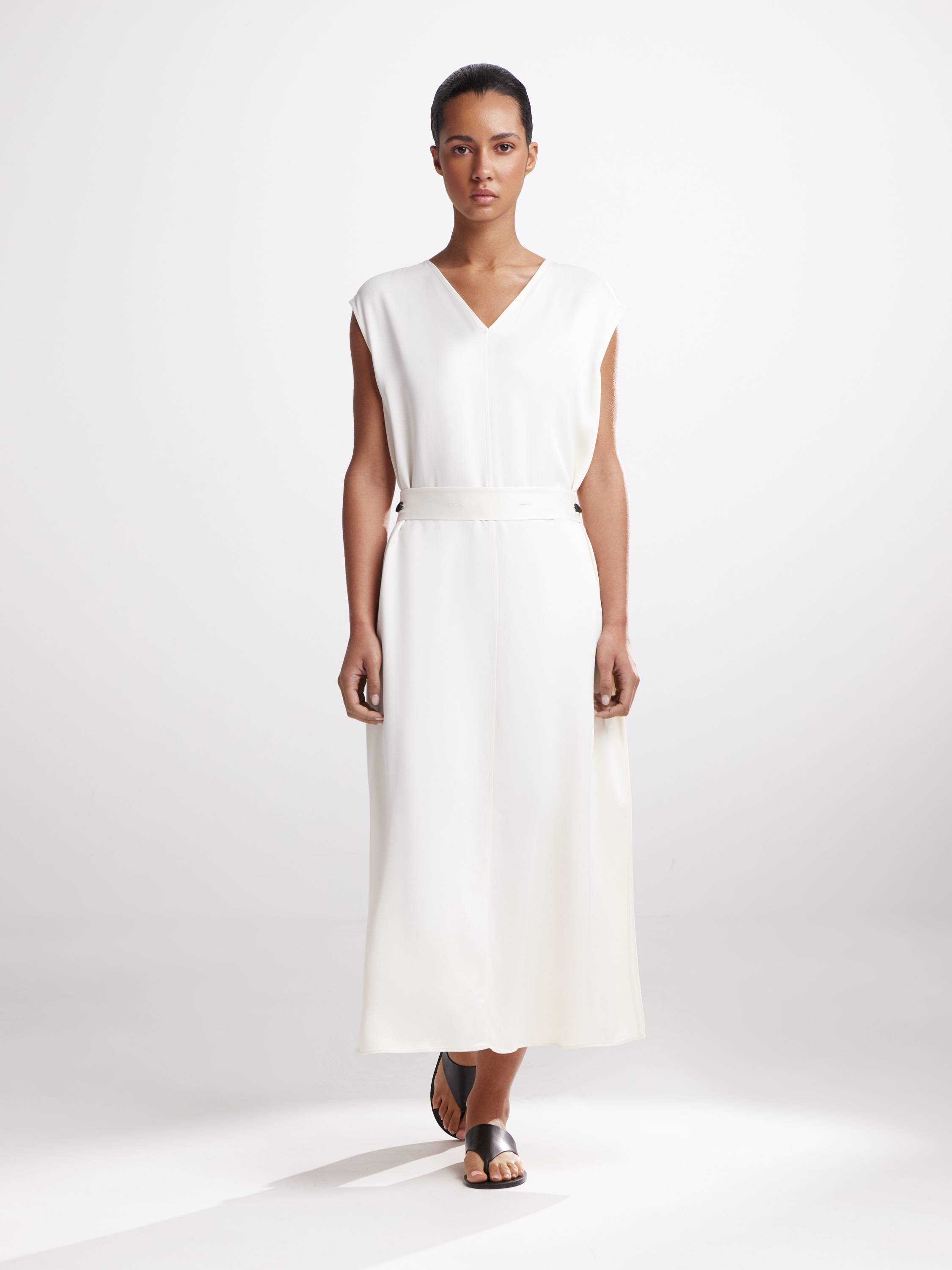Платье миди с V-образным вырезом и поясом на пуговицах — чистый силуэт, собранный из линий и света. Широкие проймы и мягкая посадка по плечам создают расслабленную структуру, а пояс подчеркивает талию, не нарушая ощущение свободы. Материал из района пластично драпируется, оставляя за собой легкий шлейф движения. Четкость выреза уравновешивается округлостью форм, а минимализм кроя позволяет носить это платье в самых разных настроениях — от сдержанной элегантности до артистичной непринужденности. Сочетайте с плоскими сандалиями, кожаными аксессуарами или акцентными украшениями — и позволяйте детали звучать в своем темпе.