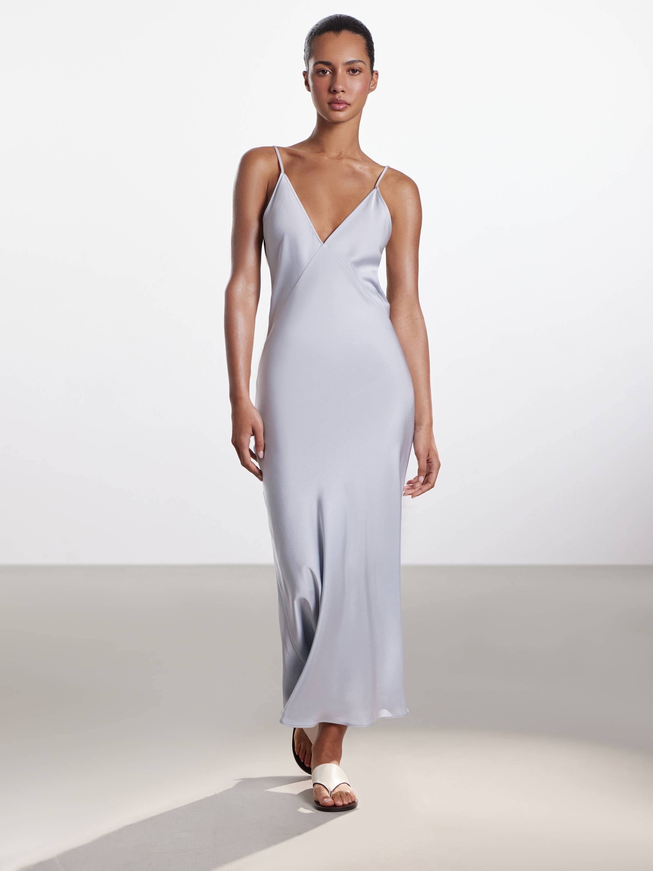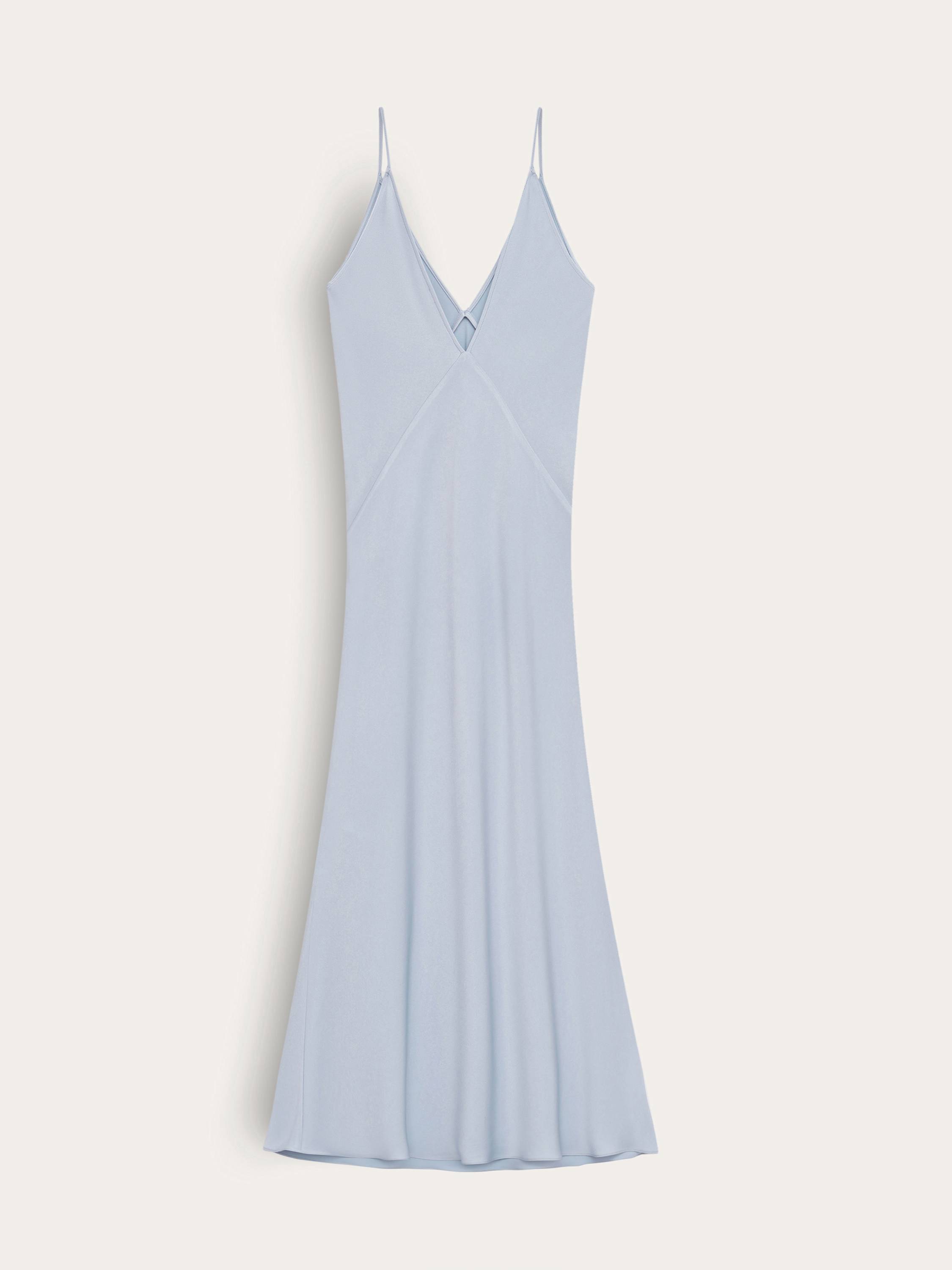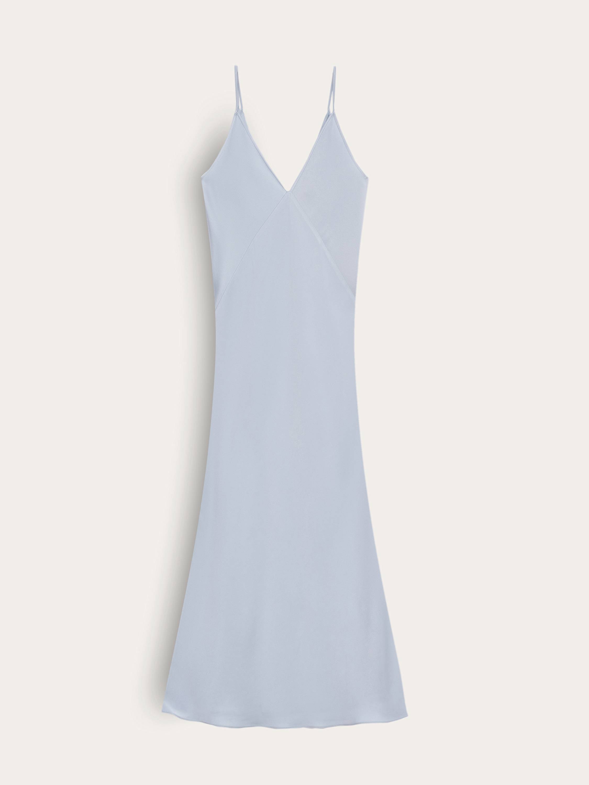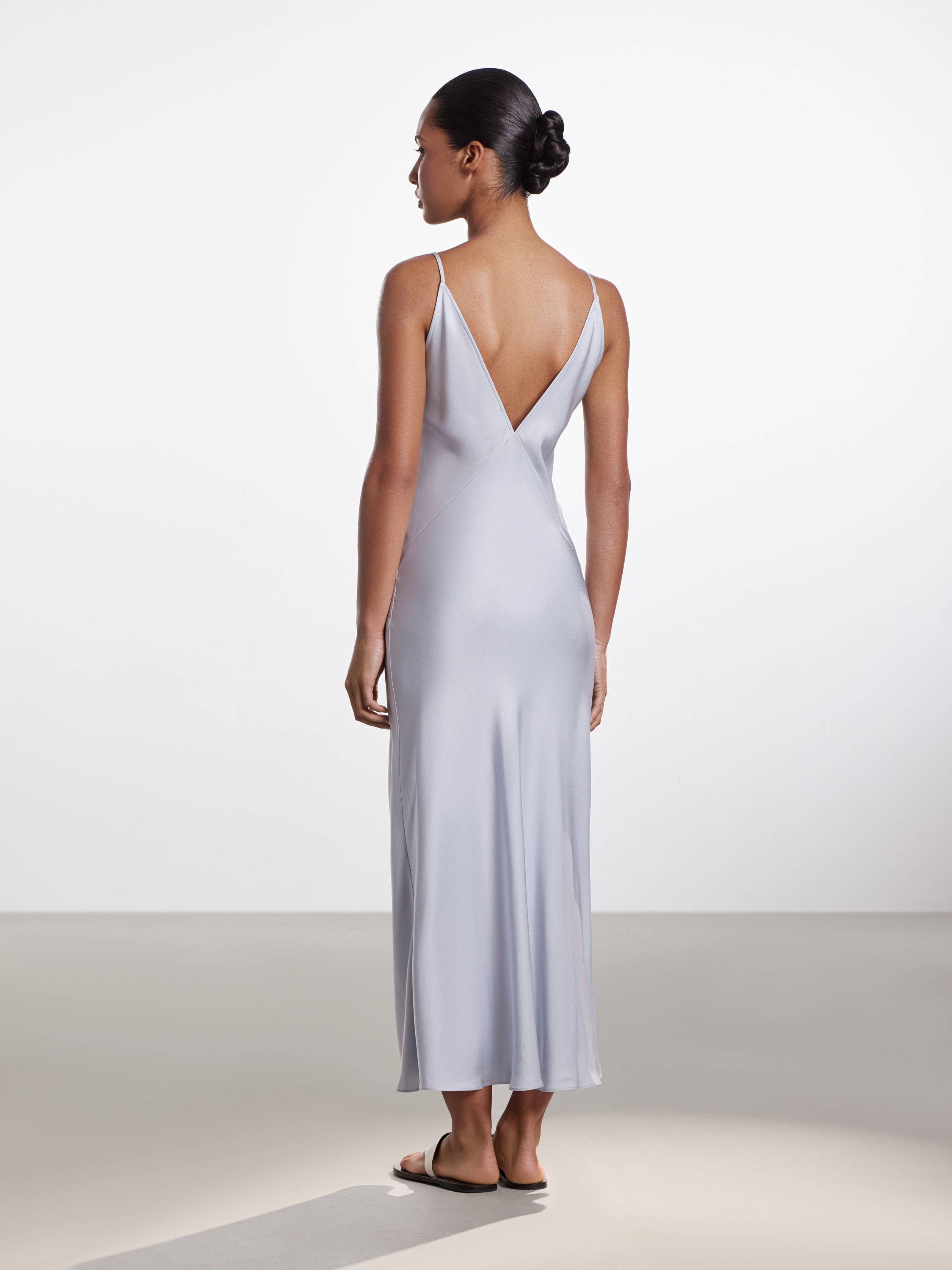Платье-комбинация из ацетатного полотна — модель, в которой каждое движение приобретает плавность и световой акцент. Легкий, струящийся материал с мягким блеском подчеркивает изогнутые линии тела, а минималистичный крой словно растворяется на коже. V-образный вырез спереди и сзади создает эффект удлиненного силуэта и придает образу чувственную легкость без излишней откровенности. Тонкие бретели оставляют пространство для многослойности или подчеркивают открытость летнего образа. Это платье — как отражение раннего рассвета на воде: тихое, гладкое и запоминающееся. Идеально для вечеров, когда хочется не говорить — а звучать.