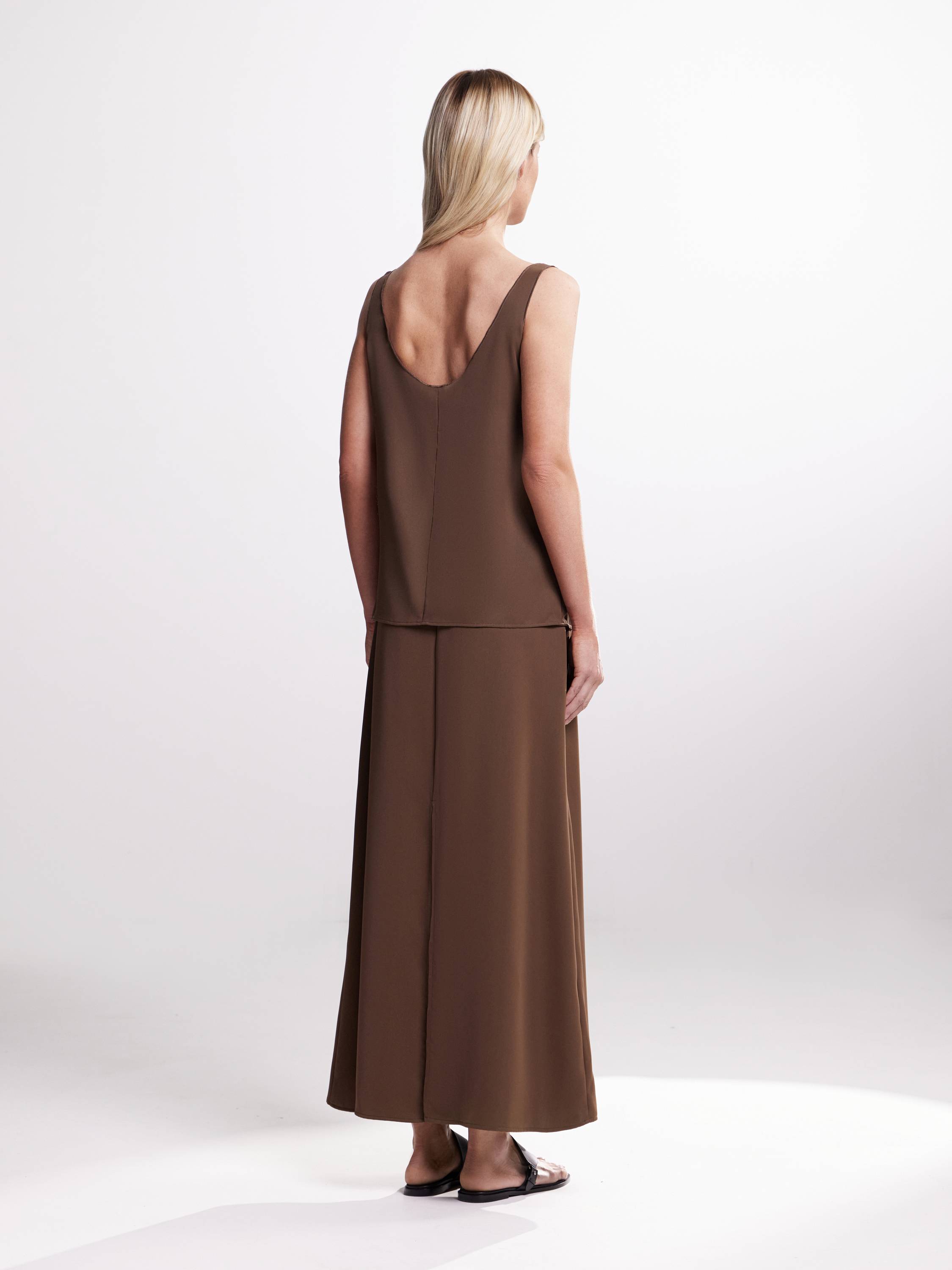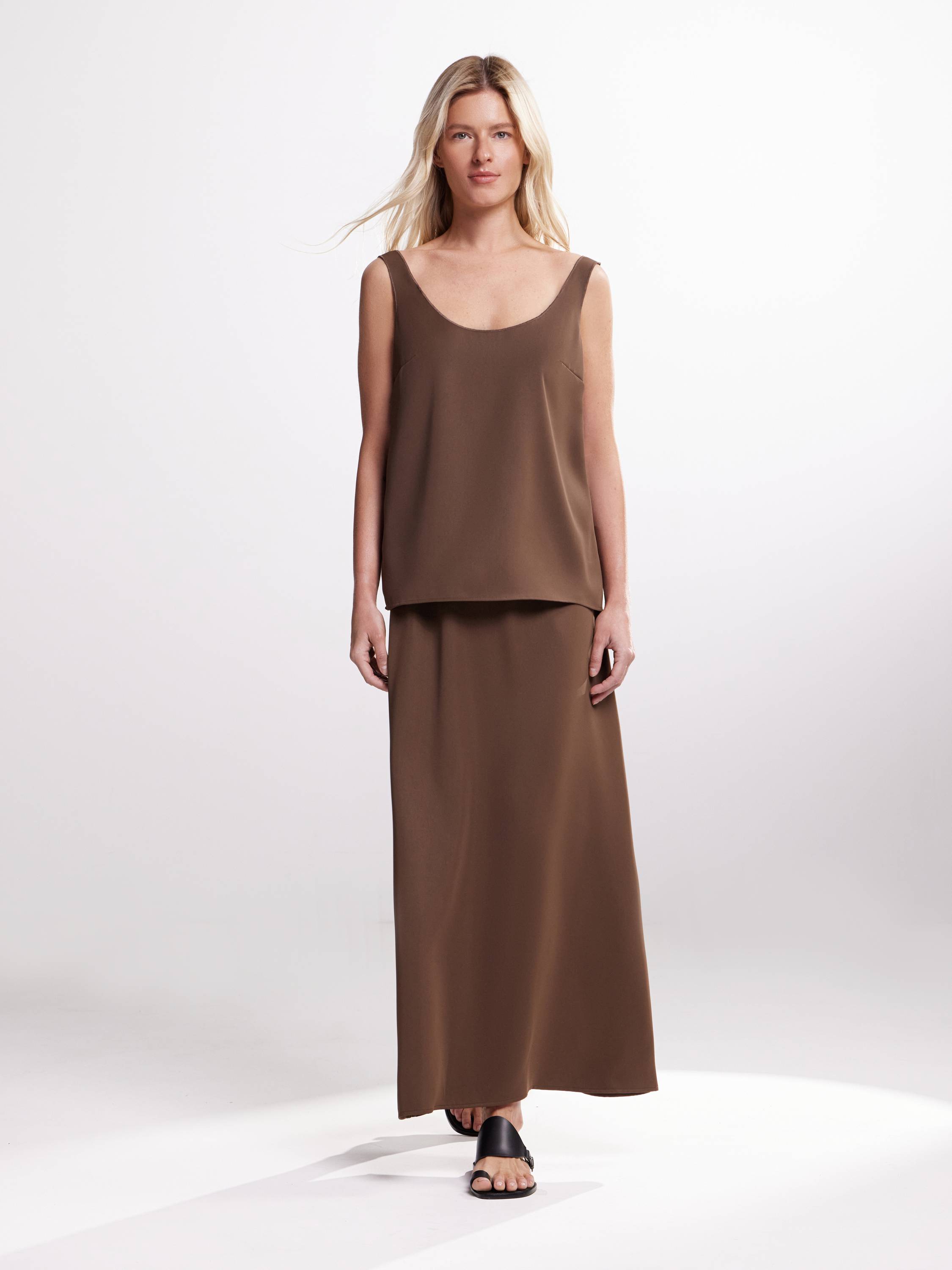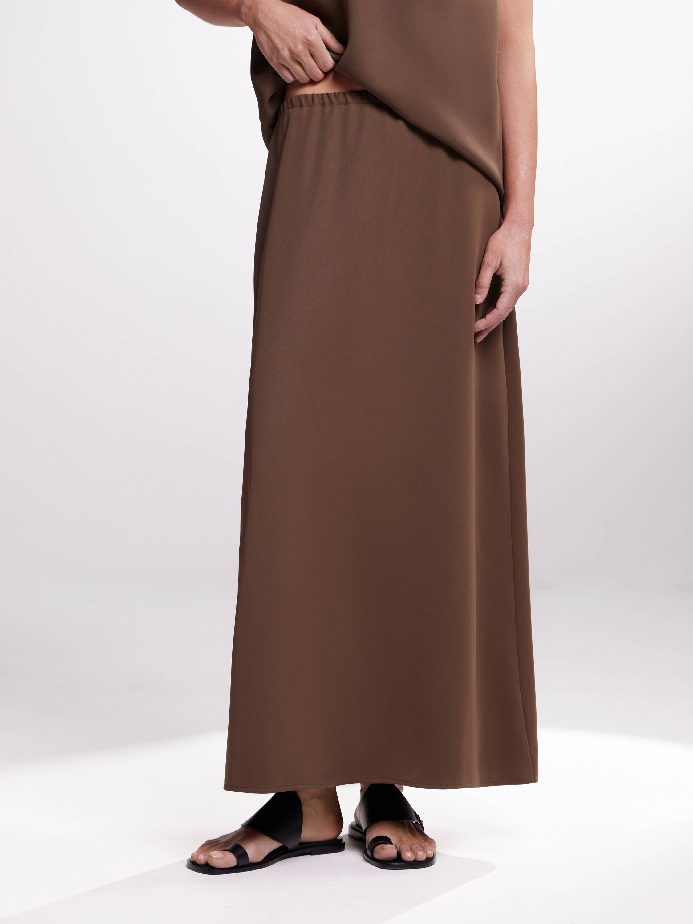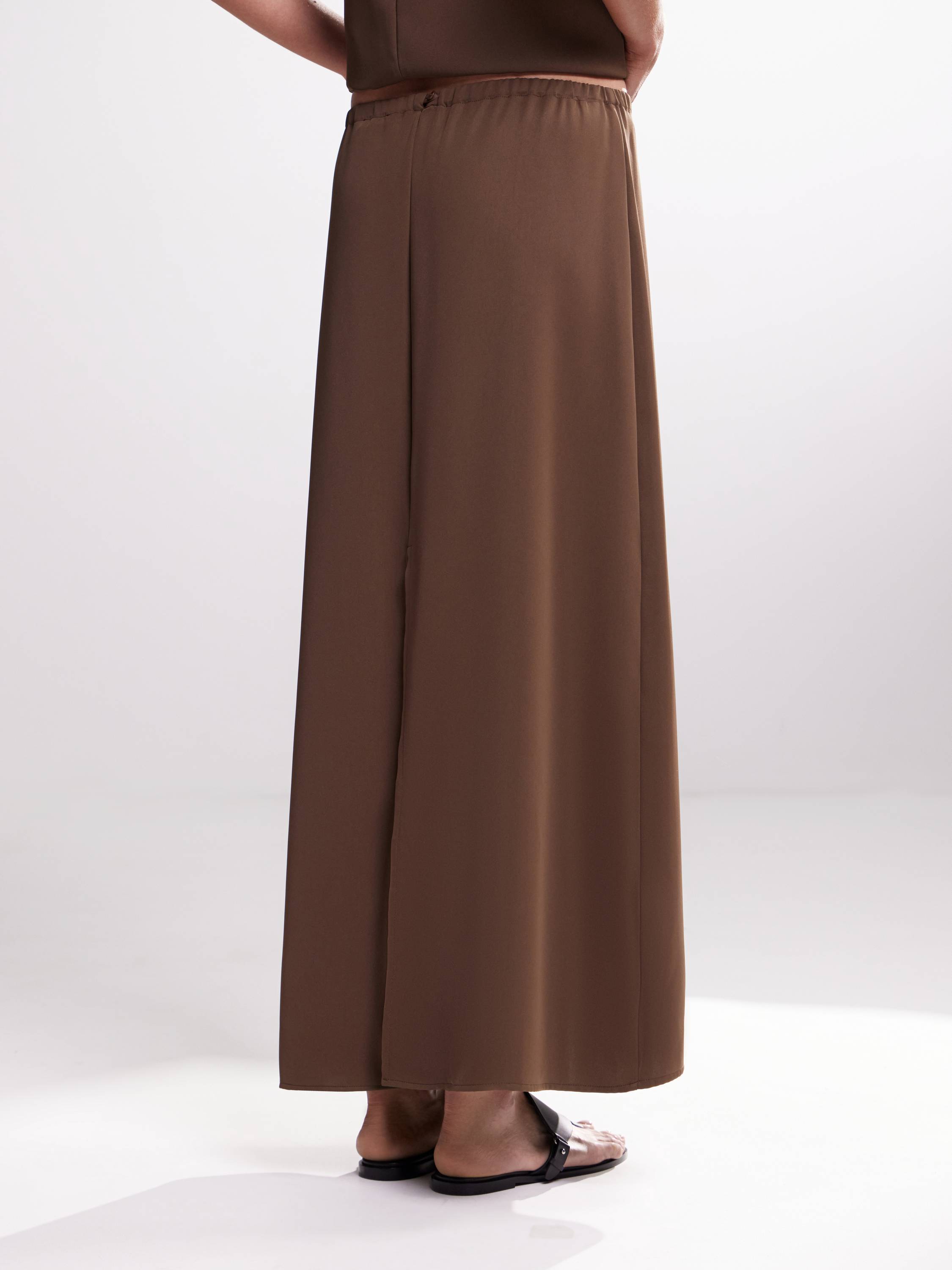 Юбка макси лаконичного кроя, выполненная из струящейся, плотной ткани с матовым отливом. Модель с мягкой посадкой на талии — за счет минималистичной застежки на пуговицу пояс не перетягивает, но надежно фиксирует силуэт. Плавная линия кроя подчеркивает вертикаль и создает ощущение длины. Нейтральный оттенок усиливает универсальность модели — она легко впишется в повседневные образы и минималистичные монохромы. Сочетайте с топами из того же материала для расслабленного total look или добавляйте рубашки, трикотаж и объемные жакеты в тон.