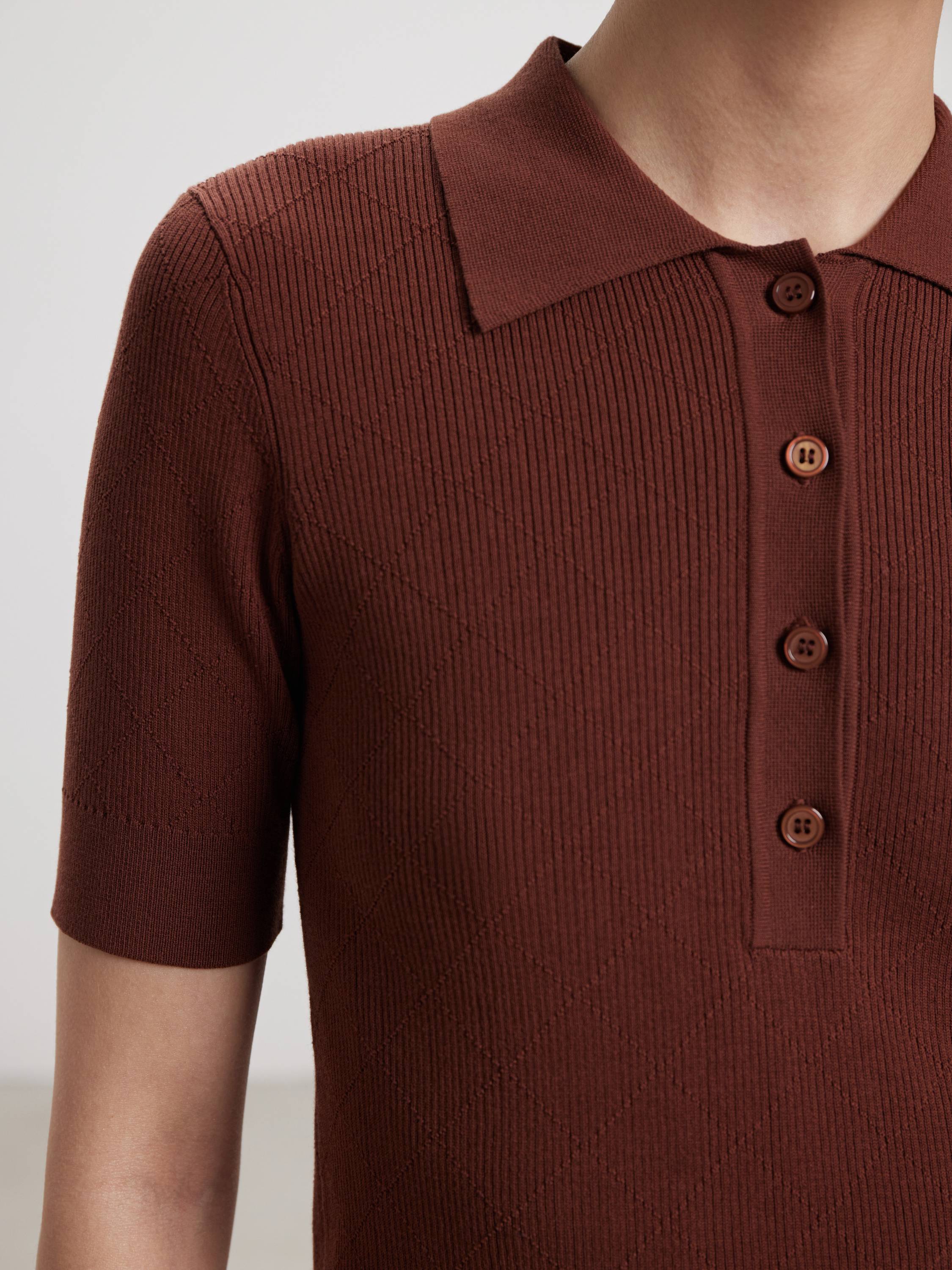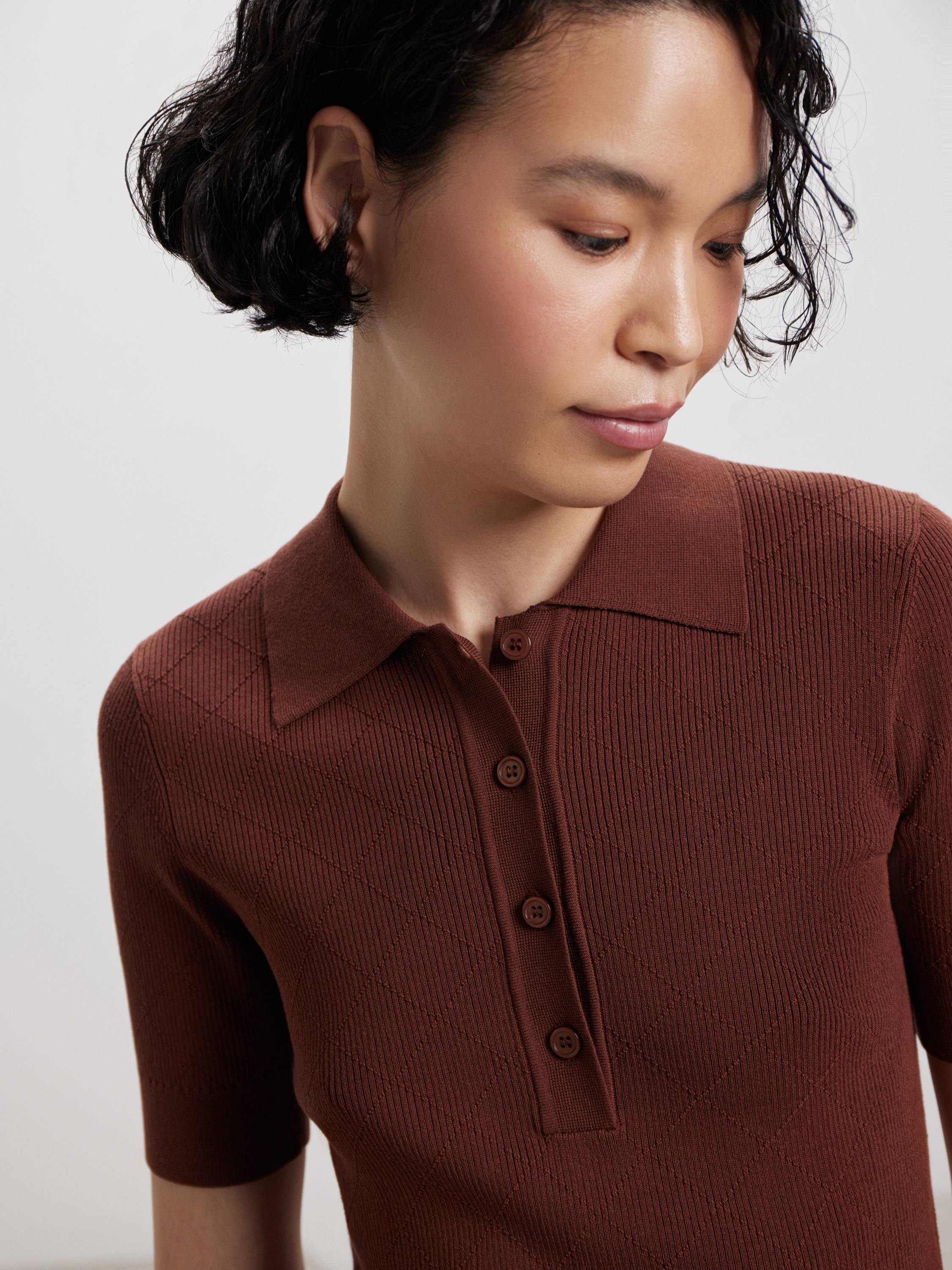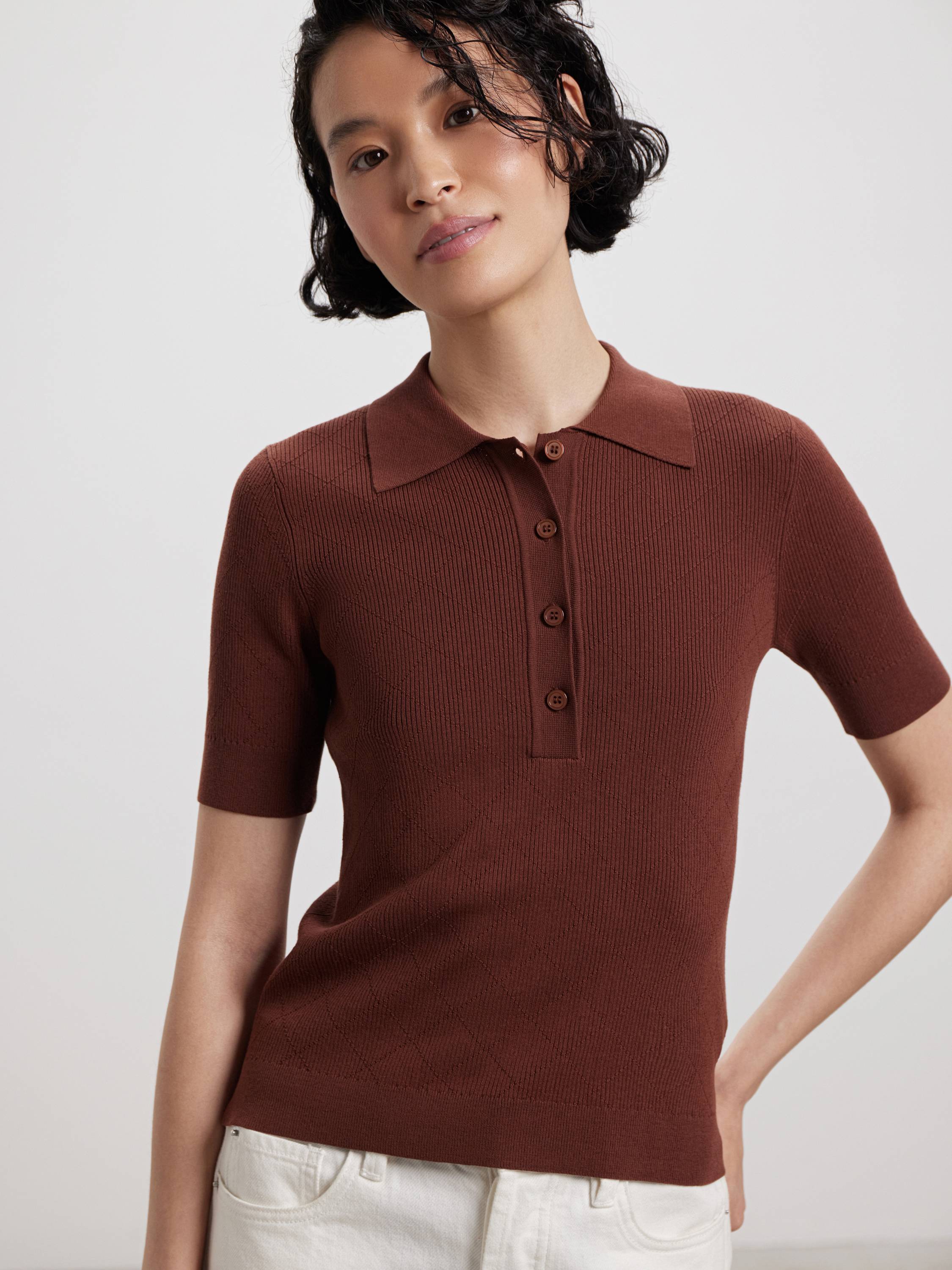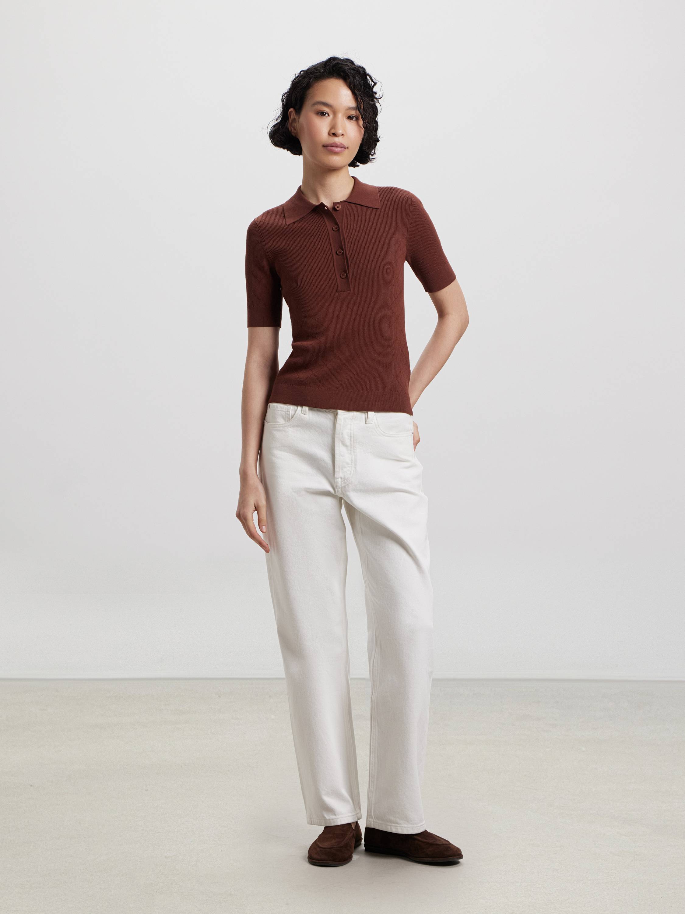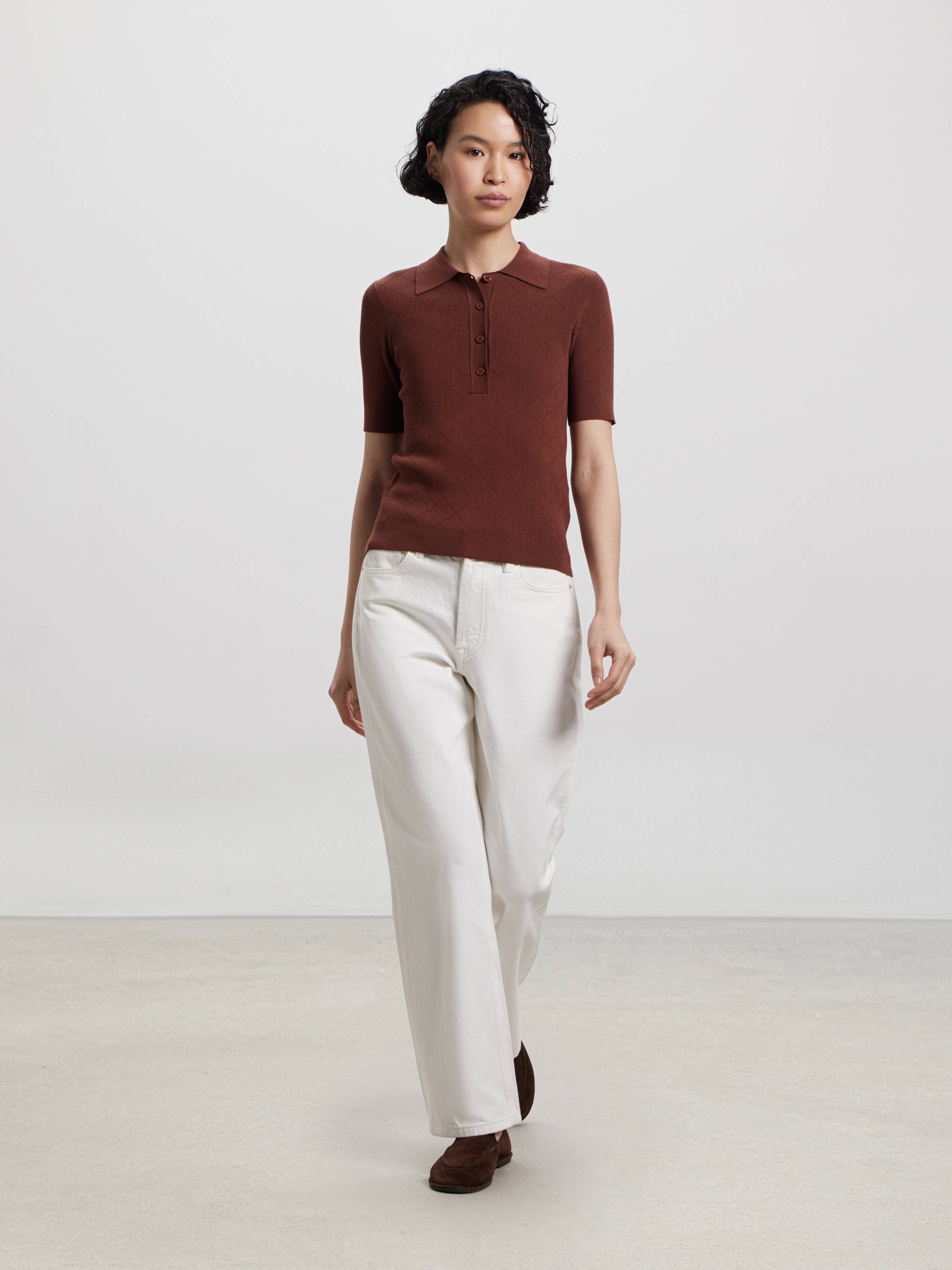 Трикотажное поло из смесового хлопка — модель с деликатной текстурой и выверенной геометрией. Полотно сочетает мягкость хлопка и шелковистость модала: оно комфортно прилегает к телу, дышит и сохраняет аккуратный вид в течение дня. Приталенный силуэт подчеркивает фигуру, а рельефная вязка в диагональную клетку добавляет объема и фактурности. Отложной воротник и планка на пяти пуговицах поддерживают архитектуру образа. Представлено в двух оттенках — мягком молочном и теплом пряном — для спокойных, продуманных сочетаний в городе и на отдыхе.