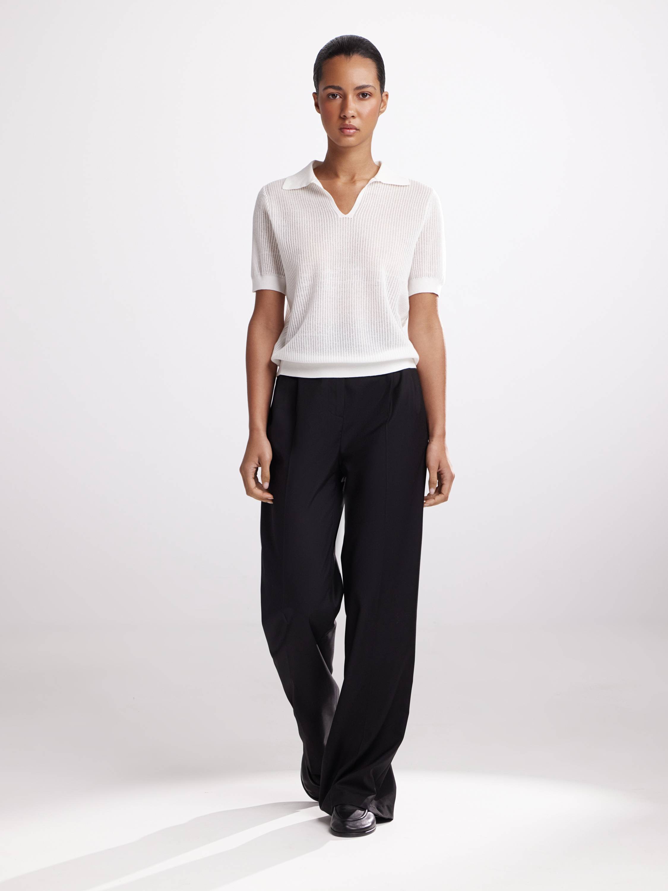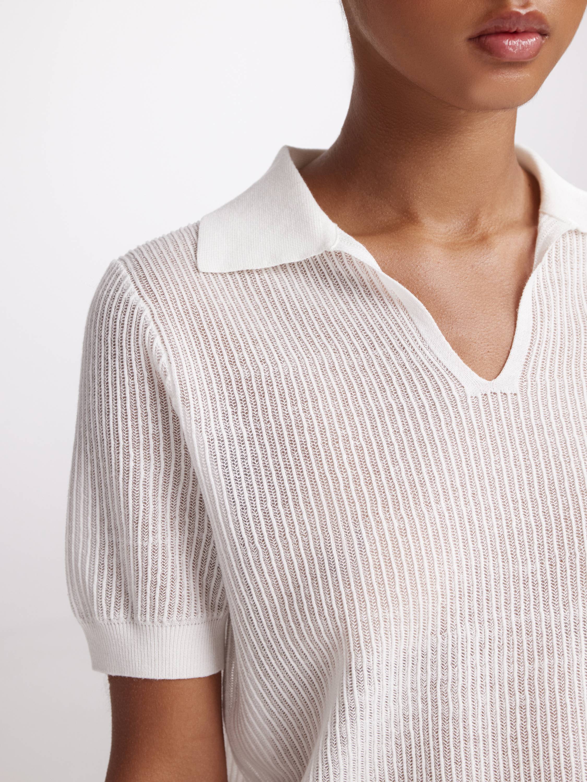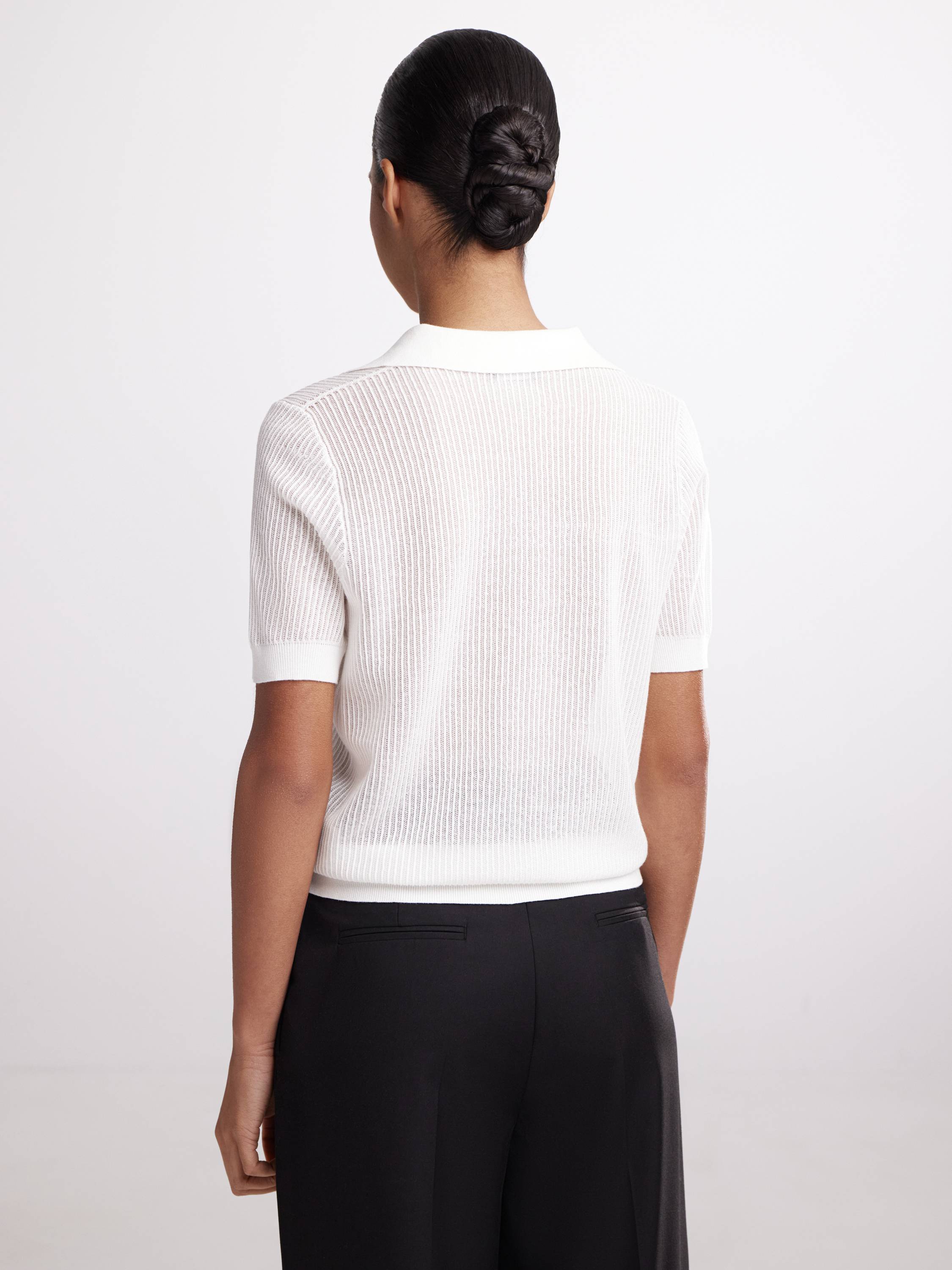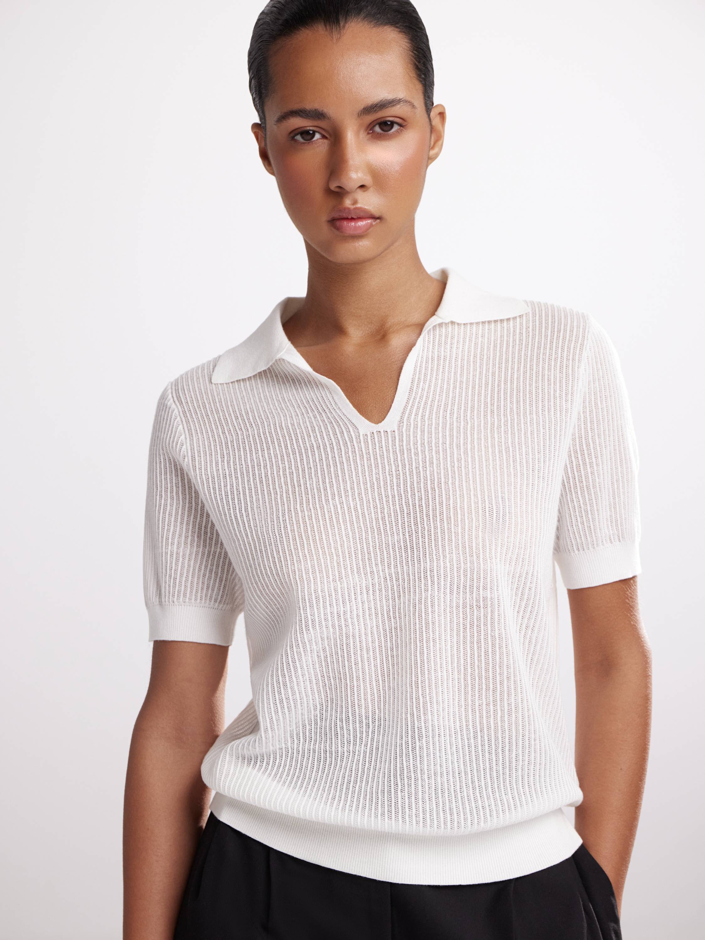 Трикотажное поло прямого силуэта в эстетике утонченного минимализма, выполненное из тонкой смесовой пряжи с добавлением льна. Лиоцелл придает полотну шелковистость и мягкость, лен отвечает за ощущение прохлады и натуральную фактуру. Вертикальная структурная вязка визуально вытягивает линию силуэта и подчеркивает изящество формы. Аккуратный отложной воротник и V-образный вырез создают чистый, современный образ с нотками непринужденной элегантности. Модель комфортна в носке, дышит и сохраняет эстетичность даже в жаркую погоду. Идеальна для летних сочетаний с брюками, юбками или денимом.
