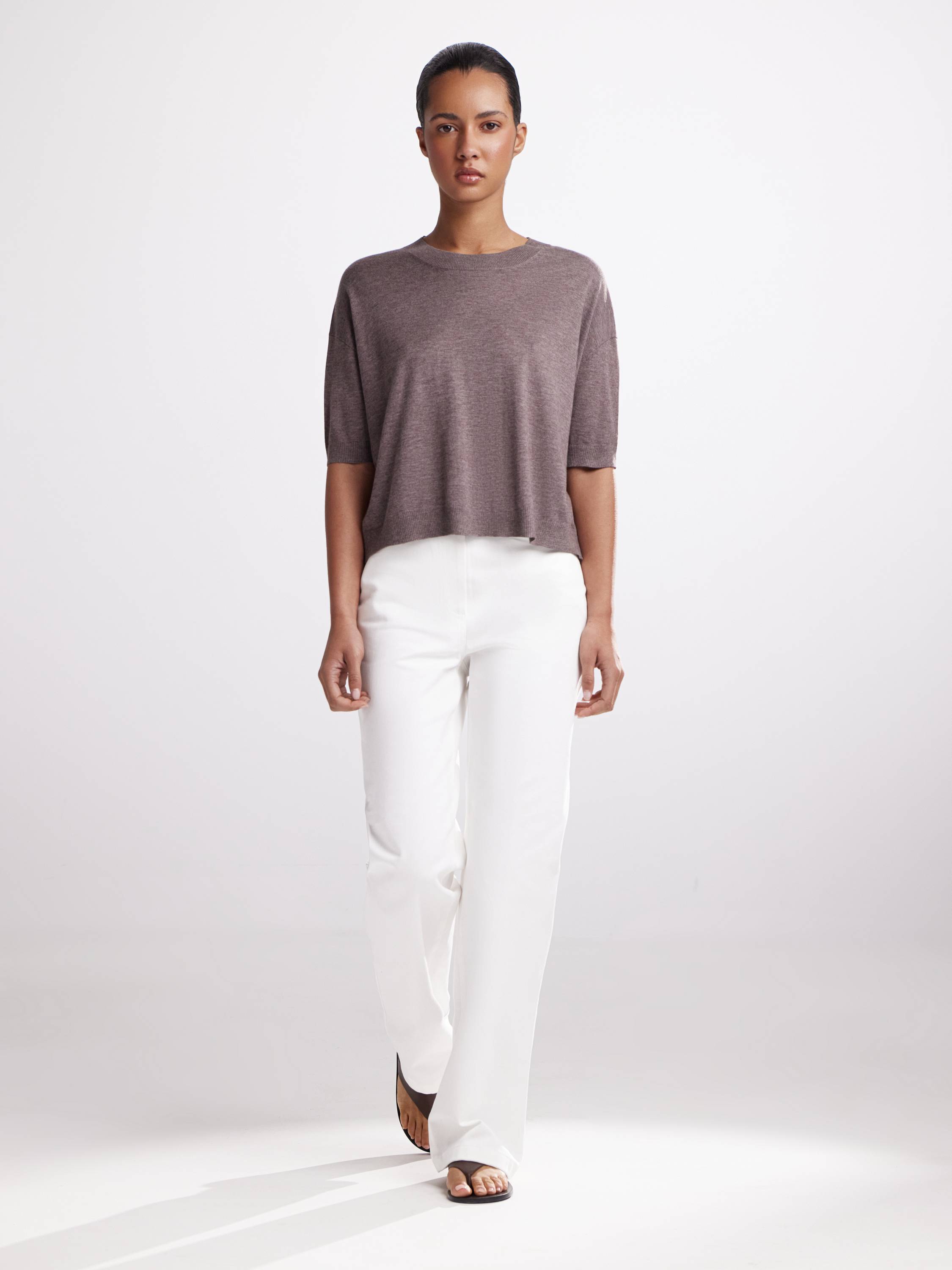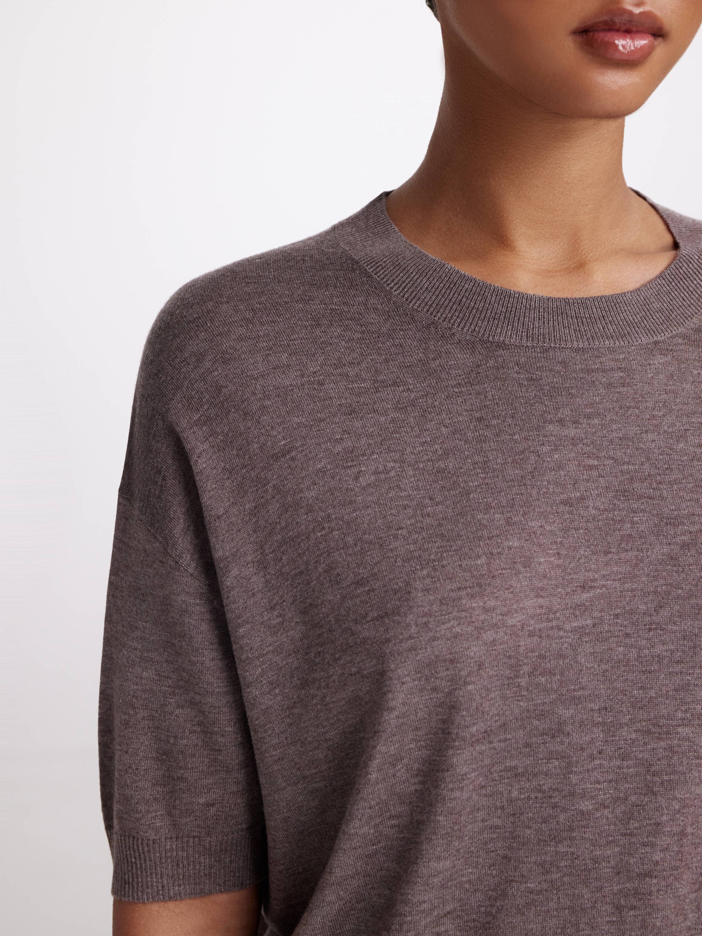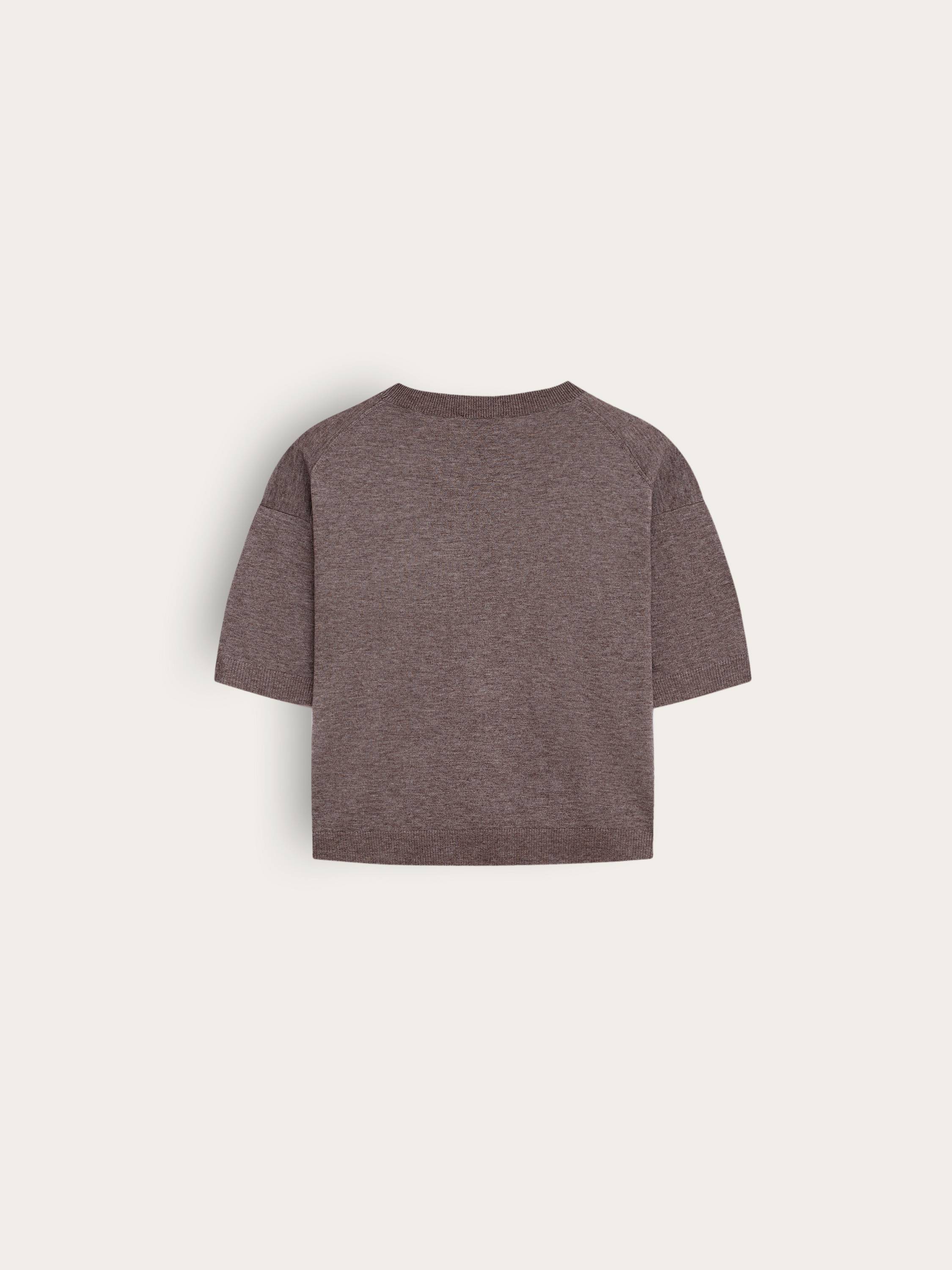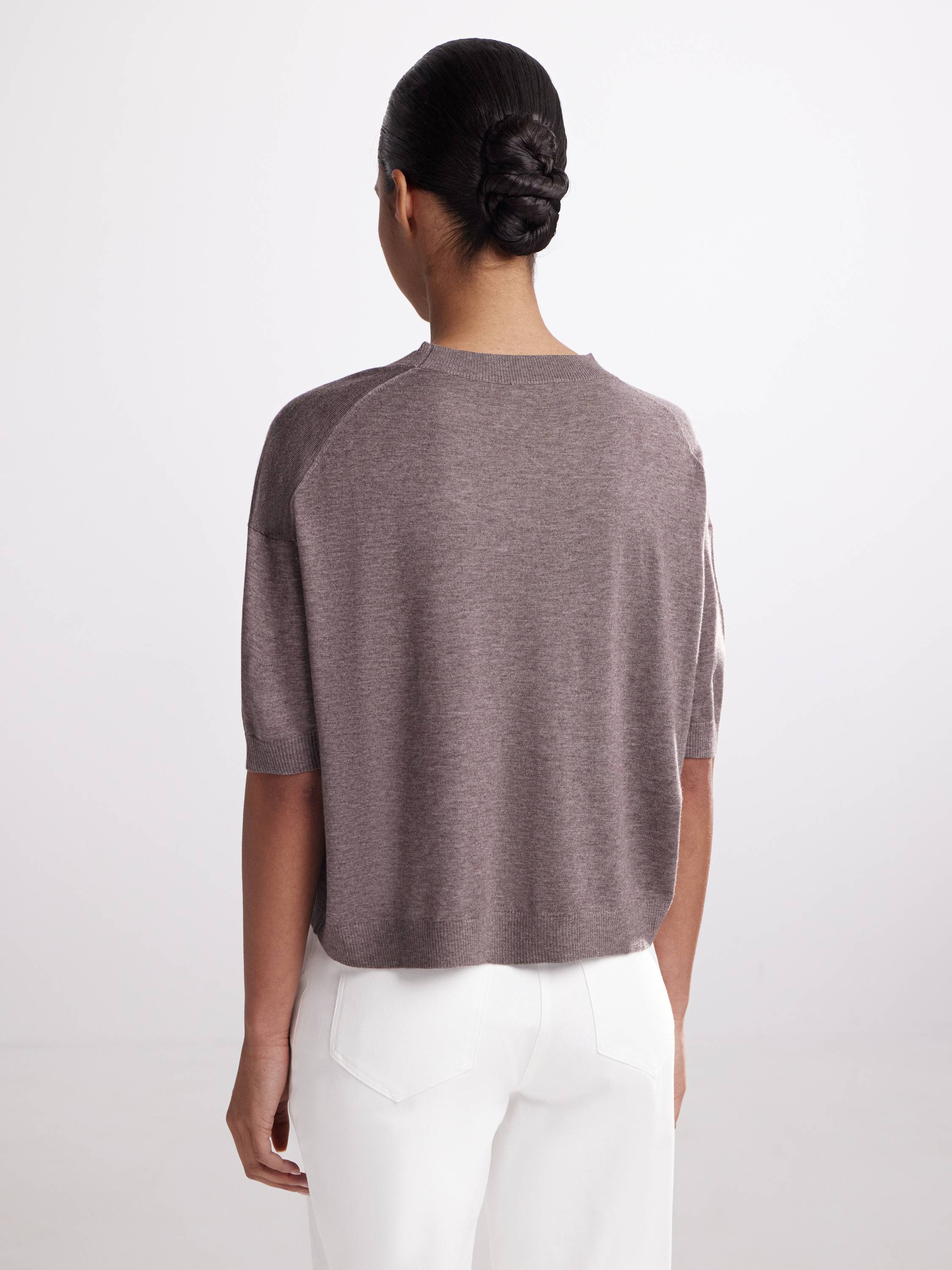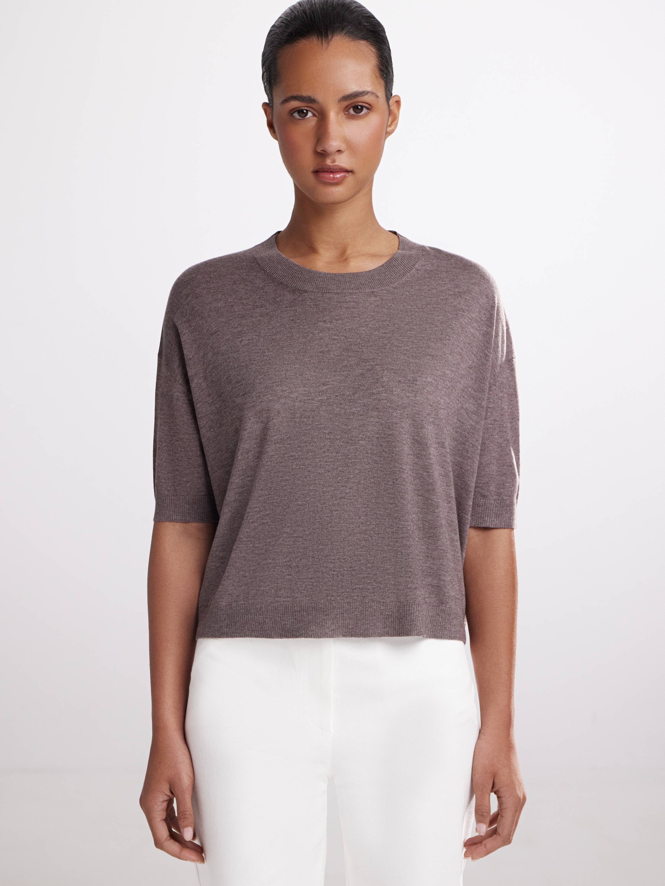Трикотажная блузка из смесового материала с добавлением шерсти — универсальная модель в эстетике расслабленного минимализма. Мягкое полотно комфортно прилегает к телу, обеспечивая оптимальный температурный баланс и приятные тактильные ощущения. За счет плотной, но эластичной вязки изделие держит форму, не теряя при этом легкости. Свободный крой со спущенной линией плеч и короткими рукавами создает расслабленный силуэт, а широкие манжеты и ворот с резинкой придают образу завершенность. Два оттенка на выбор — айвори и молочный шоколад, — легко вписываются в базовый гардероб и подчеркивают фактуру ткани.