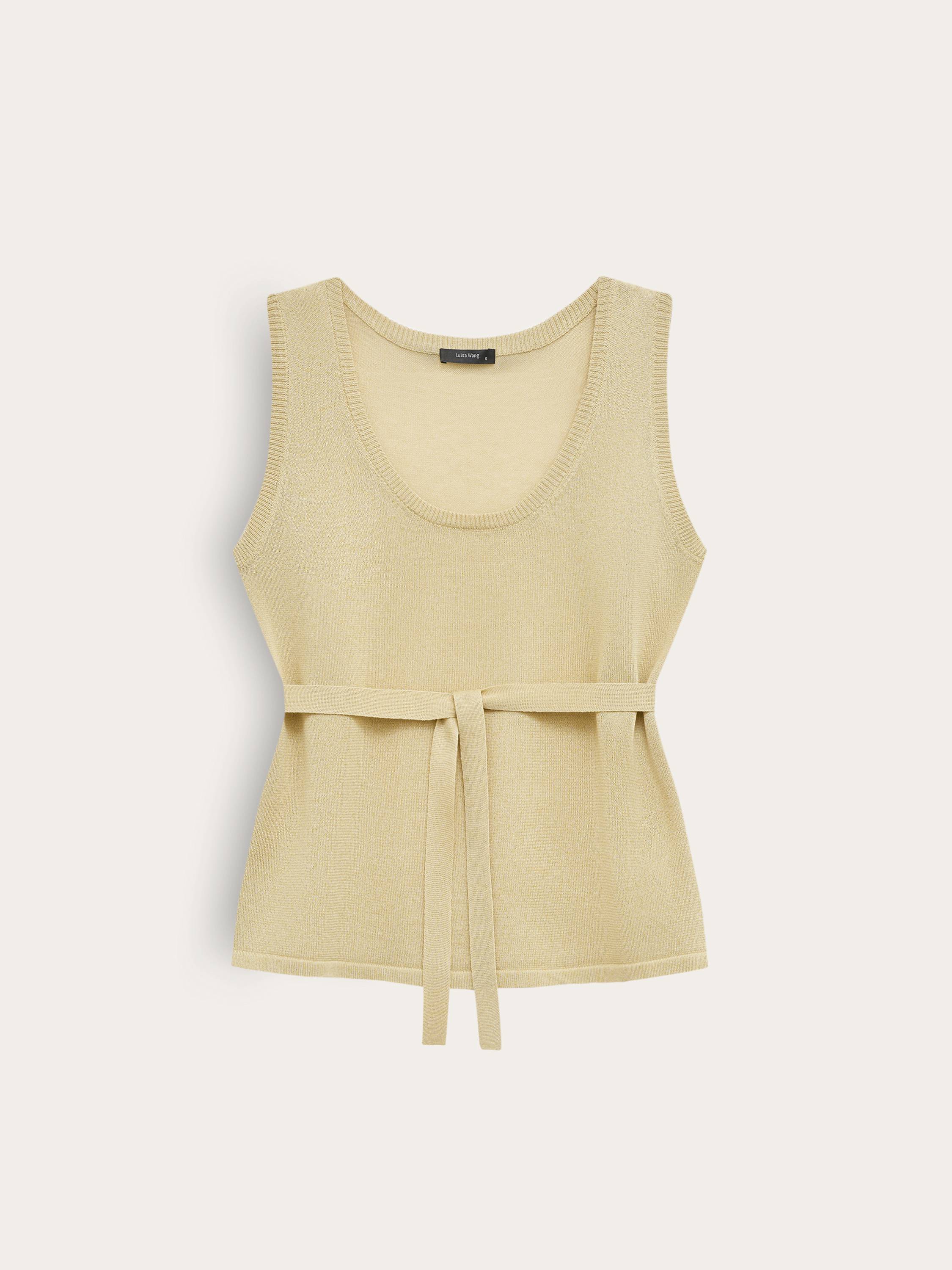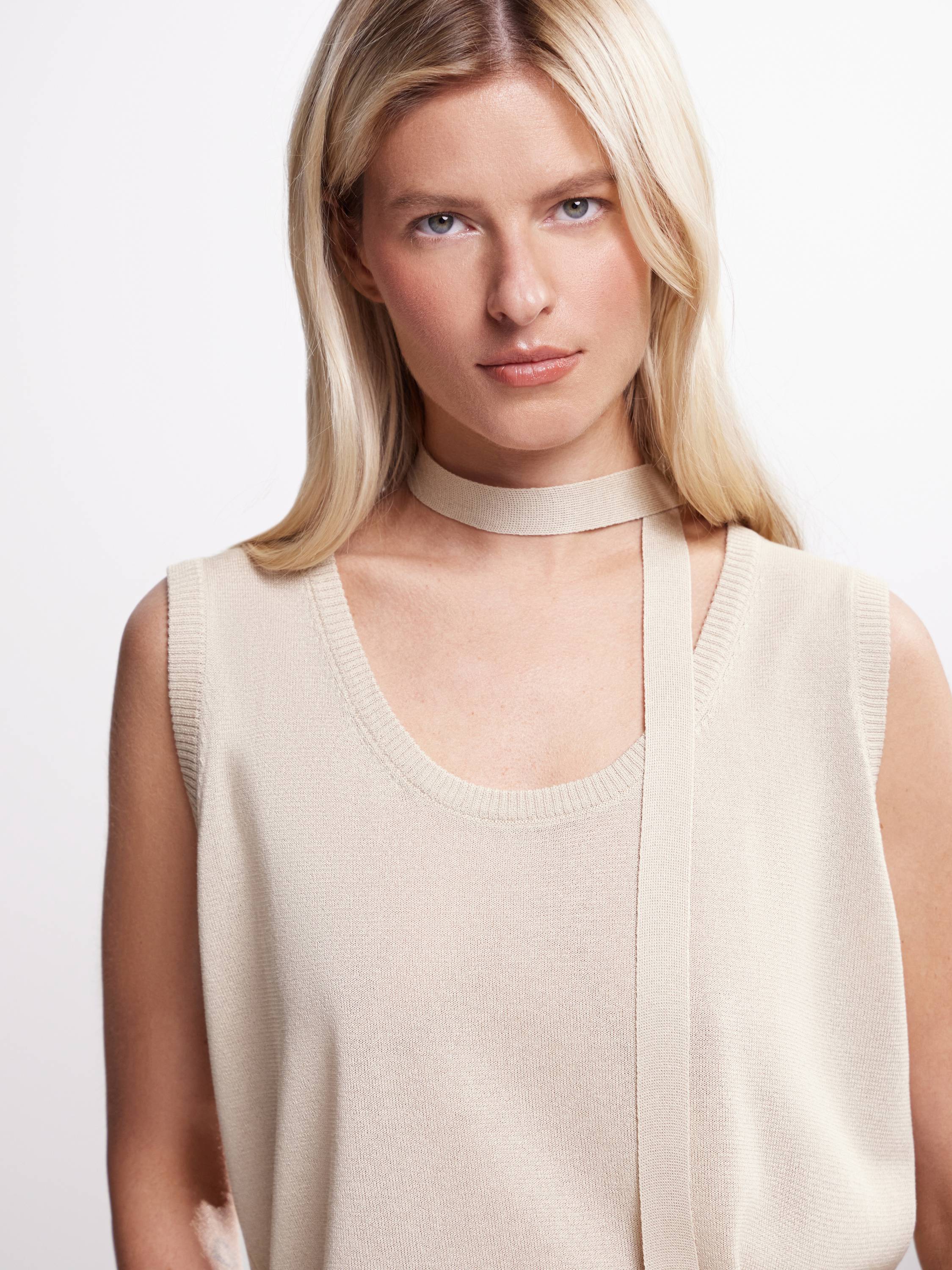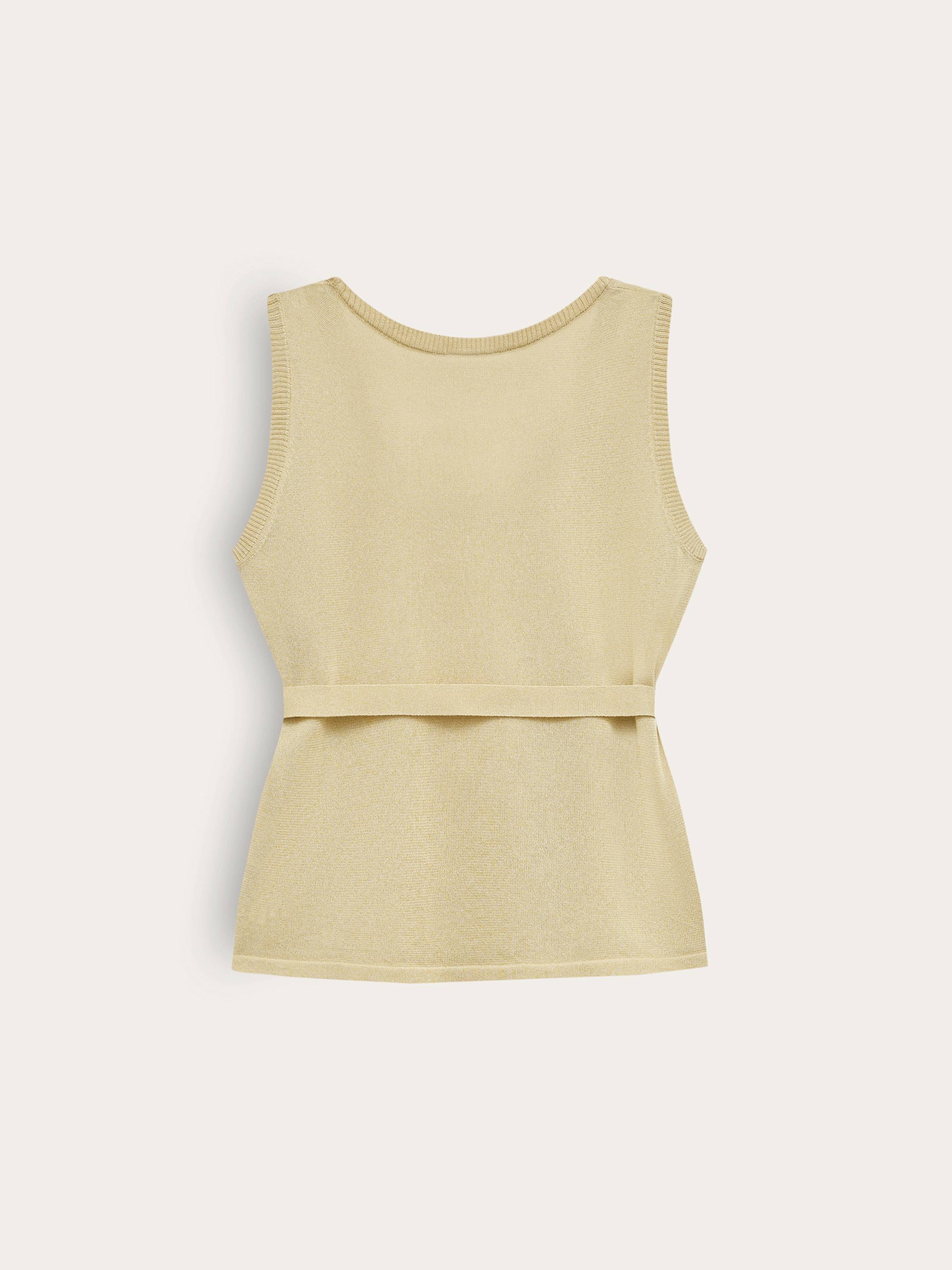 Топ из мягкой вискозной пряжи с выразительной деталью — длинным поясом, который можно обернуть вокруг шеи, завязать на талии или оставить свободно ниспадающим. Пластичное полотно комфортно прилегает к телу, подчеркивая чистоту формы и позволяя по-разному интерпретировать силуэт. Глубокий округлый вырез визуально вытягивает линию шеи, а проймы без рукавов придают образу легкость. Модель представлена в двух оттенках: трендовом butter yellow и теплом коричневом — оба работают на сложную, но естественную палитру летнего гардероба.