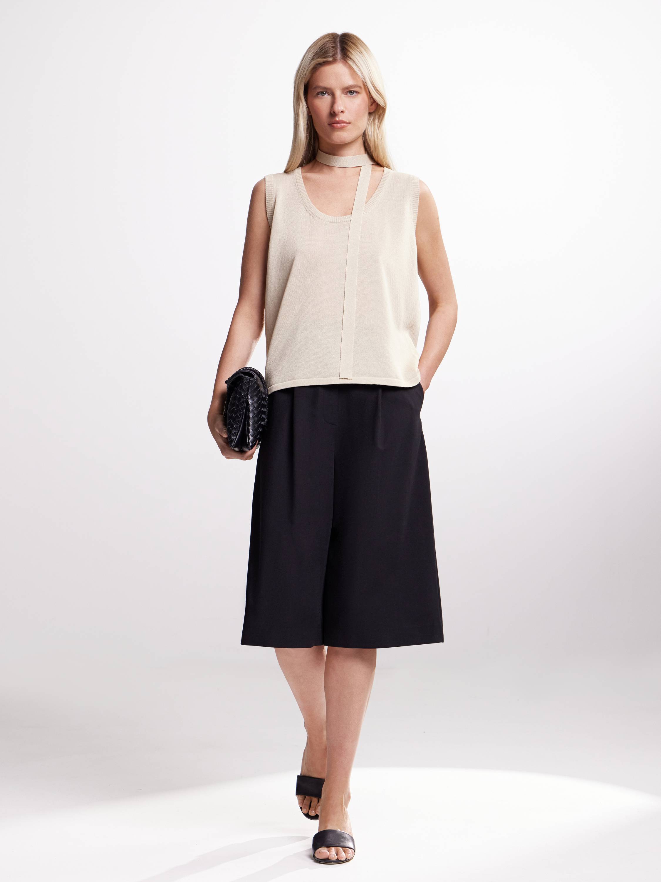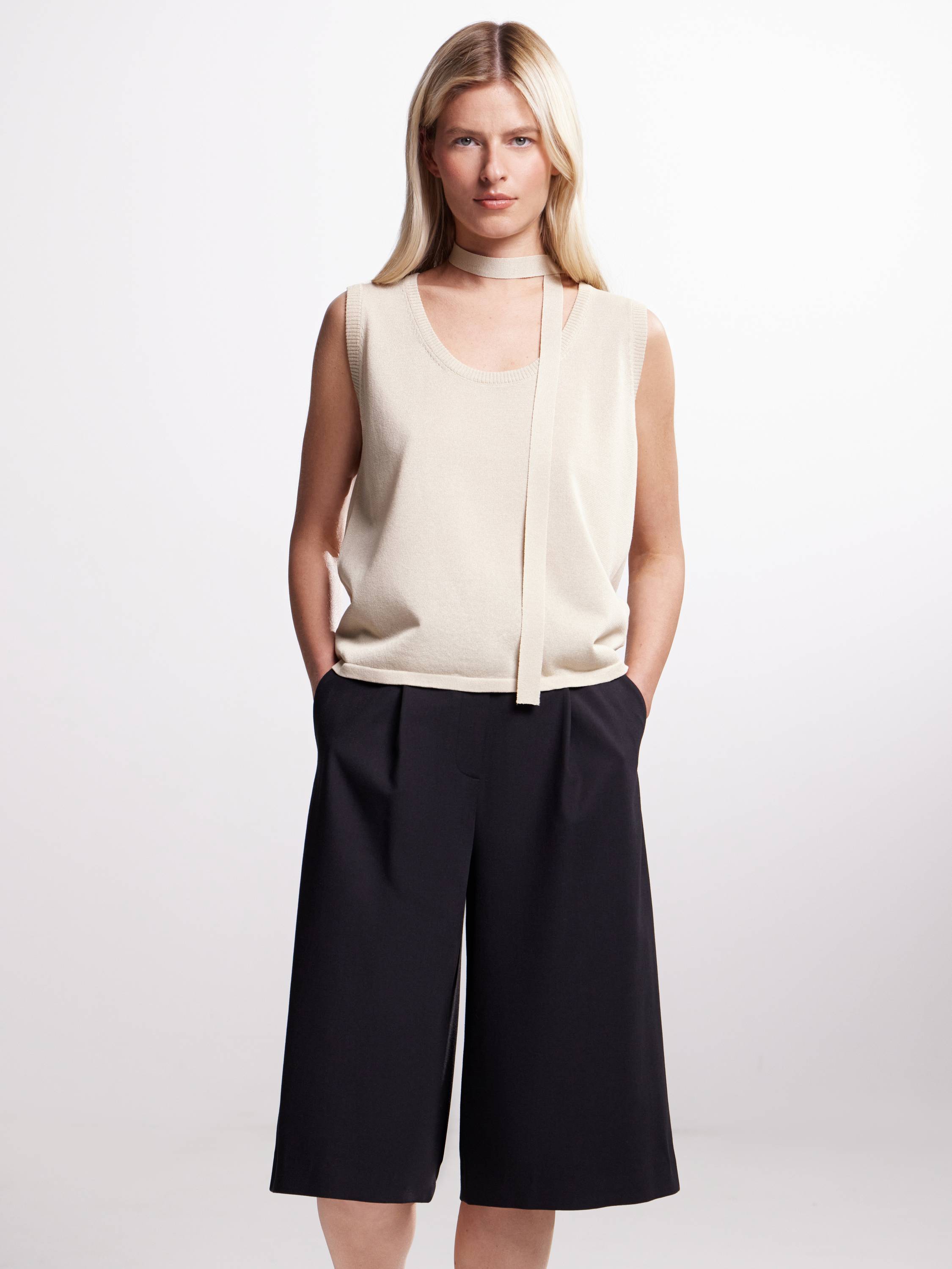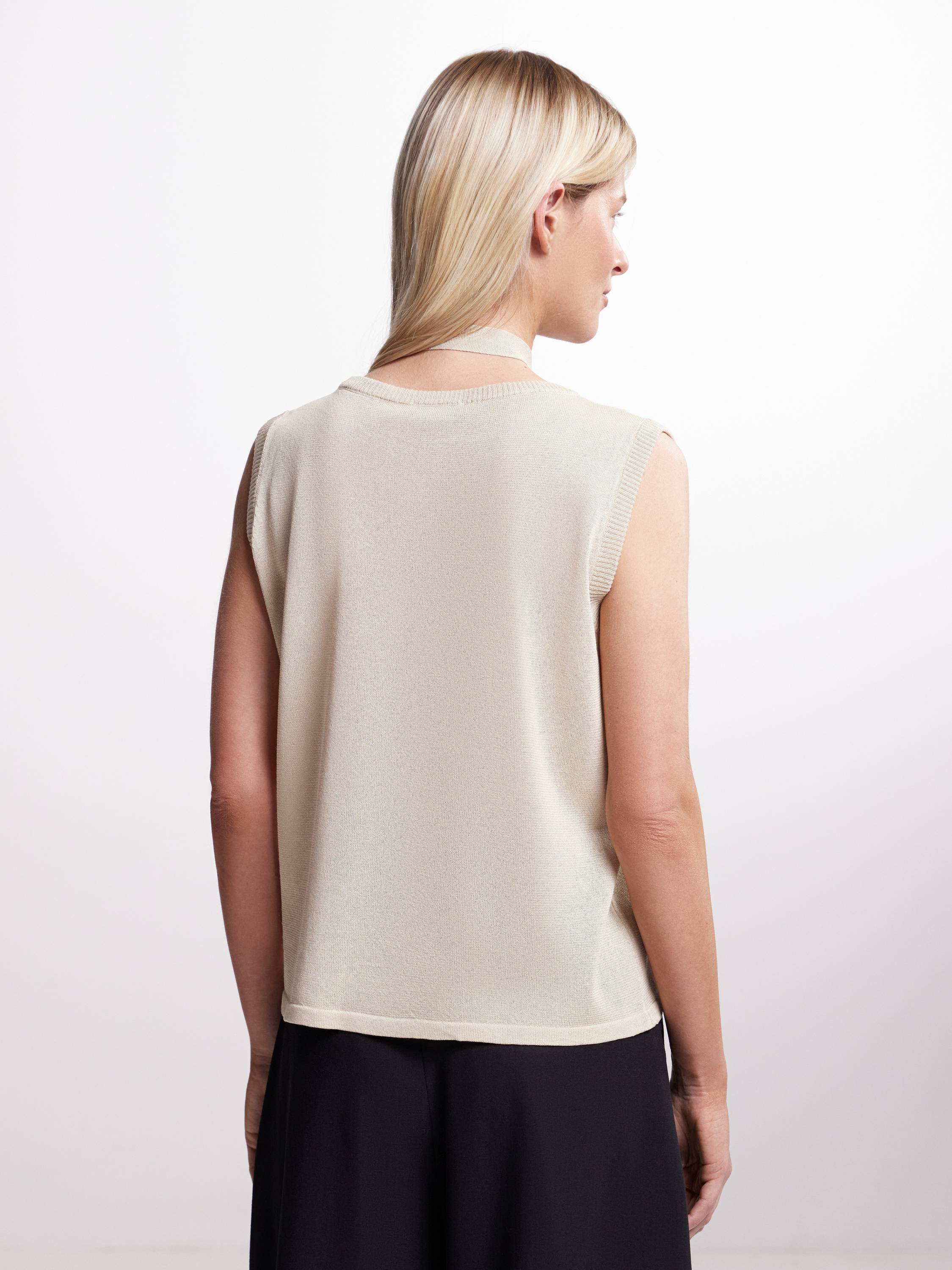 Топ из мягкой вискозной пряжи с выразительной деталью — длинным поясом, который можно обернуть вокруг шеи, завязать на талии или оставить свободно ниспадающим. Пластичное полотно комфортно прилегает к телу, подчеркивая чистоту формы и позволяя по-разному интерпретировать силуэт. Глубокий округлый вырез визуально вытягивает линию шеи, а проймы без рукавов придают образу легкость. Модель представлена в двух оттенках: трендовом butter yellow и теплом коричневом — оба работают на сложную, но естественную палитру летнего гардероба.