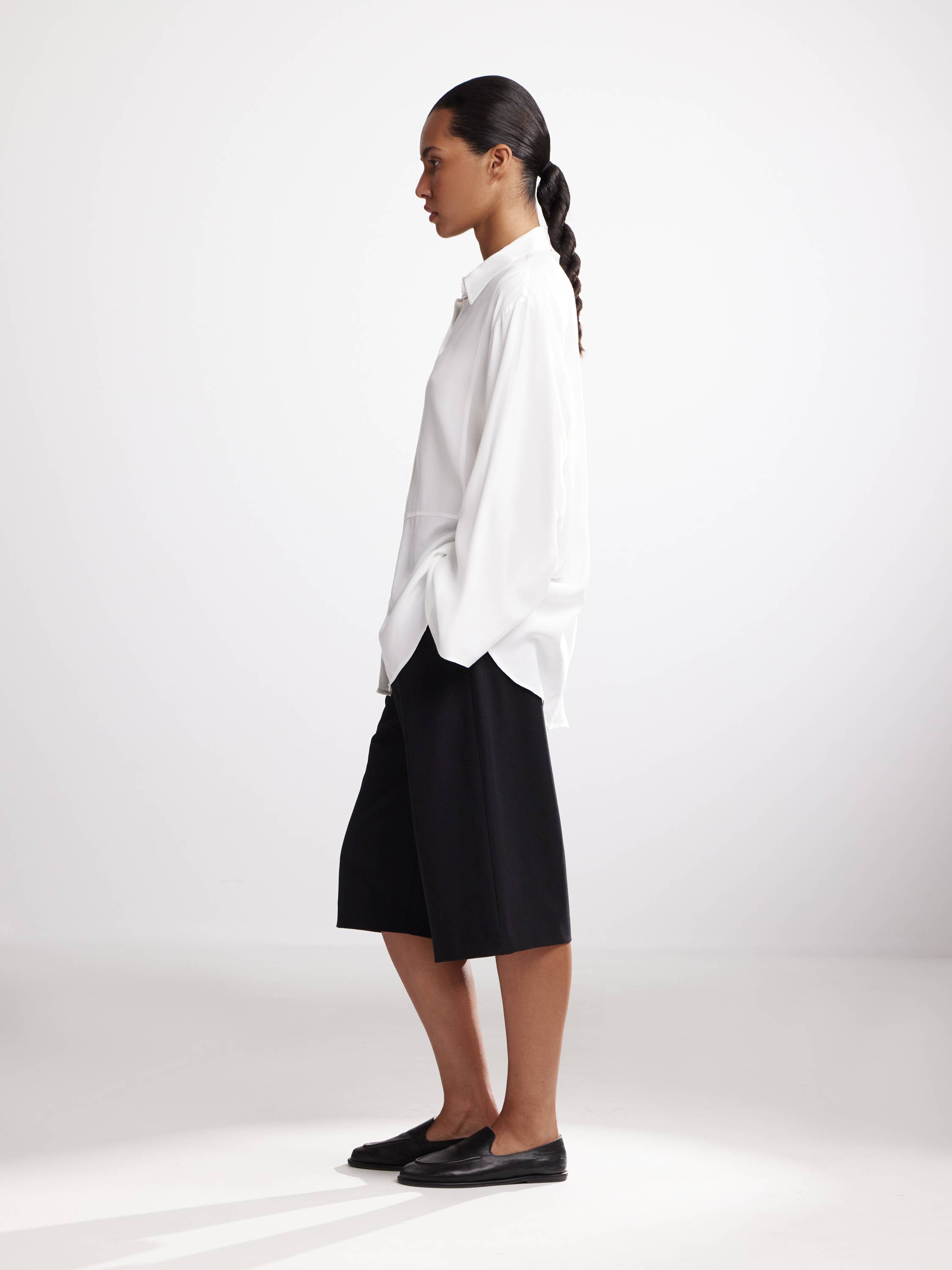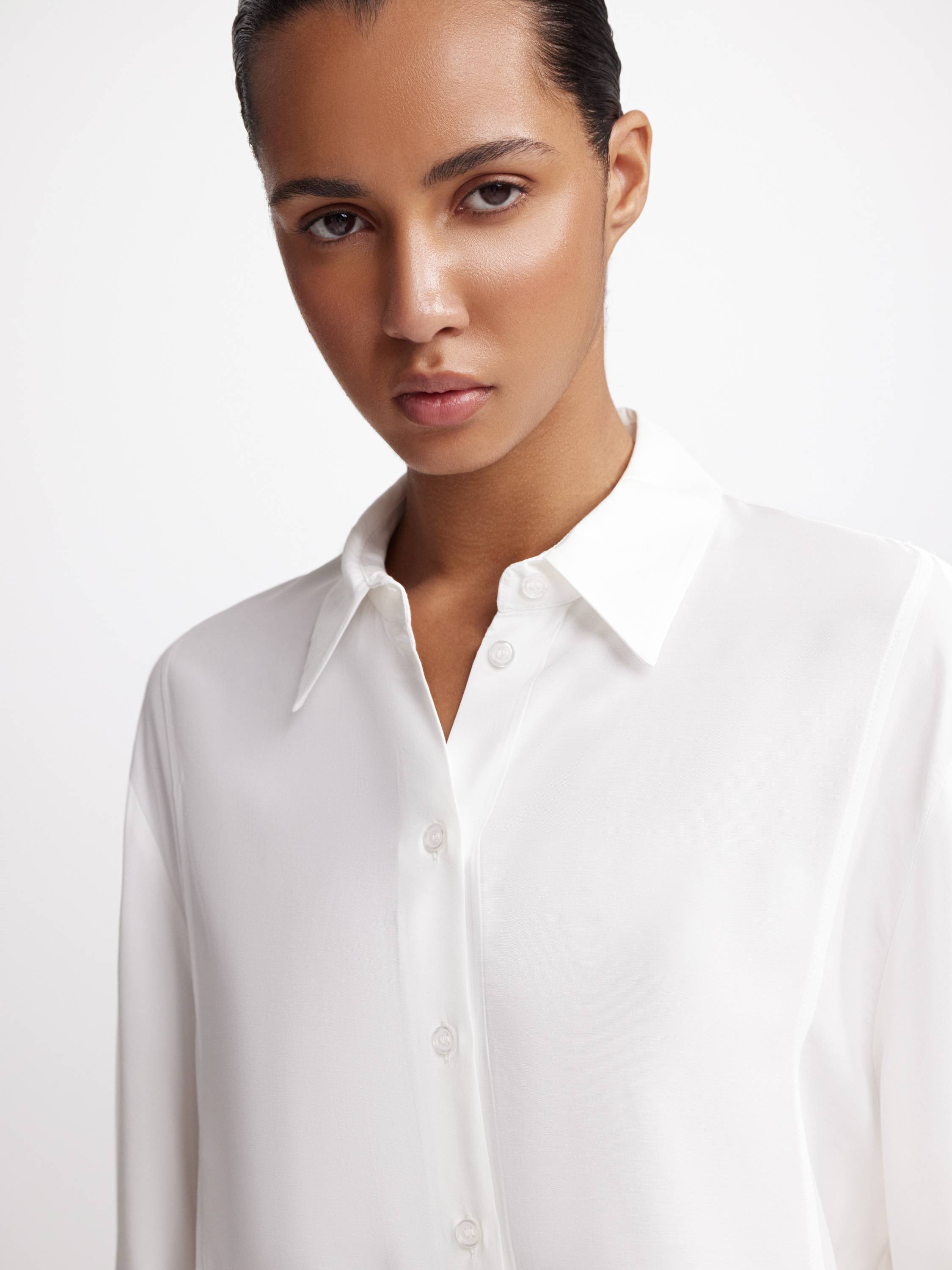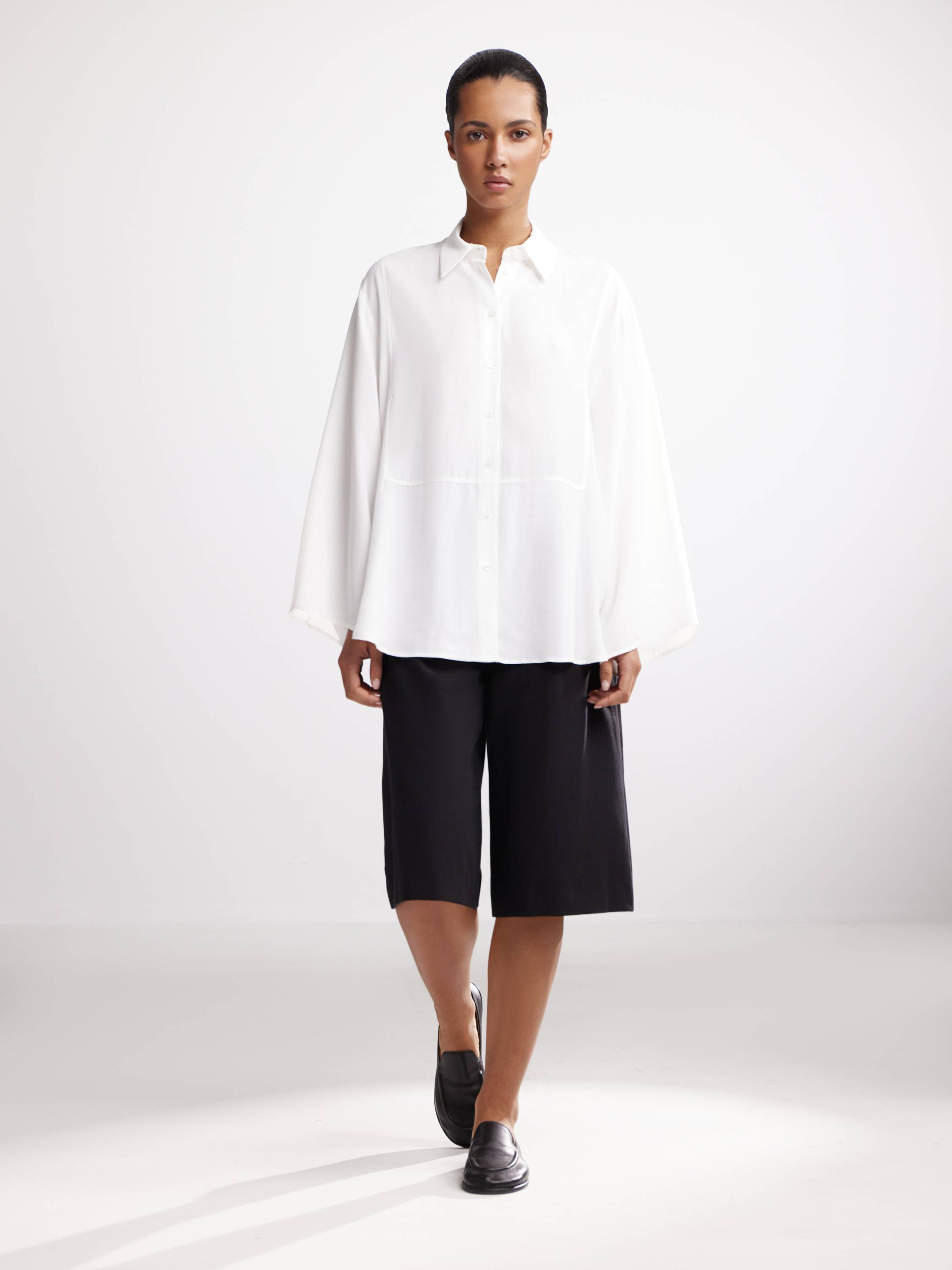 Рубашка свободного силуэта с расклешенными рукавами — деликатная и выразительная одновременно. Выполненная из мягкой вискозы, она дарит коже комфорт и легкую прохладу, красиво драпируется и движется с телом. Тонкая линия притачного шва под грудью визуально разделяет пространство ткани, подчеркивая архитектуру кроя. Аккуратный воротник и плавная линия плеч создают сдержанный, но современный образ. В светлом кремовом оттенке модель звучит мягко и воздушно, в насыщенном шоколадном — глубоко и графично. Сочетайте с прямыми брюками, шортами или юбкой — рубашка легко подстраивается под разное настроение и сценарий дня.