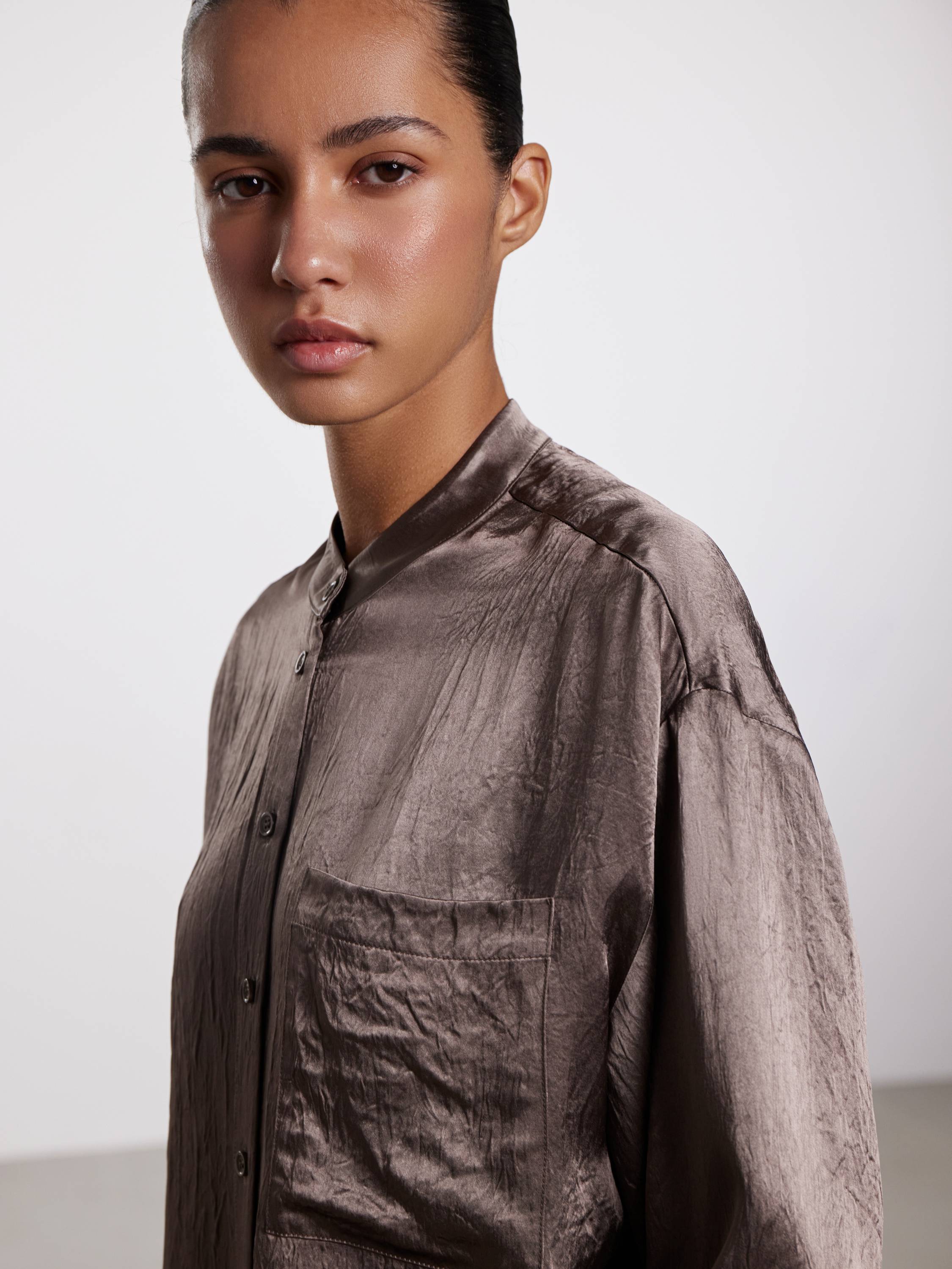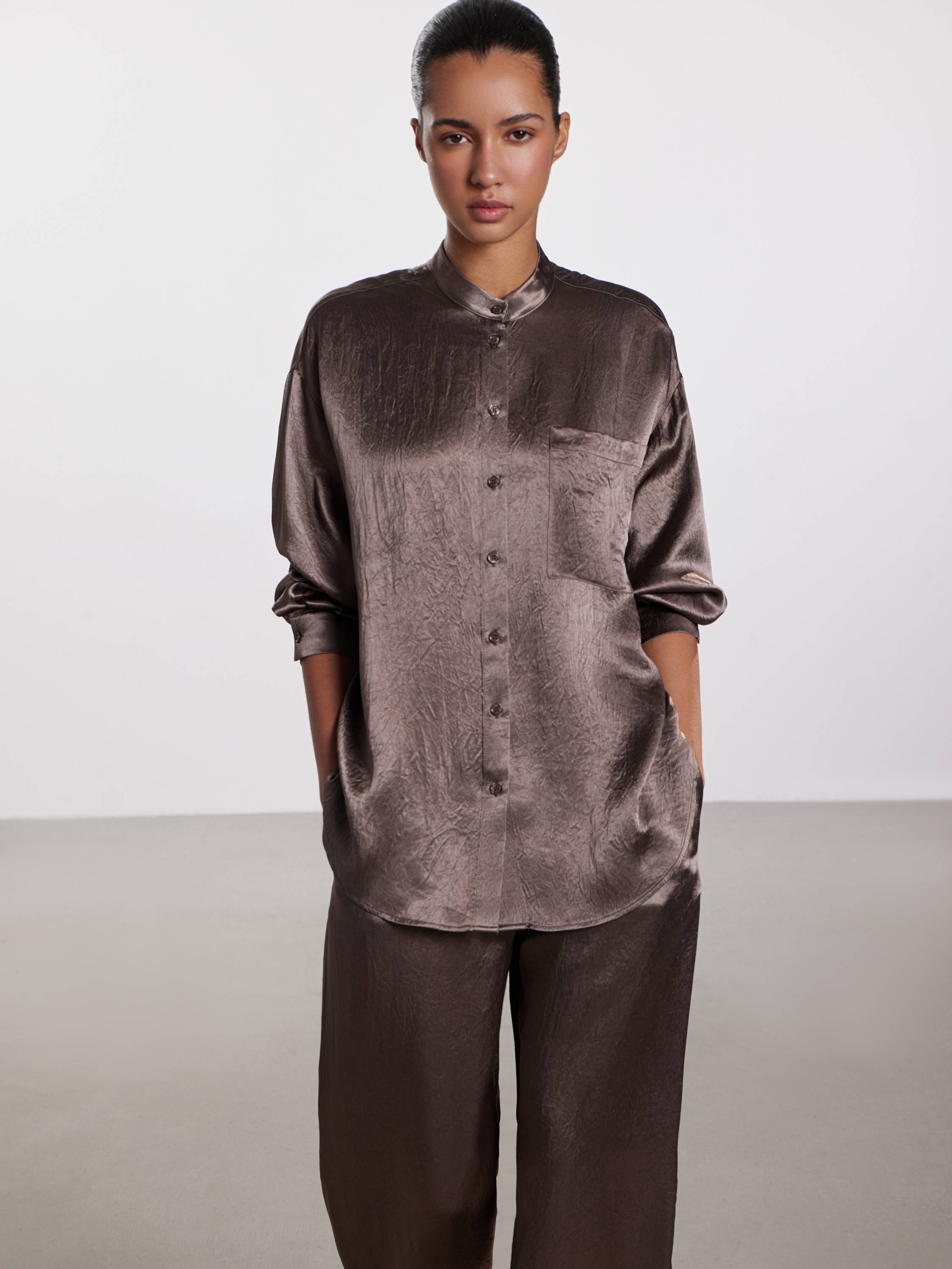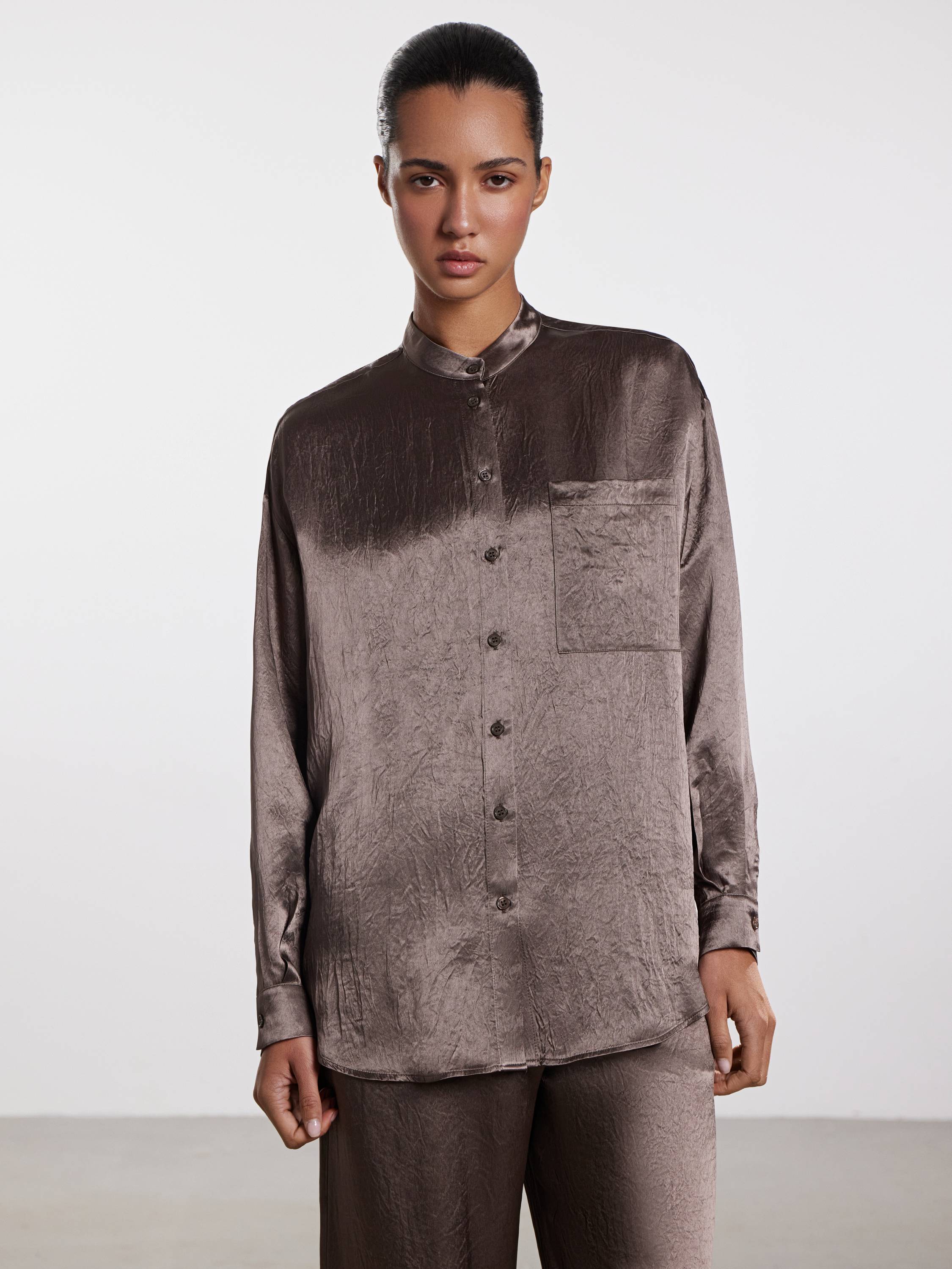 Блуза свободного кроя из жатого ацетата — акцентная вещь с художественной фактурой и деликатным блеском. Легкая и прохладная на ощупь ткань красиво драпируется и создает ощущение воздушности в движении. Ацетат обладает шелковистой текстурой и хорошо держит форму, при этом не перегревая кожу даже в теплую погоду. Минималистичный крой с отложным воротником-стойкой, мягкой линией плеч и нагрудным карманом подчеркивает утонченность модели. Носите с брюками в тон для цельного образа или сочетайте с денимом — для расслабленного повседневного варианта.