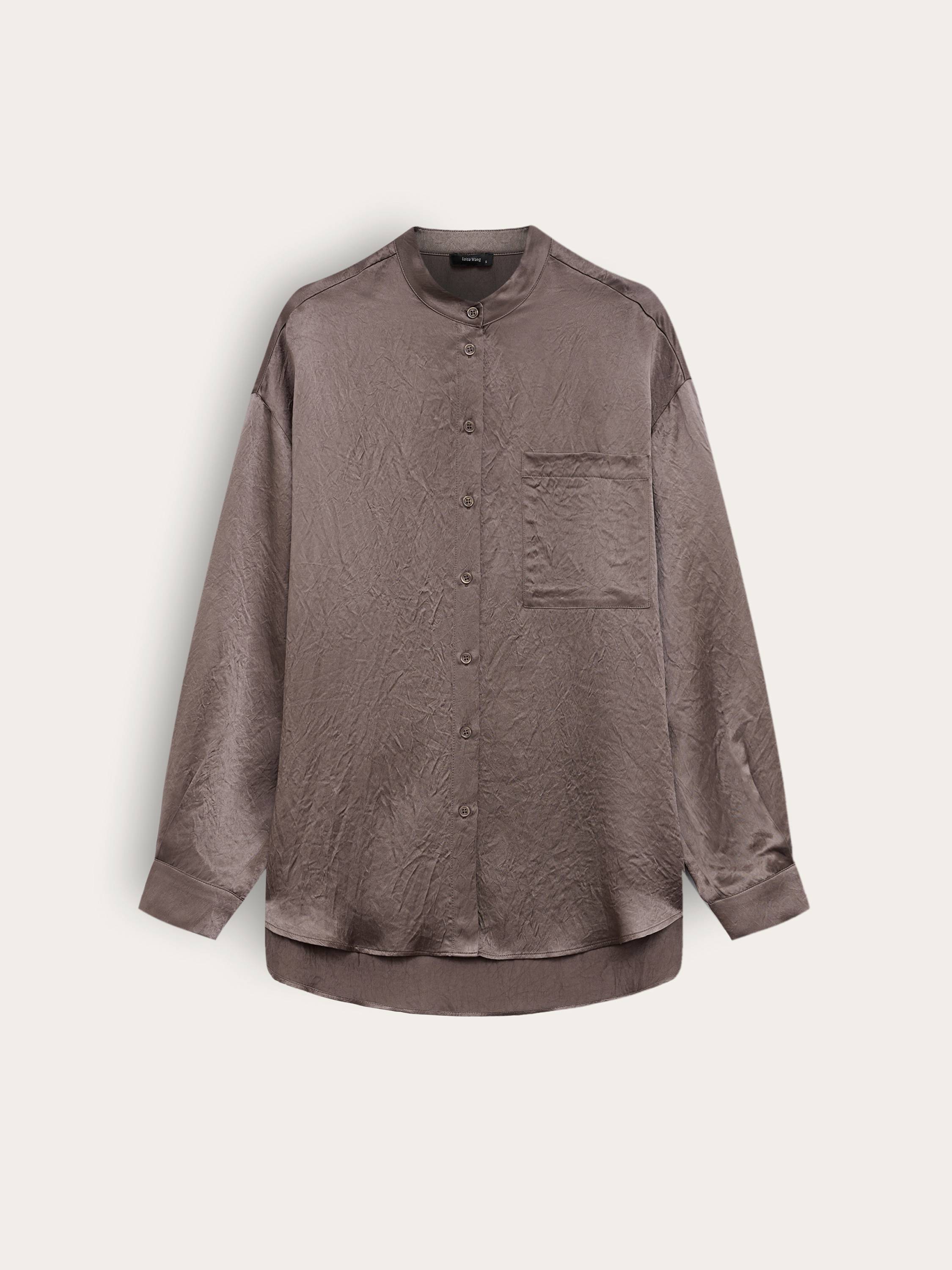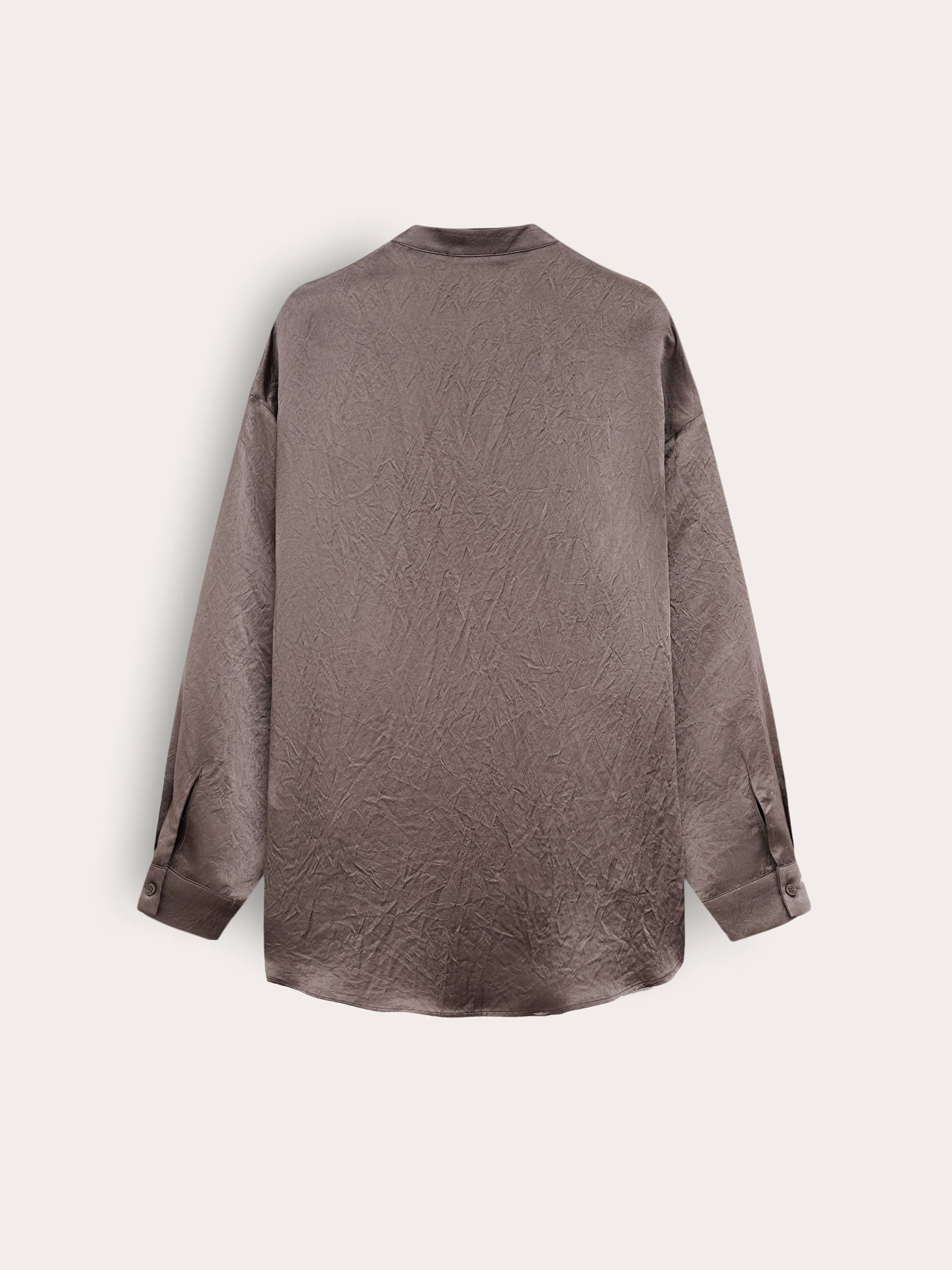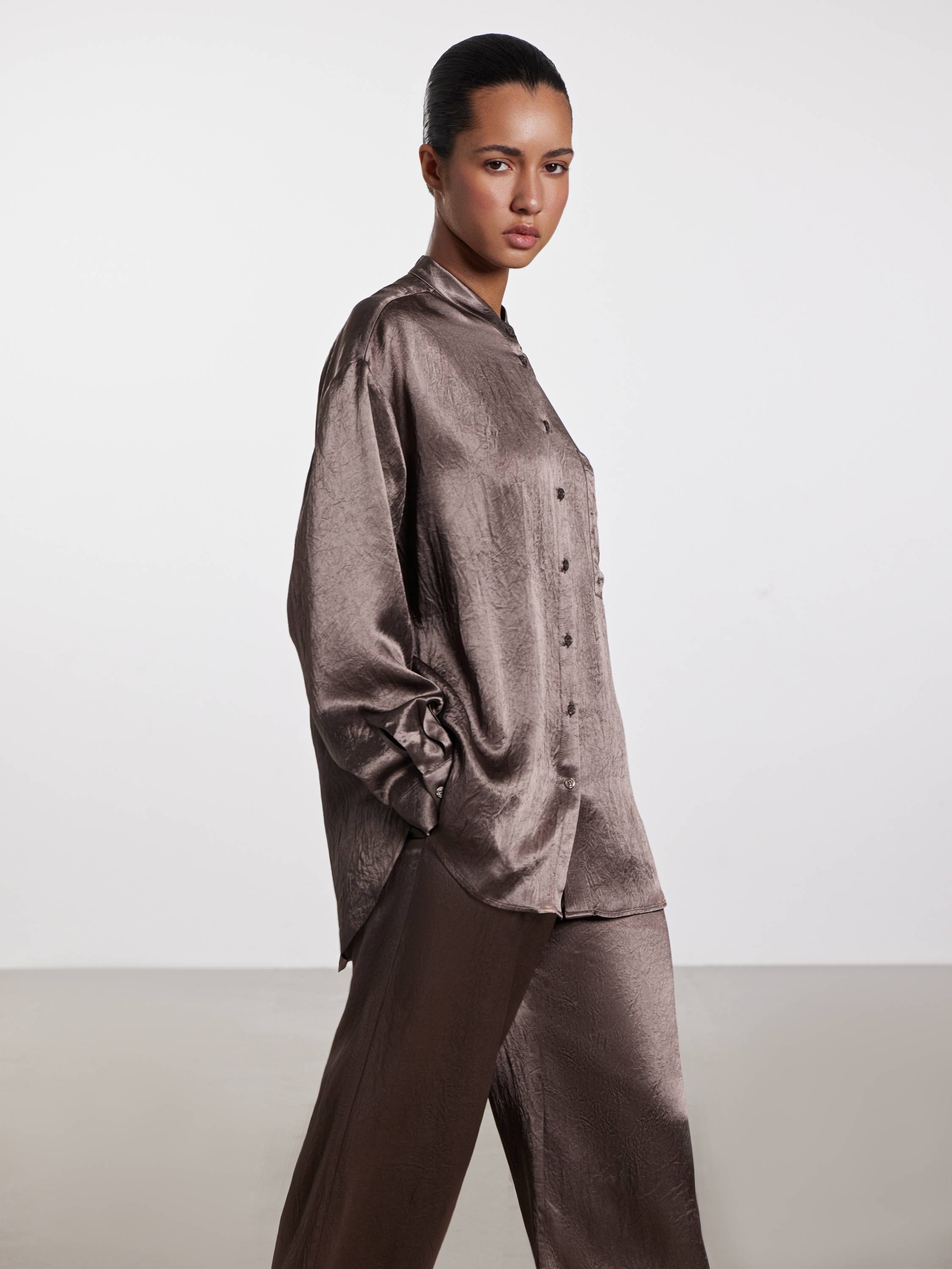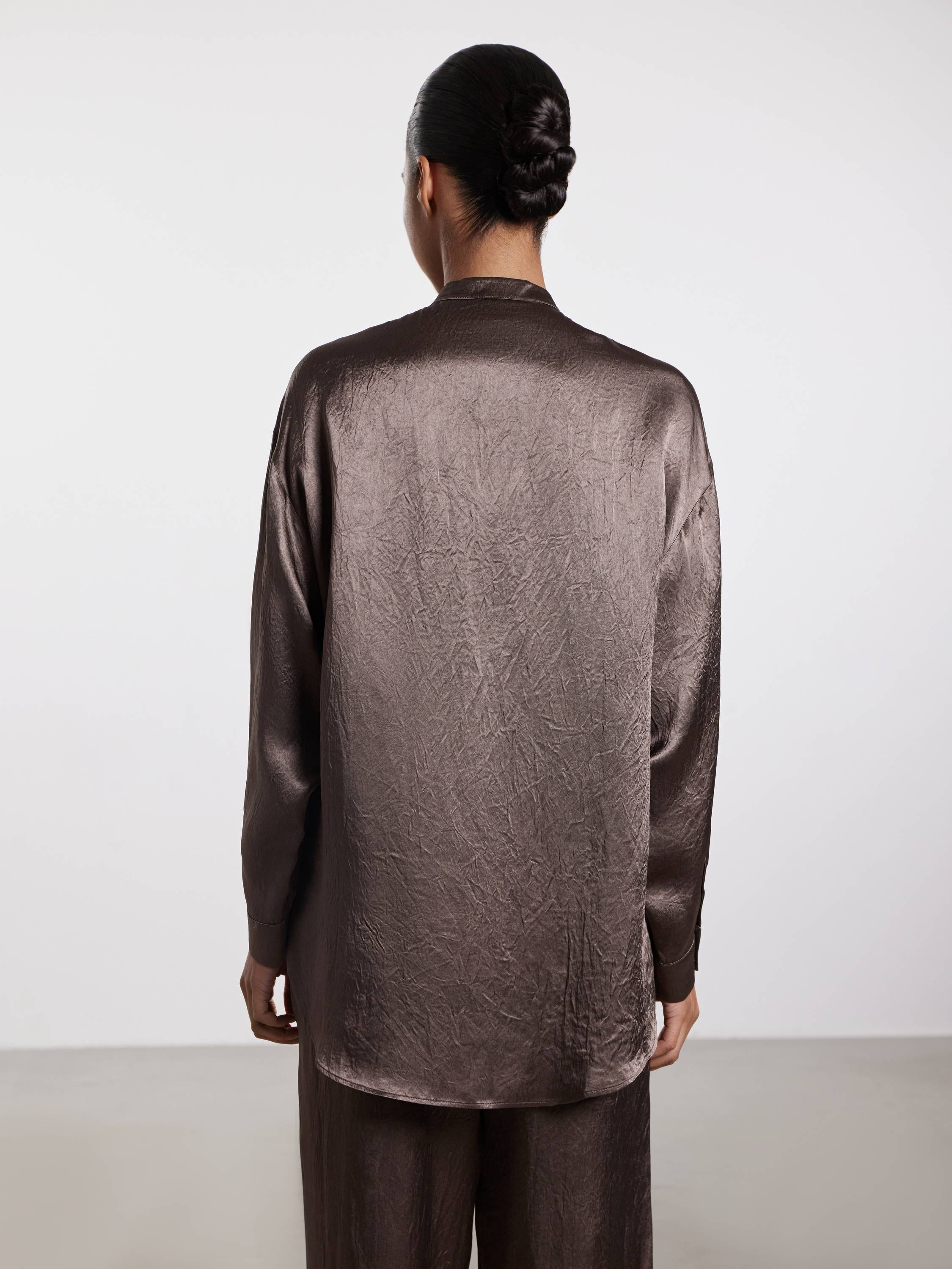 Блуза свободного кроя из жатого ацетата — акцентная вещь с художественной фактурой и деликатным блеском. Легкая и прохладная на ощупь ткань красиво драпируется и создает ощущение воздушности в движении. Ацетат обладает шелковистой текстурой и хорошо держит форму, при этом не перегревая кожу даже в теплую погоду. Минималистичный крой с отложным воротником-стойкой, мягкой линией плеч и нагрудным карманом подчеркивает утонченность модели. Носите с брюками в тон для цельного образа или сочетайте с денимом — для расслабленного повседневного варианта.